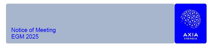 We hereby call the Shareholders of Centrais Elétricas Brasileiras S.A. – Axia Energia (“Company”) to convene in an Extraordinary General Meeting ("Meeting” or “EGM"), to be held on December 19,2025, at 2:00 p.m., exclusively digitally, through “Atlas AGM” digital platform (“Digital Platform”), pursuant to Law No. 6,404, of December 15, 1976 (”Brazilian Corporate Law”), CVM Resolution No. 81, of March 29, 2022 (“RCVM 81”) and the Company's Bylaws, to resolve on the following Agenda: