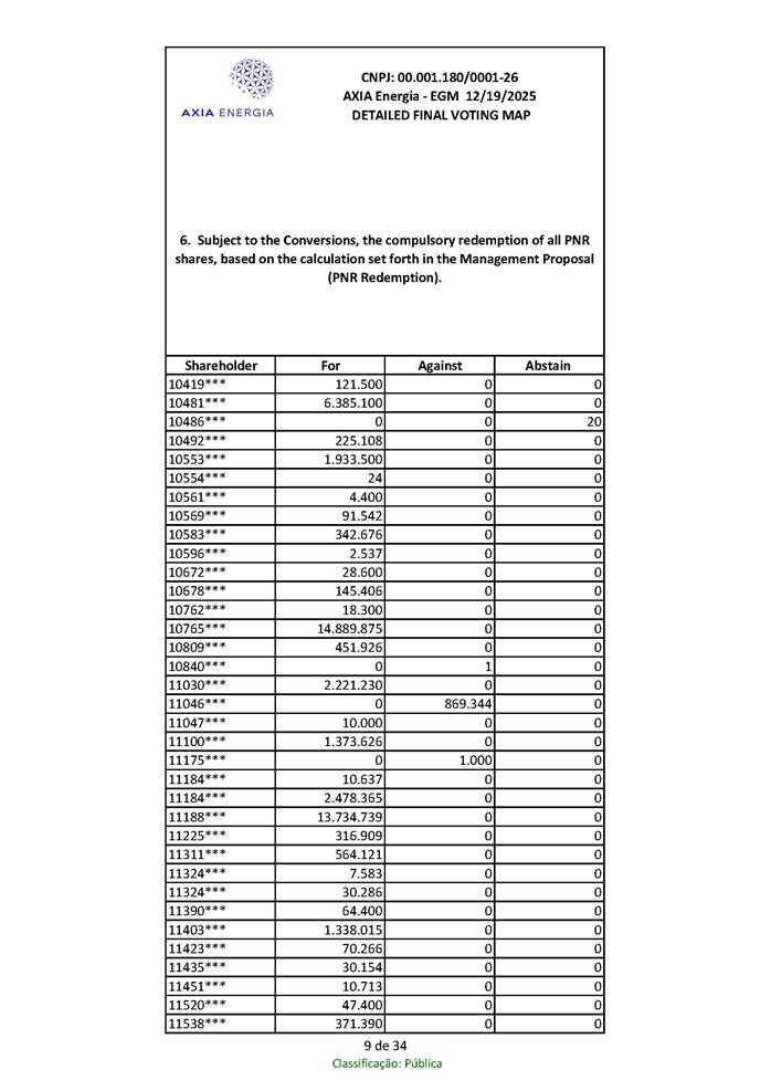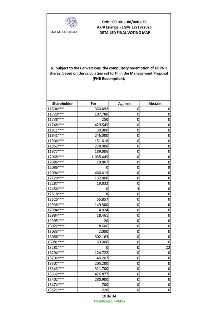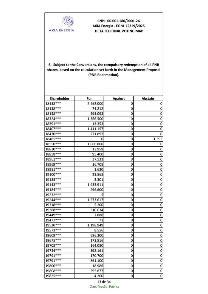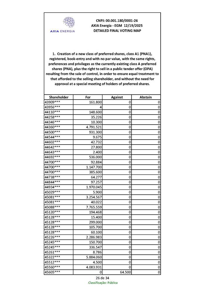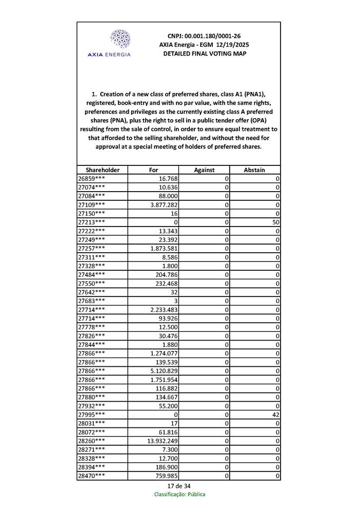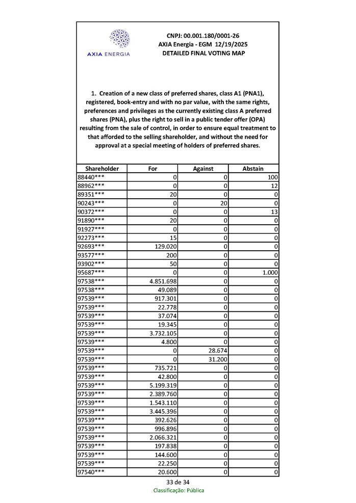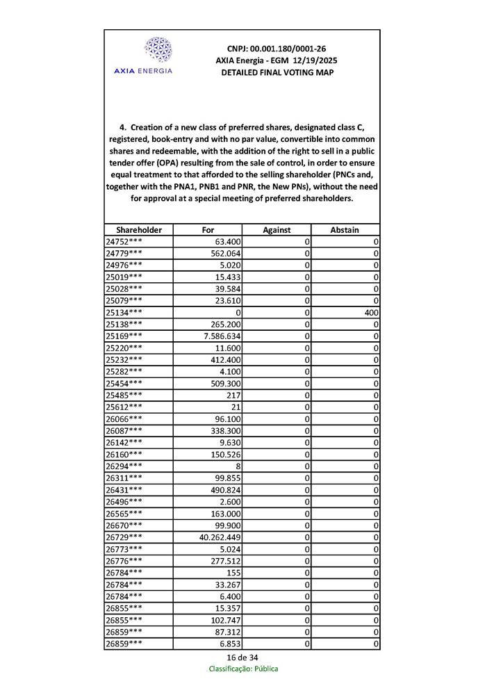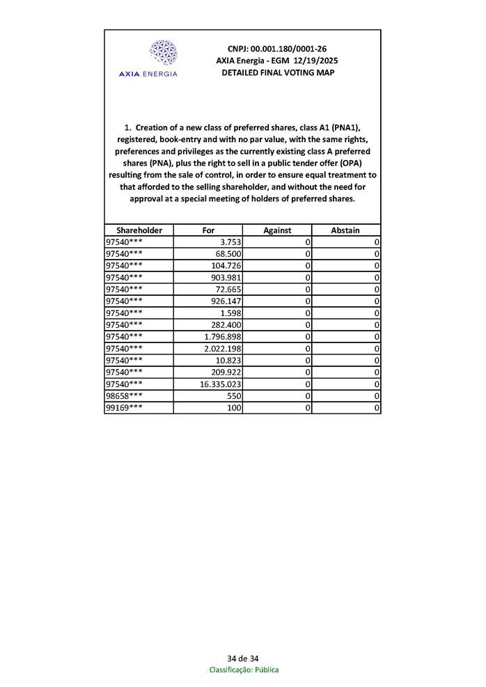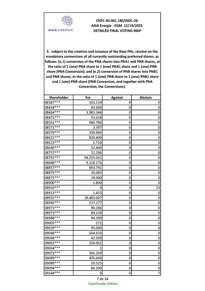Shareholder For Against Abstain Total 818.181.617 198.176.986 34.862.286 00125*** 1.178.056 0 0 00394*** 0 190.732.084 0 00455*** 6 0 0 00560*** 4.984 0 0 00586*** 10 0 0 00601*** 31 0 0 00739*** 1.428 0 0 00805*** 20 0 0 00914*** 3 0 0 01017*** 1 0 0 01171*** 1.610 0 0 01203*** 1 0 0 01456*** 4 0 0 01496*** 161.306 0 0 01586*** 16 0 0 01643*** 66.985 0 0 01699*** 96.416 0 0 01886*** 12.945 0 0 02020*** 53.603 0 0 02097*** 5.700 0 0 02231*** 611 0 0 02231*** 8.536 0 0 02285*** 102 0 0 02524*** 250 0 0 02745*** 0 5 0 02863*** 1.125.500 0 0 02887*** 26.056 0 0 02895*** 64.700 0 0 02903*** 100 0 0 03027*** 51.786 0 0 03369*** 0 0 136 03370*** 392.332 0 0 03394*** 87.480 0 0 03394*** 7 0 0 1. Creation of a new class of preferred shares, class A1 (PNA1), registered, book-entry and with no par value, with the same rights, preferences and privileges as the currently existing class A preferred shares (PNA), plus the right to sell in a public tender offer (OPA) resulting from the sale of control, in order to ensure equal treatment to that afforded to the selling shareholder, and without the need for approval at a special meeting of holders of preferred shares. CNPJ: 00.001.180/0001-26AXIA Energia - EGM 12/19/2025 DETAILED FINAL VOTING MAP 1 de 34 # Classificação: Pública Shareholder For Against Abstain 1. Creation of a new class of preferred shares, class A1 (PNA1), registered, book-entry and with no par value, with the same rights, preferences and privileges as the currently existing class A preferred shares (PNA), plus the right to sell in a public tender offer (OPA) resulting from the sale of control, in order to ensure equal treatment to that afforded to the selling shareholder, and without the need for approval at a special meeting of holders of preferred shares. CNPJ: 00.001.180/0001-26AXIA Energia - EGM 12/19/2025 DETAILED FINAL VOTING MAP 03473*** 569 0 0 03833*** 28.394 0 0 03902*** 1 0 0 03960*** 24.957 0 0 04005*** 0 50 0 04073*** 292.991 0 0 04297*** 3 0 0 04555*** 0 0 55 04605*** 0 0 200 04609*** 602 0 0 04609*** 1.300 0 0 04616*** 11.687 0 0 04672*** 5 0 0 04709*** 0 1 0 04736*** 28.890 0 0 04751*** 111.059 0 0 04847*** 4 0 0 05075*** 5 0 0 05100*** 43.978 0 0 05147*** 14.000 0 0 05303*** 0 0 1 05316*** 1.030 0 0 05435*** 3 0 0 05448*** 9.727 0 0 05479*** 1.513.900 0 0 05479*** 2.843.378 0 0 05522*** 44 0 0 05589*** 233.315 0 0 05589*** 279.983 0 0 05589*** 28.815 0 0 05719*** 27 0 0 05734*** 415 0 0 05775*** 1.759 0 0 05838*** 15.219 0 0 05839*** 96.081 0 0 2 de 34 # Classificação: Pública Shareholder For Against Abstain 1. Creation of a new class of preferred shares, class A1 (PNA1), registered, book-entry and with no par value, with the same rights, preferences and privileges as the currently existing class A preferred shares (PNA), plus the right to sell in a public tender offer (OPA) resulting from the sale of control, in order to ensure equal treatment to that afforded to the selling shareholder, and without the need for approval at a special meeting of holders of preferred shares. CNPJ: 00.001.180/0001-26AXIA Energia - EGM 12/19/2025 DETAILED FINAL VOTING MAP 05839*** 189.258 0 0 05839*** 718.804 0 0 05839*** 724 0 0 05839*** 775.653 0 0 05839*** 15.200 0 0 05839*** 9.200 0 0 05839*** 803.800 0 0 05839*** 158.291 0 0 05839*** 15.718 0 0 05839*** 0 1.111.508 0 05839*** 4.619.084 0 0 05839*** 226.872 0 0 05839*** 51.889 0 0 05840*** 188.253 0 0 05840*** 10.000 0 0 05840*** 32.547 0 0 05840*** 804.990 0 0 05840*** 4.858.301 0 0 05840*** 477.000 0 0 05840*** 2.199.143 0 0 05872*** 79.961 0 0 05901*** 1 0 0 05986*** 1.881.495 0 0 05986*** 2.673.143 0 0 05986*** 24.100 0 0 05986*** 2.155 0 0 05987*** 147.900 0 0 05987*** 129.553 0 0 05987*** 11.827 0 0 05987*** 2.020.100 0 0 05987*** 1.602.500 0 0 05987*** 5 0 0 05987*** 199.465 0 0 05987*** 13.400 0 0 05987*** 0 428.300 0 3 de 34 # Classificação: Pública Shareholder For Against Abstain 1. Creation of a new class of preferred shares, class A1 (PNA1), registered, book-entry and with no par value, with the same rights, preferences and privileges as the currently existing class A preferred shares (PNA), plus the right to sell in a public tender offer (OPA) resulting from the sale of control, in order to ensure equal treatment to that afforded to the selling shareholder, and without the need for approval at a special meeting of holders of preferred shares. CNPJ: 00.001.180/0001-26AXIA Energia - EGM 12/19/2025 DETAILED FINAL VOTING MAP 05987*** 24.749 0 0 05987*** 188.737 0 0 05987*** 2.862.252 0 0 05987*** 481.572 0 0 05987*** 1.758.400 0 0 06046*** 1.594.573 0 0 06069*** 5.615 0 0 06105*** 10.100 0 0 06134*** 0 108.329 0 06148*** 76.771 0 0 06224*** 6.811 0 0 06239*** 174.268 0 0 06239*** 455.200 0 0 06251*** 9.995 0 0 06318*** 0 0 1 06323*** 530.363 0 0 06370*** 3 0 0 06406*** 0 0 100.000 06491*** 35 0 0 06541*** 284.989 0 0 06571*** 130 0 0 06613*** 77.676 0 0 06832*** 0 23 0 06916*** 622.500 0 0 06943*** 137.641 0 0 06943*** 589.073 0 0 06943*** 922.665 0 0 06949*** 0 0 10 06964*** 298.476 0 0 07023*** 0 0 100 07060*** 239.200 0 0 07086*** 1.000 0 0 07096*** 51.672 0 0 07140*** 0 859.100 0 07140*** 19.426 0 0 4 de 34 # Classificação: Pública Shareholder For Against Abstain 1. Creation of a new class of preferred shares, class A1 (PNA1), registered, book-entry and with no par value, with the same rights, preferences and privileges as the currently existing class A preferred shares (PNA), plus the right to sell in a public tender offer (OPA) resulting from the sale of control, in order to ensure equal treatment to that afforded to the selling shareholder, and without the need for approval at a special meeting of holders of preferred shares. CNPJ: 00.001.180/0001-26AXIA Energia - EGM 12/19/2025 DETAILED FINAL VOTING MAP 07140*** 1.219 0 0 07140*** 26.098 0 0 07187*** 16.269 0 0 07187*** 713 0 0 07191*** 0 857.000 0 07191*** 85.700 0 0 07191*** 105.335 0 0 07226*** 0 0 4 07237*** 589.417 0 0 07237*** 33.388 0 0 07247*** 296