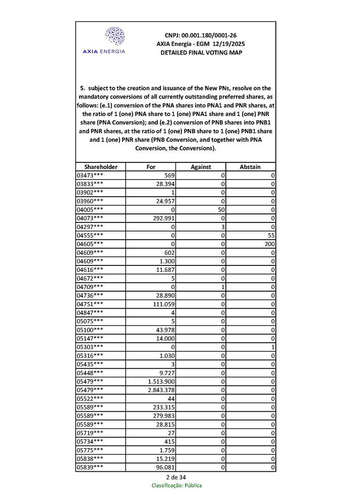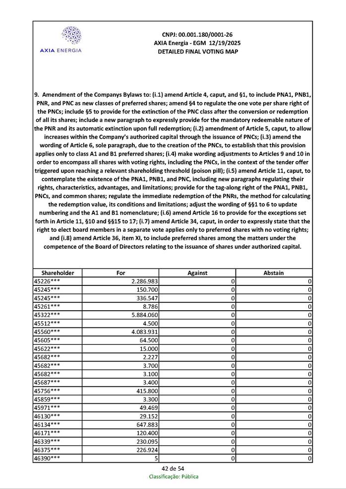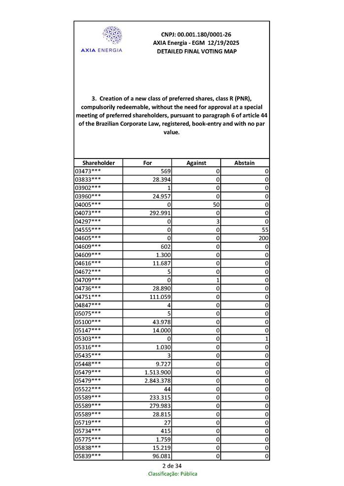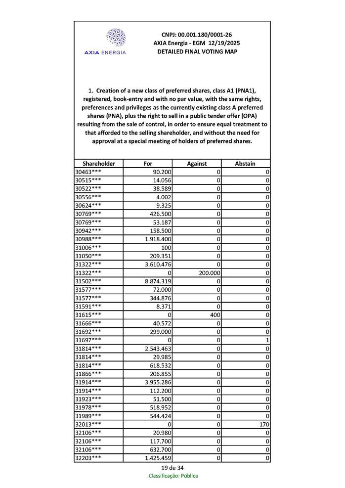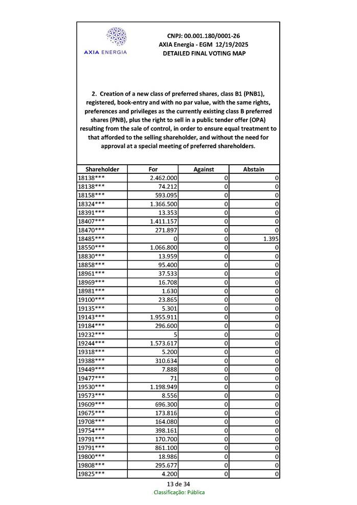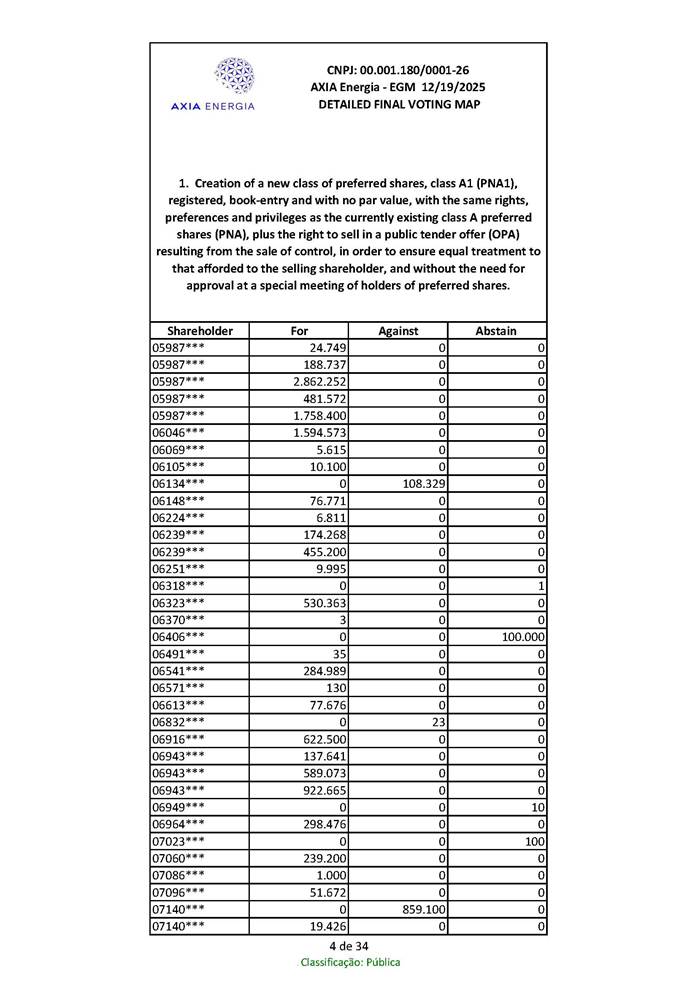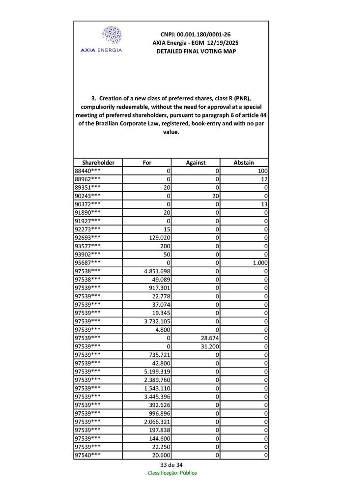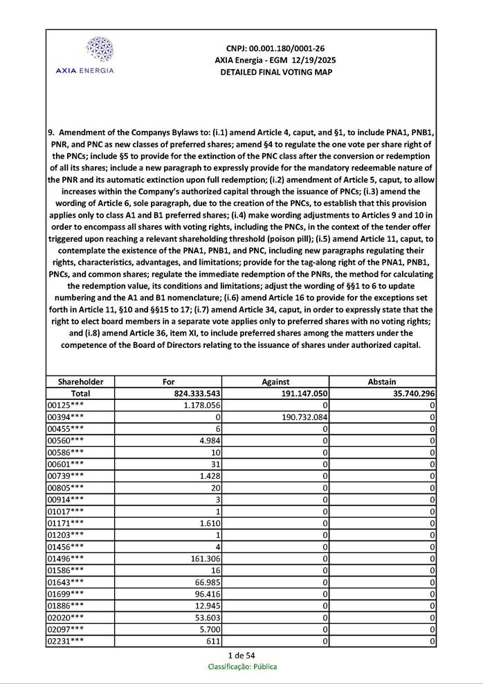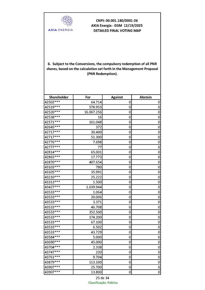 Shareholder For Against Abstain Total 818.181.617 198.176.986 34.862.286 00125*** 1.178.056 0 0 00394*** 0 190.732.084 0 00455*** 6 0 0 00560*** 4.984 0 0 00586*** 10 0 0 00601*** 31 0 0 00739*** 1.428 0 0 00805*** 20 0 0 00914*** 3 0 0 01017*** 1 0 0 01171*** 1.610 0 0 01203*** 1 0 0 01456*** 4 0 0 01496*** 161.306 0 0 01586*** 16 0 0 01643*** 66.985 0 0 01699*** 96.416 0 0 01886*** 12.945 0 0 02020*** 53.603 0 0 02097*** 5.700 0 0 02231*** 611 0 0 02231*** 8.536 0 0 02285*** 102 0 0 02524*** 250 0 0 02745*** 0 5 0 02863*** 1.125.500 0 0 02887*** 26.056 0 0 02895*** 64.700 0 0 02903*** 100 0 0 03027*** 51.786 0 0 03369*** 0 0 136 03370*** 392.332 0 0 03394*** 87.480 0 0 03394*** 7 0 0 1. Creation of a new class of preferred shares, class A1 (PNA1), registered, book-entry and with no par value, with the same rights, preferences and privileges as the currently existing class A preferred shares (PNA), plus the right to sell in a public tender offer (OPA) resulting from the sale of control, in order to ensure equal treatment to that afforded to the selling shareholder, and without the need for approval at a special meeting of holders of preferred shares. CNPJ: 00.001.180/0001-26AXIA Energia - EGM 12/19/2025 DETAILED FINAL VOTING MAP 1 de 34 # Classificação: Pública Shareholder For Against Abstain 1. Creation of a new class of preferred shares, class A1 (PNA1), registered, book-entry and with no par value, with the same rights, preferences and privileges as the currently existing class A preferred shares (PNA), plus the right to sell in a public tender offer (OPA) resulting from the sale of control, in order to ensure equal treatment to that afforded to the selling shareholder, and without the need for approval at a special meeting of holders of preferred shares. CNPJ: 00.001.180/0001-26AXIA Energia - EGM 12/19/2025 DETAILED FINAL VOTING MAP 03473*** 569 0 0 03833*** 28.394 0 0 03902*** 1 0 0 03960*** 24.957 0 0 04005*** 0 50 0 04073*** 292.991 0 0 04297*** 3 0 0 04555*** 0 0 55 04605*** 0 0 200 04609*** 602 0 0 04609*** 1.300 0 0 04616*** 11.687 0 0 04672*** 5 0 0 04709*** 0 1 0 04736*** 28.890 0 0 04751*** 111.059 0 0 04847*** 4 0 0 05075*** 5 0 0 05100*** 43.978 0 0 05147*** 14.000 0 0 05303*** 0 0 1 05316*** 1.030 0 0 05435*** 3 0 0 05448*** 9.727 0 0 05479*** 1.513.900 0 0 05479*** 2.843.378 0 0 05522*** 44 0 0 05589*** 233.315 0 0 05589*** 279.983 0 0 05589*** 28.815 0 0 05719*** 27 0 0 05734*** 415 0 0 05775*** 1.759 0 0 05838*** 15.219 0 0 05839*** 96.081 0 0 2 de 34 # Classificação: Pública Shareholder For Against Abstain 1. Creation of a new class of preferred shares, class A1 (PNA1), registered, book-entry and with no par value, with the same rights, preferences and privileges as the currently existing class A preferred shares (PNA), plus the right to sell in a public tender offer (OPA) resulting from the sale of control, in order to ensure equal treatment to that afforded to the selling shareholder, and without the need for approval at a special meeting of holders of preferred shares. CNPJ: 00.001.180/0001-26AXIA Energia - EGM 12/19/2025 DETAILED FINAL VOTING MAP 05839*** 189.258 0 0 05839*** 718.804 0 0 05839*** 724 0 0 05839*** 775.653 0 0 05839*** 15.200 0 0 05839*** 9.200 0 0 05839*** 803.800 0 0 05839*** 158.291 0 0 05839*** 15.718 0 0 05839*** 0 1.111.508 0 05839*** 4.619.084 0 0 05839*** 226.872 0 0 05839*** 51.889 0 0 05840*** 188.253 0 0 05840*** 10.000 0 0 05840*** 32.547 0 0 05840*** 804.990 0 0 05840*** 4.858.301 0 0 05840*** 477.000 0 0 05840*** 2.199.143 0 0 05872*** 79.961 0 0 05901*** 1 0 0 05986*** 1.881.495 0 0 05986*** 2.673.143 0 0 05986*** 24.100 0 0 05986*** 2.155 0 0 05987*** 147.900 0 0 05987*** 129.553 0 0 05987*** 11.827 0 0 05987*** 2.020.100 0 0 05987*** 1.602.500 0 0 05987*** 5 0 0 05987*** 199.465 0 0 05987*** 13.400 0 0 05987*** 0 428.300 0 3 de 34 # Classificação: Pública Shareholder For Against Abstain 1. Creation of a new class of preferred shares, class A1 (PNA1), registered, book-entry and with no par value, with the same rights, preferences and privileges as the currently existing class A preferred shares (PNA), plus the right to sell in a public tender offer (OPA) resulting from the sale of control, in order to ensure equal treatment to that afforded to the selling shareholder, and without the need for approval at a special meeting of holders of preferred shares. CNPJ: 00.001.180/0001-26AXIA Energia - EGM 12/19/2025 DETAILED FINAL VOTING MAP 05987*** 24.749 0 0 05987*** 188.737 0 0 05987*** 2.862.252 0 0 05987*** 481.572 0 0 05987*** 1.758.400 0 0 06046*** 1.594.573 0 0 06069*** 5.615 0 0 06105*** 10.100 0 0 06134*** 0 108.329 0 06148*** 76.771 0 0 06224*** 6.811 0 0 06239*** 174.268 0 0 06239*** 455.200 0 0 06251*** 9.995 0 0 06318*** 0 0 1 06323*** 530.363 0 0 06370*** 3 0 0 06406*** 0 0 100.000 06491*** 35 0 0 06541*** 284.989 0 0 06571*** 130 0 0 06613*** 77.676 0 0 06832*** 0 23 0 06916*** 622.500 0 0 06943*** 137.641 0 0 06943*** 589.073 0 0 06943*** 922.665 0 0 06949*** 0 0 10 06964*** 298.476 0 0 07023*** 0 0 100 07060*** 239.200 0 0 07086*** 1.000 0 0 07096*** 51.672 0 0 07140*** 0 859.100 0 07140*** 19.426 0 0 4 de 34 # Classificação: Pública Shareholder For Against Abstain 1. Creation of a new class of preferred shares, class A1 (PNA1), registered, book-entry and with no par value, with the same rights, preferences and privileges as the currently existing class A preferred shares (PNA), plus the right to sell in a public tender offer (OPA) resulting from the sale of control, in order to ensure equal treatment to that afforded to the selling shareholder, and without the need for approval at a special meeting of holders of preferred shares. CNPJ: 00.001.180/0001-26AXIA Energia - EGM 12/19/2025 DETAILED FINAL VOTING MAP 07140*** 1.219 0 0 07140*** 26.098 0 0 07187*** 16.269 0 0 07187*** 713 0 0 07191*** 0 857.000 0 07191*** 85.700 0 0 07191*** 105.335 0 0 07226*** 0 0 4 07237*** 589.417 0 0 07237*** 33.388 0 0 07247*** 296
