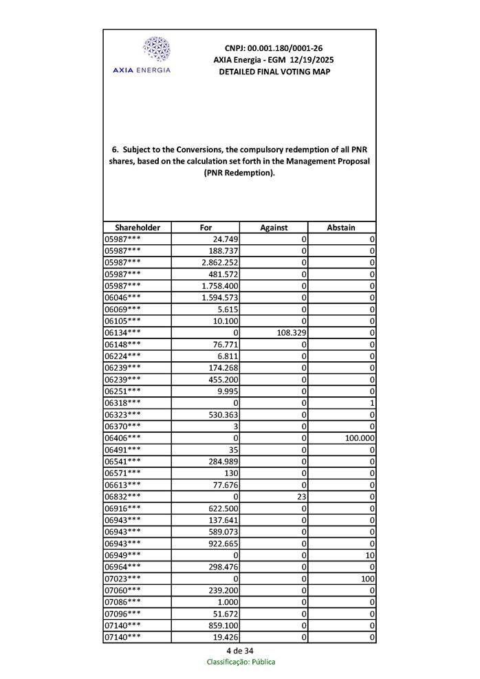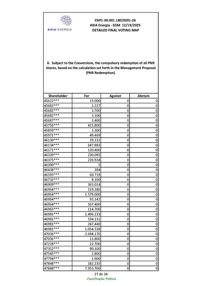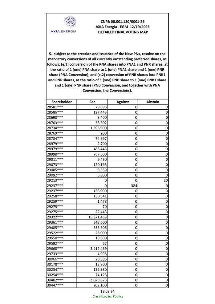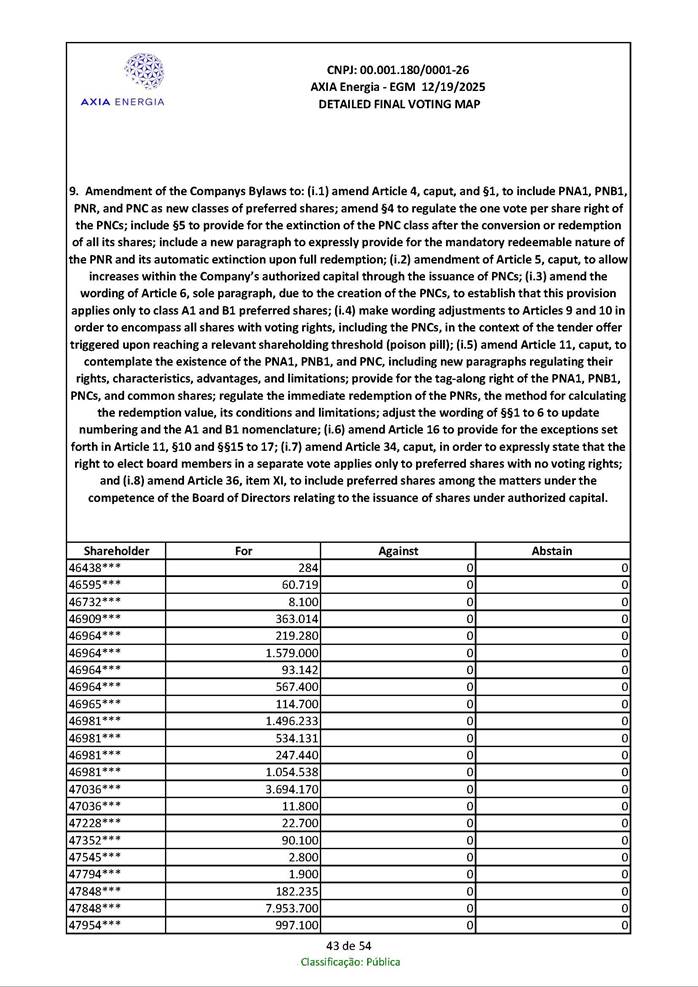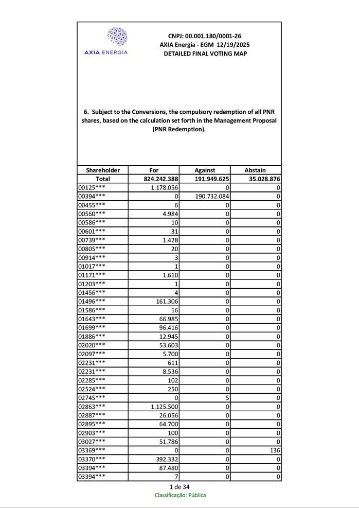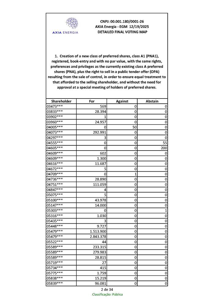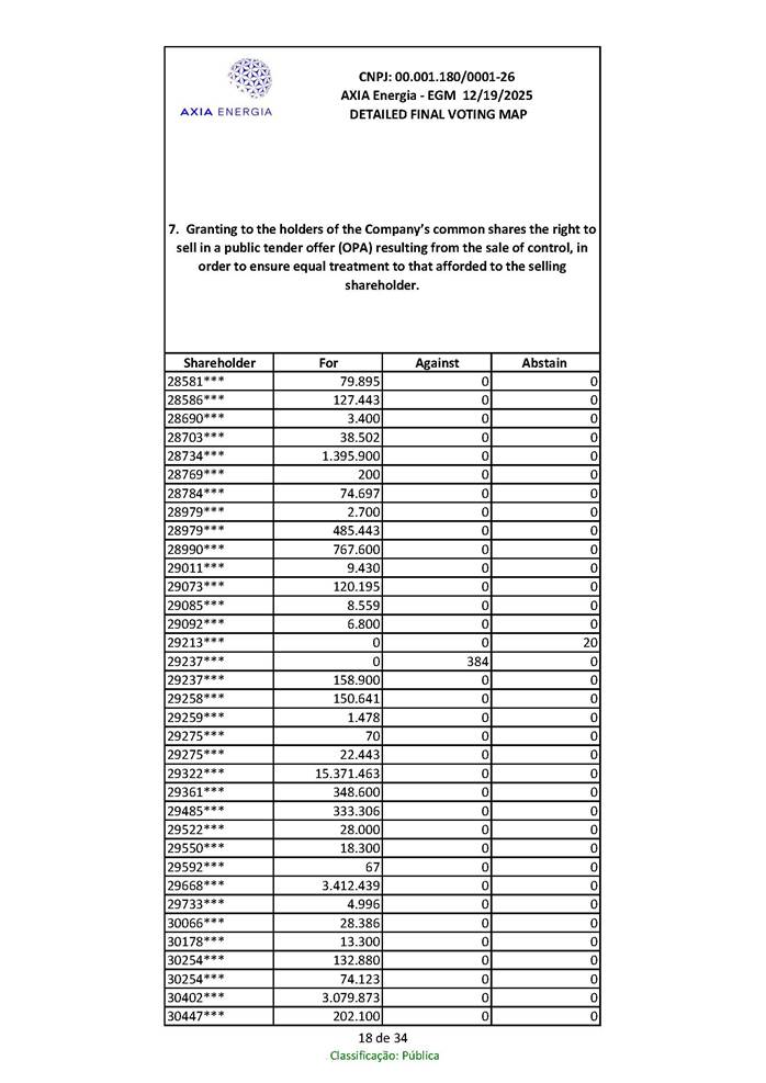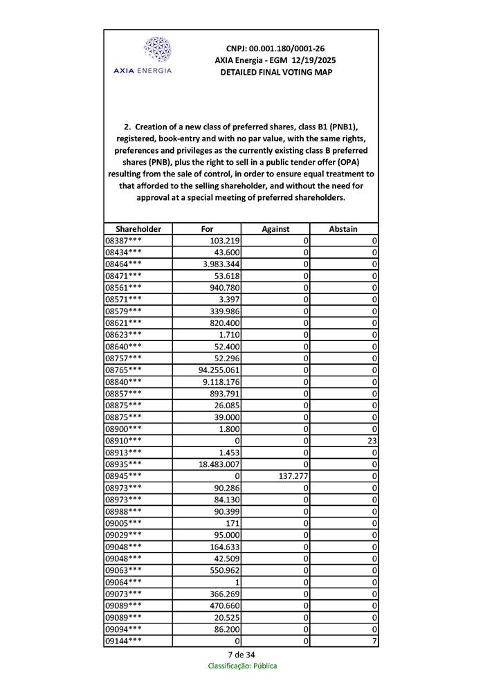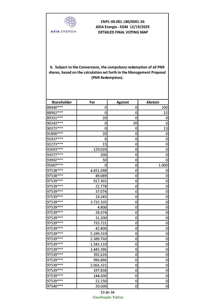 Shareholder For Against Abstain Total 818.181.617 198.176.986 34.862.286 00125*** 1.178.056 0 0 00394*** 0 190.732.084 0 00455*** 6 0 0 00560*** 4.984 0 0 00586*** 10 0 0 00601*** 31 0 0 00739*** 1.428 0 0 00805*** 20 0 0 00914*** 3 0 0 01017*** 1 0 0 01171*** 1.610 0 0 01203*** 1 0 0 01456*** 4 0 0 01496*** 161.306 0 0 01586*** 16 0 0 01643*** 66.985 0 0 01699*** 96.416 0 0 01886*** 12.945 0 0 02020*** 53.603 0 0 02097*** 5.700 0 0 02231*** 611 0 0 02231*** 8.536 0 0 02285*** 102 0 0 02524*** 250 0 0 02745*** 0 5 0 02863*** 1.125.500 0 0 02887*** 26.056 0 0 02895*** 64.700 0 0 02903*** 100 0 0 03027*** 51.786 0 0 03369*** 0 0 136 03370*** 392.332 0 0 03394*** 87.480 0 0 03394*** 7 0 0 1. Creation of a new class of preferred shares, class A1 (PNA1), registered, book-entry and with no par value, with the same rights, preferences and privileges as the currently existing class A preferred shares (PNA), plus the right to sell in a public tender offer (OPA) resulting from the sale of control, in order to ensure equal treatment to that afforded to the selling shareholder, and without the need for approval at a special meeting of holders of preferred shares. CNPJ: 00.001.180/0001-26AXIA Energia - EGM 12/19/2025 DETAILED FINAL VOTING MAP 1 de 34 # Classificação: Pública Shareholder For Against Abstain 1. Creation of a new class of preferred shares, class A1 (PNA1), registered, book-entry and with no par value, with the same rights, preferences and privileges as the currently existing class A preferred shares (PNA), plus the right to sell in a public tender offer (OPA) resulting from the sale of control, in order to ensure equal treatment to that afforded to the selling shareholder, and without the need for approval at a special meeting of holders of preferred shares. CNPJ: 00.001.180/0001-26AXIA Energia - EGM 12/19/2025 DETAILED FINAL VOTING MAP 03473*** 569 0 0 03833*** 28.394 0 0 03902*** 1 0 0 03960*** 24.957 0 0 04005*** 0 50 0 04073*** 292.991 0 0 04297*** 3 0 0 04555*** 0 0 55 04605*** 0 0 200 04609*** 602 0 0 04609*** 1.300 0 0 04616*** 11.687 0 0 04672*** 5 0 0 04709*** 0 1 0 04736*** 28.890 0 0 04751*** 111.059 0 0 04847*** 4 0 0 05075*** 5 0 0 05100*** 43.978 0 0 05147*** 14.000 0 0 05303*** 0 0 1 05316*** 1.030 0 0 05435*** 3 0 0 05448*** 9.727 0 0 05479*** 1.513.900 0 0 05479*** 2.843.378 0 0 05522*** 44 0 0 05589*** 233.315 0 0 05589*** 279.983 0 0 05589*** 28.815 0 0 05719*** 27 0 0 05734*** 415 0 0 05775*** 1.759 0 0 05838*** 15.219 0 0 05839*** 96.081 0 0 2 de 34 # Classificação: Pública Shareholder For Against Abstain 1. Creation of a new class of preferred shares, class A1 (PNA1), registered, book-entry and with no par value, with the same rights, preferences and privileges as the currently existing class A preferred shares (PNA), plus the right to sell in a public tender offer (OPA) resulting from the sale of control, in order to ensure equal treatment to that afforded to the selling shareholder, and without the need for approval at a special meeting of holders of preferred shares. CNPJ: 00.001.180/0001-26AXIA Energia - EGM 12/19/2025 DETAILED FINAL VOTING MAP 05839*** 189.258 0 0 05839*** 718.804 0 0 05839*** 724 0 0 05839*** 775.653 0 0 05839*** 15.200 0 0 05839*** 9.200 0 0 05839*** 803.800 0 0 05839*** 158.291 0 0 05839*** 15.718 0 0 05839*** 0 1.111.508 0 05839*** 4.619.084 0 0 05839*** 226.872 0 0 05839*** 51.889 0 0 05840*** 188.253 0 0 05840*** 10.000 0 0 05840*** 32.547 0 0 05840*** 804.990 0 0 05840*** 4.858.301 0 0 05840*** 477.000 0 0 05840*** 2.199.143 0 0 05872*** 79.961 0 0 05901*** 1 0 0 05986*** 1.881.495 0 0 05986*** 2.673.143 0 0 05986*** 24.100 0 0 05986*** 2.155 0 0 05987*** 147.900 0 0 05987*** 129.553 0 0 05987*** 11.827 0 0 05987*** 2.020.100 0 0 05987*** 1.602.500 0 0 05987*** 5 0 0 05987*** 199.465 0 0 05987*** 13.400 0 0 05987*** 0 428.300 0 3 de 34 # Classificação: Pública Shareholder For Against Abstain 1. Creation of a new class of preferred shares, class A1 (PNA1), registered, book-entry and with no par value, with the same rights, preferences and privileges as the currently existing class A preferred shares (PNA), plus the right to sell in a public tender offer (OPA) resulting from the sale of control, in order to ensure equal treatment to that afforded to the selling shareholder, and without the need for approval at a special meeting of holders of preferred shares. CNPJ: 00.001.180/0001-26AXIA Energia - EGM 12/19/2025 DETAILED FINAL VOTING MAP 05987*** 24.749 0 0 05987*** 188.737 0 0 05987*** 2.862.252 0 0 05987*** 481.572 0 0 05987*** 1.758.400 0 0 06046*** 1.594.573 0 0 06069*** 5.615 0 0 06105*** 10.100 0 0 06134*** 0 108.329 0 06148*** 76.771 0 0 06224*** 6.811 0 0 06239*** 174.268 0 0 06239*** 455.200 0 0 06251*** 9.995 0 0 06318*** 0 0 1 06323*** 530.363 0 0 06370*** 3 0 0 06406*** 0 0 100.000 06491*** 35 0 0 06541*** 284.989 0 0 06571*** 130 0 0 06613*** 77.676 0 0 06832*** 0 23 0 06916*** 622.500 0 0 06943*** 137.641 0 0 06943*** 589.073 0 0 06943*** 922.665 0 0 06949*** 0 0 10 06964*** 298.476 0 0 07023*** 0 0 100 07060*** 239.200 0 0 07086*** 1.000 0 0 07096*** 51.672 0 0 07140*** 0 859.100 0 07140*** 19.426 0 0 4 de 34 # Classificação: Pública Shareholder For Against Abstain 1. Creation of a new class of preferred shares, class A1 (PNA1), registered, book-entry and with no par value, with the same rights, preferences and privileges as the currently existing class A preferred shares (PNA), plus the right to sell in a public tender offer (OPA) resulting from the sale of control, in order to ensure equal treatment to that afforded to the selling shareholder, and without the need for approval at a special meeting of holders of preferred shares. CNPJ: 00.001.180/0001-26AXIA Energia - EGM 12/19/2025 DETAILED FINAL VOTING MAP 07140*** 1.219 0 0 07140*** 26.098 0 0 07187*** 16.269 0 0 07187*** 713 0 0 07191*** 0 857.000 0 07191*** 85.700 0 0 07191*** 105.335 0 0 07226*** 0 0 4 07237*** 589.417 0 0 07237*** 33.388 0 0 07247*** 296