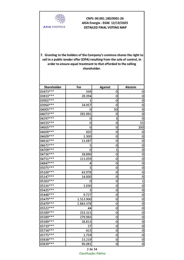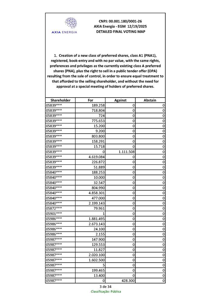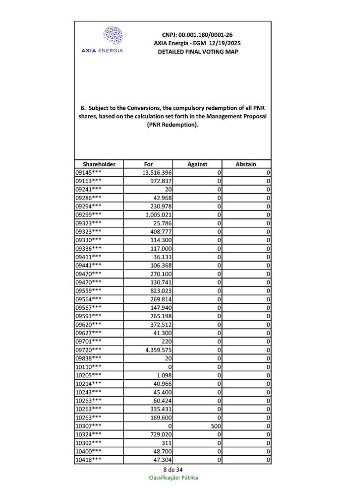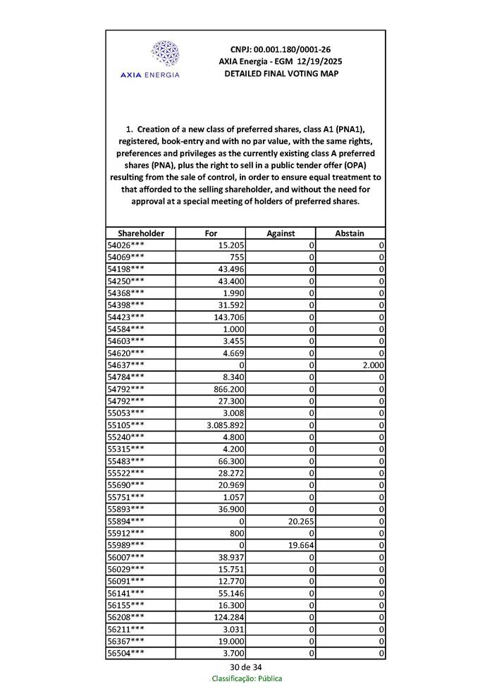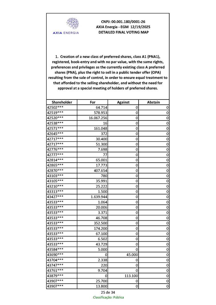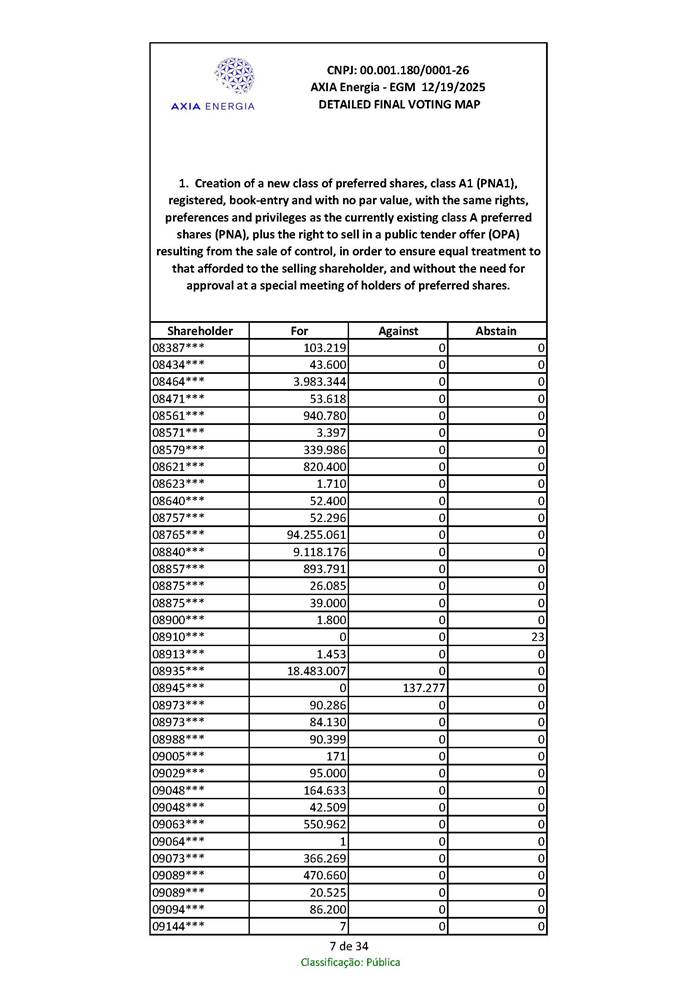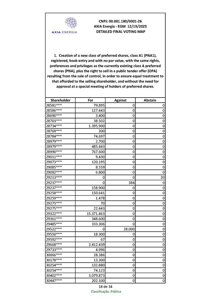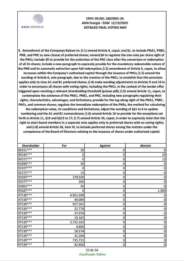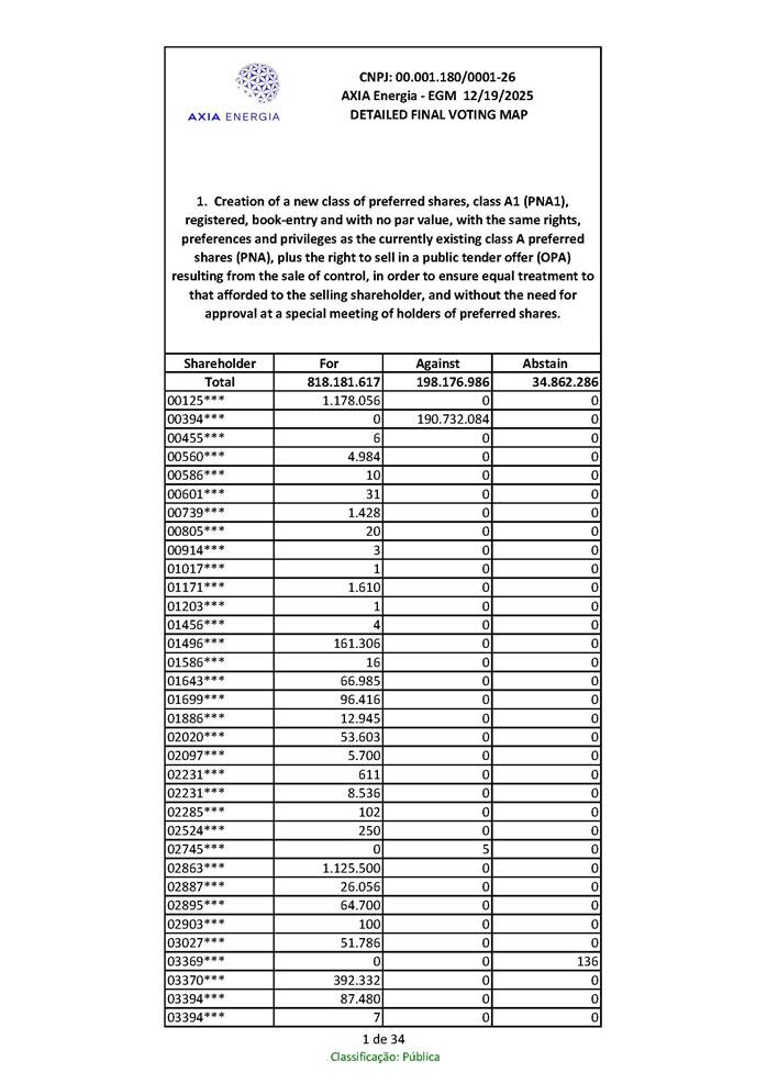 Shareholder For Against Abstain Total 818.181.617 198.176.986 34.862.286 00125*** 1.178.056 0 0 00394*** 0 190.732.084 0 00455*** 6 0 0 00560*** 4.984 0 0 00586*** 10 0 0 00601*** 31 0 0 00739*** 1.428 0 0 00805*** 20 0 0 00914*** 3 0 0 01017*** 1 0 0 01171*** 1.610 0 0 01203*** 1 0 0 01456*** 4 0 0 01496*** 161.306 0 0 01586*** 16 0 0 01643*** 66.985 0 0 01699*** 96.416 0 0 01886*** 12.945 0 0 02020*** 53.603 0 0 02097*** 5.700 0 0 02231*** 611 0 0 02231*** 8.536 0 0 02285*** 102 0 0 02524*** 250 0 0 02745*** 0 5 0 02863*** 1.125.500 0 0 02887*** 26.056 0 0 02895*** 64.700 0 0 02903*** 100 0 0 03027*** 51.786 0 0 03369*** 0 0 136 03370*** 392.332 0 0 03394*** 87.480 0 0 03394*** 7 0 0 1. Creation of a new class of preferred shares, class A1 (PNA1), registered, book-entry and with no par value, with the same rights, preferences and privileges as the currently existing class A preferred shares (PNA), plus the right to sell in a public tender offer (OPA) resulting from the sale of control, in order to ensure equal treatment to that afforded to the selling shareholder, and without the need for approval at a special meeting of holders of preferred shares. CNPJ: 00.001.180/0001-26AXIA Energia - EGM 12/19/2025 DETAILED FINAL VOTING MAP 1 de 34 # Classificação: Pública Shareholder For Against Abstain 1. Creation of a new class of preferred shares, class A1 (PNA1), registered, book-entry and with no par value, with the same rights, preferences and privileges as the currently existing class A preferred shares (PNA), plus the right to sell in a public tender offer (OPA) resulting from the sale of control, in order to ensure equal treatment to that afforded to the selling shareholder, and without the need for approval at a special meeting of holders of preferred shares. CNPJ: 00.001.180/0001-26AXIA Energia - EGM 12/19/2025 DETAILED FINAL VOTING MAP 03473*** 569 0 0 03833*** 28.394 0 0 03902*** 1 0 0 03960*** 24.957 0 0 04005*** 0 50 0 04073*** 292.991 0 0 04297*** 3 0 0 04555*** 0 0 55 04605*** 0 0 200 04609*** 602 0 0 04609*** 1.300 0 0 04616*** 11.687 0 0 04672*** 5 0 0 04709*** 0 1 0 04736*** 28.890 0 0 04751*** 111.059 0 0 04847*** 4 0 0 05075*** 5 0 0 05100*** 43.978 0 0 05147*** 14.000 0 0 05303*** 0 0 1 05316*** 1.030 0 0 05435*** 3 0 0 05448*** 9.727 0 0 05479*** 1.513.900 0 0 05479*** 2.843.378 0 0 05522*** 44 0 0 05589*** 233.315 0 0 05589*** 279.983 0 0 05589*** 28.815 0 0 05719*** 27 0 0 05734*** 415 0 0 05775*** 1.759 0 0 05838*** 15.219 0 0 05839*** 96.081 0 0 2 de 34 # Classificação: Pública Shareholder For Against Abstain 1. Creation of a new class of preferred shares, class A1 (PNA1), registered, book-entry and with no par value, with the same rights, preferences and privileges as the currently existing class A preferred shares (PNA), plus the right to sell in a public tender offer (OPA) resulting from the sale of control, in order to ensure equal treatment to that afforded to the selling shareholder, and without the need for approval at a special meeting of holders of preferred shares. CNPJ: 00.001.180/0001-26AXIA Energia - EGM 12/19/2025 DETAILED FINAL VOTING MAP 05839*** 189.258 0 0 05839*** 718.804 0 0 05839*** 724 0 0 05839*** 775.653 0 0 05839*** 15.200 0 0 05839*** 9.200 0 0 05839*** 803.800 0 0 05839*** 158.291 0 0 05839*** 15.718 0 0 05839*** 0 1.111.508 0 05839*** 4.619.084 0 0 05839*** 226.872 0 0 05839*** 51.889 0 0 05840*** 188.253 0 0 05840*** 10.000 0 0 05840*** 32.547 0 0 05840*** 804.990 0 0 05840*** 4.858.301 0 0 05840*** 477.000 0 0 05840*** 2.199.143 0 0 05872*** 79.961 0 0 05901*** 1 0 0 05986*** 1.881.495 0 0 05986*** 2.673.143 0 0 05986*** 24.100 0 0 05986*** 2.155 0 0 05987*** 147.900 0 0 05987*** 129.553 0 0 05987*** 11.827 0 0 05987*** 2.020.100 0 0 05987*** 1.602.500 0 0 05987*** 5 0 0 05987*** 199.465 0 0 05987*** 13.400 0 0 05987*** 0 428.300 0 3 de 34 # Classificação: Pública Shareholder For Against Abstain 1. Creation of a new class of preferred shares, class A1 (PNA1), registered, book-entry and with no par value, with the same rights, preferences and privileges as the currently existing class A preferred shares (PNA), plus the right to sell in a public tender offer (OPA) resulting from the sale of control, in order to ensure equal treatment to that afforded to the selling shareholder, and without the need for approval at a special meeting of holders of preferred shares. CNPJ: 00.001.180/0001-26AXIA Energia - EGM 12/19/2025 DETAILED FINAL VOTING MAP 05987*** 24.749 0 0 05987*** 188.737 0 0 05987*** 2.862.252 0 0 05987*** 481.572 0 0 05987*** 1.758.400 0 0 06046*** 1.594.573 0 0 06069*** 5.615 0 0 06105*** 10.100 0 0 06134*** 0 108.329 0 06148*** 76.771 0 0 06224*** 6.811 0 0 06239*** 174.268 0 0 06239*** 455.200 0 0 06251*** 9.995 0 0 06318*** 0 0 1 06323*** 530.363 0 0 06370*** 3 0 0 06406*** 0 0 100.000 06491*** 35 0 0 06541*** 284.989 0 0 06571*** 130 0 0 06613*** 77.676 0 0 06832*** 0 23 0 06916*** 622.500 0 0 06943*** 137.641 0 0 06943*** 589.073 0 0 06943*** 922.665 0 0 06949*** 0 0 10 06964*** 298.476 0 0 07023*** 0 0 100 07060*** 239.200 0 0 07086*** 1.000 0 0 07096*** 51.672 0 0 07140*** 0 859.100 0 07140*** 19.426 0 0 4 de 34 # Classificação: Pública Shareholder For Against Abstain 1. Creation of a new class of preferred shares, class A1 (PNA1), registered, book-entry and with no par value, with the same rights, preferences and privileges as the currently existing class A preferred shares (PNA), plus the right to sell in a public tender offer (OPA) resulting from the sale of control, in order to ensure equal treatment to that afforded to the selling shareholder, and without the need for approval at a special meeting of holders of preferred shares. CNPJ: 00.001.180/0001-26AXIA Energia - EGM 12/19/2025 DETAILED FINAL VOTING MAP 07140*** 1.219 0 0 07140*** 26.098 0 0 07187*** 16.269 0 0 07187*** 713 0 0 07191*** 0 857.000 0 07191*** 85.700 0 0 07191*** 105.335 0 0 07226*** 0 0 4 07237*** 589.417 0 0 07237*** 33.388 0 0 07247*** 296