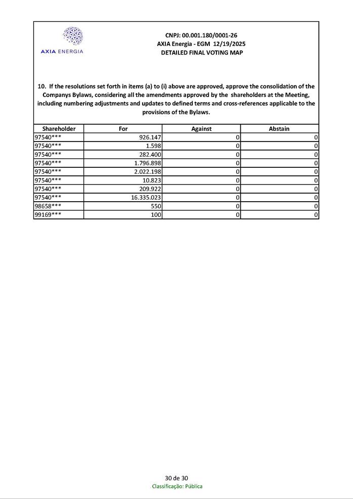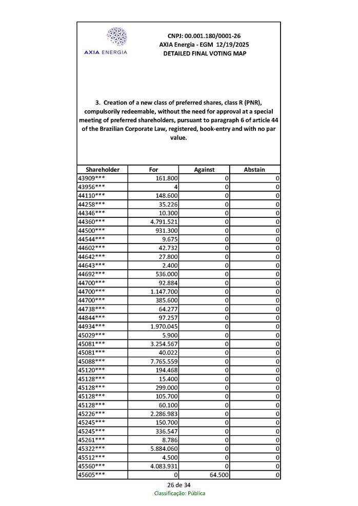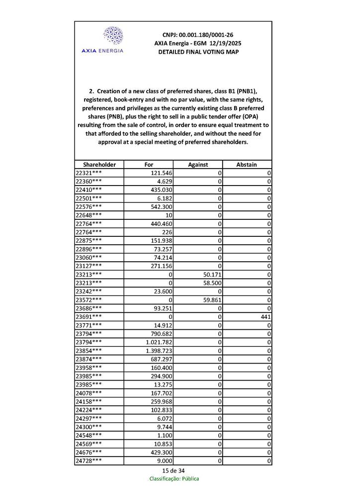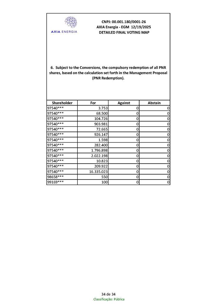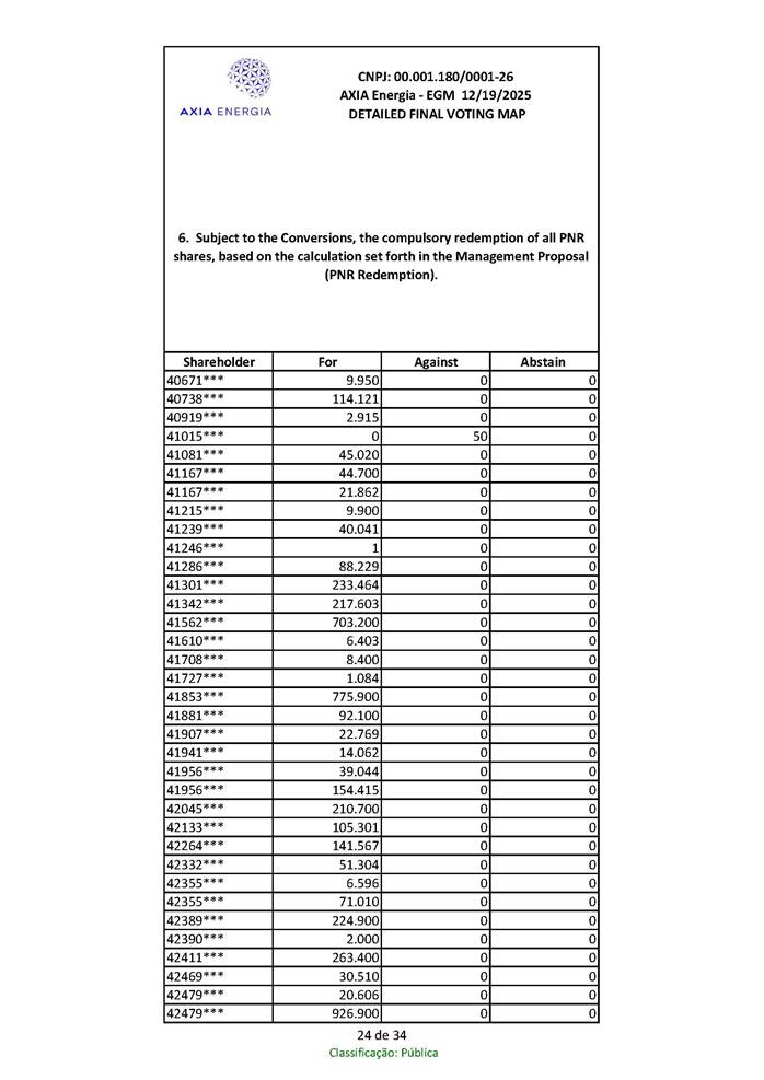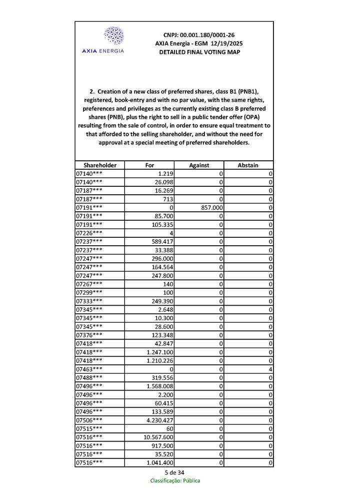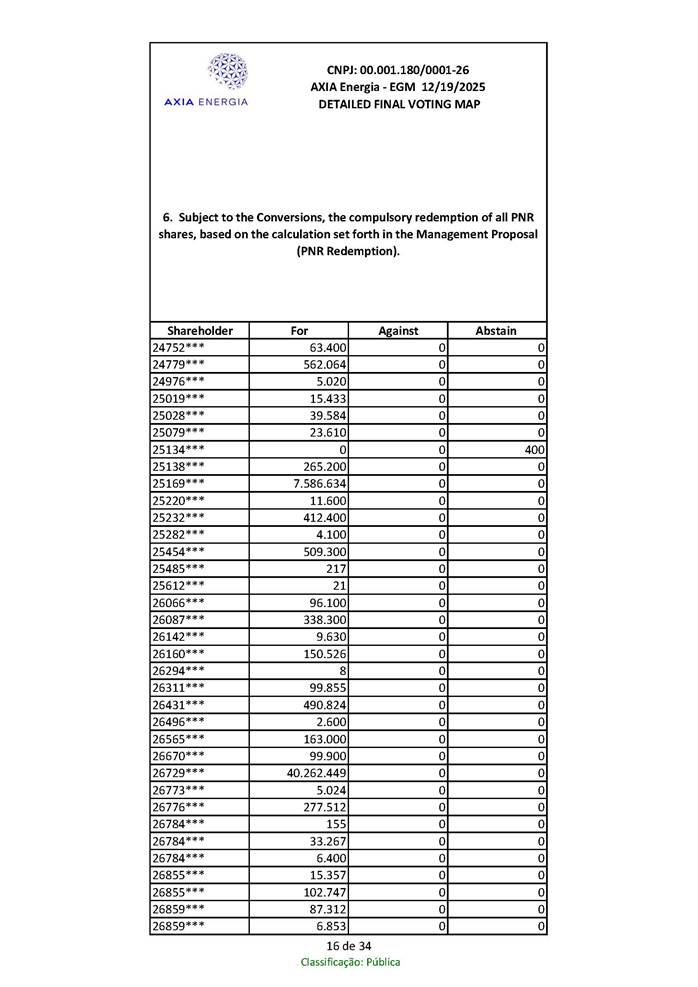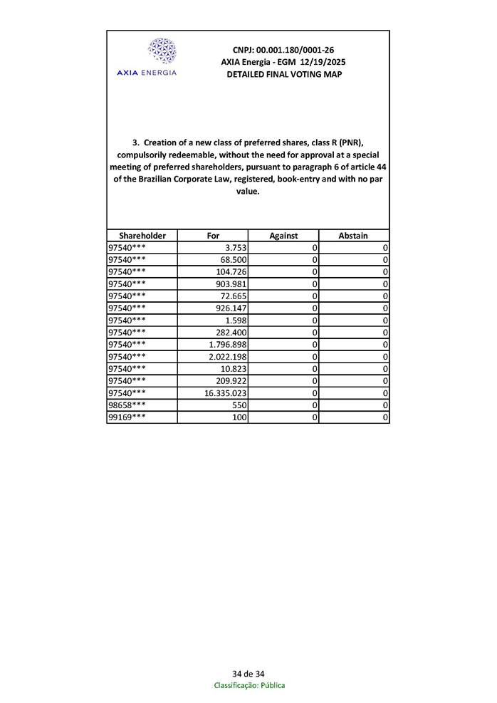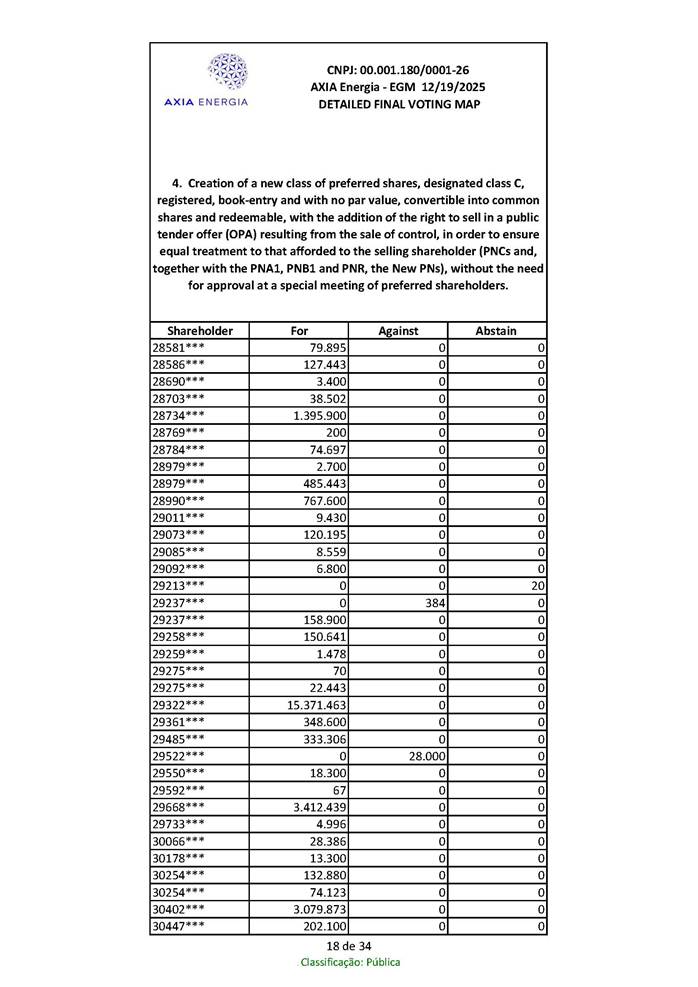 Shareholder For Against Abstain Total 818.181.617 198.176.986 34.862.286 00125*** 1.178.056 0 0 00394*** 0 190.732.084 0 00455*** 6 0 0 00560*** 4.984 0 0 00586*** 10 0 0 00601*** 31 0 0 00739*** 1.428 0 0 00805*** 20 0 0 00914*** 3 0 0 01017*** 1 0 0 01171*** 1.610 0 0 01203*** 1 0 0 01456*** 4 0 0 01496*** 161.306 0 0 01586*** 16 0 0 01643*** 66.985 0 0 01699*** 96.416 0 0 01886*** 12.945 0 0 02020*** 53.603 0 0 02097*** 5.700 0 0 02231*** 611 0 0 02231*** 8.536 0 0 02285*** 102 0 0 02524*** 250 0 0 02745*** 0 5 0 02863*** 1.125.500 0 0 02887*** 26.056 0 0 02895*** 64.700 0 0 02903*** 100 0 0 03027*** 51.786 0 0 03369*** 0 0 136 03370*** 392.332 0 0 03394*** 87.480 0 0 03394*** 7 0 0 1. Creation of a new class of preferred shares, class A1 (PNA1), registered, book-entry and with no par value, with the same rights, preferences and privileges as the currently existing class A preferred shares (PNA), plus the right to sell in a public tender offer (OPA) resulting from the sale of control, in order to ensure equal treatment to that afforded to the selling shareholder, and without the need for approval at a special meeting of holders of preferred shares. CNPJ: 00.001.180/0001-26AXIA Energia - EGM 12/19/2025 DETAILED FINAL VOTING MAP 1 de 34 # Classificação: Pública Shareholder For Against Abstain 1. Creation of a new class of preferred shares, class A1 (PNA1), registered, book-entry and with no par value, with the same rights, preferences and privileges as the currently existing class A preferred shares (PNA), plus the right to sell in a public tender offer (OPA) resulting from the sale of control, in order to ensure equal treatment to that afforded to the selling shareholder, and without the need for approval at a special meeting of holders of preferred shares. CNPJ: 00.001.180/0001-26AXIA Energia - EGM 12/19/2025 DETAILED FINAL VOTING MAP 03473*** 569 0 0 03833*** 28.394 0 0 03902*** 1 0 0 03960*** 24.957 0 0 04005*** 0 50 0 04073*** 292.991 0 0 04297*** 3 0 0 04555*** 0 0 55 04605*** 0 0 200 04609*** 602 0 0 04609*** 1.300 0 0 04616*** 11.687 0 0 04672*** 5 0 0 04709*** 0 1 0 04736*** 28.890 0 0 04751*** 111.059 0 0 04847*** 4 0 0 05075*** 5 0 0 05100*** 43.978 0 0 05147*** 14.000 0 0 05303*** 0 0 1 05316*** 1.030 0 0 05435*** 3 0 0 05448*** 9.727 0 0 05479*** 1.513.900 0 0 05479*** 2.843.378 0 0 05522*** 44 0 0 05589*** 233.315 0 0 05589*** 279.983 0 0 05589*** 28.815 0 0 05719*** 27 0 0 05734*** 415 0 0 05775*** 1.759 0 0 05838*** 15.219 0 0 05839*** 96.081 0 0 2 de 34 # Classificação: Pública Shareholder For Against Abstain 1. Creation of a new class of preferred shares, class A1 (PNA1), registered, book-entry and with no par value, with the same rights, preferences and privileges as the currently existing class A preferred shares (PNA), plus the right to sell in a public tender offer (OPA) resulting from the sale of control, in order to ensure equal treatment to that afforded to the selling shareholder, and without the need for approval at a special meeting of holders of preferred shares. CNPJ: 00.001.180/0001-26AXIA Energia - EGM 12/19/2025 DETAILED FINAL VOTING MAP 05839*** 189.258 0 0 05839*** 718.804 0 0 05839*** 724 0 0 05839*** 775.653 0 0 05839*** 15.200 0 0 05839*** 9.200 0 0 05839*** 803.800 0 0 05839*** 158.291 0 0 05839*** 15.718 0 0 05839*** 0 1.111.508 0 05839*** 4.619.084 0 0 05839*** 226.872 0 0 05839*** 51.889 0 0 05840*** 188.253 0 0 05840*** 10.000 0 0 05840*** 32.547 0 0 05840*** 804.990 0 0 05840*** 4.858.301 0 0 05840*** 477.000 0 0 05840*** 2.199.143 0 0 05872*** 79.961 0 0 05901*** 1 0 0 05986*** 1.881.495 0 0 05986*** 2.673.143 0 0 05986*** 24.100 0 0 05986*** 2.155 0 0 05987*** 147.900 0 0 05987*** 129.553 0 0 05987*** 11.827 0 0 05987*** 2.020.100 0 0 05987*** 1.602.500 0 0 05987*** 5 0 0 05987*** 199.465 0 0 05987*** 13.400 0 0 05987*** 0 428.300 0 3 de 34 # Classificação: Pública Shareholder For Against Abstain 1. Creation of a new class of preferred shares, class A1 (PNA1), registered, book-entry and with no par value, with the same rights, preferences and privileges as the currently existing class A preferred shares (PNA), plus the right to sell in a public tender offer (OPA) resulting from the sale of control, in order to ensure equal treatment to that afforded to the selling shareholder, and without the need for approval at a special meeting of holders of preferred shares. CNPJ: 00.001.180/0001-26AXIA Energia - EGM 12/19/2025 DETAILED FINAL VOTING MAP 05987*** 24.749 0 0 05987*** 188.737 0 0 05987*** 2.862.252 0 0 05987*** 481.572 0 0 05987*** 1.758.400 0 0 06046*** 1.594.573 0 0 06069*** 5.615 0 0 06105*** 10.100 0 0 06134*** 0 108.329 0 06148*** 76.771 0 0 06224*** 6.811 0 0 06239*** 174.268 0 0 06239*** 455.200 0 0 06251*** 9.995 0 0 06318*** 0 0 1 06323*** 530.363 0 0 06370*** 3 0 0 06406*** 0 0 100.000 06491*** 35 0 0 06541*** 284.989 0 0 06571*** 130 0 0 06613*** 77.676 0 0 06832*** 0 23 0 06916*** 622.500 0 0 06943*** 137.641 0 0 06943*** 589.073 0 0 06943*** 922.665 0 0 06949*** 0 0 10 06964*** 298.476 0 0 07023*** 0 0 100 07060*** 239.200 0 0 07086*** 1.000 0 0 07096*** 51.672 0 0 07140*** 0 859.100 0 07140*** 19.426 0 0 4 de 34 # Classificação: Pública Shareholder For Against Abstain 1. Creation of a new class of preferred shares, class A1 (PNA1), registered, book-entry and with no par value, with the same rights, preferences and privileges as the currently existing class A preferred shares (PNA), plus the right to sell in a public tender offer (OPA) resulting from the sale of control, in order to ensure equal treatment to that afforded to the selling shareholder, and without the need for approval at a special meeting of holders of preferred shares. CNPJ: 00.001.180/0001-26AXIA Energia - EGM 12/19/2025 DETAILED FINAL VOTING MAP 07140*** 1.219 0 0 07140*** 26.098 0 0 07187*** 16.269 0 0 07187*** 713 0 0 07191*** 0 857.000 0 07191*** 85.700 0 0 07191*** 105.335 0 0 07226*** 0 0 4 07237*** 589.417 0 0 07237*** 33.388 0 0 07247*** 296