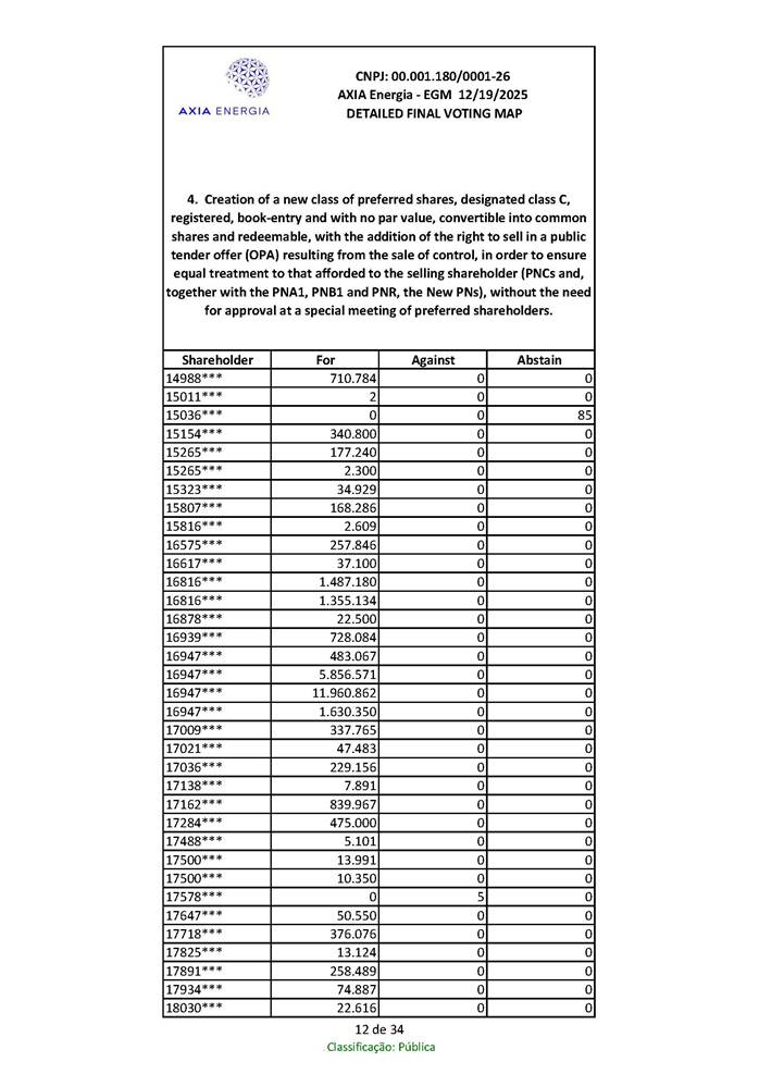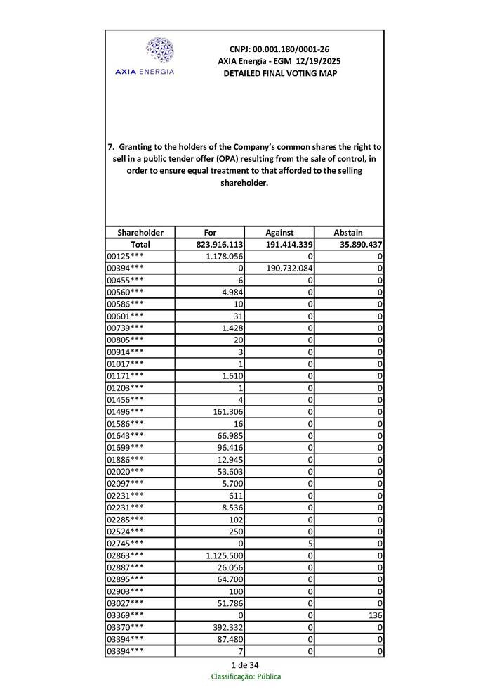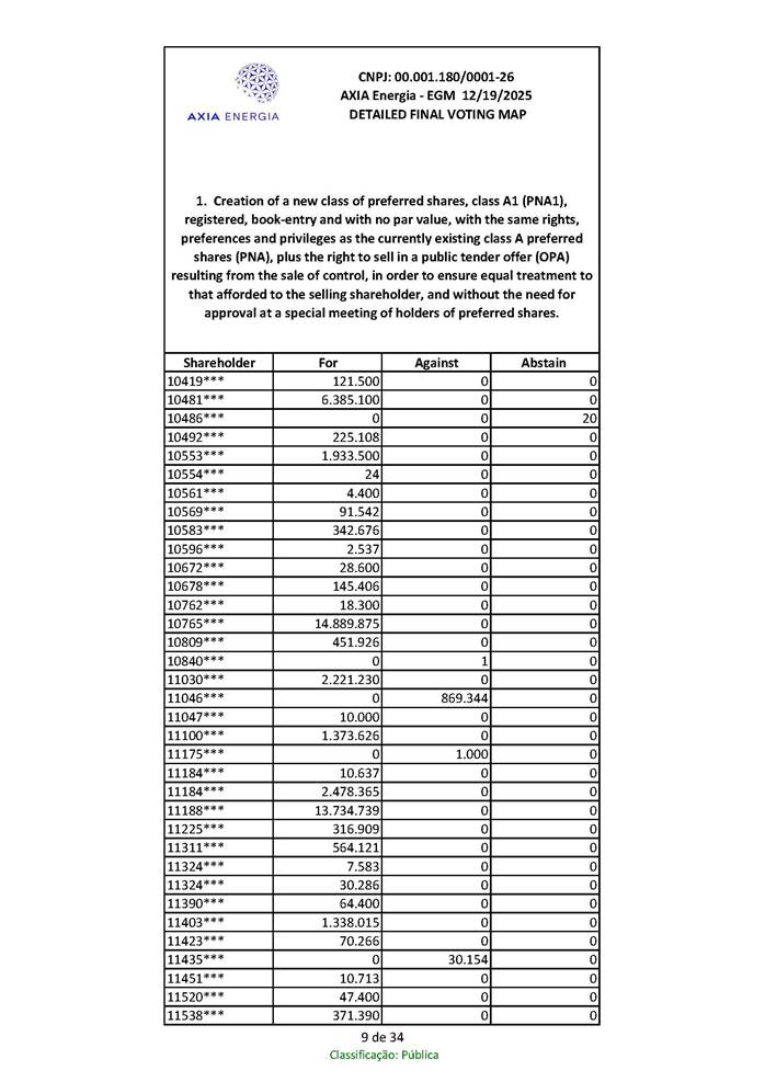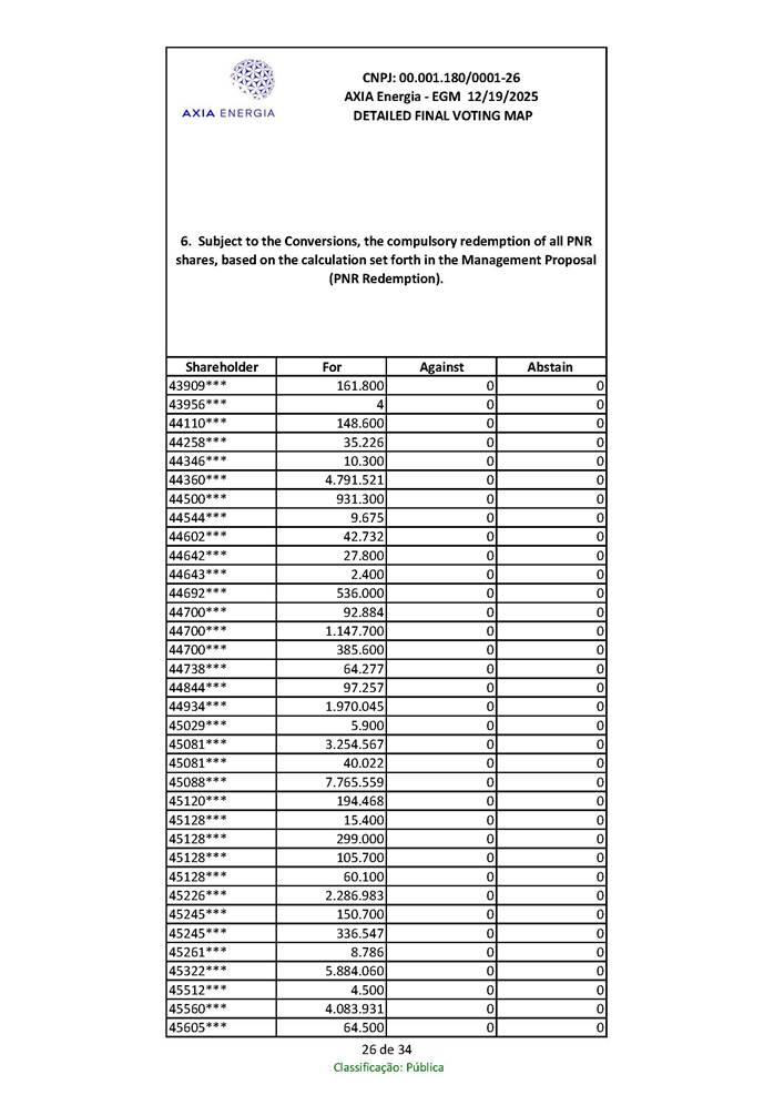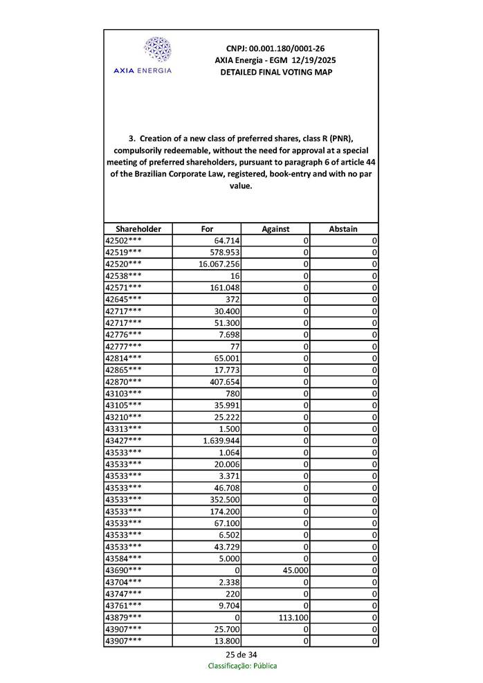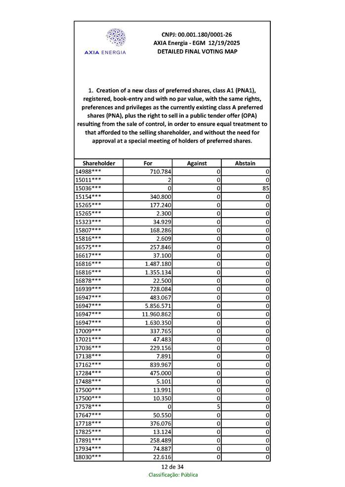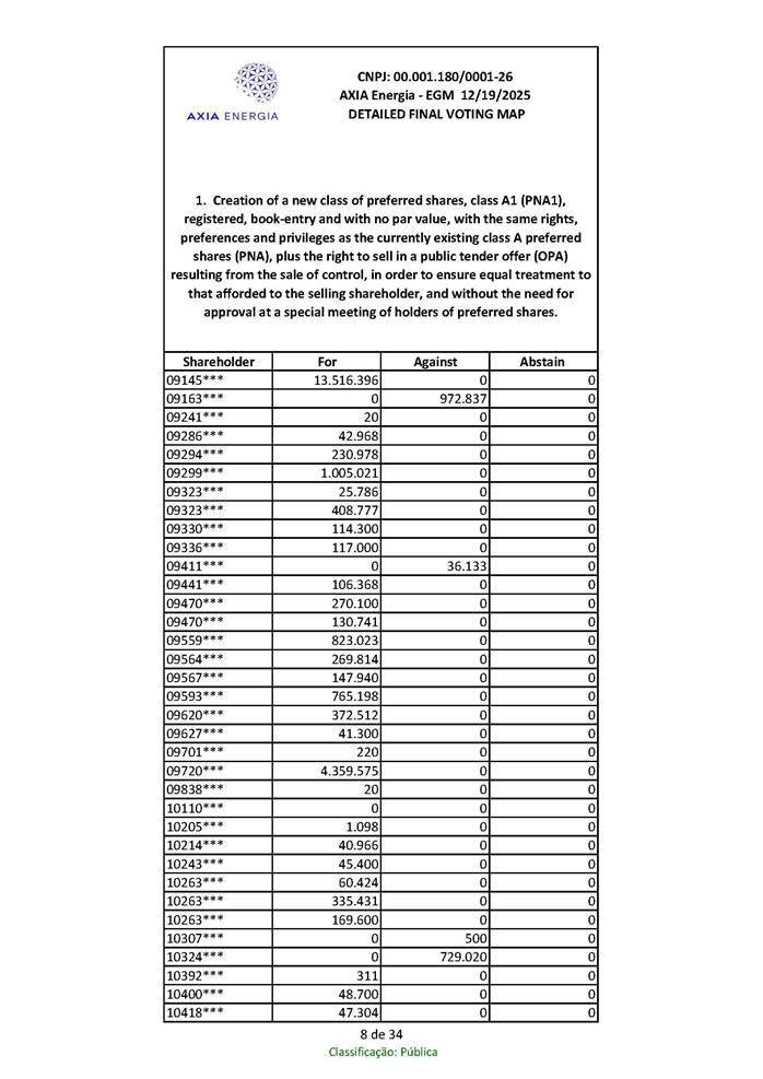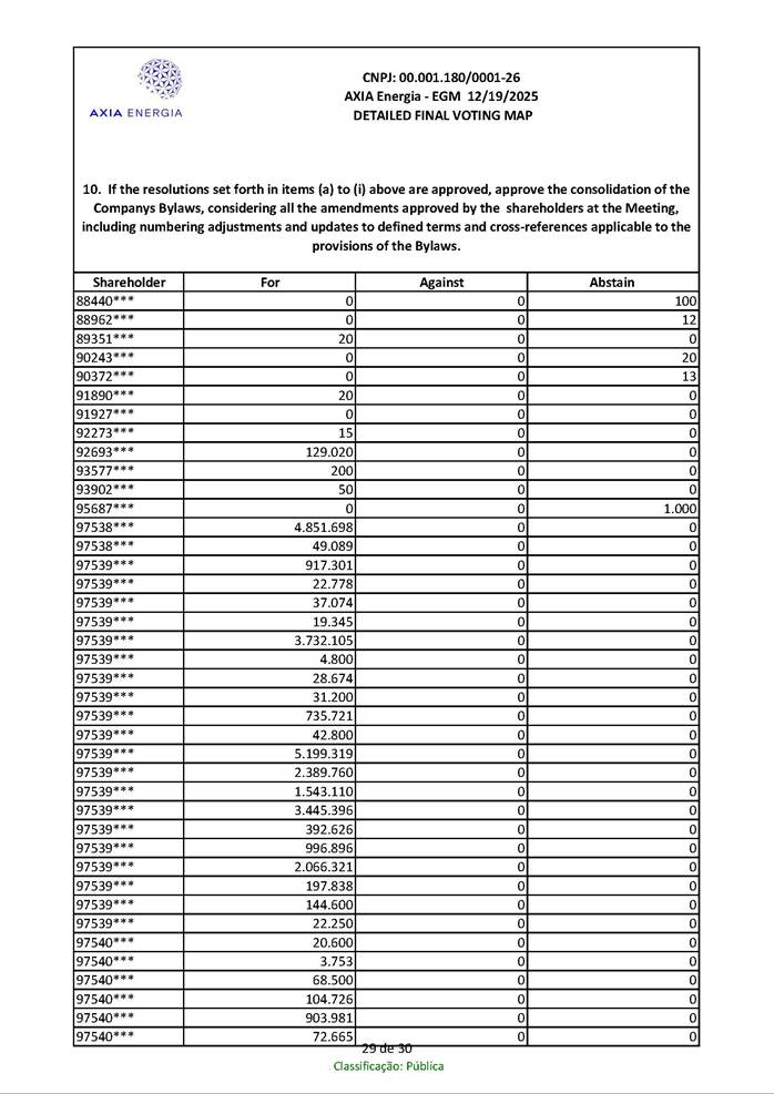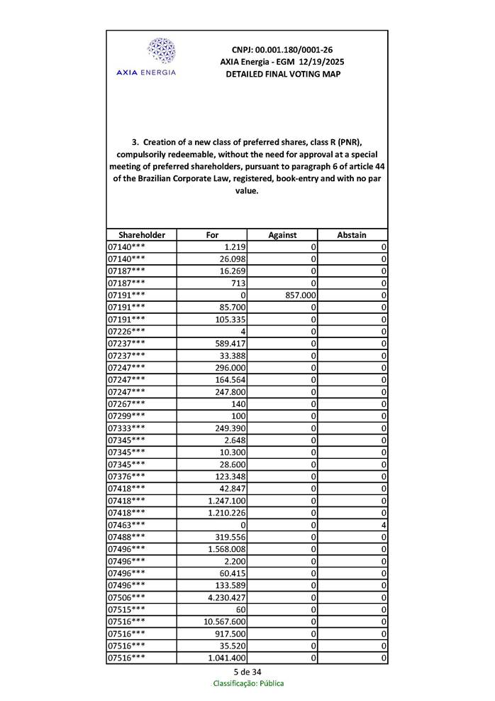 Shareholder For Against Abstain Total 818.181.617 198.176.986 34.862.286 00125*** 1.178.056 0 0 00394*** 0 190.732.084 0 00455*** 6 0 0 00560*** 4.984 0 0 00586*** 10 0 0 00601*** 31 0 0 00739*** 1.428 0 0 00805*** 20 0 0 00914*** 3 0 0 01017*** 1 0 0 01171*** 1.610 0 0 01203*** 1 0 0 01456*** 4 0 0 01496*** 161.306 0 0 01586*** 16 0 0 01643*** 66.985 0 0 01699*** 96.416 0 0 01886*** 12.945 0 0 02020*** 53.603 0 0 02097*** 5.700 0 0 02231*** 611 0 0 02231*** 8.536 0 0 02285*** 102 0 0 02524*** 250 0 0 02745*** 0 5 0 02863*** 1.125.500 0 0 02887*** 26.056 0 0 02895*** 64.700 0 0 02903*** 100 0 0 03027*** 51.786 0 0 03369*** 0 0 136 03370*** 392.332 0 0 03394*** 87.480 0 0 03394*** 7 0 0 1. Creation of a new class of preferred shares, class A1 (PNA1), registered, book-entry and with no par value, with the same rights, preferences and privileges as the currently existing class A preferred shares (PNA), plus the right to sell in a public tender offer (OPA) resulting from the sale of control, in order to ensure equal treatment to that afforded to the selling shareholder, and without the need for approval at a special meeting of holders of preferred shares. CNPJ: 00.001.180/0001-26AXIA Energia - EGM 12/19/2025 DETAILED FINAL VOTING MAP 1 de 34 # Classificação: Pública Shareholder For Against Abstain 1. Creation of a new class of preferred shares, class A1 (PNA1), registered, book-entry and with no par value, with the same rights, preferences and privileges as the currently existing class A preferred shares (PNA), plus the right to sell in a public tender offer (OPA) resulting from the sale of control, in order to ensure equal treatment to that afforded to the selling shareholder, and without the need for approval at a special meeting of holders of preferred shares. CNPJ: 00.001.180/0001-26AXIA Energia - EGM 12/19/2025 DETAILED FINAL VOTING MAP 03473*** 569 0 0 03833*** 28.394 0 0 03902*** 1 0 0 03960*** 24.957 0 0 04005*** 0 50 0 04073*** 292.991 0 0 04297*** 3 0 0 04555*** 0 0 55 04605*** 0 0 200 04609*** 602 0 0 04609*** 1.300 0 0 04616*** 11.687 0 0 04672*** 5 0 0 04709*** 0 1 0 04736*** 28.890 0 0 04751*** 111.059 0 0 04847*** 4 0 0 05075*** 5 0 0 05100*** 43.978 0 0 05147*** 14.000 0 0 05303*** 0 0 1 05316*** 1.030 0 0 05435*** 3 0 0 05448*** 9.727 0 0 05479*** 1.513.900 0 0 05479*** 2.843.378 0 0 05522*** 44 0 0 05589*** 233.315 0 0 05589*** 279.983 0 0 05589*** 28.815 0 0 05719*** 27 0 0 05734*** 415 0 0 05775*** 1.759 0 0 05838*** 15.219 0 0 05839*** 96.081 0 0 2 de 34 # Classificação: Pública Shareholder For Against Abstain 1. Creation of a new class of preferred shares, class A1 (PNA1), registered, book-entry and with no par value, with the same rights, preferences and privileges as the currently existing class A preferred shares (PNA), plus the right to sell in a public tender offer (OPA) resulting from the sale of control, in order to ensure equal treatment to that afforded to the selling shareholder, and without the need for approval at a special meeting of holders of preferred shares. CNPJ: 00.001.180/0001-26AXIA Energia - EGM 12/19/2025 DETAILED FINAL VOTING MAP 05839*** 189.258 0 0 05839*** 718.804 0 0 05839*** 724 0 0 05839*** 775.653 0 0 05839*** 15.200 0 0 05839*** 9.200 0 0 05839*** 803.800 0 0 05839*** 158.291 0 0 05839*** 15.718 0 0 05839*** 0 1.111.508 0 05839*** 4.619.084 0 0 05839*** 226.872 0 0 05839*** 51.889 0 0 05840*** 188.253 0 0 05840*** 10.000 0 0 05840*** 32.547 0 0 05840*** 804.990 0 0 05840*** 4.858.301 0 0 05840*** 477.000 0 0 05840*** 2.199.143 0 0 05872*** 79.961 0 0 05901*** 1 0 0 05986*** 1.881.495 0 0 05986*** 2.673.143 0 0 05986*** 24.100 0 0 05986*** 2.155 0 0 05987*** 147.900 0 0 05987*** 129.553 0 0 05987*** 11.827 0 0 05987*** 2.020.100 0 0 05987*** 1.602.500 0 0 05987*** 5 0 0 05987*** 199.465 0 0 05987*** 13.400 0 0 05987*** 0 428.300 0 3 de 34 # Classificação: Pública Shareholder For Against Abstain 1. Creation of a new class of preferred shares, class A1 (PNA1), registered, book-entry and with no par value, with the same rights, preferences and privileges as the currently existing class A preferred shares (PNA), plus the right to sell in a public tender offer (OPA) resulting from the sale of control, in order to ensure equal treatment to that afforded to the selling shareholder, and without the need for approval at a special meeting of holders of preferred shares. CNPJ: 00.001.180/0001-26AXIA Energia - EGM 12/19/2025 DETAILED FINAL VOTING MAP 05987*** 24.749 0 0 05987*** 188.737 0 0 05987*** 2.862.252 0 0 05987*** 481.572 0 0 05987*** 1.758.400 0 0 06046*** 1.594.573 0 0 06069*** 5.615 0 0 06105*** 10.100 0 0 06134*** 0 108.329 0 06148*** 76.771 0 0 06224*** 6.811 0 0 06239*** 174.268 0 0 06239*** 455.200 0 0 06251*** 9.995 0 0 06318*** 0 0 1 06323*** 530.363 0 0 06370*** 3 0 0 06406*** 0 0 100.000 06491*** 35 0 0 06541*** 284.989 0 0 06571*** 130 0 0 06613*** 77.676 0 0 06832*** 0 23 0 06916*** 622.500 0 0 06943*** 137.641 0 0 06943*** 589.073 0 0 06943*** 922.665 0 0 06949*** 0 0 10 06964*** 298.476 0 0 07023*** 0 0 100 07060*** 239.200 0 0 07086*** 1.000 0 0 07096*** 51.672 0 0 07140*** 0 859.100 0 07140*** 19.426 0 0 4 de 34 # Classificação: Pública Shareholder For Against Abstain 1. Creation of a new class of preferred shares, class A1 (PNA1), registered, book-entry and with no par value, with the same rights, preferences and privileges as the currently existing class A preferred shares (PNA), plus the right to sell in a public tender offer (OPA) resulting from the sale of control, in order to ensure equal treatment to that afforded to the selling shareholder, and without the need for approval at a special meeting of holders of preferred shares. CNPJ: 00.001.180/0001-26AXIA Energia - EGM 12/19/2025 DETAILED FINAL VOTING MAP 07140*** 1.219 0 0 07140*** 26.098 0 0 07187*** 16.269 0 0 07187*** 713 0 0 07191*** 0 857.000 0 07191*** 85.700 0 0 07191*** 105.335 0 0 07226*** 0 0 4 07237*** 589.417 0 0 07237*** 33.388 0 0 07247*** 296