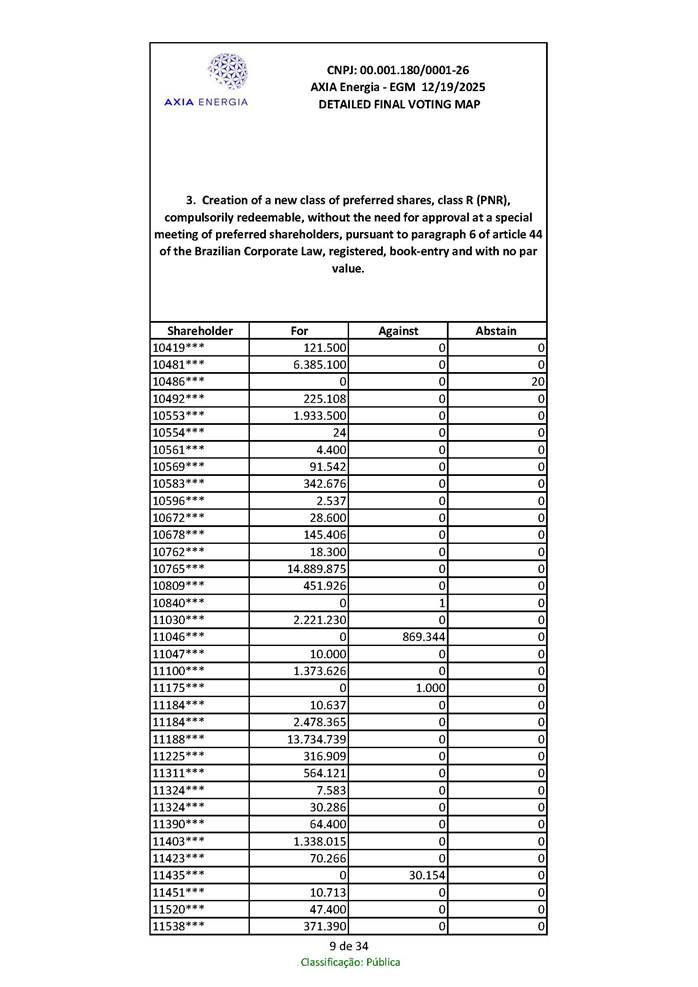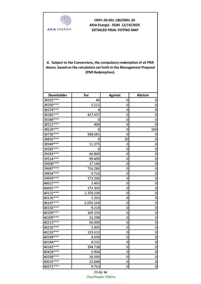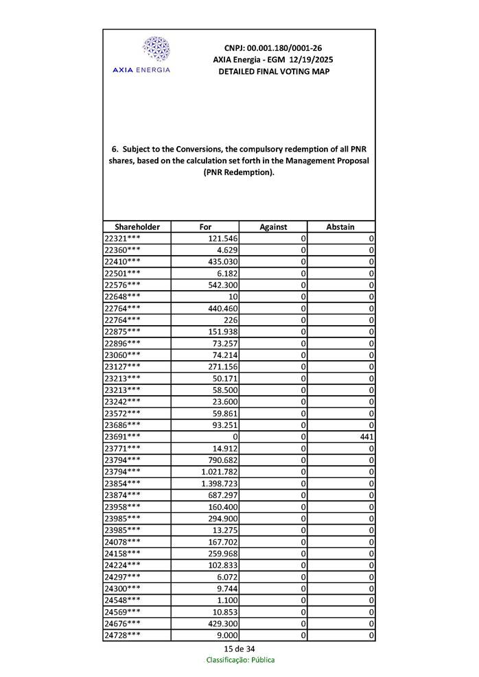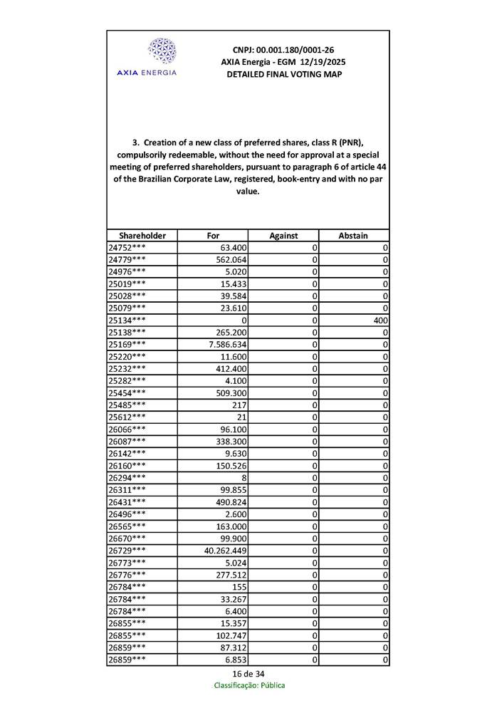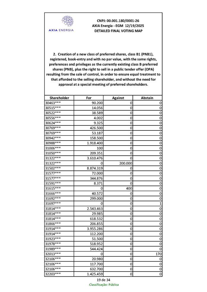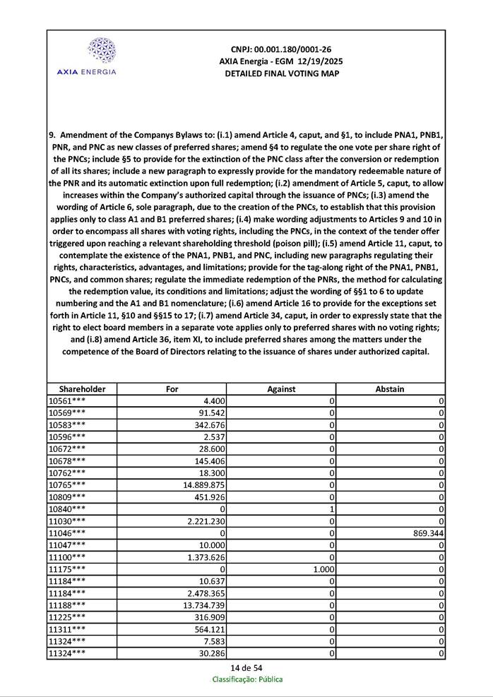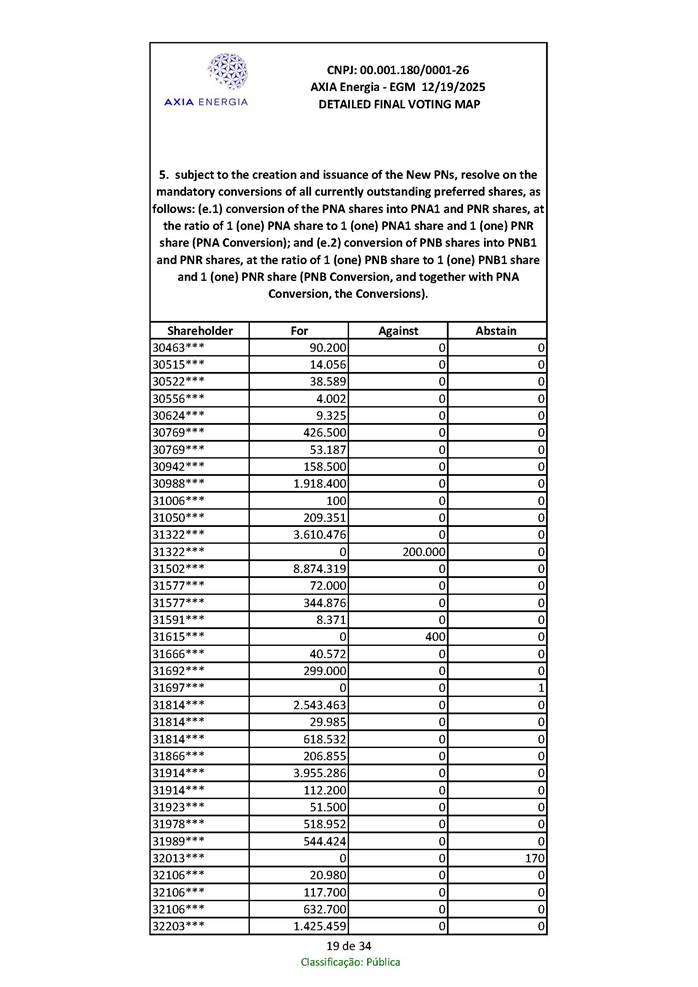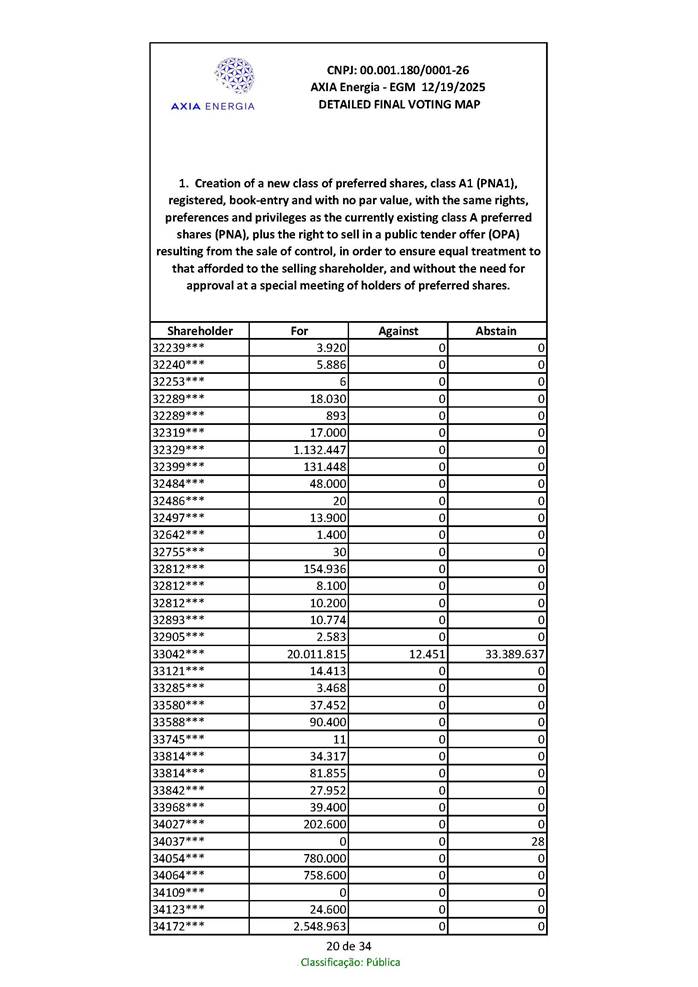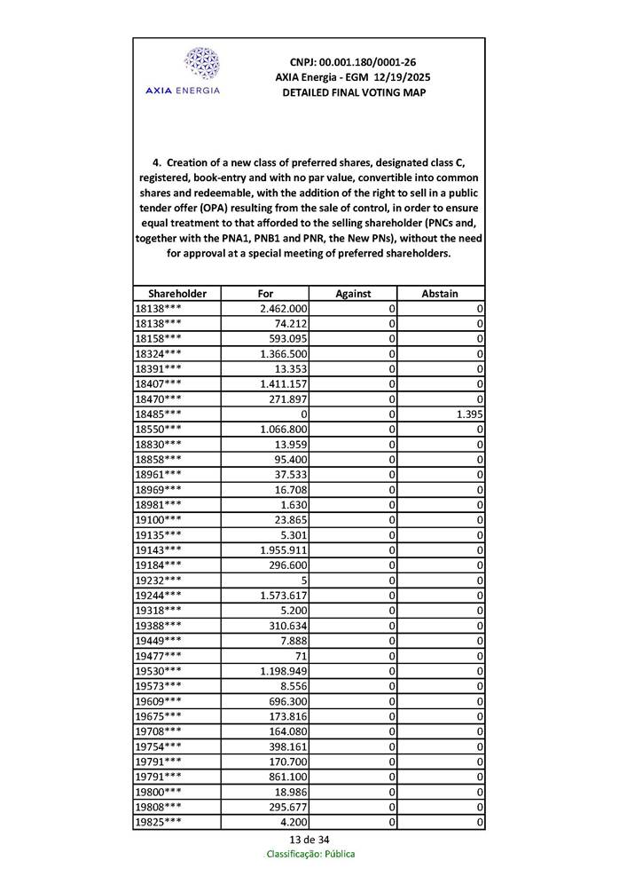 Shareholder For Against Abstain Total 818.181.617 198.176.986 34.862.286 00125*** 1.178.056 0 0 00394*** 0 190.732.084 0 00455*** 6 0 0 00560*** 4.984 0 0 00586*** 10 0 0 00601*** 31 0 0 00739*** 1.428 0 0 00805*** 20 0 0 00914*** 3 0 0 01017*** 1 0 0 01171*** 1.610 0 0 01203*** 1 0 0 01456*** 4 0 0 01496*** 161.306 0 0 01586*** 16 0 0 01643*** 66.985 0 0 01699*** 96.416 0 0 01886*** 12.945 0 0 02020*** 53.603 0 0 02097*** 5.700 0 0 02231*** 611 0 0 02231*** 8.536 0 0 02285*** 102 0 0 02524*** 250 0 0 02745*** 0 5 0 02863*** 1.125.500 0 0 02887*** 26.056 0 0 02895*** 64.700 0 0 02903*** 100 0 0 03027*** 51.786 0 0 03369*** 0 0 136 03370*** 392.332 0 0 03394*** 87.480 0 0 03394*** 7 0 0 1. Creation of a new class of preferred shares, class A1 (PNA1), registered, book-entry and with no par value, with the same rights, preferences and privileges as the currently existing class A preferred shares (PNA), plus the right to sell in a public tender offer (OPA) resulting from the sale of control, in order to ensure equal treatment to that afforded to the selling shareholder, and without the need for approval at a special meeting of holders of preferred shares. CNPJ: 00.001.180/0001-26AXIA Energia - EGM 12/19/2025 DETAILED FINAL VOTING MAP 1 de 34 # Classificação: Pública Shareholder For Against Abstain 1. Creation of a new class of preferred shares, class A1 (PNA1), registered, book-entry and with no par value, with the same rights, preferences and privileges as the currently existing class A preferred shares (PNA), plus the right to sell in a public tender offer (OPA) resulting from the sale of control, in order to ensure equal treatment to that afforded to the selling shareholder, and without the need for approval at a special meeting of holders of preferred shares. CNPJ: 00.001.180/0001-26AXIA Energia - EGM 12/19/2025 DETAILED FINAL VOTING MAP 03473*** 569 0 0 03833*** 28.394 0 0 03902*** 1 0 0 03960*** 24.957 0 0 04005*** 0 50 0 04073*** 292.991 0 0 04297*** 3 0 0 04555*** 0 0 55 04605*** 0 0 200 04609*** 602 0 0 04609*** 1.300 0 0 04616*** 11.687 0 0 04672*** 5 0 0 04709*** 0 1 0 04736*** 28.890 0 0 04751*** 111.059 0 0 04847*** 4 0 0 05075*** 5 0 0 05100*** 43.978 0 0 05147*** 14.000 0 0 05303*** 0 0 1 05316*** 1.030 0 0 05435*** 3 0 0 05448*** 9.727 0 0 05479*** 1.513.900 0 0 05479*** 2.843.378 0 0 05522*** 44 0 0 05589*** 233.315 0 0 05589*** 279.983 0 0 05589*** 28.815 0 0 05719*** 27 0 0 05734*** 415 0 0 05775*** 1.759 0 0 05838*** 15.219 0 0 05839*** 96.081 0 0 2 de 34 # Classificação: Pública Shareholder For Against Abstain 1. Creation of a new class of preferred shares, class A1 (PNA1), registered, book-entry and with no par value, with the same rights, preferences and privileges as the currently existing class A preferred shares (PNA), plus the right to sell in a public tender offer (OPA) resulting from the sale of control, in order to ensure equal treatment to that afforded to the selling shareholder, and without the need for approval at a special meeting of holders of preferred shares. CNPJ: 00.001.180/0001-26AXIA Energia - EGM 12/19/2025 DETAILED FINAL VOTING MAP 05839*** 189.258 0 0 05839*** 718.804 0 0 05839*** 724 0 0 05839*** 775.653 0 0 05839*** 15.200 0 0 05839*** 9.200 0 0 05839*** 803.800 0 0 05839*** 158.291 0 0 05839*** 15.718 0 0 05839*** 0 1.111.508 0 05839*** 4.619.084 0 0 05839*** 226.872 0 0 05839*** 51.889 0 0 05840*** 188.253 0 0 05840*** 10.000 0 0 05840*** 32.547 0 0 05840*** 804.990 0 0 05840*** 4.858.301 0 0 05840*** 477.000 0 0 05840*** 2.199.143 0 0 05872*** 79.961 0 0 05901*** 1 0 0 05986*** 1.881.495 0 0 05986*** 2.673.143 0 0 05986*** 24.100 0 0 05986*** 2.155 0 0 05987*** 147.900 0 0 05987*** 129.553 0 0 05987*** 11.827 0 0 05987*** 2.020.100 0 0 05987*** 1.602.500 0 0 05987*** 5 0 0 05987*** 199.465 0 0 05987*** 13.400 0 0 05987*** 0 428.300 0 3 de 34 # Classificação: Pública Shareholder For Against Abstain 1. Creation of a new class of preferred shares, class A1 (PNA1), registered, book-entry and with no par value, with the same rights, preferences and privileges as the currently existing class A preferred shares (PNA), plus the right to sell in a public tender offer (OPA) resulting from the sale of control, in order to ensure equal treatment to that afforded to the selling shareholder, and without the need for approval at a special meeting of holders of preferred shares. CNPJ: 00.001.180/0001-26AXIA Energia - EGM 12/19/2025 DETAILED FINAL VOTING MAP 05987*** 24.749 0 0 05987*** 188.737 0 0 05987*** 2.862.252 0 0 05987*** 481.572 0 0 05987*** 1.758.400 0 0 06046*** 1.594.573 0 0 06069*** 5.615 0 0 06105*** 10.100 0 0 06134*** 0 108.329 0 06148*** 76.771 0 0 06224*** 6.811 0 0 06239*** 174.268 0 0 06239*** 455.200 0 0 06251*** 9.995 0 0 06318*** 0 0 1 06323*** 530.363 0 0 06370*** 3 0 0 06406*** 0 0 100.000 06491*** 35 0 0 06541*** 284.989 0 0 06571*** 130 0 0 06613*** 77.676 0 0 06832*** 0 23 0 06916*** 622.500 0 0 06943*** 137.641 0 0 06943*** 589.073 0 0 06943*** 922.665 0 0 06949*** 0 0 10 06964*** 298.476 0 0 07023*** 0 0 100 07060*** 239.200 0 0 07086*** 1.000 0 0 07096*** 51.672 0 0 07140*** 0 859.100 0 07140*** 19.426 0 0 4 de 34 # Classificação: Pública Shareholder For Against Abstain 1. Creation of a new class of preferred shares, class A1 (PNA1), registered, book-entry and with no par value, with the same rights, preferences and privileges as the currently existing class A preferred shares (PNA), plus the right to sell in a public tender offer (OPA) resulting from the sale of control, in order to ensure equal treatment to that afforded to the selling shareholder, and without the need for approval at a special meeting of holders of preferred shares. CNPJ: 00.001.180/0001-26AXIA Energia - EGM 12/19/2025 DETAILED FINAL VOTING MAP 07140*** 1.219 0 0 07140*** 26.098 0 0 07187*** 16.269 0 0 07187*** 713 0 0 07191*** 0 857.000 0 07191*** 85.700 0 0 07191*** 105.335 0 0 07226*** 0 0 4 07237*** 589.417 0 0 07237*** 33.388 0 0 07247*** 296