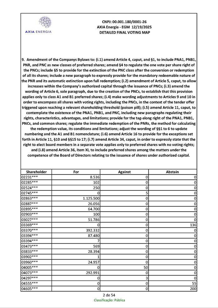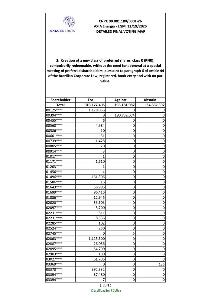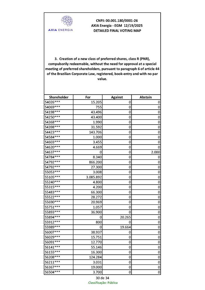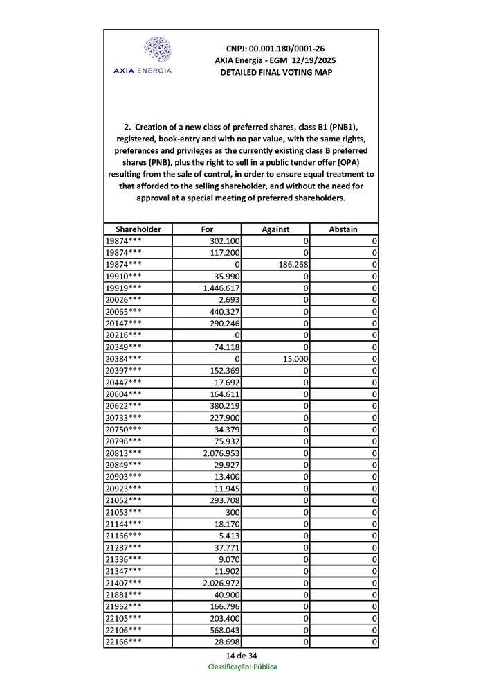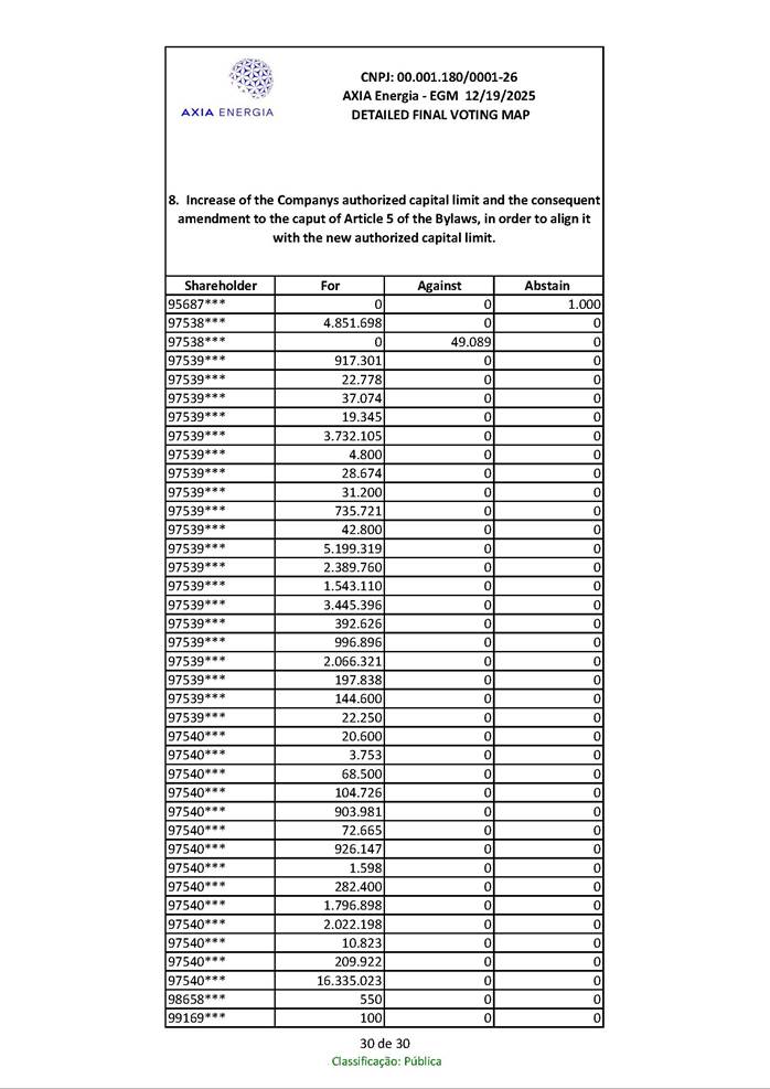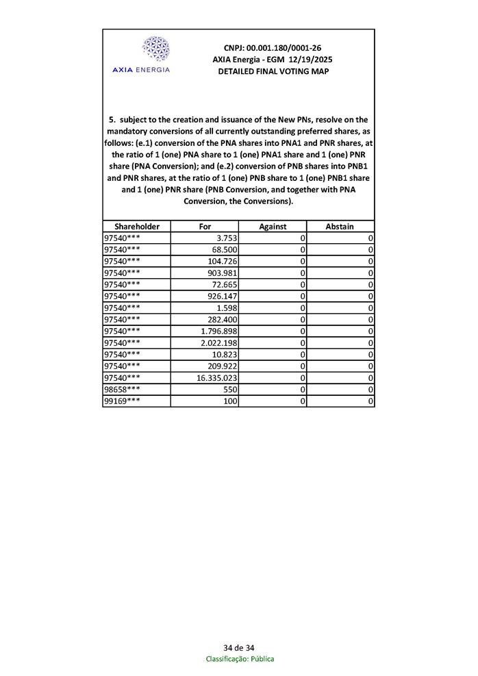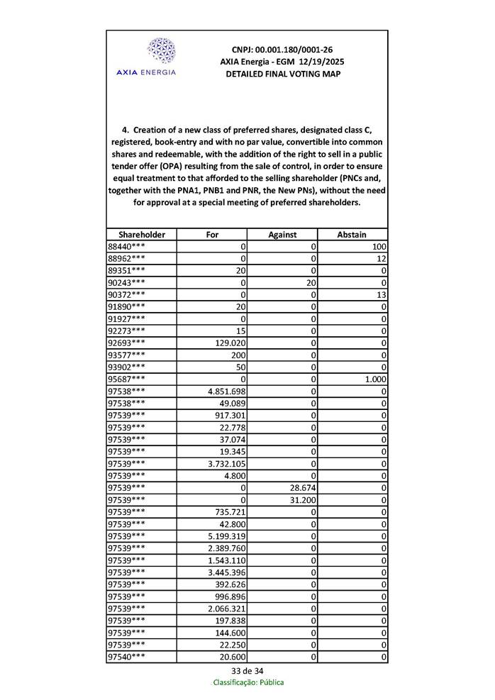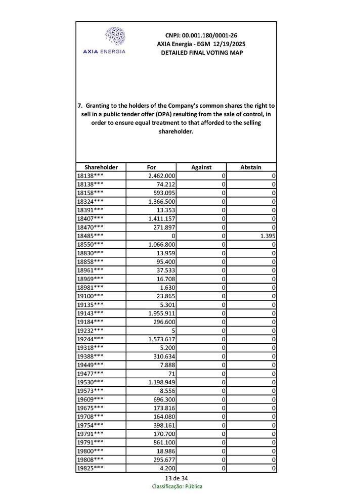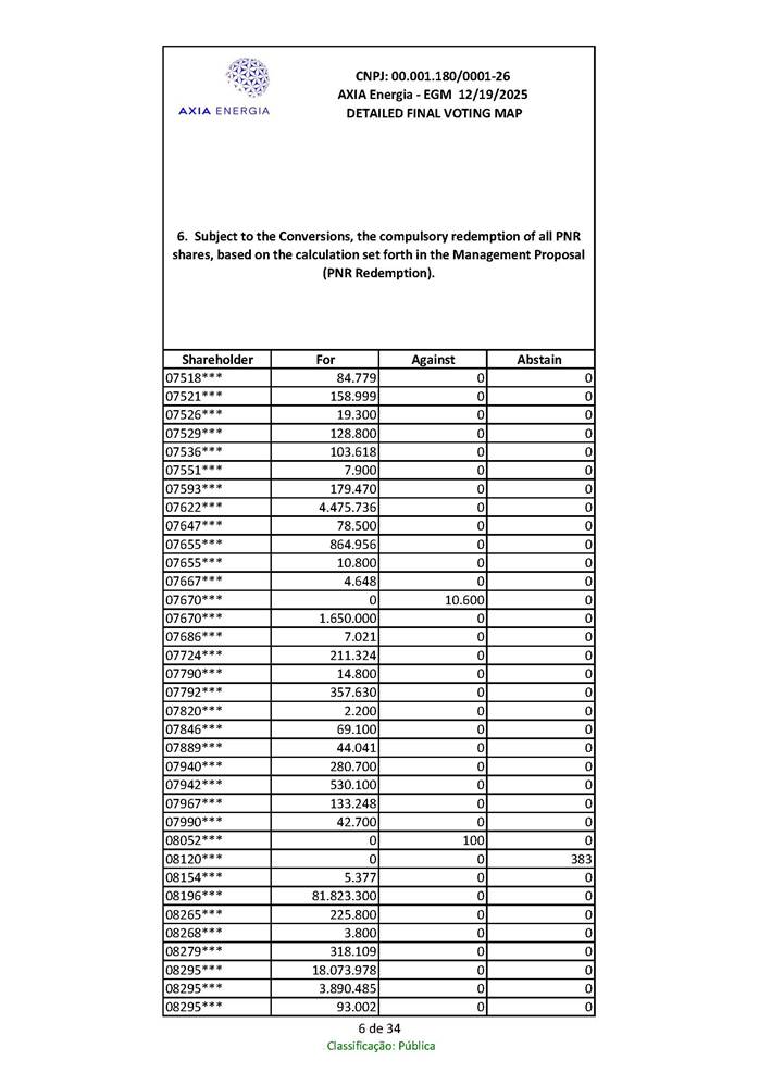 Shareholder For Against Abstain Total 818.181.617 198.176.986 34.862.286 00125*** 1.178.056 0 0 00394*** 0 190.732.084 0 00455*** 6 0 0 00560*** 4.984 0 0 00586*** 10 0 0 00601*** 31 0 0 00739*** 1.428 0 0 00805*** 20 0 0 00914*** 3 0 0 01017*** 1 0 0 01171*** 1.610 0 0 01203*** 1 0 0 01456*** 4 0 0 01496*** 161.306 0 0 01586*** 16 0 0 01643*** 66.985 0 0 01699*** 96.416 0 0 01886*** 12.945 0 0 02020*** 53.603 0 0 02097*** 5.700 0 0 02231*** 611 0 0 02231*** 8.536 0 0 02285*** 102 0 0 02524*** 250 0 0 02745*** 0 5 0 02863*** 1.125.500 0 0 02887*** 26.056 0 0 02895*** 64.700 0 0 02903*** 100 0 0 03027*** 51.786 0 0 03369*** 0 0 136 03370*** 392.332 0 0 03394*** 87.480 0 0 03394*** 7 0 0 1. Creation of a new class of preferred shares, class A1 (PNA1), registered, book-entry and with no par value, with the same rights, preferences and privileges as the currently existing class A preferred shares (PNA), plus the right to sell in a public tender offer (OPA) resulting from the sale of control, in order to ensure equal treatment to that afforded to the selling shareholder, and without the need for approval at a special meeting of holders of preferred shares. CNPJ: 00.001.180/0001-26AXIA Energia - EGM 12/19/2025 DETAILED FINAL VOTING MAP 1 de 34 # Classificação: Pública Shareholder For Against Abstain 1. Creation of a new class of preferred shares, class A1 (PNA1), registered, book-entry and with no par value, with the same rights, preferences and privileges as the currently existing class A preferred shares (PNA), plus the right to sell in a public tender offer (OPA) resulting from the sale of control, in order to ensure equal treatment to that afforded to the selling shareholder, and without the need for approval at a special meeting of holders of preferred shares. CNPJ: 00.001.180/0001-26AXIA Energia - EGM 12/19/2025 DETAILED FINAL VOTING MAP 03473*** 569 0 0 03833*** 28.394 0 0 03902*** 1 0 0 03960*** 24.957 0 0 04005*** 0 50 0 04073*** 292.991 0 0 04297*** 3 0 0 04555*** 0 0 55 04605*** 0 0 200 04609*** 602 0 0 04609*** 1.300 0 0 04616*** 11.687 0 0 04672*** 5 0 0 04709*** 0 1 0 04736*** 28.890 0 0 04751*** 111.059 0 0 04847*** 4 0 0 05075*** 5 0 0 05100*** 43.978 0 0 05147*** 14.000 0 0 05303*** 0 0 1 05316*** 1.030 0 0 05435*** 3 0 0 05448*** 9.727 0 0 05479*** 1.513.900 0 0 05479*** 2.843.378 0 0 05522*** 44 0 0 05589*** 233.315 0 0 05589*** 279.983 0 0 05589*** 28.815 0 0 05719*** 27 0 0 05734*** 415 0 0 05775*** 1.759 0 0 05838*** 15.219 0 0 05839*** 96.081 0 0 2 de 34 # Classificação: Pública Shareholder For Against Abstain 1. Creation of a new class of preferred shares, class A1 (PNA1), registered, book-entry and with no par value, with the same rights, preferences and privileges as the currently existing class A preferred shares (PNA), plus the right to sell in a public tender offer (OPA) resulting from the sale of control, in order to ensure equal treatment to that afforded to the selling shareholder, and without the need for approval at a special meeting of holders of preferred shares. CNPJ: 00.001.180/0001-26AXIA Energia - EGM 12/19/2025 DETAILED FINAL VOTING MAP 05839*** 189.258 0 0 05839*** 718.804 0 0 05839*** 724 0 0 05839*** 775.653 0 0 05839*** 15.200 0 0 05839*** 9.200 0 0 05839*** 803.800 0 0 05839*** 158.291 0 0 05839*** 15.718 0 0 05839*** 0 1.111.508 0 05839*** 4.619.084 0 0 05839*** 226.872 0 0 05839*** 51.889 0 0 05840*** 188.253 0 0 05840*** 10.000 0 0 05840*** 32.547 0 0 05840*** 804.990 0 0 05840*** 4.858.301 0 0 05840*** 477.000 0 0 05840*** 2.199.143 0 0 05872*** 79.961 0 0 05901*** 1 0 0 05986*** 1.881.495 0 0 05986*** 2.673.143 0 0 05986*** 24.100 0 0 05986*** 2.155 0 0 05987*** 147.900 0 0 05987*** 129.553 0 0 05987*** 11.827 0 0 05987*** 2.020.100 0 0 05987*** 1.602.500 0 0 05987*** 5 0 0 05987*** 199.465 0 0 05987*** 13.400 0 0 05987*** 0 428.300 0 3 de 34 # Classificação: Pública Shareholder For Against Abstain 1. Creation of a new class of preferred shares, class A1 (PNA1), registered, book-entry and with no par value, with the same rights, preferences and privileges as the currently existing class A preferred shares (PNA), plus the right to sell in a public tender offer (OPA) resulting from the sale of control, in order to ensure equal treatment to that afforded to the selling shareholder, and without the need for approval at a special meeting of holders of preferred shares. CNPJ: 00.001.180/0001-26AXIA Energia - EGM 12/19/2025 DETAILED FINAL VOTING MAP 05987*** 24.749 0 0 05987*** 188.737 0 0 05987*** 2.862.252 0 0 05987*** 481.572 0 0 05987*** 1.758.400 0 0 06046*** 1.594.573 0 0 06069*** 5.615 0 0 06105*** 10.100 0 0 06134*** 0 108.329 0 06148*** 76.771 0 0 06224*** 6.811 0 0 06239*** 174.268 0 0 06239*** 455.200 0 0 06251*** 9.995 0 0 06318*** 0 0 1 06323*** 530.363 0 0 06370*** 3 0 0 06406*** 0 0 100.000 06491*** 35 0 0 06541*** 284.989 0 0 06571*** 130 0 0 06613*** 77.676 0 0 06832*** 0 23 0 06916*** 622.500 0 0 06943*** 137.641 0 0 06943*** 589.073 0 0 06943*** 922.665 0 0 06949*** 0 0 10 06964*** 298.476 0 0 07023*** 0 0 100 07060*** 239.200 0 0 07086*** 1.000 0 0 07096*** 51.672 0 0 07140*** 0 859.100 0 07140*** 19.426 0 0 4 de 34 # Classificação: Pública Shareholder For Against Abstain 1. Creation of a new class of preferred shares, class A1 (PNA1), registered, book-entry and with no par value, with the same rights, preferences and privileges as the currently existing class A preferred shares (PNA), plus the right to sell in a public tender offer (OPA) resulting from the sale of control, in order to ensure equal treatment to that afforded to the selling shareholder, and without the need for approval at a special meeting of holders of preferred shares. CNPJ: 00.001.180/0001-26AXIA Energia - EGM 12/19/2025 DETAILED FINAL VOTING MAP 07140*** 1.219 0 0 07140*** 26.098 0 0 07187*** 16.269 0 0 07187*** 713 0 0 07191*** 0 857.000 0 07191*** 85.700 0 0 07191*** 105.335 0 0 07226*** 0 0 4 07237*** 589.417 0 0 07237*** 33.388 0 0 07247*** 296