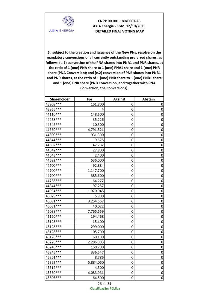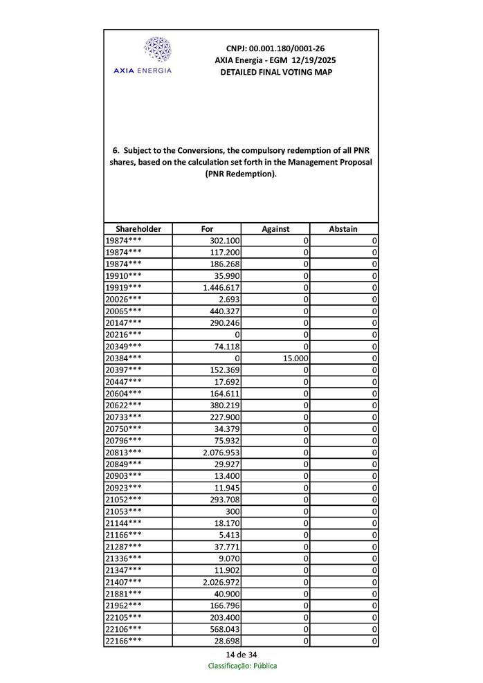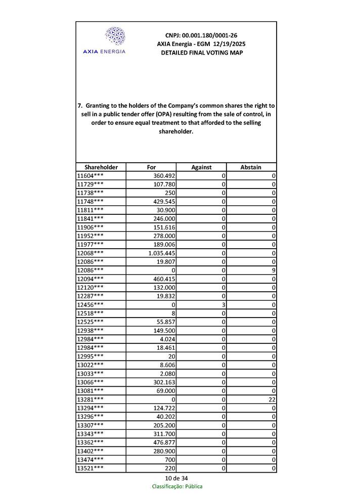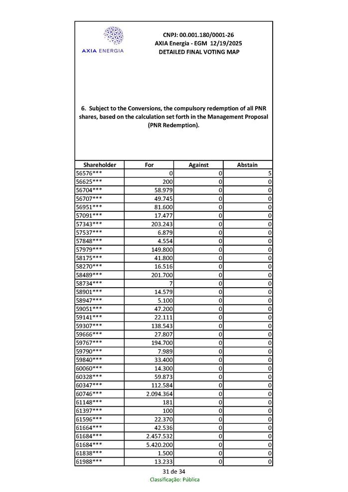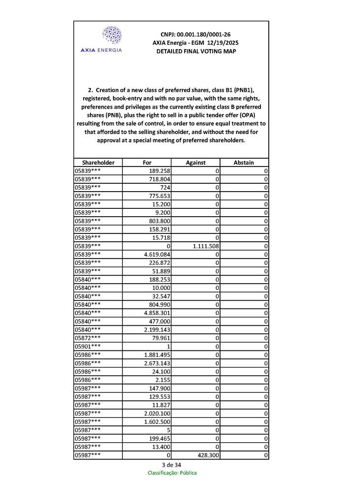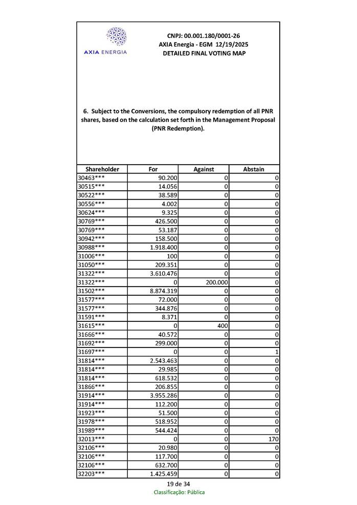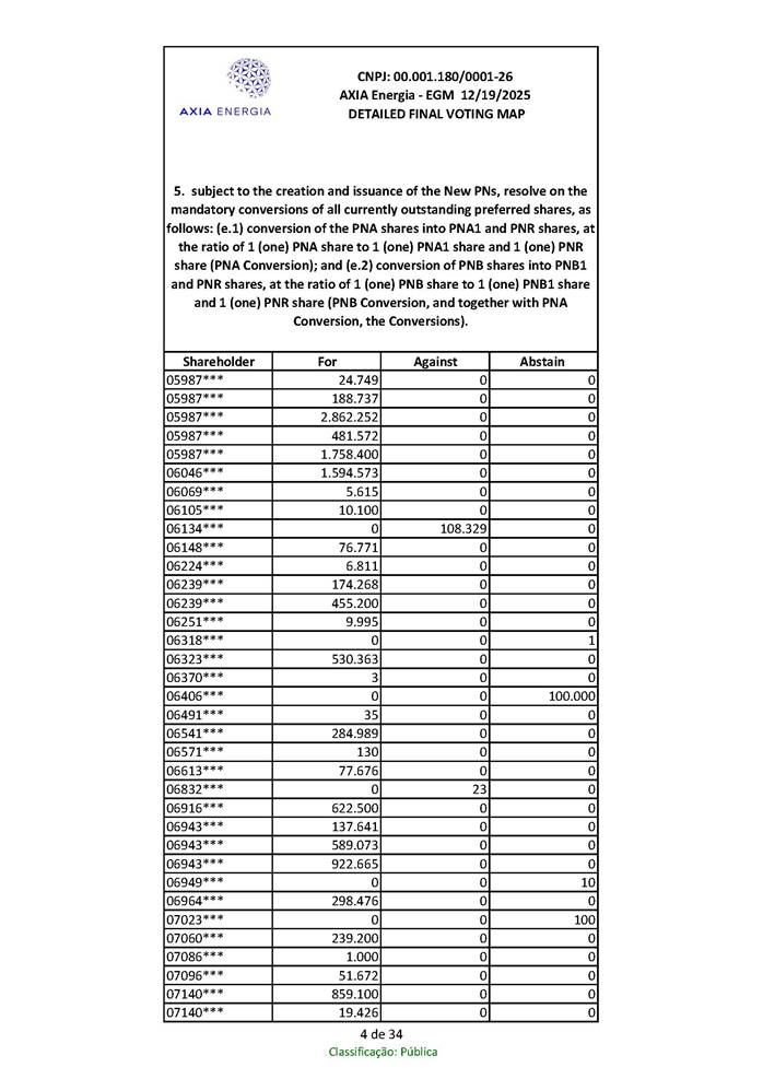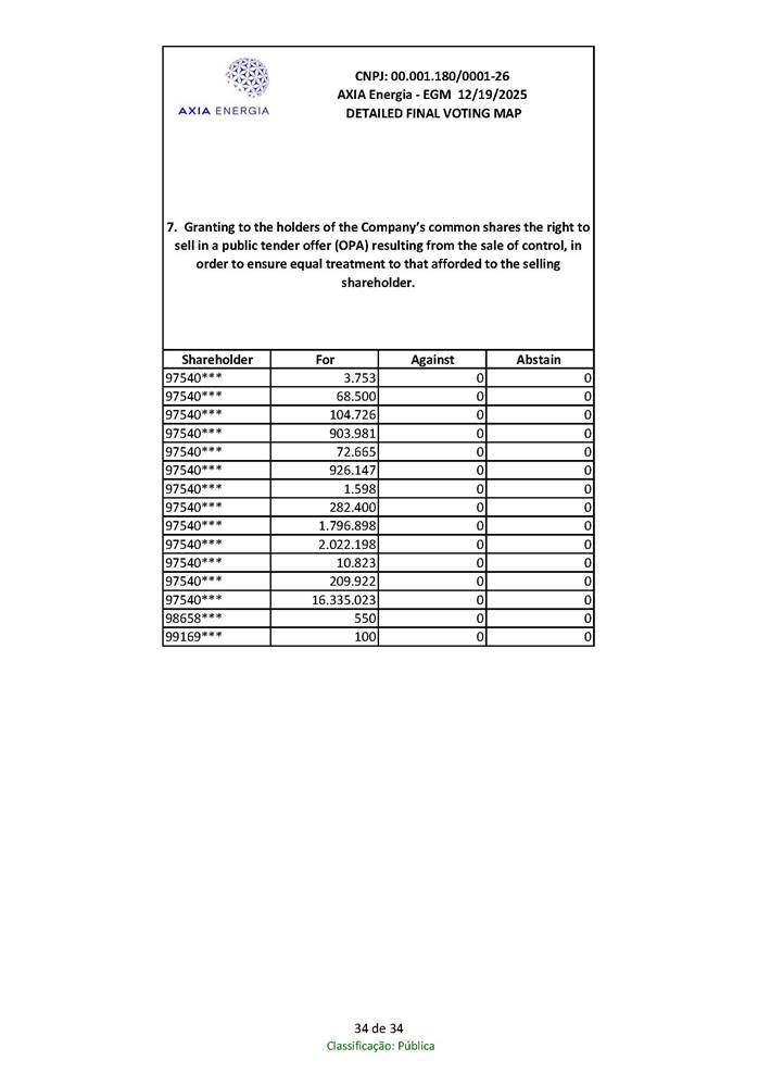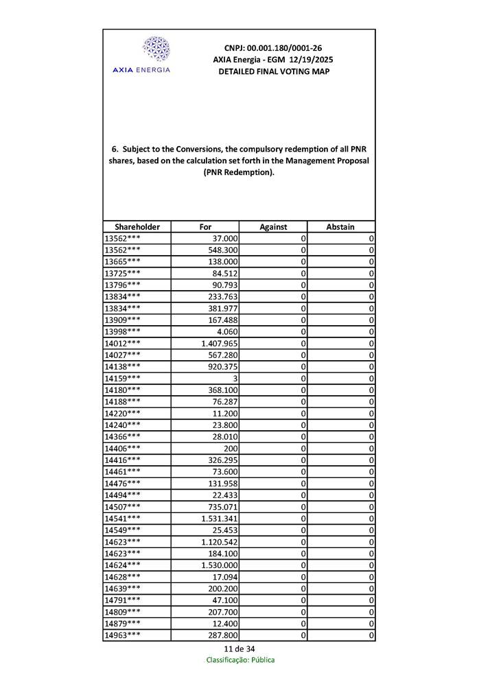 Shareholder For Against Abstain Total 818.181.617 198.176.986 34.862.286 00125*** 1.178.056 0 0 00394*** 0 190.732.084 0 00455*** 6 0 0 00560*** 4.984 0 0 00586*** 10 0 0 00601*** 31 0 0 00739*** 1.428 0 0 00805*** 20 0 0 00914*** 3 0 0 01017*** 1 0 0 01171*** 1.610 0 0 01203*** 1 0 0 01456*** 4 0 0 01496*** 161.306 0 0 01586*** 16 0 0 01643*** 66.985 0 0 01699*** 96.416 0 0 01886*** 12.945 0 0 02020*** 53.603 0 0 02097*** 5.700 0 0 02231*** 611 0 0 02231*** 8.536 0 0 02285*** 102 0 0 02524*** 250 0 0 02745*** 0 5 0 02863*** 1.125.500 0 0 02887*** 26.056 0 0 02895*** 64.700 0 0 02903*** 100 0 0 03027*** 51.786 0 0 03369*** 0 0 136 03370*** 392.332 0 0 03394*** 87.480 0 0 03394*** 7 0 0 1. Creation of a new class of preferred shares, class A1 (PNA1), registered, book-entry and with no par value, with the same rights, preferences and privileges as the currently existing class A preferred shares (PNA), plus the right to sell in a public tender offer (OPA) resulting from the sale of control, in order to ensure equal treatment to that afforded to the selling shareholder, and without the need for approval at a special meeting of holders of preferred shares. CNPJ: 00.001.180/0001-26AXIA Energia - EGM 12/19/2025 DETAILED FINAL VOTING MAP 1 de 34 # Classificação: Pública Shareholder For Against Abstain 1. Creation of a new class of preferred shares, class A1 (PNA1), registered, book-entry and with no par value, with the same rights, preferences and privileges as the currently existing class A preferred shares (PNA), plus the right to sell in a public tender offer (OPA) resulting from the sale of control, in order to ensure equal treatment to that afforded to the selling shareholder, and without the need for approval at a special meeting of holders of preferred shares. CNPJ: 00.001.180/0001-26AXIA Energia - EGM 12/19/2025 DETAILED FINAL VOTING MAP 03473*** 569 0 0 03833*** 28.394 0 0 03902*** 1 0 0 03960*** 24.957 0 0 04005*** 0 50 0 04073*** 292.991 0 0 04297*** 3 0 0 04555*** 0 0 55 04605*** 0 0 200 04609*** 602 0 0 04609*** 1.300 0 0 04616*** 11.687 0 0 04672*** 5 0 0 04709*** 0 1 0 04736*** 28.890 0 0 04751*** 111.059 0 0 04847*** 4 0 0 05075*** 5 0 0 05100*** 43.978 0 0 05147*** 14.000 0 0 05303*** 0 0 1 05316*** 1.030 0 0 05435*** 3 0 0 05448*** 9.727 0 0 05479*** 1.513.900 0 0 05479*** 2.843.378 0 0 05522*** 44 0 0 05589*** 233.315 0 0 05589*** 279.983 0 0 05589*** 28.815 0 0 05719*** 27 0 0 05734*** 415 0 0 05775*** 1.759 0 0 05838*** 15.219 0 0 05839*** 96.081 0 0 2 de 34 # Classificação: Pública Shareholder For Against Abstain 1. Creation of a new class of preferred shares, class A1 (PNA1), registered, book-entry and with no par value, with the same rights, preferences and privileges as the currently existing class A preferred shares (PNA), plus the right to sell in a public tender offer (OPA) resulting from the sale of control, in order to ensure equal treatment to that afforded to the selling shareholder, and without the need for approval at a special meeting of holders of preferred shares. CNPJ: 00.001.180/0001-26AXIA Energia - EGM 12/19/2025 DETAILED FINAL VOTING MAP 05839*** 189.258 0 0 05839*** 718.804 0 0 05839*** 724 0 0 05839*** 775.653 0 0 05839*** 15.200 0 0 05839*** 9.200 0 0 05839*** 803.800 0 0 05839*** 158.291 0 0 05839*** 15.718 0 0 05839*** 0 1.111.508 0 05839*** 4.619.084 0 0 05839*** 226.872 0 0 05839*** 51.889 0 0 05840*** 188.253 0 0 05840*** 10.000 0 0 05840*** 32.547 0 0 05840*** 804.990 0 0 05840*** 4.858.301 0 0 05840*** 477.000 0 0 05840*** 2.199.143 0 0 05872*** 79.961 0 0 05901*** 1 0 0 05986*** 1.881.495 0 0 05986*** 2.673.143 0 0 05986*** 24.100 0 0 05986*** 2.155 0 0 05987*** 147.900 0 0 05987*** 129.553 0 0 05987*** 11.827 0 0 05987*** 2.020.100 0 0 05987*** 1.602.500 0 0 05987*** 5 0 0 05987*** 199.465 0 0 05987*** 13.400 0 0 05987*** 0 428.300 0 3 de 34 # Classificação: Pública Shareholder For Against Abstain 1. Creation of a new class of preferred shares, class A1 (PNA1), registered, book-entry and with no par value, with the same rights, preferences and privileges as the currently existing class A preferred shares (PNA), plus the right to sell in a public tender offer (OPA) resulting from the sale of control, in order to ensure equal treatment to that afforded to the selling shareholder, and without the need for approval at a special meeting of holders of preferred shares. CNPJ: 00.001.180/0001-26AXIA Energia - EGM 12/19/2025 DETAILED FINAL VOTING MAP 05987*** 24.749 0 0 05987*** 188.737 0 0 05987*** 2.862.252 0 0 05987*** 481.572 0 0 05987*** 1.758.400 0 0 06046*** 1.594.573 0 0 06069*** 5.615 0 0 06105*** 10.100 0 0 06134*** 0 108.329 0 06148*** 76.771 0 0 06224*** 6.811 0 0 06239*** 174.268 0 0 06239*** 455.200 0 0 06251*** 9.995 0 0 06318*** 0 0 1 06323*** 530.363 0 0 06370*** 3 0 0 06406*** 0 0 100.000 06491*** 35 0 0 06541*** 284.989 0 0 06571*** 130 0 0 06613*** 77.676 0 0 06832*** 0 23 0 06916*** 622.500 0 0 06943*** 137.641 0 0 06943*** 589.073 0 0 06943*** 922.665 0 0 06949*** 0 0 10 06964*** 298.476 0 0 07023*** 0 0 100 07060*** 239.200 0 0 07086*** 1.000 0 0 07096*** 51.672 0 0 07140*** 0 859.100 0 07140*** 19.426 0 0 4 de 34 # Classificação: Pública Shareholder For Against Abstain 1. Creation of a new class of preferred shares, class A1 (PNA1), registered, book-entry and with no par value, with the same rights, preferences and privileges as the currently existing class A preferred shares (PNA), plus the right to sell in a public tender offer (OPA) resulting from the sale of control, in order to ensure equal treatment to that afforded to the selling shareholder, and without the need for approval at a special meeting of holders of preferred shares. CNPJ: 00.001.180/0001-26AXIA Energia - EGM 12/19/2025 DETAILED FINAL VOTING MAP 07140*** 1.219 0 0 07140*** 26.098 0 0 07187*** 16.269 0 0 07187*** 713 0 0 07191*** 0 857.000 0 07191*** 85.700 0 0 07191*** 105.335 0 0 07226*** 0 0 4 07237*** 589.417 0 0 07237*** 33.388 0 0 07247*** 296