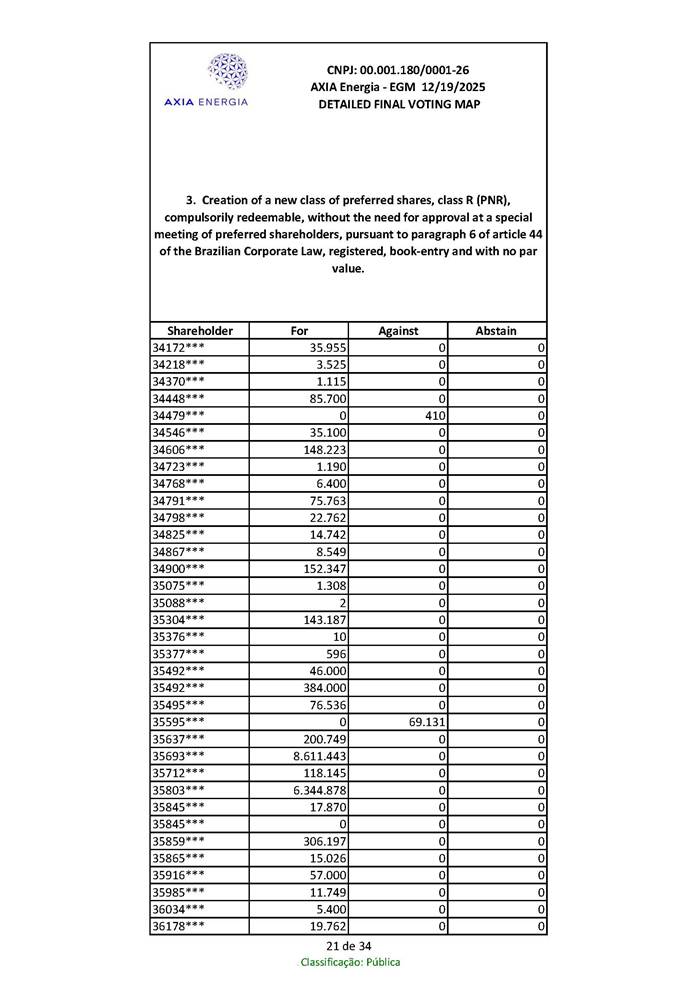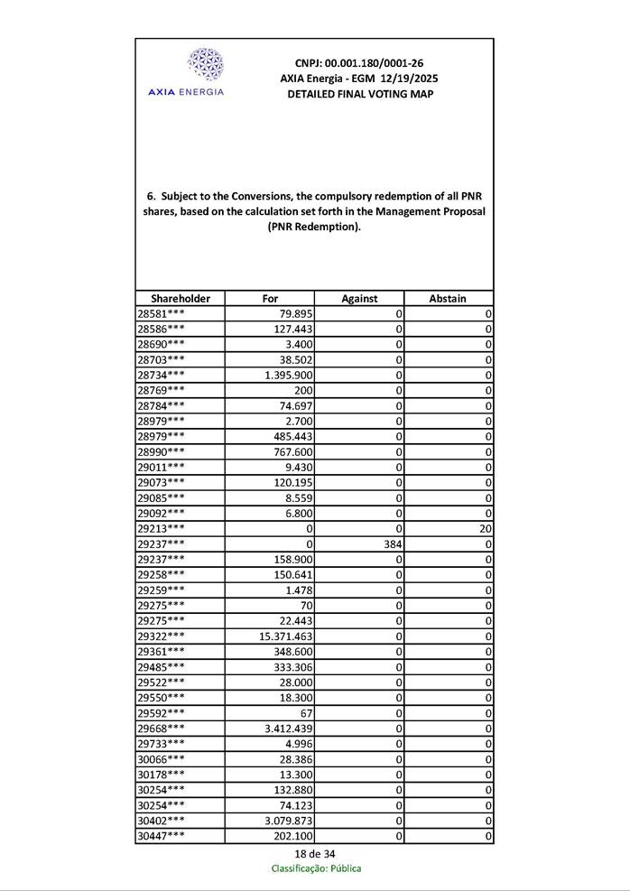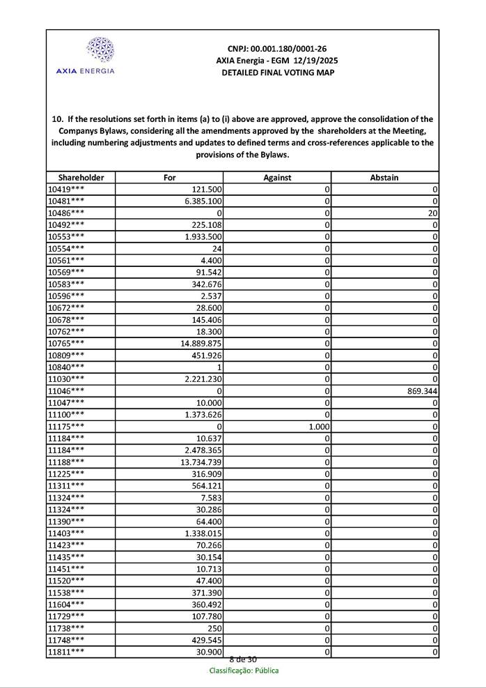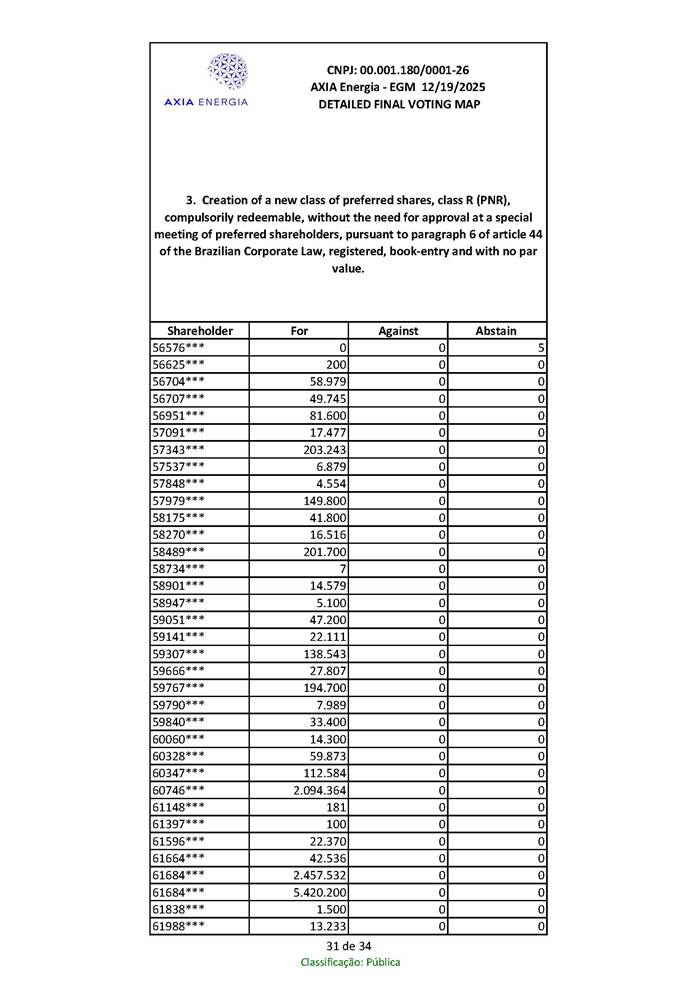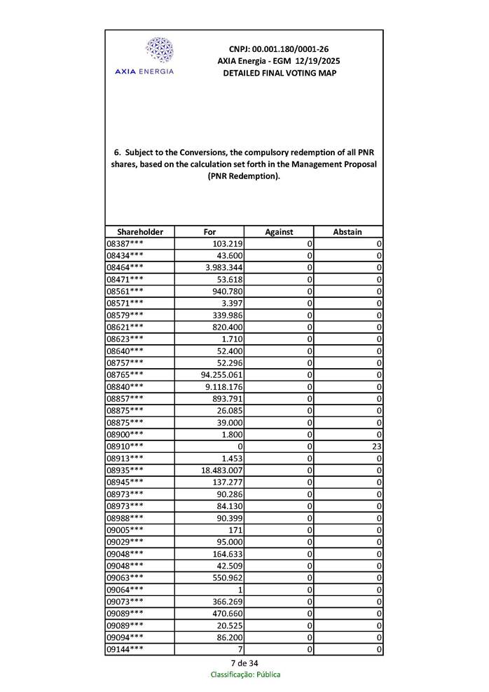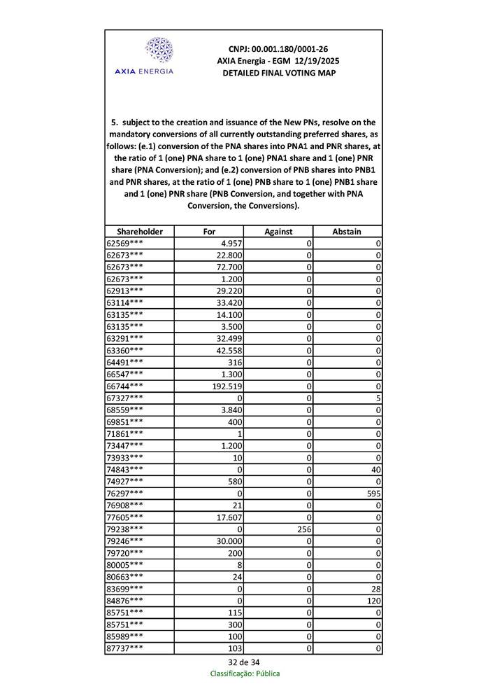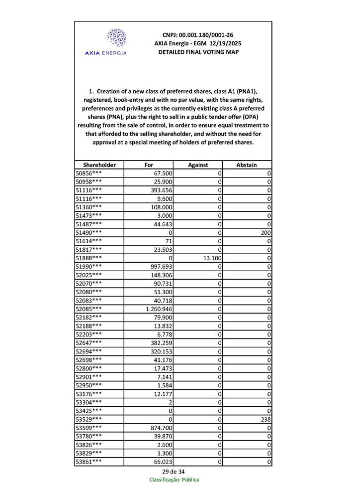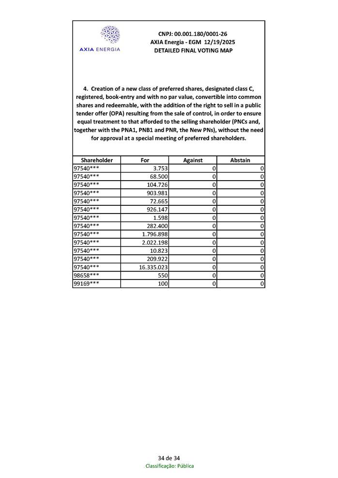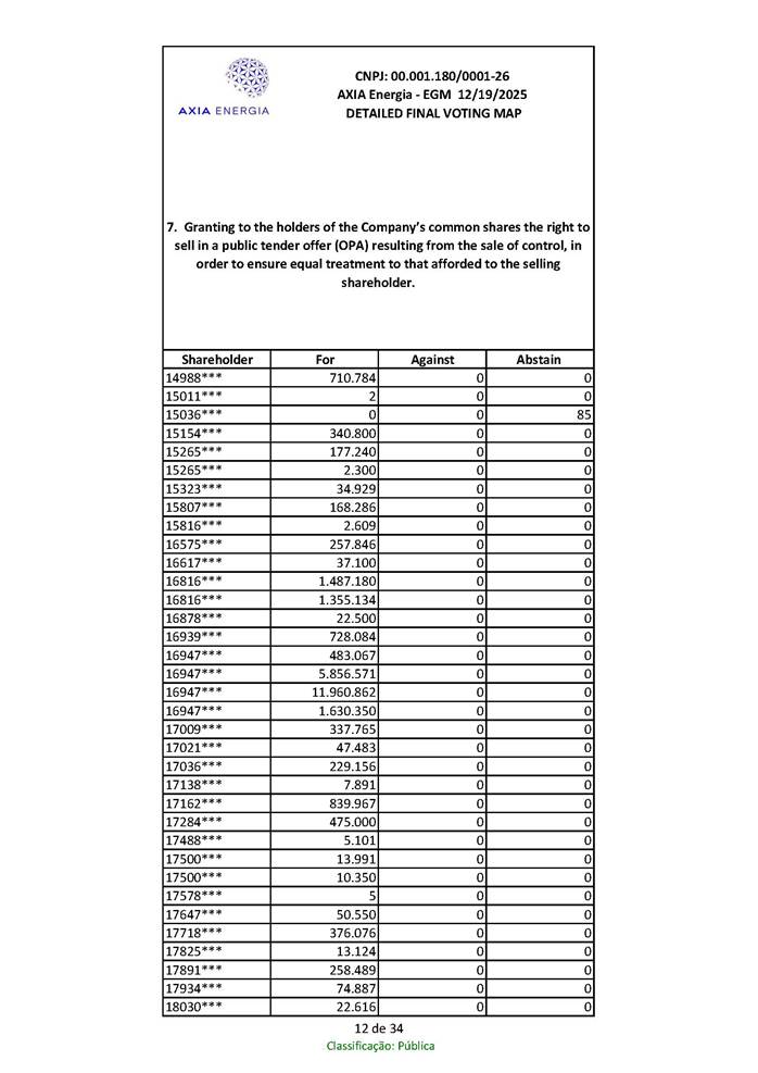 Shareholder For Against Abstain Total 818.181.617 198.176.986 34.862.286 00125*** 1.178.056 0 0 00394*** 0 190.732.084 0 00455*** 6 0 0 00560*** 4.984 0 0 00586*** 10 0 0 00601*** 31 0 0 00739*** 1.428 0 0 00805*** 20 0 0 00914*** 3 0 0 01017*** 1 0 0 01171*** 1.610 0 0 01203*** 1 0 0 01456*** 4 0 0 01496*** 161.306 0 0 01586*** 16 0 0 01643*** 66.985 0 0 01699*** 96.416 0 0 01886*** 12.945 0 0 02020*** 53.603 0 0 02097*** 5.700 0 0 02231*** 611 0 0 02231*** 8.536 0 0 02285*** 102 0 0 02524*** 250 0 0 02745*** 0 5 0 02863*** 1.125.500 0 0 02887*** 26.056 0 0 02895*** 64.700 0 0 02903*** 100 0 0 03027*** 51.786 0 0 03369*** 0 0 136 03370*** 392.332 0 0 03394*** 87.480 0 0 03394*** 7 0 0 1. Creation of a new class of preferred shares, class A1 (PNA1), registered, book-entry and with no par value, with the same rights, preferences and privileges as the currently existing class A preferred shares (PNA), plus the right to sell in a public tender offer (OPA) resulting from the sale of control, in order to ensure equal treatment to that afforded to the selling shareholder, and without the need for approval at a special meeting of holders of preferred shares. CNPJ: 00.001.180/0001-26AXIA Energia - EGM 12/19/2025 DETAILED FINAL VOTING MAP 1 de 34 # Classificação: Pública Shareholder For Against Abstain 1. Creation of a new class of preferred shares, class A1 (PNA1), registered, book-entry and with no par value, with the same rights, preferences and privileges as the currently existing class A preferred shares (PNA), plus the right to sell in a public tender offer (OPA) resulting from the sale of control, in order to ensure equal treatment to that afforded to the selling shareholder, and without the need for approval at a special meeting of holders of preferred shares. CNPJ: 00.001.180/0001-26AXIA Energia - EGM 12/19/2025 DETAILED FINAL VOTING MAP 03473*** 569 0 0 03833*** 28.394 0 0 03902*** 1 0 0 03960*** 24.957 0 0 04005*** 0 50 0 04073*** 292.991 0 0 04297*** 3 0 0 04555*** 0 0 55 04605*** 0 0 200 04609*** 602 0 0 04609*** 1.300 0 0 04616*** 11.687 0 0 04672*** 5 0 0 04709*** 0 1 0 04736*** 28.890 0 0 04751*** 111.059 0 0 04847*** 4 0 0 05075*** 5 0 0 05100*** 43.978 0 0 05147*** 14.000 0 0 05303*** 0 0 1 05316*** 1.030 0 0 05435*** 3 0 0 05448*** 9.727 0 0 05479*** 1.513.900 0 0 05479*** 2.843.378 0 0 05522*** 44 0 0 05589*** 233.315 0 0 05589*** 279.983 0 0 05589*** 28.815 0 0 05719*** 27 0 0 05734*** 415 0 0 05775*** 1.759 0 0 05838*** 15.219 0 0 05839*** 96.081 0 0 2 de 34 # Classificação: Pública Shareholder For Against Abstain 1. Creation of a new class of preferred shares, class A1 (PNA1), registered, book-entry and with no par value, with the same rights, preferences and privileges as the currently existing class A preferred shares (PNA), plus the right to sell in a public tender offer (OPA) resulting from the sale of control, in order to ensure equal treatment to that afforded to the selling shareholder, and without the need for approval at a special meeting of holders of preferred shares. CNPJ: 00.001.180/0001-26AXIA Energia - EGM 12/19/2025 DETAILED FINAL VOTING MAP 05839*** 189.258 0 0 05839*** 718.804 0 0 05839*** 724 0 0 05839*** 775.653 0 0 05839*** 15.200 0 0 05839*** 9.200 0 0 05839*** 803.800 0 0 05839*** 158.291 0 0 05839*** 15.718 0 0 05839*** 0 1.111.508 0 05839*** 4.619.084 0 0 05839*** 226.872 0 0 05839*** 51.889 0 0 05840*** 188.253 0 0 05840*** 10.000 0 0 05840*** 32.547 0 0 05840*** 804.990 0 0 05840*** 4.858.301 0 0 05840*** 477.000 0 0 05840*** 2.199.143 0 0 05872*** 79.961 0 0 05901*** 1 0 0 05986*** 1.881.495 0 0 05986*** 2.673.143 0 0 05986*** 24.100 0 0 05986*** 2.155 0 0 05987*** 147.900 0 0 05987*** 129.553 0 0 05987*** 11.827 0 0 05987*** 2.020.100 0 0 05987*** 1.602.500 0 0 05987*** 5 0 0 05987*** 199.465 0 0 05987*** 13.400 0 0 05987*** 0 428.300 0 3 de 34 # Classificação: Pública Shareholder For Against Abstain 1. Creation of a new class of preferred shares, class A1 (PNA1), registered, book-entry and with no par value, with the same rights, preferences and privileges as the currently existing class A preferred shares (PNA), plus the right to sell in a public tender offer (OPA) resulting from the sale of control, in order to ensure equal treatment to that afforded to the selling shareholder, and without the need for approval at a special meeting of holders of preferred shares. CNPJ: 00.001.180/0001-26AXIA Energia - EGM 12/19/2025 DETAILED FINAL VOTING MAP 05987*** 24.749 0 0 05987*** 188.737 0 0 05987*** 2.862.252 0 0 05987*** 481.572 0 0 05987*** 1.758.400 0 0 06046*** 1.594.573 0 0 06069*** 5.615 0 0 06105*** 10.100 0 0 06134*** 0 108.329 0 06148*** 76.771 0 0 06224*** 6.811 0 0 06239*** 174.268 0 0 06239*** 455.200 0 0 06251*** 9.995 0 0 06318*** 0 0 1 06323*** 530.363 0 0 06370*** 3 0 0 06406*** 0 0 100.000 06491*** 35 0 0 06541*** 284.989 0 0 06571*** 130 0 0 06613*** 77.676 0 0 06832*** 0 23 0 06916*** 622.500 0 0 06943*** 137.641 0 0 06943*** 589.073 0 0 06943*** 922.665 0 0 06949*** 0 0 10 06964*** 298.476 0 0 07023*** 0 0 100 07060*** 239.200 0 0 07086*** 1.000 0 0 07096*** 51.672 0 0 07140*** 0 859.100 0 07140*** 19.426 0 0 4 de 34 # Classificação: Pública Shareholder For Against Abstain 1. Creation of a new class of preferred shares, class A1 (PNA1), registered, book-entry and with no par value, with the same rights, preferences and privileges as the currently existing class A preferred shares (PNA), plus the right to sell in a public tender offer (OPA) resulting from the sale of control, in order to ensure equal treatment to that afforded to the selling shareholder, and without the need for approval at a special meeting of holders of preferred shares. CNPJ: 00.001.180/0001-26AXIA Energia - EGM 12/19/2025 DETAILED FINAL VOTING MAP 07140*** 1.219 0 0 07140*** 26.098 0 0 07187*** 16.269 0 0 07187*** 713 0 0 07191*** 0 857.000 0 07191*** 85.700 0 0 07191*** 105.335 0 0 07226*** 0 0 4 07237*** 589.417 0 0 07237*** 33.388 0 0 07247*** 296