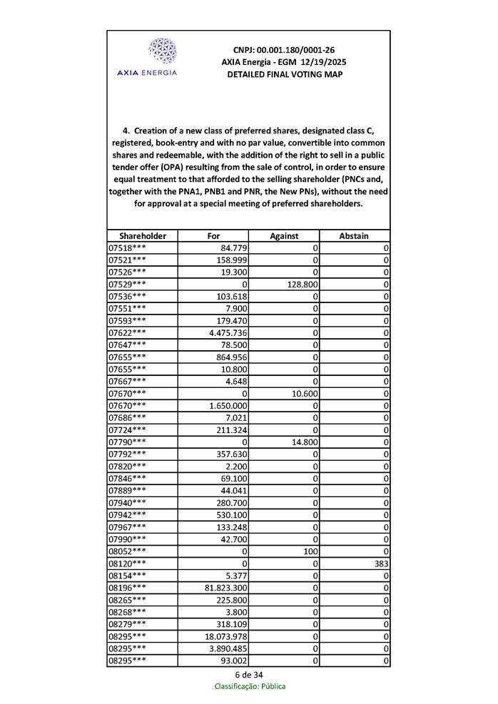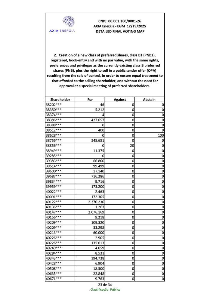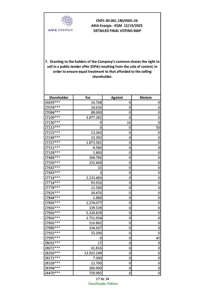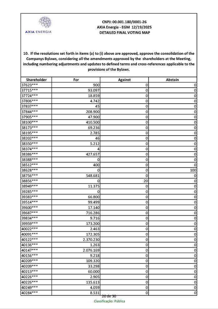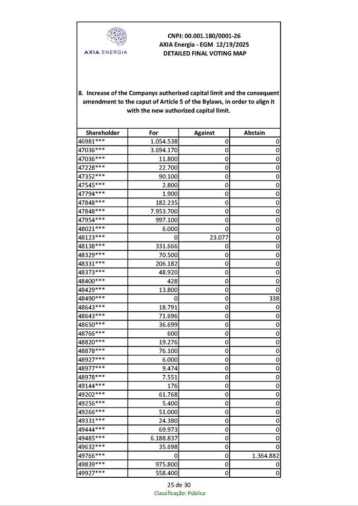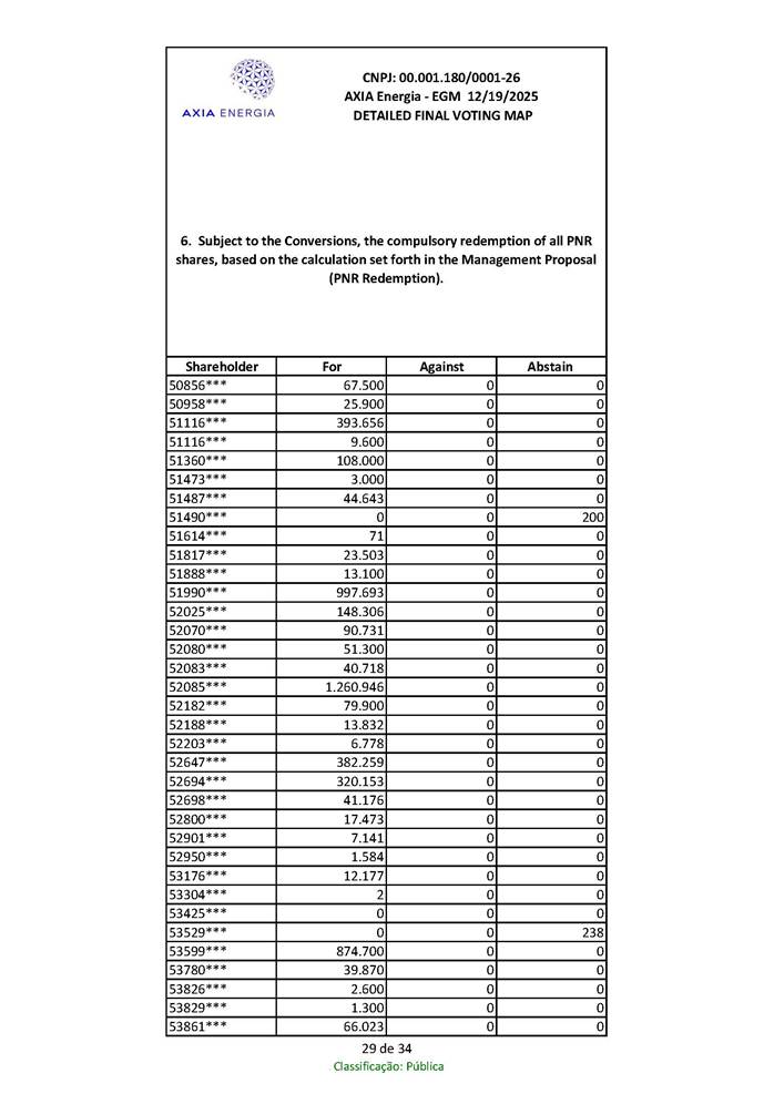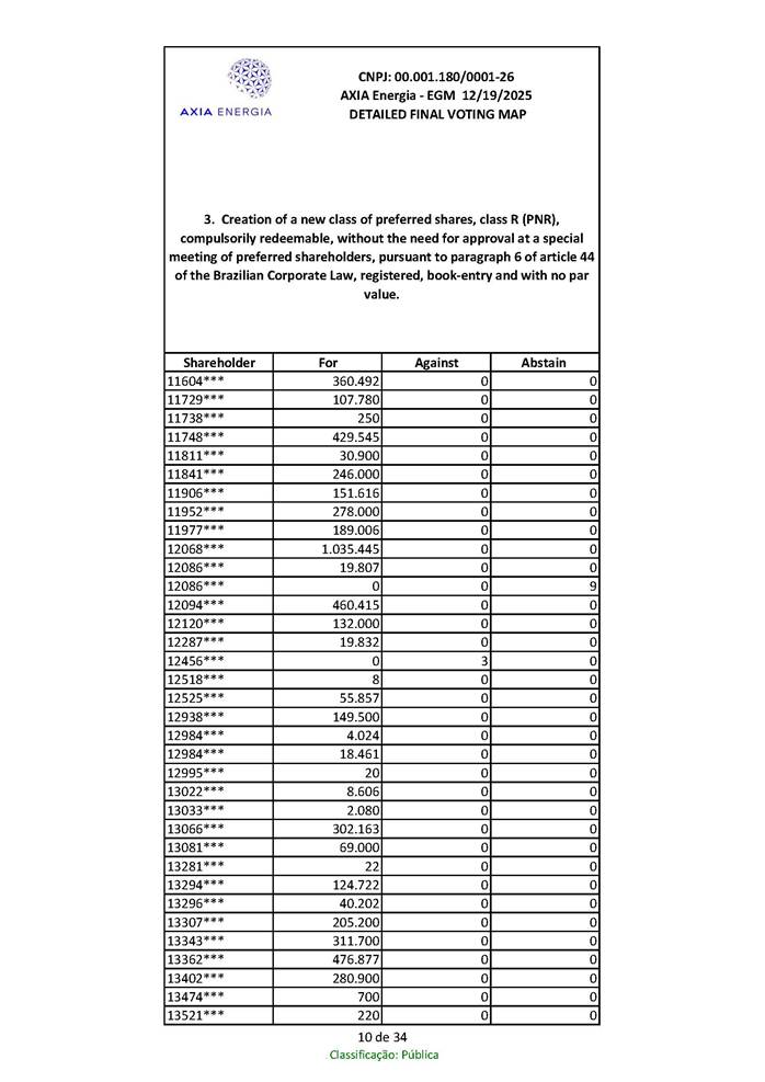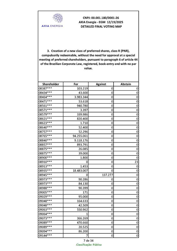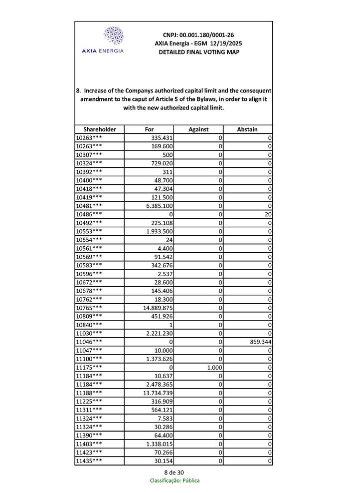 Shareholder For Against Abstain Total 818.181.617 198.176.986 34.862.286 00125*** 1.178.056 0 0 00394*** 0 190.732.084 0 00455*** 6 0 0 00560*** 4.984 0 0 00586*** 10 0 0 00601*** 31 0 0 00739*** 1.428 0 0 00805*** 20 0 0 00914*** 3 0 0 01017*** 1 0 0 01171*** 1.610 0 0 01203*** 1 0 0 01456*** 4 0 0 01496*** 161.306 0 0 01586*** 16 0 0 01643*** 66.985 0 0 01699*** 96.416 0 0 01886*** 12.945 0 0 02020*** 53.603 0 0 02097*** 5.700 0 0 02231*** 611 0 0 02231*** 8.536 0 0 02285*** 102 0 0 02524*** 250 0 0 02745*** 0 5 0 02863*** 1.125.500 0 0 02887*** 26.056 0 0 02895*** 64.700 0 0 02903*** 100 0 0 03027*** 51.786 0 0 03369*** 0 0 136 03370*** 392.332 0 0 03394*** 87.480 0 0 03394*** 7 0 0 1. Creation of a new class of preferred shares, class A1 (PNA1), registered, book-entry and with no par value, with the same rights, preferences and privileges as the currently existing class A preferred shares (PNA), plus the right to sell in a public tender offer (OPA) resulting from the sale of control, in order to ensure equal treatment to that afforded to the selling shareholder, and without the need for approval at a special meeting of holders of preferred shares. CNPJ: 00.001.180/0001-26AXIA Energia - EGM 12/19/2025 DETAILED FINAL VOTING MAP 1 de 34 # Classificação: Pública Shareholder For Against Abstain 1. Creation of a new class of preferred shares, class A1 (PNA1), registered, book-entry and with no par value, with the same rights, preferences and privileges as the currently existing class A preferred shares (PNA), plus the right to sell in a public tender offer (OPA) resulting from the sale of control, in order to ensure equal treatment to that afforded to the selling shareholder, and without the need for approval at a special meeting of holders of preferred shares. CNPJ: 00.001.180/0001-26AXIA Energia - EGM 12/19/2025 DETAILED FINAL VOTING MAP 03473*** 569 0 0 03833*** 28.394 0 0 03902*** 1 0 0 03960*** 24.957 0 0 04005*** 0 50 0 04073*** 292.991 0 0 04297*** 3 0 0 04555*** 0 0 55 04605*** 0 0 200 04609*** 602 0 0 04609*** 1.300 0 0 04616*** 11.687 0 0 04672*** 5 0 0 04709*** 0 1 0 04736*** 28.890 0 0 04751*** 111.059 0 0 04847*** 4 0 0 05075*** 5 0 0 05100*** 43.978 0 0 05147*** 14.000 0 0 05303*** 0 0 1 05316*** 1.030 0 0 05435*** 3 0 0 05448*** 9.727 0 0 05479*** 1.513.900 0 0 05479*** 2.843.378 0 0 05522*** 44 0 0 05589*** 233.315 0 0 05589*** 279.983 0 0 05589*** 28.815 0 0 05719*** 27 0 0 05734*** 415 0 0 05775*** 1.759 0 0 05838*** 15.219 0 0 05839*** 96.081 0 0 2 de 34 # Classificação: Pública Shareholder For Against Abstain 1. Creation of a new class of preferred shares, class A1 (PNA1), registered, book-entry and with no par value, with the same rights, preferences and privileges as the currently existing class A preferred shares (PNA), plus the right to sell in a public tender offer (OPA) resulting from the sale of control, in order to ensure equal treatment to that afforded to the selling shareholder, and without the need for approval at a special meeting of holders of preferred shares. CNPJ: 00.001.180/0001-26AXIA Energia - EGM 12/19/2025 DETAILED FINAL VOTING MAP 05839*** 189.258 0 0 05839*** 718.804 0 0 05839*** 724 0 0 05839*** 775.653 0 0 05839*** 15.200 0 0 05839*** 9.200 0 0 05839*** 803.800 0 0 05839*** 158.291 0 0 05839*** 15.718 0 0 05839*** 0 1.111.508 0 05839*** 4.619.084 0 0 05839*** 226.872 0 0 05839*** 51.889 0 0 05840*** 188.253 0 0 05840*** 10.000 0 0 05840*** 32.547 0 0 05840*** 804.990 0 0 05840*** 4.858.301 0 0 05840*** 477.000 0 0 05840*** 2.199.143 0 0 05872*** 79.961 0 0 05901*** 1 0 0 05986*** 1.881.495 0 0 05986*** 2.673.143 0 0 05986*** 24.100 0 0 05986*** 2.155 0 0 05987*** 147.900 0 0 05987*** 129.553 0 0 05987*** 11.827 0 0 05987*** 2.020.100 0 0 05987*** 1.602.500 0 0 05987*** 5 0 0 05987*** 199.465 0 0 05987*** 13.400 0 0 05987*** 0 428.300 0 3 de 34 # Classificação: Pública Shareholder For Against Abstain 1. Creation of a new class of preferred shares, class A1 (PNA1), registered, book-entry and with no par value, with the same rights, preferences and privileges as the currently existing class A preferred shares (PNA), plus the right to sell in a public tender offer (OPA) resulting from the sale of control, in order to ensure equal treatment to that afforded to the selling shareholder, and without the need for approval at a special meeting of holders of preferred shares. CNPJ: 00.001.180/0001-26AXIA Energia - EGM 12/19/2025 DETAILED FINAL VOTING MAP 05987*** 24.749 0 0 05987*** 188.737 0 0 05987*** 2.862.252 0 0 05987*** 481.572 0 0 05987*** 1.758.400 0 0 06046*** 1.594.573 0 0 06069*** 5.615 0 0 06105*** 10.100 0 0 06134*** 0 108.329 0 06148*** 76.771 0 0 06224*** 6.811 0 0 06239*** 174.268 0 0 06239*** 455.200 0 0 06251*** 9.995 0 0 06318*** 0 0 1 06323*** 530.363 0 0 06370*** 3 0 0 06406*** 0 0 100.000 06491*** 35 0 0 06541*** 284.989 0 0 06571*** 130 0 0 06613*** 77.676 0 0 06832*** 0 23 0 06916*** 622.500 0 0 06943*** 137.641 0 0 06943*** 589.073 0 0 06943*** 922.665 0 0 06949*** 0 0 10 06964*** 298.476 0 0 07023*** 0 0 100 07060*** 239.200 0 0 07086*** 1.000 0 0 07096*** 51.672 0 0 07140*** 0 859.100 0 07140*** 19.426 0 0 4 de 34 # Classificação: Pública Shareholder For Against Abstain 1. Creation of a new class of preferred shares, class A1 (PNA1), registered, book-entry and with no par value, with the same rights, preferences and privileges as the currently existing class A preferred shares (PNA), plus the right to sell in a public tender offer (OPA) resulting from the sale of control, in order to ensure equal treatment to that afforded to the selling shareholder, and without the need for approval at a special meeting of holders of preferred shares. CNPJ: 00.001.180/0001-26AXIA Energia - EGM 12/19/2025 DETAILED FINAL VOTING MAP 07140*** 1.219 0 0 07140*** 26.098 0 0 07187*** 16.269 0 0 07187*** 713 0 0 07191*** 0 857.000 0 07191*** 85.700 0 0 07191*** 105.335 0 0 07226*** 0 0 4 07237*** 589.417 0 0 07237*** 33.388 0 0 07247*** 296