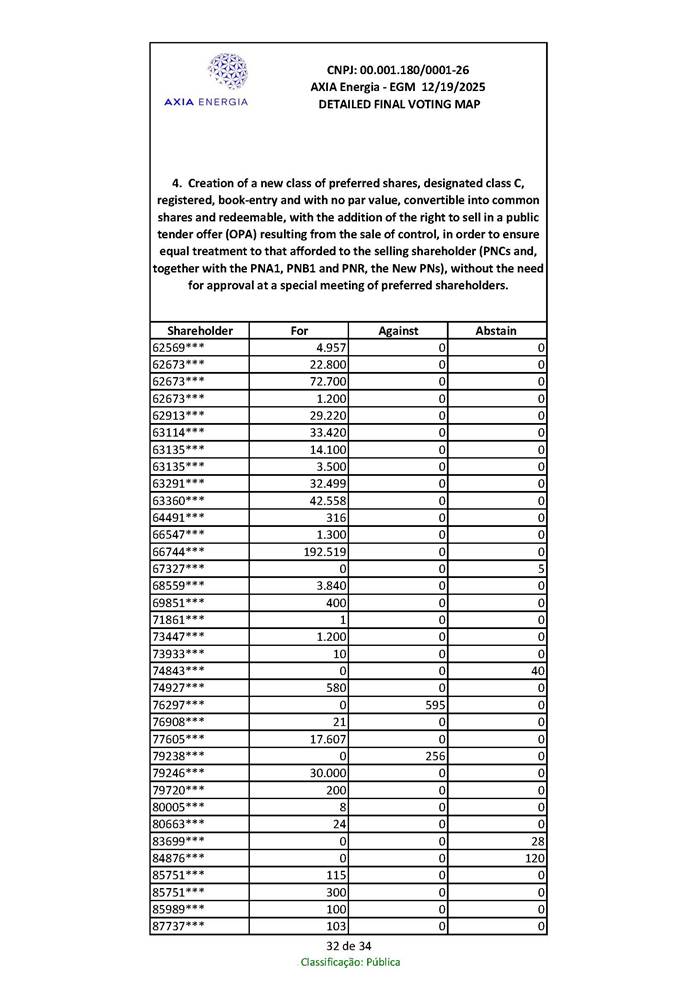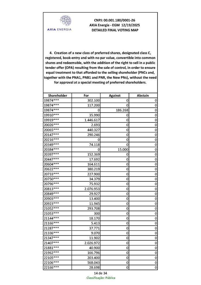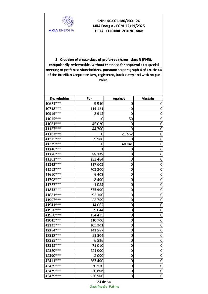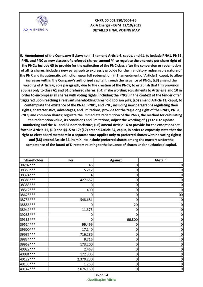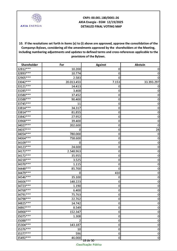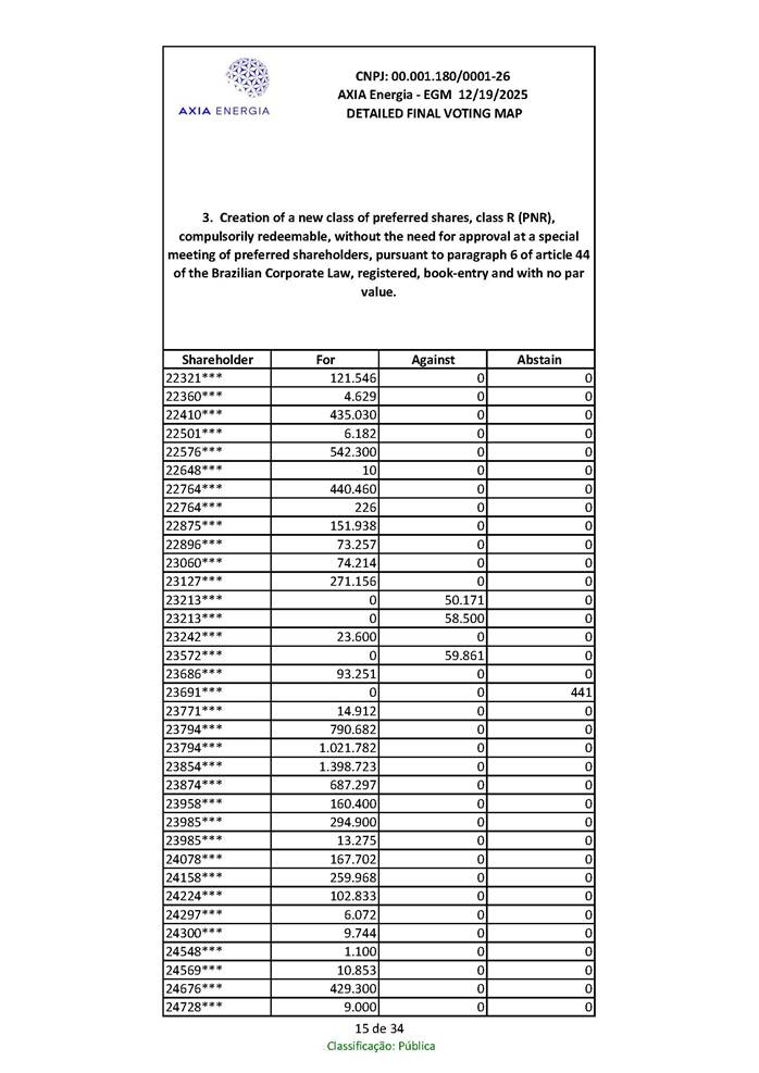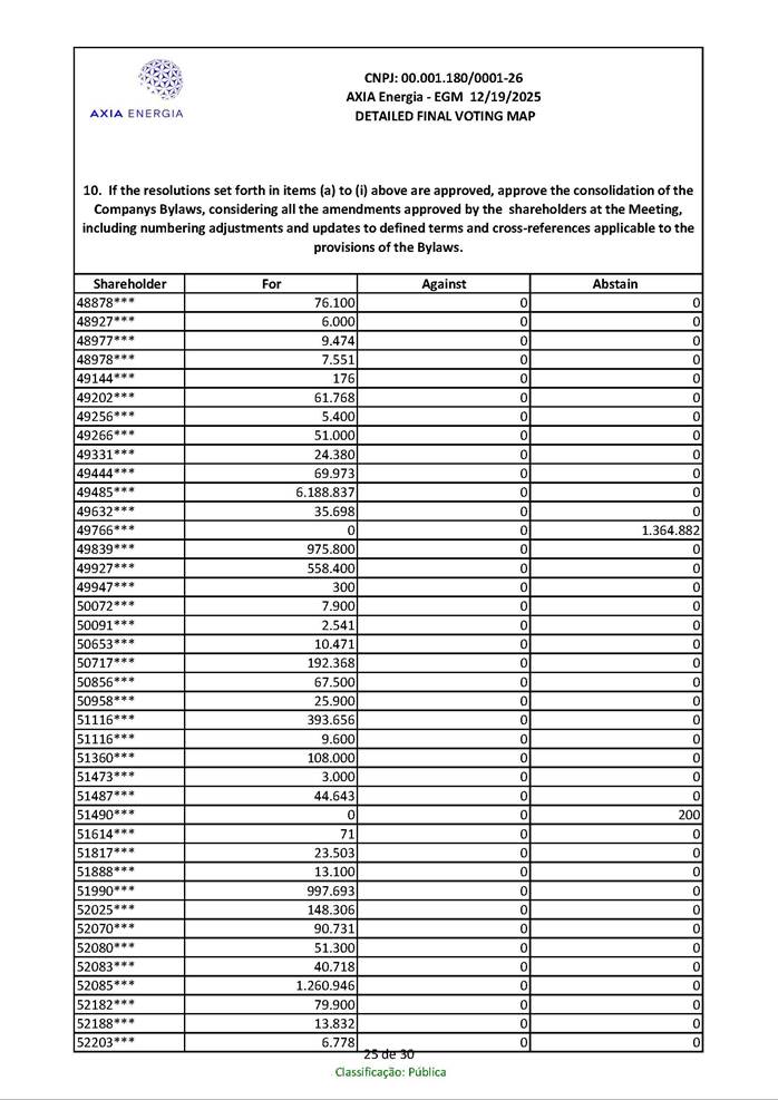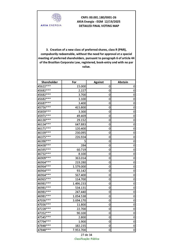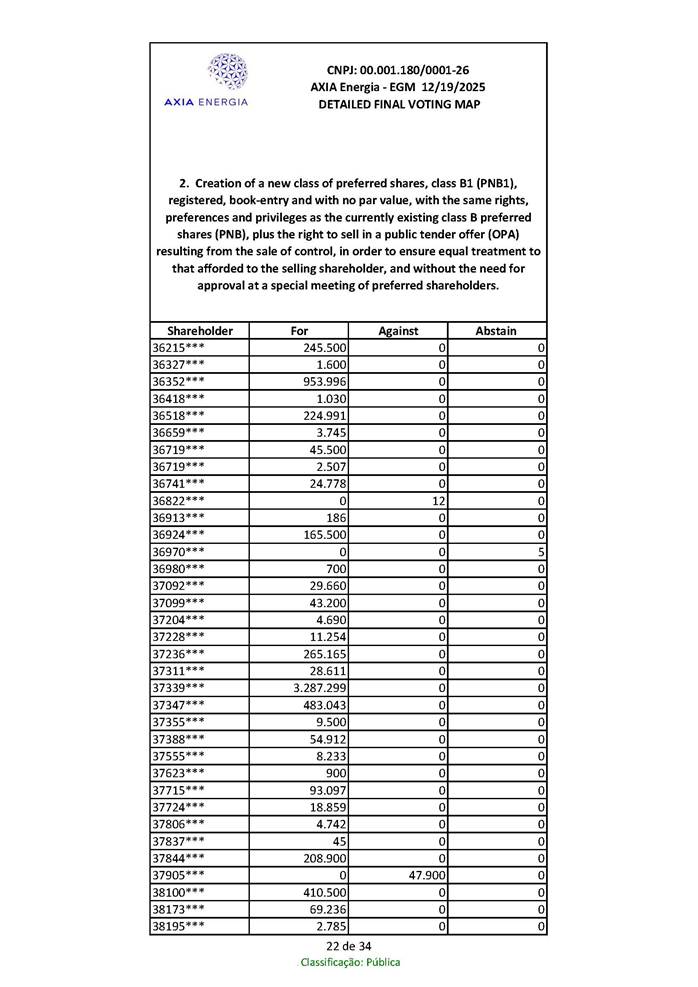 Shareholder For Against Abstain Total 818.181.617 198.176.986 34.862.286 00125*** 1.178.056 0 0 00394*** 0 190.732.084 0 00455*** 6 0 0 00560*** 4.984 0 0 00586*** 10 0 0 00601*** 31 0 0 00739*** 1.428 0 0 00805*** 20 0 0 00914*** 3 0 0 01017*** 1 0 0 01171*** 1.610 0 0 01203*** 1 0 0 01456*** 4 0 0 01496*** 161.306 0 0 01586*** 16 0 0 01643*** 66.985 0 0 01699*** 96.416 0 0 01886*** 12.945 0 0 02020*** 53.603 0 0 02097*** 5.700 0 0 02231*** 611 0 0 02231*** 8.536 0 0 02285*** 102 0 0 02524*** 250 0 0 02745*** 0 5 0 02863*** 1.125.500 0 0 02887*** 26.056 0 0 02895*** 64.700 0 0 02903*** 100 0 0 03027*** 51.786 0 0 03369*** 0 0 136 03370*** 392.332 0 0 03394*** 87.480 0 0 03394*** 7 0 0 1. Creation of a new class of preferred shares, class A1 (PNA1), registered, book-entry and with no par value, with the same rights, preferences and privileges as the currently existing class A preferred shares (PNA), plus the right to sell in a public tender offer (OPA) resulting from the sale of control, in order to ensure equal treatment to that afforded to the selling shareholder, and without the need for approval at a special meeting of holders of preferred shares. CNPJ: 00.001.180/0001-26AXIA Energia - EGM 12/19/2025 DETAILED FINAL VOTING MAP 1 de 34 # Classificação: Pública Shareholder For Against Abstain 1. Creation of a new class of preferred shares, class A1 (PNA1), registered, book-entry and with no par value, with the same rights, preferences and privileges as the currently existing class A preferred shares (PNA), plus the right to sell in a public tender offer (OPA) resulting from the sale of control, in order to ensure equal treatment to that afforded to the selling shareholder, and without the need for approval at a special meeting of holders of preferred shares. CNPJ: 00.001.180/0001-26AXIA Energia - EGM 12/19/2025 DETAILED FINAL VOTING MAP 03473*** 569 0 0 03833*** 28.394 0 0 03902*** 1 0 0 03960*** 24.957 0 0 04005*** 0 50 0 04073*** 292.991 0 0 04297*** 3 0 0 04555*** 0 0 55 04605*** 0 0 200 04609*** 602 0 0 04609*** 1.300 0 0 04616*** 11.687 0 0 04672*** 5 0 0 04709*** 0 1 0 04736*** 28.890 0 0 04751*** 111.059 0 0 04847*** 4 0 0 05075*** 5 0 0 05100*** 43.978 0 0 05147*** 14.000 0 0 05303*** 0 0 1 05316*** 1.030 0 0 05435*** 3 0 0 05448*** 9.727 0 0 05479*** 1.513.900 0 0 05479*** 2.843.378 0 0 05522*** 44 0 0 05589*** 233.315 0 0 05589*** 279.983 0 0 05589*** 28.815 0 0 05719*** 27 0 0 05734*** 415 0 0 05775*** 1.759 0 0 05838*** 15.219 0 0 05839*** 96.081 0 0 2 de 34 # Classificação: Pública Shareholder For Against Abstain 1. Creation of a new class of preferred shares, class A1 (PNA1), registered, book-entry and with no par value, with the same rights, preferences and privileges as the currently existing class A preferred shares (PNA), plus the right to sell in a public tender offer (OPA) resulting from the sale of control, in order to ensure equal treatment to that afforded to the selling shareholder, and without the need for approval at a special meeting of holders of preferred shares. CNPJ: 00.001.180/0001-26AXIA Energia - EGM 12/19/2025 DETAILED FINAL VOTING MAP 05839*** 189.258 0 0 05839*** 718.804 0 0 05839*** 724 0 0 05839*** 775.653 0 0 05839*** 15.200 0 0 05839*** 9.200 0 0 05839*** 803.800 0 0 05839*** 158.291 0 0 05839*** 15.718 0 0 05839*** 0 1.111.508 0 05839*** 4.619.084 0 0 05839*** 226.872 0 0 05839*** 51.889 0 0 05840*** 188.253 0 0 05840*** 10.000 0 0 05840*** 32.547 0 0 05840*** 804.990 0 0 05840*** 4.858.301 0 0 05840*** 477.000 0 0 05840*** 2.199.143 0 0 05872*** 79.961 0 0 05901*** 1 0 0 05986*** 1.881.495 0 0 05986*** 2.673.143 0 0 05986*** 24.100 0 0 05986*** 2.155 0 0 05987*** 147.900 0 0 05987*** 129.553 0 0 05987*** 11.827 0 0 05987*** 2.020.100 0 0 05987*** 1.602.500 0 0 05987*** 5 0 0 05987*** 199.465 0 0 05987*** 13.400 0 0 05987*** 0 428.300 0 3 de 34 # Classificação: Pública Shareholder For Against Abstain 1. Creation of a new class of preferred shares, class A1 (PNA1), registered, book-entry and with no par value, with the same rights, preferences and privileges as the currently existing class A preferred shares (PNA), plus the right to sell in a public tender offer (OPA) resulting from the sale of control, in order to ensure equal treatment to that afforded to the selling shareholder, and without the need for approval at a special meeting of holders of preferred shares. CNPJ: 00.001.180/0001-26AXIA Energia - EGM 12/19/2025 DETAILED FINAL VOTING MAP 05987*** 24.749 0 0 05987*** 188.737 0 0 05987*** 2.862.252 0 0 05987*** 481.572 0 0 05987*** 1.758.400 0 0 06046*** 1.594.573 0 0 06069*** 5.615 0 0 06105*** 10.100 0 0 06134*** 0 108.329 0 06148*** 76.771 0 0 06224*** 6.811 0 0 06239*** 174.268 0 0 06239*** 455.200 0 0 06251*** 9.995 0 0 06318*** 0 0 1 06323*** 530.363 0 0 06370*** 3 0 0 06406*** 0 0 100.000 06491*** 35 0 0 06541*** 284.989 0 0 06571*** 130 0 0 06613*** 77.676 0 0 06832*** 0 23 0 06916*** 622.500 0 0 06943*** 137.641 0 0 06943*** 589.073 0 0 06943*** 922.665 0 0 06949*** 0 0 10 06964*** 298.476 0 0 07023*** 0 0 100 07060*** 239.200 0 0 07086*** 1.000 0 0 07096*** 51.672 0 0 07140*** 0 859.100 0 07140*** 19.426 0 0 4 de 34 # Classificação: Pública Shareholder For Against Abstain 1. Creation of a new class of preferred shares, class A1 (PNA1), registered, book-entry and with no par value, with the same rights, preferences and privileges as the currently existing class A preferred shares (PNA), plus the right to sell in a public tender offer (OPA) resulting from the sale of control, in order to ensure equal treatment to that afforded to the selling shareholder, and without the need for approval at a special meeting of holders of preferred shares. CNPJ: 00.001.180/0001-26AXIA Energia - EGM 12/19/2025 DETAILED FINAL VOTING MAP 07140*** 1.219 0 0 07140*** 26.098 0 0 07187*** 16.269 0 0 07187*** 713 0 0 07191*** 0 857.000 0 07191*** 85.700 0 0 07191*** 105.335 0 0 07226*** 0 0 4 07237*** 589.417 0 0 07237*** 33.388 0 0 07247*** 296