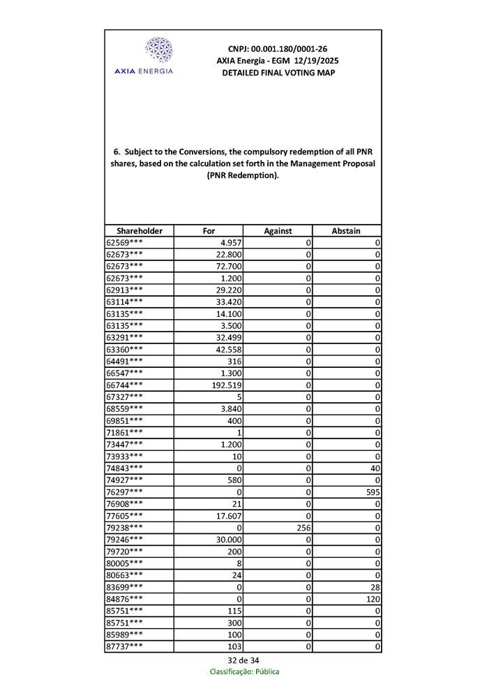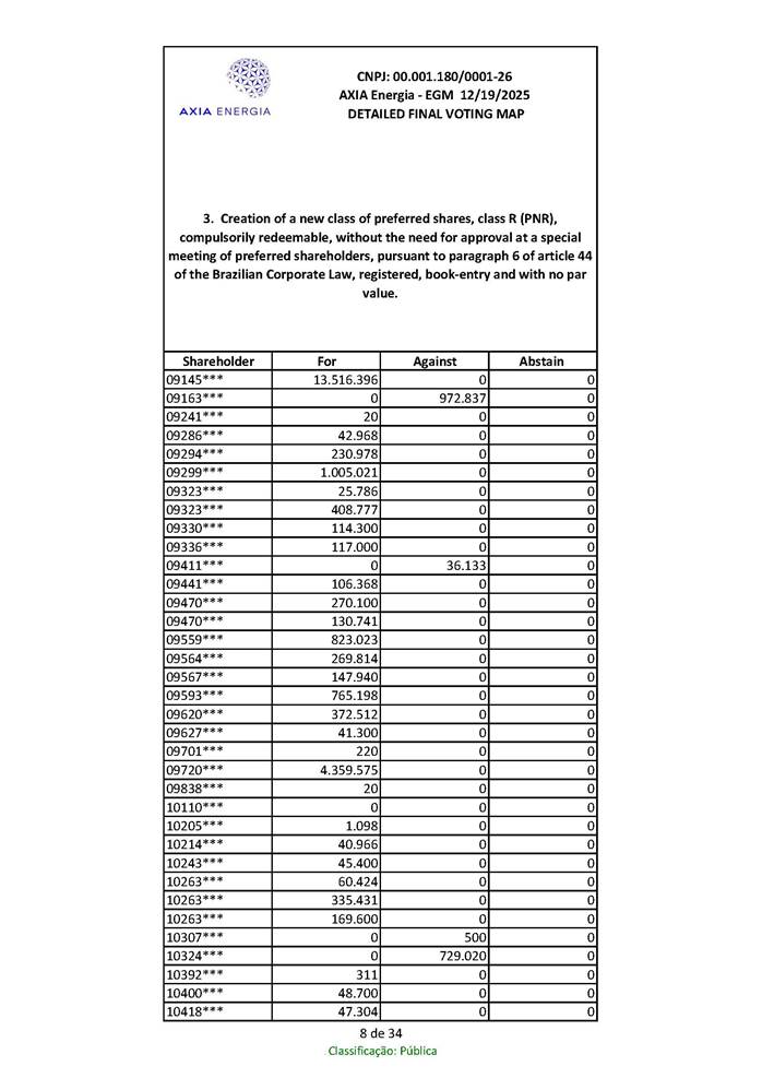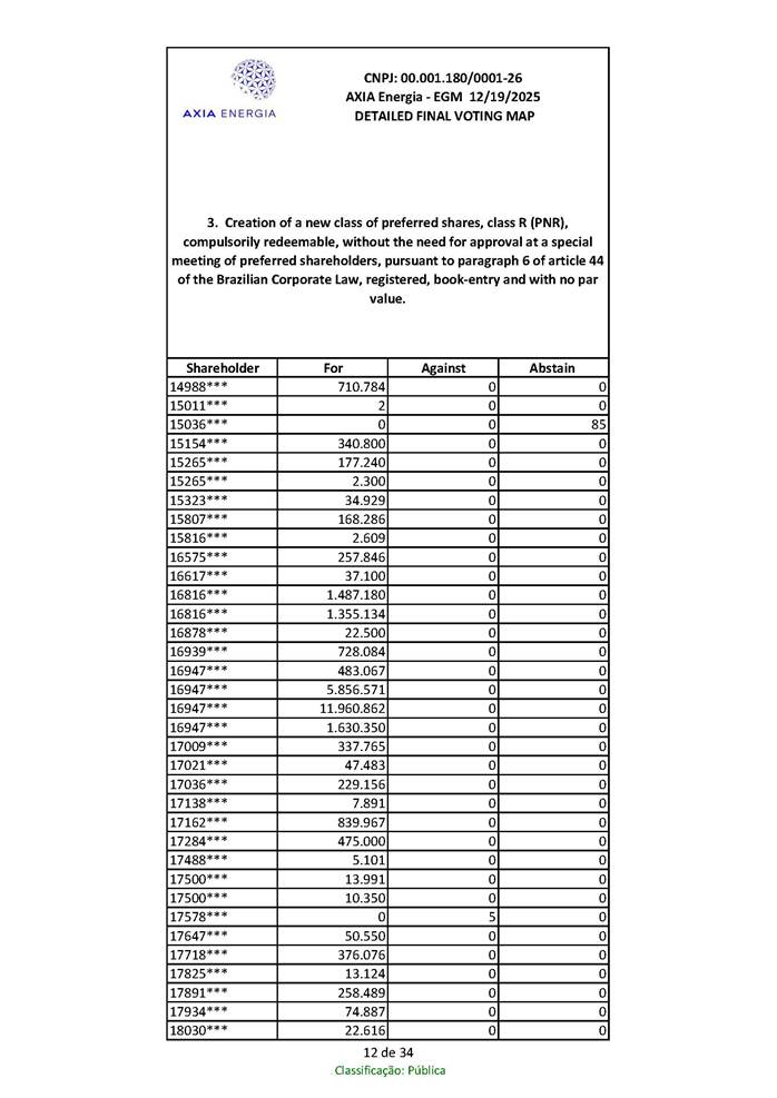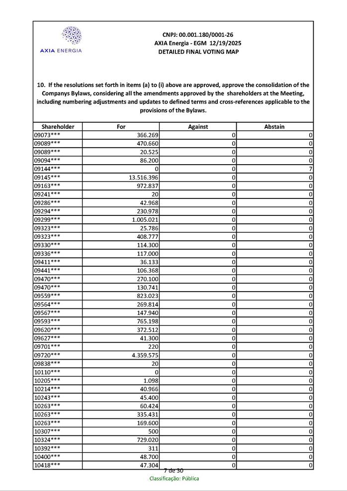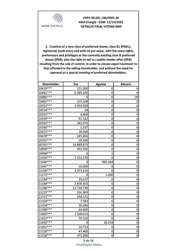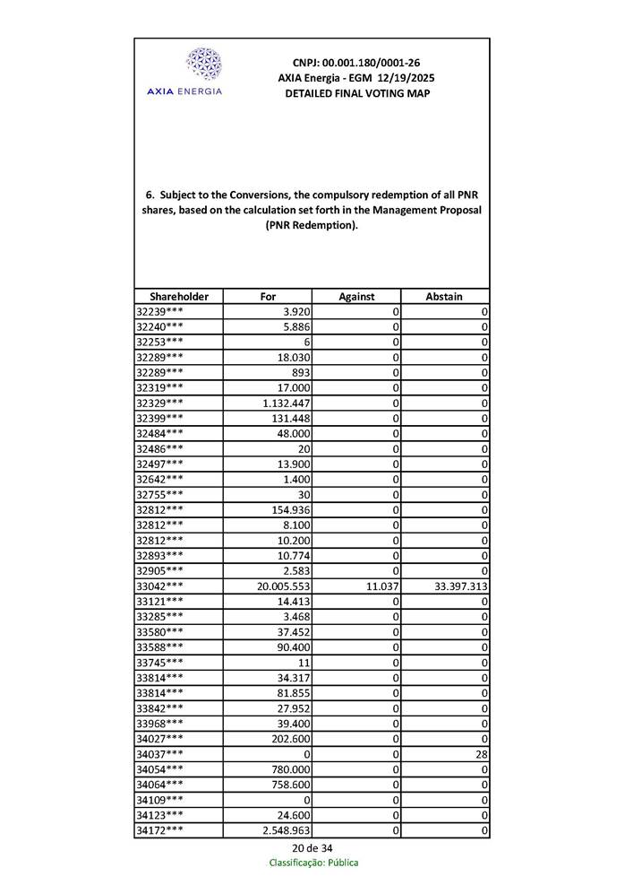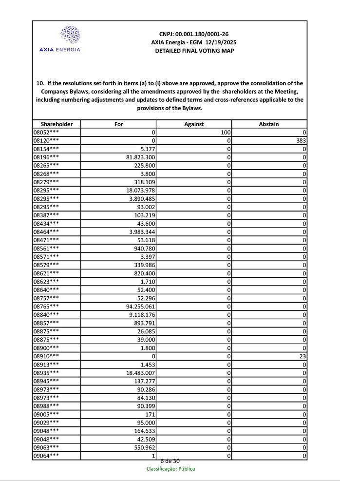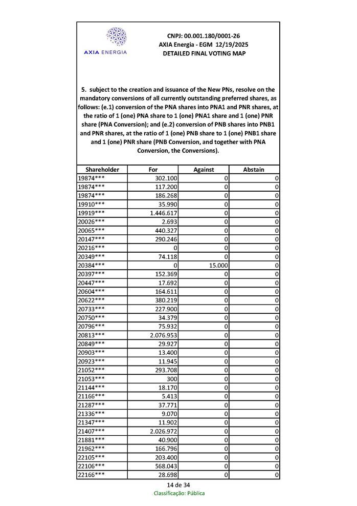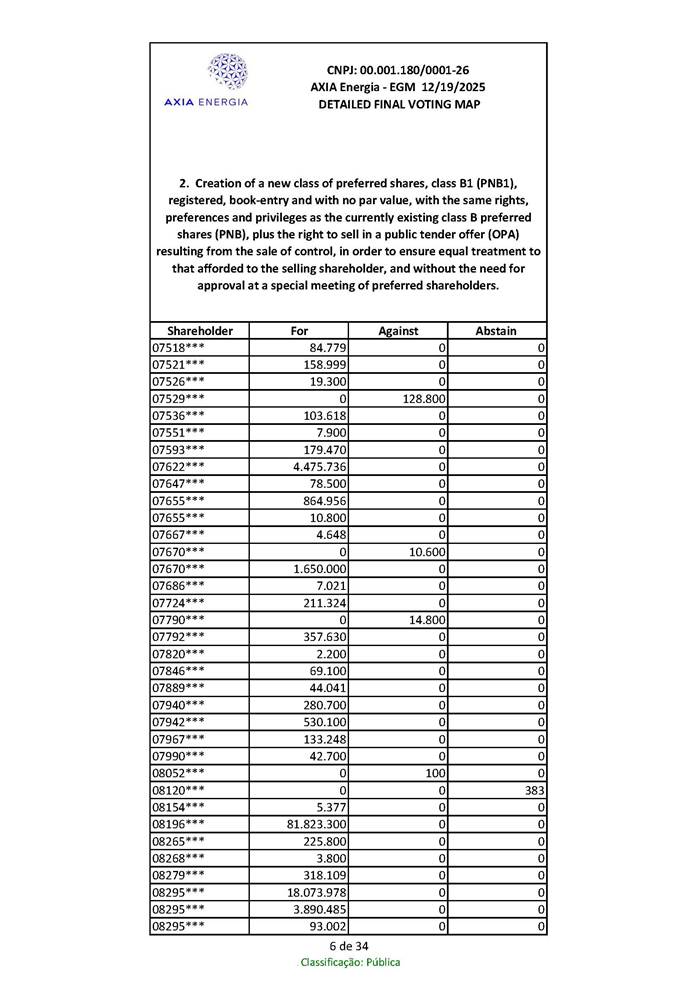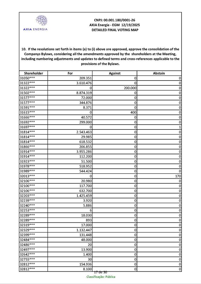 Shareholder For Against Abstain Total 818.181.617 198.176.986 34.862.286 00125*** 1.178.056 0 0 00394*** 0 190.732.084 0 00455*** 6 0 0 00560*** 4.984 0 0 00586*** 10 0 0 00601*** 31 0 0 00739*** 1.428 0 0 00805*** 20 0 0 00914*** 3 0 0 01017*** 1 0 0 01171*** 1.610 0 0 01203*** 1 0 0 01456*** 4 0 0 01496*** 161.306 0 0 01586*** 16 0 0 01643*** 66.985 0 0 01699*** 96.416 0 0 01886*** 12.945 0 0 02020*** 53.603 0 0 02097*** 5.700 0 0 02231*** 611 0 0 02231*** 8.536 0 0 02285*** 102 0 0 02524*** 250 0 0 02745*** 0 5 0 02863*** 1.125.500 0 0 02887*** 26.056 0 0 02895*** 64.700 0 0 02903*** 100 0 0 03027*** 51.786 0 0 03369*** 0 0 136 03370*** 392.332 0 0 03394*** 87.480 0 0 03394*** 7 0 0 1. Creation of a new class of preferred shares, class A1 (PNA1), registered, book-entry and with no par value, with the same rights, preferences and privileges as the currently existing class A preferred shares (PNA), plus the right to sell in a public tender offer (OPA) resulting from the sale of control, in order to ensure equal treatment to that afforded to the selling shareholder, and without the need for approval at a special meeting of holders of preferred shares. CNPJ: 00.001.180/0001-26AXIA Energia - EGM 12/19/2025 DETAILED FINAL VOTING MAP 1 de 34 # Classificação: Pública Shareholder For Against Abstain 1. Creation of a new class of preferred shares, class A1 (PNA1), registered, book-entry and with no par value, with the same rights, preferences and privileges as the currently existing class A preferred shares (PNA), plus the right to sell in a public tender offer (OPA) resulting from the sale of control, in order to ensure equal treatment to that afforded to the selling shareholder, and without the need for approval at a special meeting of holders of preferred shares. CNPJ: 00.001.180/0001-26AXIA Energia - EGM 12/19/2025 DETAILED FINAL VOTING MAP 03473*** 569 0 0 03833*** 28.394 0 0 03902*** 1 0 0 03960*** 24.957 0 0 04005*** 0 50 0 04073*** 292.991 0 0 04297*** 3 0 0 04555*** 0 0 55 04605*** 0 0 200 04609*** 602 0 0 04609*** 1.300 0 0 04616*** 11.687 0 0 04672*** 5 0 0 04709*** 0 1 0 04736*** 28.890 0 0 04751*** 111.059 0 0 04847*** 4 0 0 05075*** 5 0 0 05100*** 43.978 0 0 05147*** 14.000 0 0 05303*** 0 0 1 05316*** 1.030 0 0 05435*** 3 0 0 05448*** 9.727 0 0 05479*** 1.513.900 0 0 05479*** 2.843.378 0 0 05522*** 44 0 0 05589*** 233.315 0 0 05589*** 279.983 0 0 05589*** 28.815 0 0 05719*** 27 0 0 05734*** 415 0 0 05775*** 1.759 0 0 05838*** 15.219 0 0 05839*** 96.081 0 0 2 de 34 # Classificação: Pública Shareholder For Against Abstain 1. Creation of a new class of preferred shares, class A1 (PNA1), registered, book-entry and with no par value, with the same rights, preferences and privileges as the currently existing class A preferred shares (PNA), plus the right to sell in a public tender offer (OPA) resulting from the sale of control, in order to ensure equal treatment to that afforded to the selling shareholder, and without the need for approval at a special meeting of holders of preferred shares. CNPJ: 00.001.180/0001-26AXIA Energia - EGM 12/19/2025 DETAILED FINAL VOTING MAP 05839*** 189.258 0 0 05839*** 718.804 0 0 05839*** 724 0 0 05839*** 775.653 0 0 05839*** 15.200 0 0 05839*** 9.200 0 0 05839*** 803.800 0 0 05839*** 158.291 0 0 05839*** 15.718 0 0 05839*** 0 1.111.508 0 05839*** 4.619.084 0 0 05839*** 226.872 0 0 05839*** 51.889 0 0 05840*** 188.253 0 0 05840*** 10.000 0 0 05840*** 32.547 0 0 05840*** 804.990 0 0 05840*** 4.858.301 0 0 05840*** 477.000 0 0 05840*** 2.199.143 0 0 05872*** 79.961 0 0 05901*** 1 0 0 05986*** 1.881.495 0 0 05986*** 2.673.143 0 0 05986*** 24.100 0 0 05986*** 2.155 0 0 05987*** 147.900 0 0 05987*** 129.553 0 0 05987*** 11.827 0 0 05987*** 2.020.100 0 0 05987*** 1.602.500 0 0 05987*** 5 0 0 05987*** 199.465 0 0 05987*** 13.400 0 0 05987*** 0 428.300 0 3 de 34 # Classificação: Pública Shareholder For Against Abstain 1. Creation of a new class of preferred shares, class A1 (PNA1), registered, book-entry and with no par value, with the same rights, preferences and privileges as the currently existing class A preferred shares (PNA), plus the right to sell in a public tender offer (OPA) resulting from the sale of control, in order to ensure equal treatment to that afforded to the selling shareholder, and without the need for approval at a special meeting of holders of preferred shares. CNPJ: 00.001.180/0001-26AXIA Energia - EGM 12/19/2025 DETAILED FINAL VOTING MAP 05987*** 24.749 0 0 05987*** 188.737 0 0 05987*** 2.862.252 0 0 05987*** 481.572 0 0 05987*** 1.758.400 0 0 06046*** 1.594.573 0 0 06069*** 5.615 0 0 06105*** 10.100 0 0 06134*** 0 108.329 0 06148*** 76.771 0 0 06224*** 6.811 0 0 06239*** 174.268 0 0 06239*** 455.200 0 0 06251*** 9.995 0 0 06318*** 0 0 1 06323*** 530.363 0 0 06370*** 3 0 0 06406*** 0 0 100.000 06491*** 35 0 0 06541*** 284.989 0 0 06571*** 130 0 0 06613*** 77.676 0 0 06832*** 0 23 0 06916*** 622.500 0 0 06943*** 137.641 0 0 06943*** 589.073 0 0 06943*** 922.665 0 0 06949*** 0 0 10 06964*** 298.476 0 0 07023*** 0 0 100 07060*** 239.200 0 0 07086*** 1.000 0 0 07096*** 51.672 0 0 07140*** 0 859.100 0 07140*** 19.426 0 0 4 de 34 # Classificação: Pública Shareholder For Against Abstain 1. Creation of a new class of preferred shares, class A1 (PNA1), registered, book-entry and with no par value, with the same rights, preferences and privileges as the currently existing class A preferred shares (PNA), plus the right to sell in a public tender offer (OPA) resulting from the sale of control, in order to ensure equal treatment to that afforded to the selling shareholder, and without the need for approval at a special meeting of holders of preferred shares. CNPJ: 00.001.180/0001-26AXIA Energia - EGM 12/19/2025 DETAILED FINAL VOTING MAP 07140*** 1.219 0 0 07140*** 26.098 0 0 07187*** 16.269 0 0 07187*** 713 0 0 07191*** 0 857.000 0 07191*** 85.700 0 0 07191*** 105.335 0 0 07226*** 0 0 4 07237*** 589.417 0 0 07237*** 33.388 0 0 07247*** 296