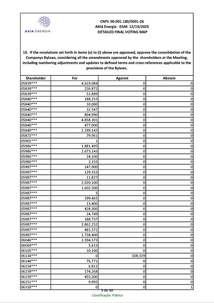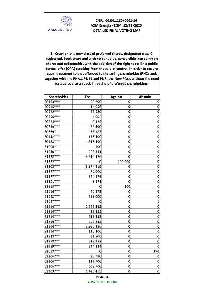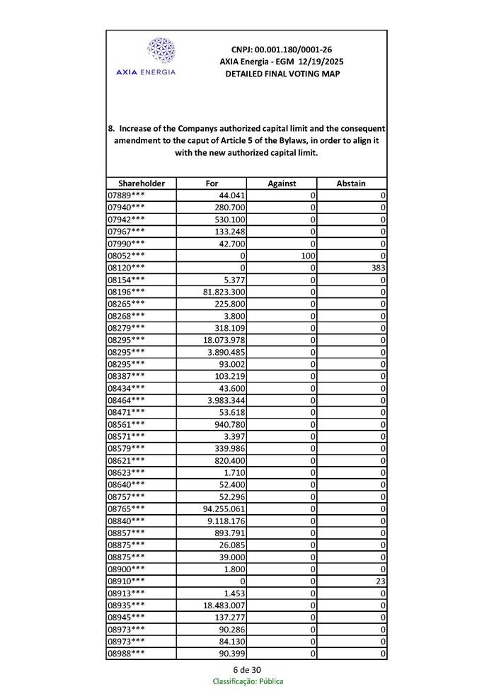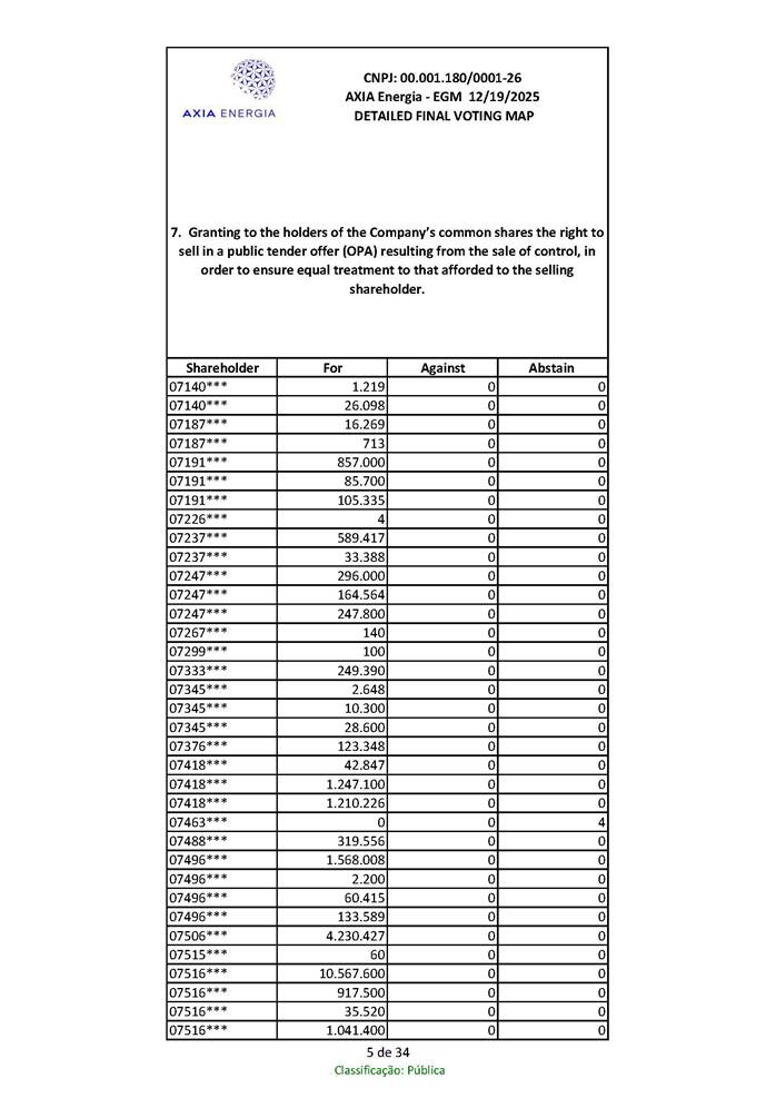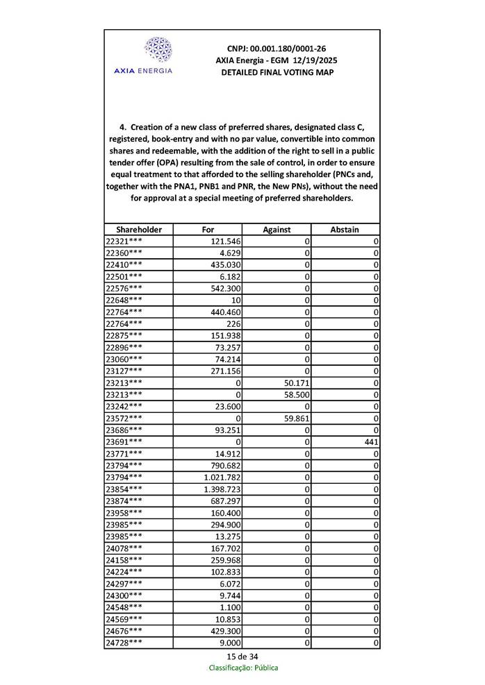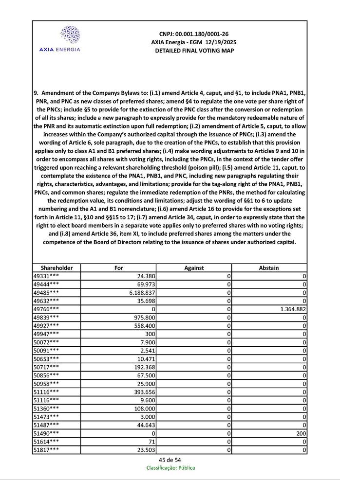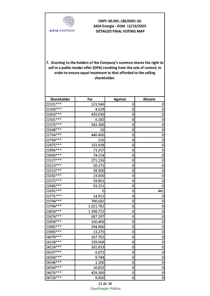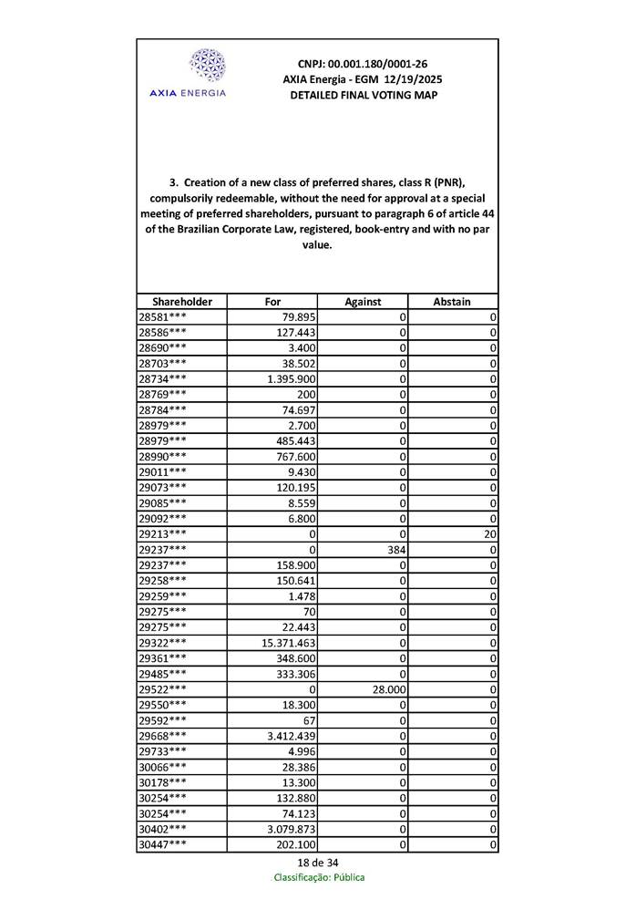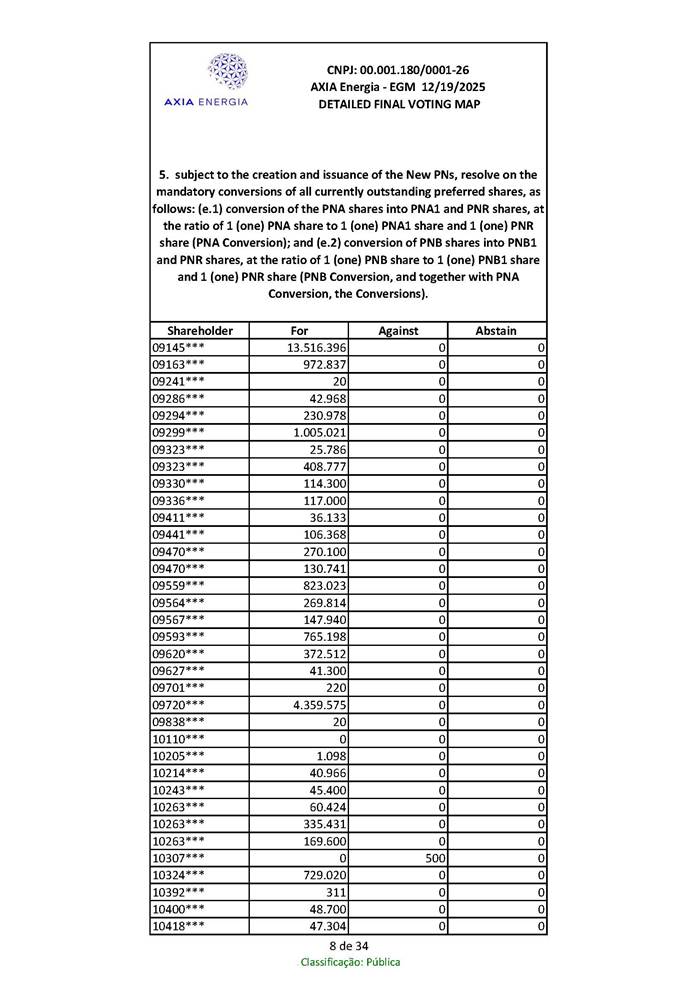 Shareholder For Against Abstain Total 818.181.617 198.176.986 34.862.286 00125*** 1.178.056 0 0 00394*** 0 190.732.084 0 00455*** 6 0 0 00560*** 4.984 0 0 00586*** 10 0 0 00601*** 31 0 0 00739*** 1.428 0 0 00805*** 20 0 0 00914*** 3 0 0 01017*** 1 0 0 01171*** 1.610 0 0 01203*** 1 0 0 01456*** 4 0 0 01496*** 161.306 0 0 01586*** 16 0 0 01643*** 66.985 0 0 01699*** 96.416 0 0 01886*** 12.945 0 0 02020*** 53.603 0 0 02097*** 5.700 0 0 02231*** 611 0 0 02231*** 8.536 0 0 02285*** 102 0 0 02524*** 250 0 0 02745*** 0 5 0 02863*** 1.125.500 0 0 02887*** 26.056 0 0 02895*** 64.700 0 0 02903*** 100 0 0 03027*** 51.786 0 0 03369*** 0 0 136 03370*** 392.332 0 0 03394*** 87.480 0 0 03394*** 7 0 0 1. Creation of a new class of preferred shares, class A1 (PNA1), registered, book-entry and with no par value, with the same rights, preferences and privileges as the currently existing class A preferred shares (PNA), plus the right to sell in a public tender offer (OPA) resulting from the sale of control, in order to ensure equal treatment to that afforded to the selling shareholder, and without the need for approval at a special meeting of holders of preferred shares. CNPJ: 00.001.180/0001-26AXIA Energia - EGM 12/19/2025 DETAILED FINAL VOTING MAP 1 de 34 # Classificação: Pública Shareholder For Against Abstain 1. Creation of a new class of preferred shares, class A1 (PNA1), registered, book-entry and with no par value, with the same rights, preferences and privileges as the currently existing class A preferred shares (PNA), plus the right to sell in a public tender offer (OPA) resulting from the sale of control, in order to ensure equal treatment to that afforded to the selling shareholder, and without the need for approval at a special meeting of holders of preferred shares. CNPJ: 00.001.180/0001-26AXIA Energia - EGM 12/19/2025 DETAILED FINAL VOTING MAP 03473*** 569 0 0 03833*** 28.394 0 0 03902*** 1 0 0 03960*** 24.957 0 0 04005*** 0 50 0 04073*** 292.991 0 0 04297*** 3 0 0 04555*** 0 0 55 04605*** 0 0 200 04609*** 602 0 0 04609*** 1.300 0 0 04616*** 11.687 0 0 04672*** 5 0 0 04709*** 0 1 0 04736*** 28.890 0 0 04751*** 111.059 0 0 04847*** 4 0 0 05075*** 5 0 0 05100*** 43.978 0 0 05147*** 14.000 0 0 05303*** 0 0 1 05316*** 1.030 0 0 05435*** 3 0 0 05448*** 9.727 0 0 05479*** 1.513.900 0 0 05479*** 2.843.378 0 0 05522*** 44 0 0 05589*** 233.315 0 0 05589*** 279.983 0 0 05589*** 28.815 0 0 05719*** 27 0 0 05734*** 415 0 0 05775*** 1.759 0 0 05838*** 15.219 0 0 05839*** 96.081 0 0 2 de 34 # Classificação: Pública Shareholder For Against Abstain 1. Creation of a new class of preferred shares, class A1 (PNA1), registered, book-entry and with no par value, with the same rights, preferences and privileges as the currently existing class A preferred shares (PNA), plus the right to sell in a public tender offer (OPA) resulting from the sale of control, in order to ensure equal treatment to that afforded to the selling shareholder, and without the need for approval at a special meeting of holders of preferred shares. CNPJ: 00.001.180/0001-26AXIA Energia - EGM 12/19/2025 DETAILED FINAL VOTING MAP 05839*** 189.258 0 0 05839*** 718.804 0 0 05839*** 724 0 0 05839*** 775.653 0 0 05839*** 15.200 0 0 05839*** 9.200 0 0 05839*** 803.800 0 0 05839*** 158.291 0 0 05839*** 15.718 0 0 05839*** 0 1.111.508 0 05839*** 4.619.084 0 0 05839*** 226.872 0 0 05839*** 51.889 0 0 05840*** 188.253 0 0 05840*** 10.000 0 0 05840*** 32.547 0 0 05840*** 804.990 0 0 05840*** 4.858.301 0 0 05840*** 477.000 0 0 05840*** 2.199.143 0 0 05872*** 79.961 0 0 05901*** 1 0 0 05986*** 1.881.495 0 0 05986*** 2.673.143 0 0 05986*** 24.100 0 0 05986*** 2.155 0 0 05987*** 147.900 0 0 05987*** 129.553 0 0 05987*** 11.827 0 0 05987*** 2.020.100 0 0 05987*** 1.602.500 0 0 05987*** 5 0 0 05987*** 199.465 0 0 05987*** 13.400 0 0 05987*** 0 428.300 0 3 de 34 # Classificação: Pública Shareholder For Against Abstain 1. Creation of a new class of preferred shares, class A1 (PNA1), registered, book-entry and with no par value, with the same rights, preferences and privileges as the currently existing class A preferred shares (PNA), plus the right to sell in a public tender offer (OPA) resulting from the sale of control, in order to ensure equal treatment to that afforded to the selling shareholder, and without the need for approval at a special meeting of holders of preferred shares. CNPJ: 00.001.180/0001-26AXIA Energia - EGM 12/19/2025 DETAILED FINAL VOTING MAP 05987*** 24.749 0 0 05987*** 188.737 0 0 05987*** 2.862.252 0 0 05987*** 481.572 0 0 05987*** 1.758.400 0 0 06046*** 1.594.573 0 0 06069*** 5.615 0 0 06105*** 10.100 0 0 06134*** 0 108.329 0 06148*** 76.771 0 0 06224*** 6.811 0 0 06239*** 174.268 0 0 06239*** 455.200 0 0 06251*** 9.995 0 0 06318*** 0 0 1 06323*** 530.363 0 0 06370*** 3 0 0 06406*** 0 0 100.000 06491*** 35 0 0 06541*** 284.989 0 0 06571*** 130 0 0 06613*** 77.676 0 0 06832*** 0 23 0 06916*** 622.500 0 0 06943*** 137.641 0 0 06943*** 589.073 0 0 06943*** 922.665 0 0 06949*** 0 0 10 06964*** 298.476 0 0 07023*** 0 0 100 07060*** 239.200 0 0 07086*** 1.000 0 0 07096*** 51.672 0 0 07140*** 0 859.100 0 07140*** 19.426 0 0 4 de 34 # Classificação: Pública Shareholder For Against Abstain 1. Creation of a new class of preferred shares, class A1 (PNA1), registered, book-entry and with no par value, with the same rights, preferences and privileges as the currently existing class A preferred shares (PNA), plus the right to sell in a public tender offer (OPA) resulting from the sale of control, in order to ensure equal treatment to that afforded to the selling shareholder, and without the need for approval at a special meeting of holders of preferred shares. CNPJ: 00.001.180/0001-26AXIA Energia - EGM 12/19/2025 DETAILED FINAL VOTING MAP 07140*** 1.219 0 0 07140*** 26.098 0 0 07187*** 16.269 0 0 07187*** 713 0 0 07191*** 0 857.000 0 07191*** 85.700 0 0 07191*** 105.335 0 0 07226*** 0 0 4 07237*** 589.417 0 0 07237*** 33.388 0 0 07247*** 296