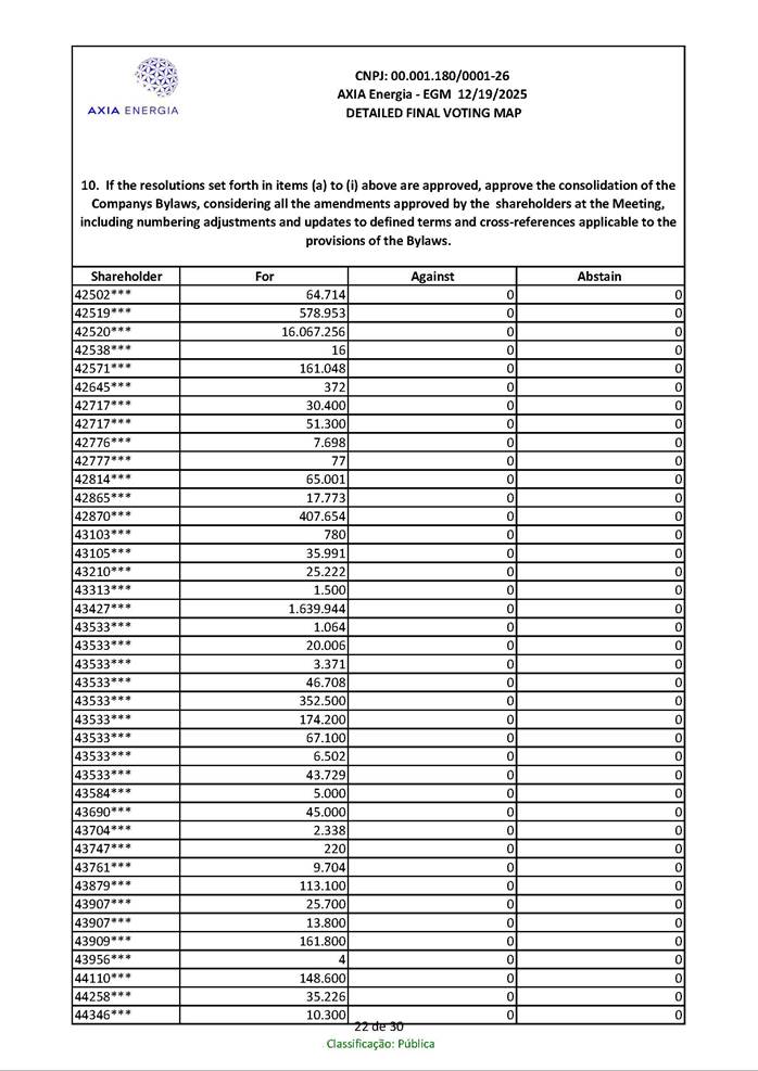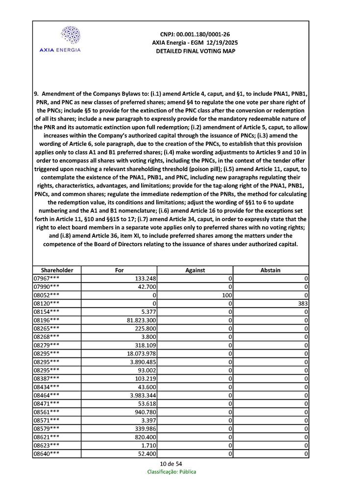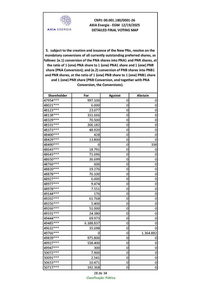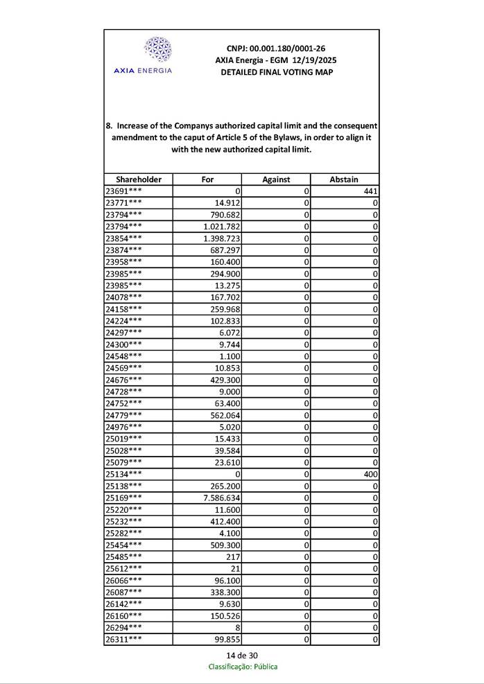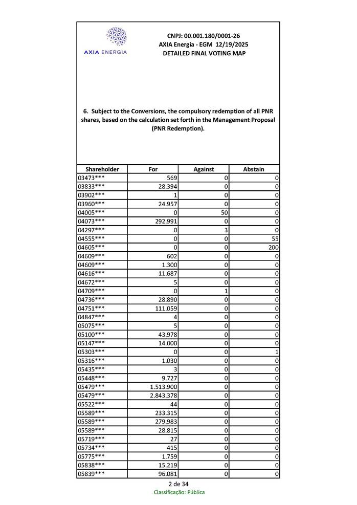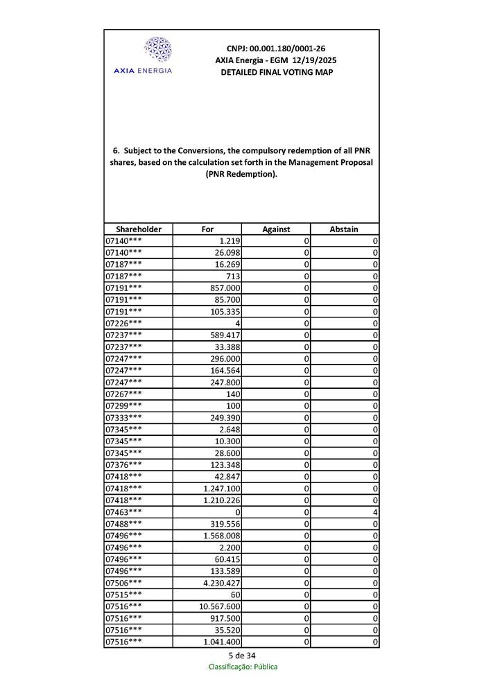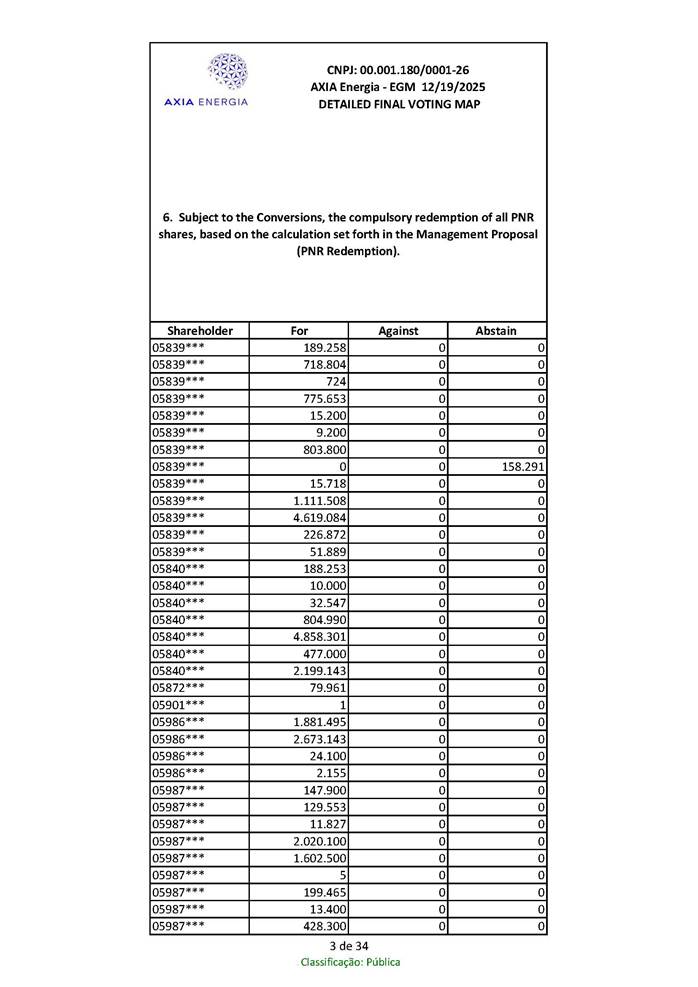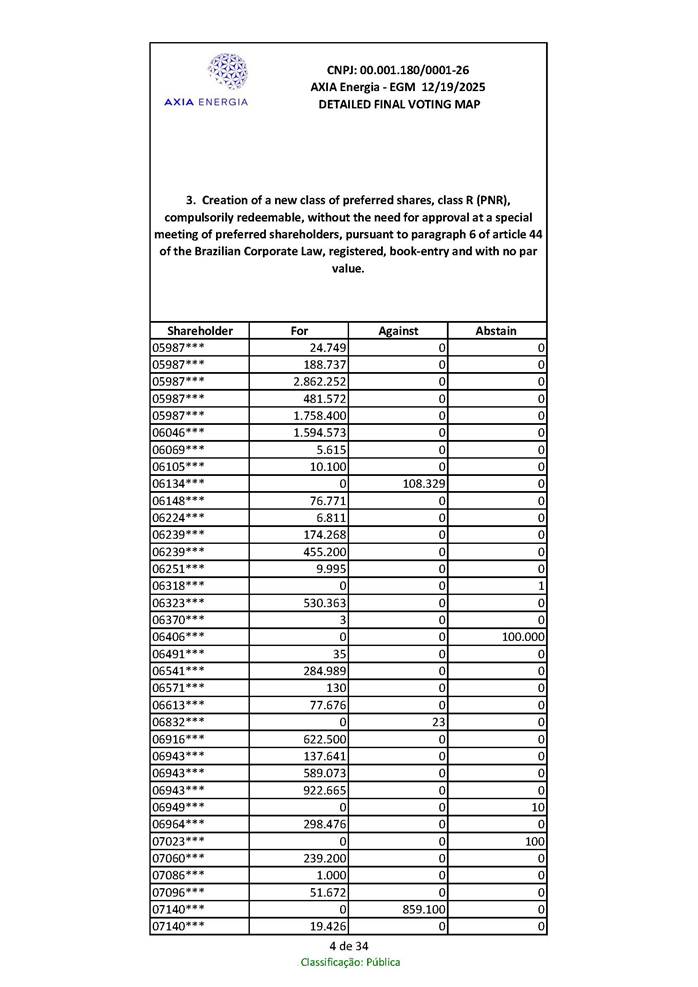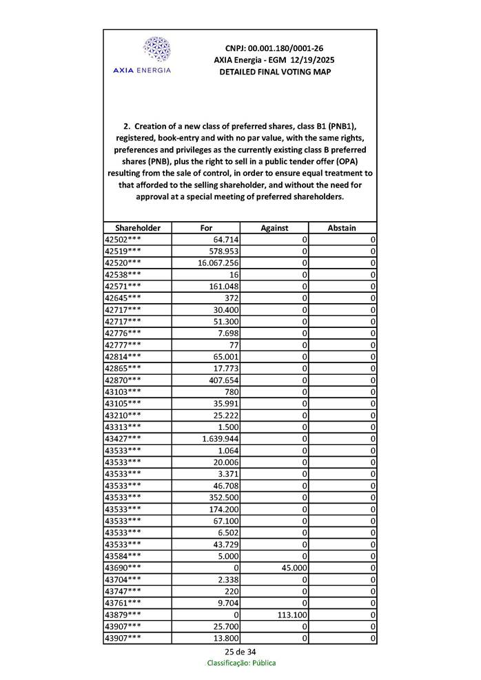 Shareholder For Against Abstain Total 818.181.617 198.176.986 34.862.286 00125*** 1.178.056 0 0 00394*** 0 190.732.084 0 00455*** 6 0 0 00560*** 4.984 0 0 00586*** 10 0 0 00601*** 31 0 0 00739*** 1.428 0 0 00805*** 20 0 0 00914*** 3 0 0 01017*** 1 0 0 01171*** 1.610 0 0 01203*** 1 0 0 01456*** 4 0 0 01496*** 161.306 0 0 01586*** 16 0 0 01643*** 66.985 0 0 01699*** 96.416 0 0 01886*** 12.945 0 0 02020*** 53.603 0 0 02097*** 5.700 0 0 02231*** 611 0 0 02231*** 8.536 0 0 02285*** 102 0 0 02524*** 250 0 0 02745*** 0 5 0 02863*** 1.125.500 0 0 02887*** 26.056 0 0 02895*** 64.700 0 0 02903*** 100 0 0 03027*** 51.786 0 0 03369*** 0 0 136 03370*** 392.332 0 0 03394*** 87.480 0 0 03394*** 7 0 0 1. Creation of a new class of preferred shares, class A1 (PNA1), registered, book-entry and with no par value, with the same rights, preferences and privileges as the currently existing class A preferred shares (PNA), plus the right to sell in a public tender offer (OPA) resulting from the sale of control, in order to ensure equal treatment to that afforded to the selling shareholder, and without the need for approval at a special meeting of holders of preferred shares. CNPJ: 00.001.180/0001-26AXIA Energia - EGM 12/19/2025 DETAILED FINAL VOTING MAP 1 de 34 # Classificação: Pública Shareholder For Against Abstain 1. Creation of a new class of preferred shares, class A1 (PNA1), registered, book-entry and with no par value, with the same rights, preferences and privileges as the currently existing class A preferred shares (PNA), plus the right to sell in a public tender offer (OPA) resulting from the sale of control, in order to ensure equal treatment to that afforded to the selling shareholder, and without the need for approval at a special meeting of holders of preferred shares. CNPJ: 00.001.180/0001-26AXIA Energia - EGM 12/19/2025 DETAILED FINAL VOTING MAP 03473*** 569 0 0 03833*** 28.394 0 0 03902*** 1 0 0 03960*** 24.957 0 0 04005*** 0 50 0 04073*** 292.991 0 0 04297*** 3 0 0 04555*** 0 0 55 04605*** 0 0 200 04609*** 602 0 0 04609*** 1.300 0 0 04616*** 11.687 0 0 04672*** 5 0 0 04709*** 0 1 0 04736*** 28.890 0 0 04751*** 111.059 0 0 04847*** 4 0 0 05075*** 5 0 0 05100*** 43.978 0 0 05147*** 14.000 0 0 05303*** 0 0 1 05316*** 1.030 0 0 05435*** 3 0 0 05448*** 9.727 0 0 05479*** 1.513.900 0 0 05479*** 2.843.378 0 0 05522*** 44 0 0 05589*** 233.315 0 0 05589*** 279.983 0 0 05589*** 28.815 0 0 05719*** 27 0 0 05734*** 415 0 0 05775*** 1.759 0 0 05838*** 15.219 0 0 05839*** 96.081 0 0 2 de 34 # Classificação: Pública Shareholder For Against Abstain 1. Creation of a new class of preferred shares, class A1 (PNA1), registered, book-entry and with no par value, with the same rights, preferences and privileges as the currently existing class A preferred shares (PNA), plus the right to sell in a public tender offer (OPA) resulting from the sale of control, in order to ensure equal treatment to that afforded to the selling shareholder, and without the need for approval at a special meeting of holders of preferred shares. CNPJ: 00.001.180/0001-26AXIA Energia - EGM 12/19/2025 DETAILED FINAL VOTING MAP 05839*** 189.258 0 0 05839*** 718.804 0 0 05839*** 724 0 0 05839*** 775.653 0 0 05839*** 15.200 0 0 05839*** 9.200 0 0 05839*** 803.800 0 0 05839*** 158.291 0 0 05839*** 15.718 0 0 05839*** 0 1.111.508 0 05839*** 4.619.084 0 0 05839*** 226.872 0 0 05839*** 51.889 0 0 05840*** 188.253 0 0 05840*** 10.000 0 0 05840*** 32.547 0 0 05840*** 804.990 0 0 05840*** 4.858.301 0 0 05840*** 477.000 0 0 05840*** 2.199.143 0 0 05872*** 79.961 0 0 05901*** 1 0 0 05986*** 1.881.495 0 0 05986*** 2.673.143 0 0 05986*** 24.100 0 0 05986*** 2.155 0 0 05987*** 147.900 0 0 05987*** 129.553 0 0 05987*** 11.827 0 0 05987*** 2.020.100 0 0 05987*** 1.602.500 0 0 05987*** 5 0 0 05987*** 199.465 0 0 05987*** 13.400 0 0 05987*** 0 428.300 0 3 de 34 # Classificação: Pública Shareholder For Against Abstain 1. Creation of a new class of preferred shares, class A1 (PNA1), registered, book-entry and with no par value, with the same rights, preferences and privileges as the currently existing class A preferred shares (PNA), plus the right to sell in a public tender offer (OPA) resulting from the sale of control, in order to ensure equal treatment to that afforded to the selling shareholder, and without the need for approval at a special meeting of holders of preferred shares. CNPJ: 00.001.180/0001-26AXIA Energia - EGM 12/19/2025 DETAILED FINAL VOTING MAP 05987*** 24.749 0 0 05987*** 188.737 0 0 05987*** 2.862.252 0 0 05987*** 481.572 0 0 05987*** 1.758.400 0 0 06046*** 1.594.573 0 0 06069*** 5.615 0 0 06105*** 10.100 0 0 06134*** 0 108.329 0 06148*** 76.771 0 0 06224*** 6.811 0 0 06239*** 174.268 0 0 06239*** 455.200 0 0 06251*** 9.995 0 0 06318*** 0 0 1 06323*** 530.363 0 0 06370*** 3 0 0 06406*** 0 0 100.000 06491*** 35 0 0 06541*** 284.989 0 0 06571*** 130 0 0 06613*** 77.676 0 0 06832*** 0 23 0 06916*** 622.500 0 0 06943*** 137.641 0 0 06943*** 589.073 0 0 06943*** 922.665 0 0 06949*** 0 0 10 06964*** 298.476 0 0 07023*** 0 0 100 07060*** 239.200 0 0 07086*** 1.000 0 0 07096*** 51.672 0 0 07140*** 0 859.100 0 07140*** 19.426 0 0 4 de 34 # Classificação: Pública Shareholder For Against Abstain 1. Creation of a new class of preferred shares, class A1 (PNA1), registered, book-entry and with no par value, with the same rights, preferences and privileges as the currently existing class A preferred shares (PNA), plus the right to sell in a public tender offer (OPA) resulting from the sale of control, in order to ensure equal treatment to that afforded to the selling shareholder, and without the need for approval at a special meeting of holders of preferred shares. CNPJ: 00.001.180/0001-26AXIA Energia - EGM 12/19/2025 DETAILED FINAL VOTING MAP 07140*** 1.219 0 0 07140*** 26.098 0 0 07187*** 16.269 0 0 07187*** 713 0 0 07191*** 0 857.000 0 07191*** 85.700 0 0 07191*** 105.335 0 0 07226*** 0 0 4 07237*** 589.417 0 0 07237*** 33.388 0 0 07247*** 296
