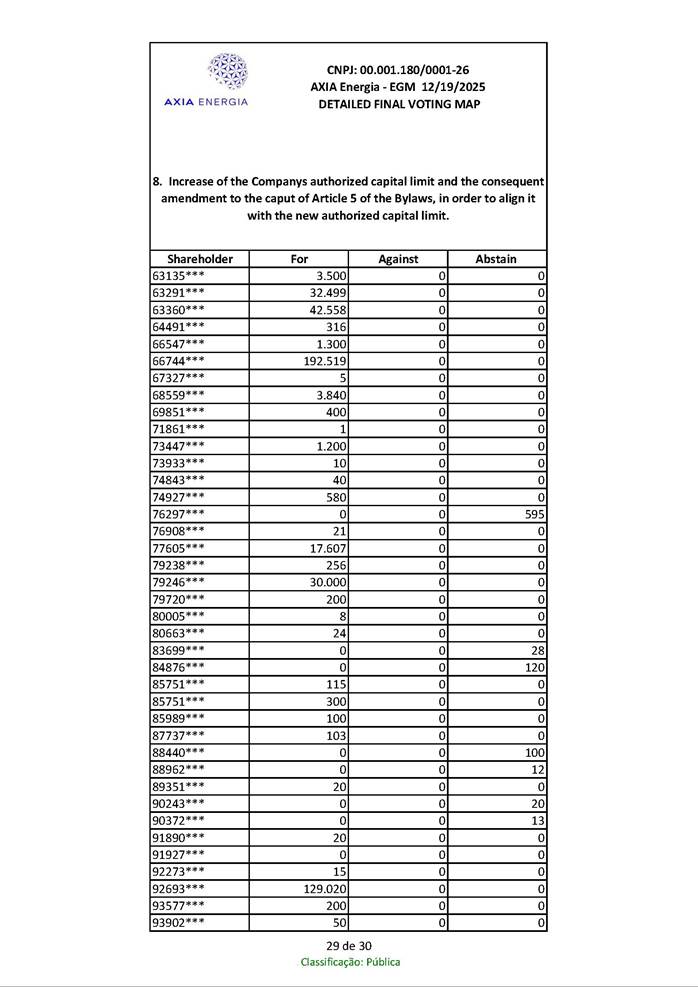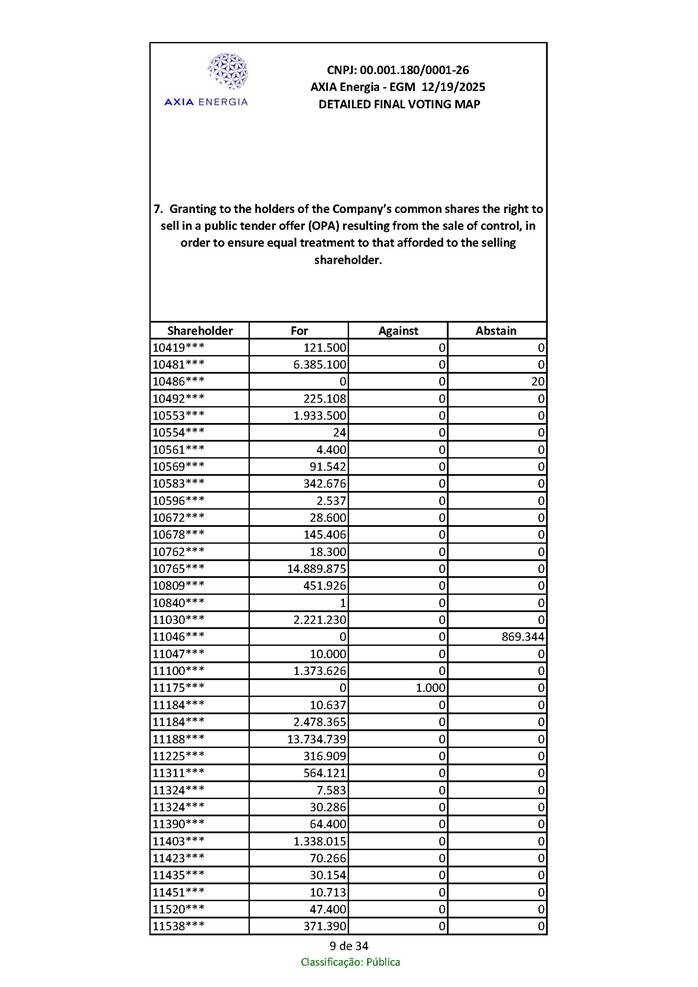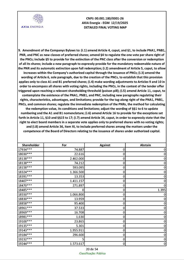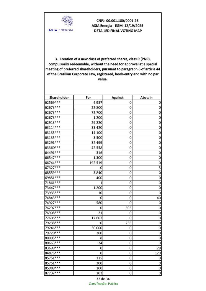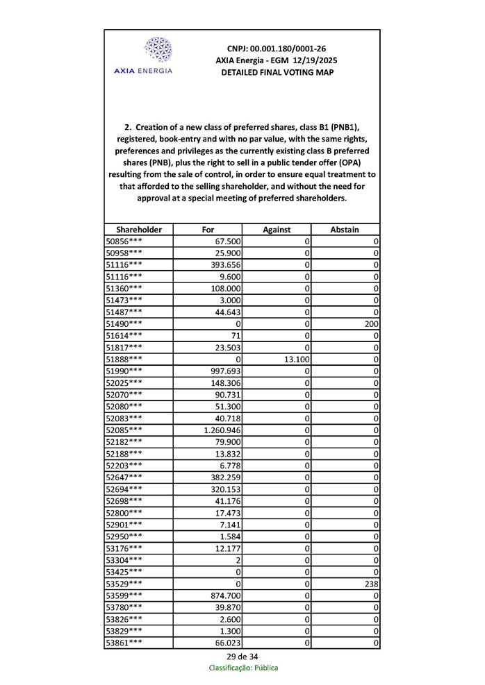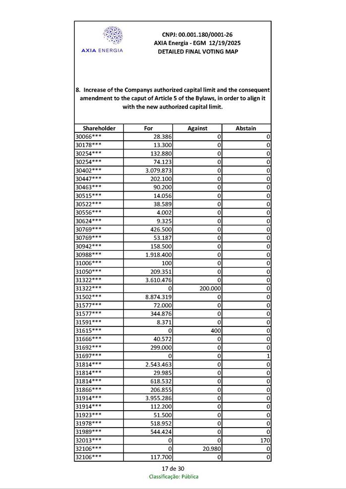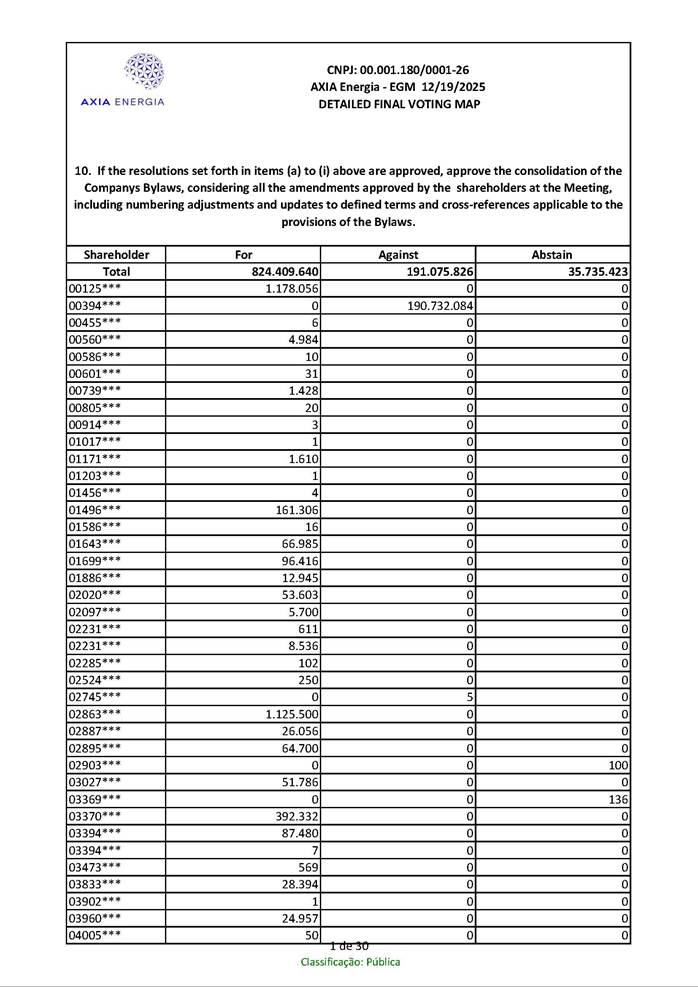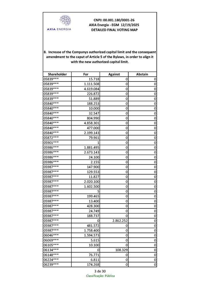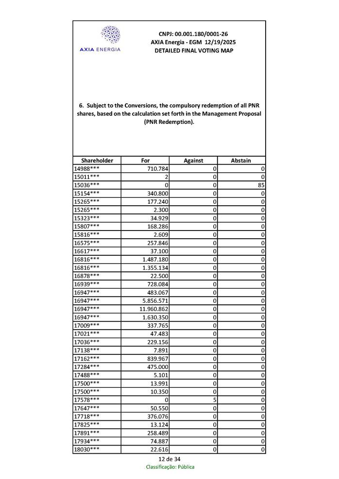 Shareholder For Against Abstain Total 818.181.617 198.176.986 34.862.286 00125*** 1.178.056 0 0 00394*** 0 190.732.084 0 00455*** 6 0 0 00560*** 4.984 0 0 00586*** 10 0 0 00601*** 31 0 0 00739*** 1.428 0 0 00805*** 20 0 0 00914*** 3 0 0 01017*** 1 0 0 01171*** 1.610 0 0 01203*** 1 0 0 01456*** 4 0 0 01496*** 161.306 0 0 01586*** 16 0 0 01643*** 66.985 0 0 01699*** 96.416 0 0 01886*** 12.945 0 0 02020*** 53.603 0 0 02097*** 5.700 0 0 02231*** 611 0 0 02231*** 8.536 0 0 02285*** 102 0 0 02524*** 250 0 0 02745*** 0 5 0 02863*** 1.125.500 0 0 02887*** 26.056 0 0 02895*** 64.700 0 0 02903*** 100 0 0 03027*** 51.786 0 0 03369*** 0 0 136 03370*** 392.332 0 0 03394*** 87.480 0 0 03394*** 7 0 0 1. Creation of a new class of preferred shares, class A1 (PNA1), registered, book-entry and with no par value, with the same rights, preferences and privileges as the currently existing class A preferred shares (PNA), plus the right to sell in a public tender offer (OPA) resulting from the sale of control, in order to ensure equal treatment to that afforded to the selling shareholder, and without the need for approval at a special meeting of holders of preferred shares. CNPJ: 00.001.180/0001-26AXIA Energia - EGM 12/19/2025 DETAILED FINAL VOTING MAP 1 de 34 # Classificação: Pública Shareholder For Against Abstain 1. Creation of a new class of preferred shares, class A1 (PNA1), registered, book-entry and with no par value, with the same rights, preferences and privileges as the currently existing class A preferred shares (PNA), plus the right to sell in a public tender offer (OPA) resulting from the sale of control, in order to ensure equal treatment to that afforded to the selling shareholder, and without the need for approval at a special meeting of holders of preferred shares. CNPJ: 00.001.180/0001-26AXIA Energia - EGM 12/19/2025 DETAILED FINAL VOTING MAP 03473*** 569 0 0 03833*** 28.394 0 0 03902*** 1 0 0 03960*** 24.957 0 0 04005*** 0 50 0 04073*** 292.991 0 0 04297*** 3 0 0 04555*** 0 0 55 04605*** 0 0 200 04609*** 602 0 0 04609*** 1.300 0 0 04616*** 11.687 0 0 04672*** 5 0 0 04709*** 0 1 0 04736*** 28.890 0 0 04751*** 111.059 0 0 04847*** 4 0 0 05075*** 5 0 0 05100*** 43.978 0 0 05147*** 14.000 0 0 05303*** 0 0 1 05316*** 1.030 0 0 05435*** 3 0 0 05448*** 9.727 0 0 05479*** 1.513.900 0 0 05479*** 2.843.378 0 0 05522*** 44 0 0 05589*** 233.315 0 0 05589*** 279.983 0 0 05589*** 28.815 0 0 05719*** 27 0 0 05734*** 415 0 0 05775*** 1.759 0 0 05838*** 15.219 0 0 05839*** 96.081 0 0 2 de 34 # Classificação: Pública Shareholder For Against Abstain 1. Creation of a new class of preferred shares, class A1 (PNA1), registered, book-entry and with no par value, with the same rights, preferences and privileges as the currently existing class A preferred shares (PNA), plus the right to sell in a public tender offer (OPA) resulting from the sale of control, in order to ensure equal treatment to that afforded to the selling shareholder, and without the need for approval at a special meeting of holders of preferred shares. CNPJ: 00.001.180/0001-26AXIA Energia - EGM 12/19/2025 DETAILED FINAL VOTING MAP 05839*** 189.258 0 0 05839*** 718.804 0 0 05839*** 724 0 0 05839*** 775.653 0 0 05839*** 15.200 0 0 05839*** 9.200 0 0 05839*** 803.800 0 0 05839*** 158.291 0 0 05839*** 15.718 0 0 05839*** 0 1.111.508 0 05839*** 4.619.084 0 0 05839*** 226.872 0 0 05839*** 51.889 0 0 05840*** 188.253 0 0 05840*** 10.000 0 0 05840*** 32.547 0 0 05840*** 804.990 0 0 05840*** 4.858.301 0 0 05840*** 477.000 0 0 05840*** 2.199.143 0 0 05872*** 79.961 0 0 05901*** 1 0 0 05986*** 1.881.495 0 0 05986*** 2.673.143 0 0 05986*** 24.100 0 0 05986*** 2.155 0 0 05987*** 147.900 0 0 05987*** 129.553 0 0 05987*** 11.827 0 0 05987*** 2.020.100 0 0 05987*** 1.602.500 0 0 05987*** 5 0 0 05987*** 199.465 0 0 05987*** 13.400 0 0 05987*** 0 428.300 0 3 de 34 # Classificação: Pública Shareholder For Against Abstain 1. Creation of a new class of preferred shares, class A1 (PNA1), registered, book-entry and with no par value, with the same rights, preferences and privileges as the currently existing class A preferred shares (PNA), plus the right to sell in a public tender offer (OPA) resulting from the sale of control, in order to ensure equal treatment to that afforded to the selling shareholder, and without the need for approval at a special meeting of holders of preferred shares. CNPJ: 00.001.180/0001-26AXIA Energia - EGM 12/19/2025 DETAILED FINAL VOTING MAP 05987*** 24.749 0 0 05987*** 188.737 0 0 05987*** 2.862.252 0 0 05987*** 481.572 0 0 05987*** 1.758.400 0 0 06046*** 1.594.573 0 0 06069*** 5.615 0 0 06105*** 10.100 0 0 06134*** 0 108.329 0 06148*** 76.771 0 0 06224*** 6.811 0 0 06239*** 174.268 0 0 06239*** 455.200 0 0 06251*** 9.995 0 0 06318*** 0 0 1 06323*** 530.363 0 0 06370*** 3 0 0 06406*** 0 0 100.000 06491*** 35 0 0 06541*** 284.989 0 0 06571*** 130 0 0 06613*** 77.676 0 0 06832*** 0 23 0 06916*** 622.500 0 0 06943*** 137.641 0 0 06943*** 589.073 0 0 06943*** 922.665 0 0 06949*** 0 0 10 06964*** 298.476 0 0 07023*** 0 0 100 07060*** 239.200 0 0 07086*** 1.000 0 0 07096*** 51.672 0 0 07140*** 0 859.100 0 07140*** 19.426 0 0 4 de 34 # Classificação: Pública Shareholder For Against Abstain 1. Creation of a new class of preferred shares, class A1 (PNA1), registered, book-entry and with no par value, with the same rights, preferences and privileges as the currently existing class A preferred shares (PNA), plus the right to sell in a public tender offer (OPA) resulting from the sale of control, in order to ensure equal treatment to that afforded to the selling shareholder, and without the need for approval at a special meeting of holders of preferred shares. CNPJ: 00.001.180/0001-26AXIA Energia - EGM 12/19/2025 DETAILED FINAL VOTING MAP 07140*** 1.219 0 0 07140*** 26.098 0 0 07187*** 16.269 0 0 07187*** 713 0 0 07191*** 0 857.000 0 07191*** 85.700 0 0 07191*** 105.335 0 0 07226*** 0 0 4 07237*** 589.417 0 0 07237*** 33.388 0 0 07247*** 296