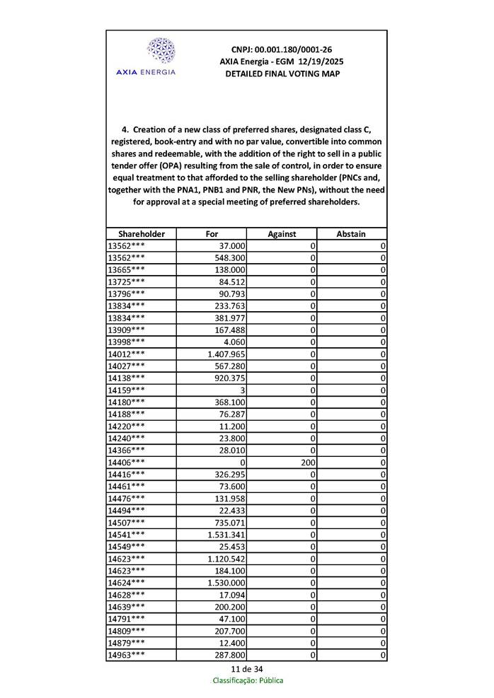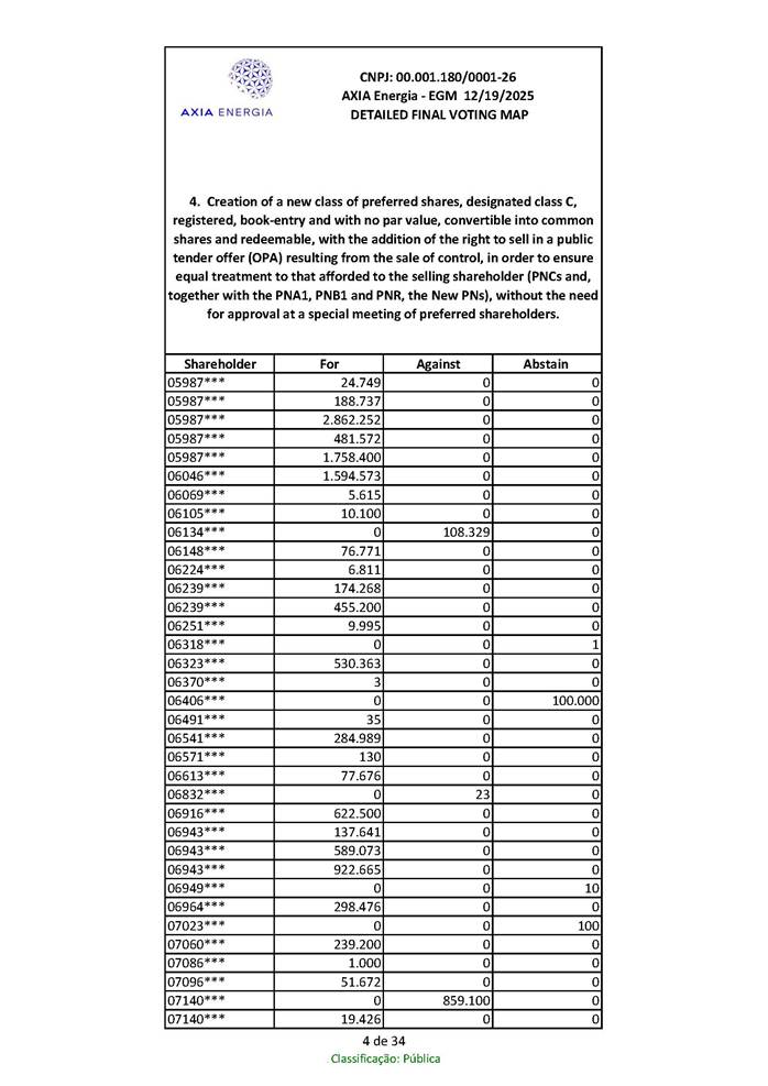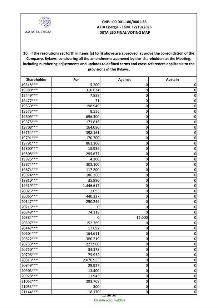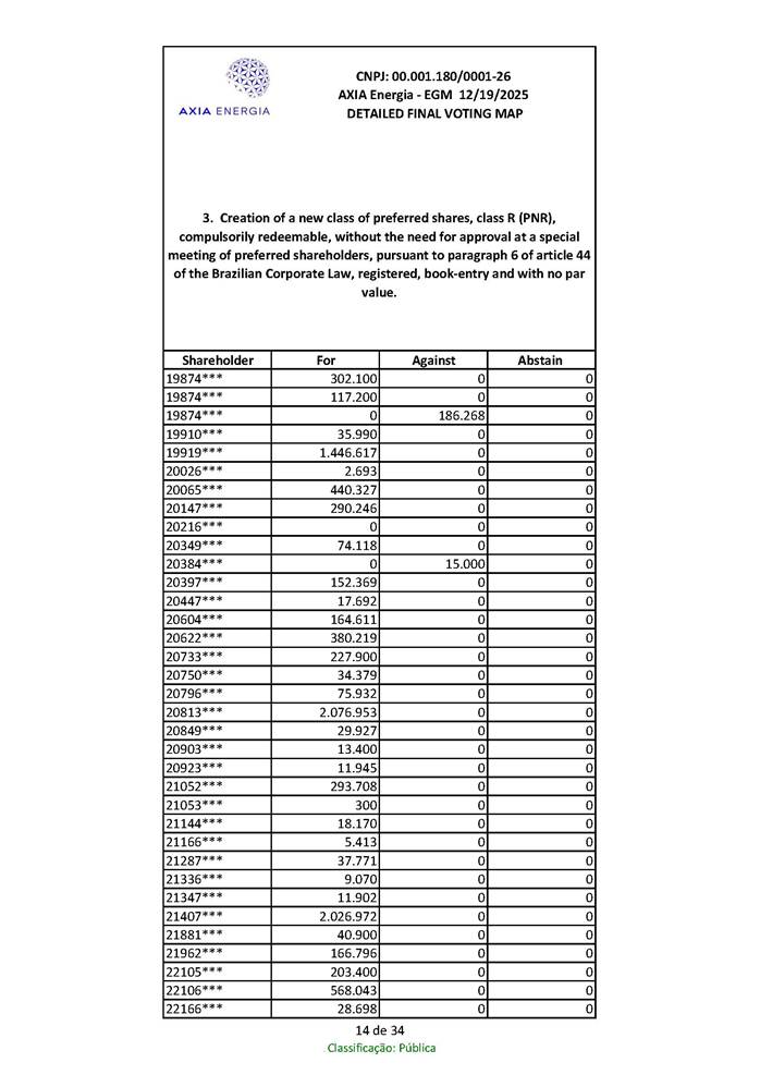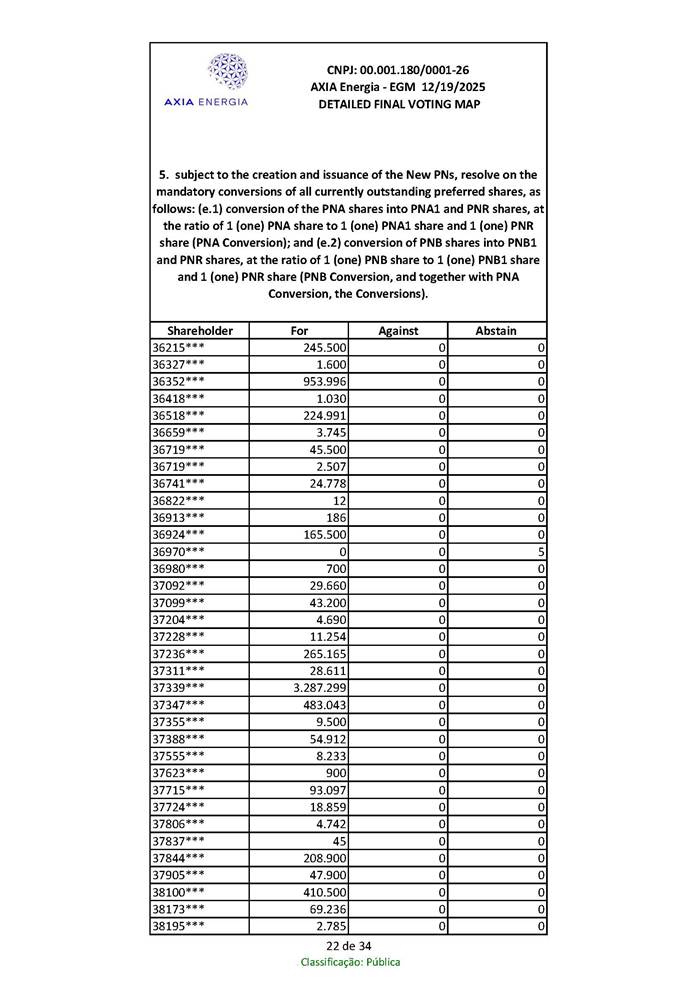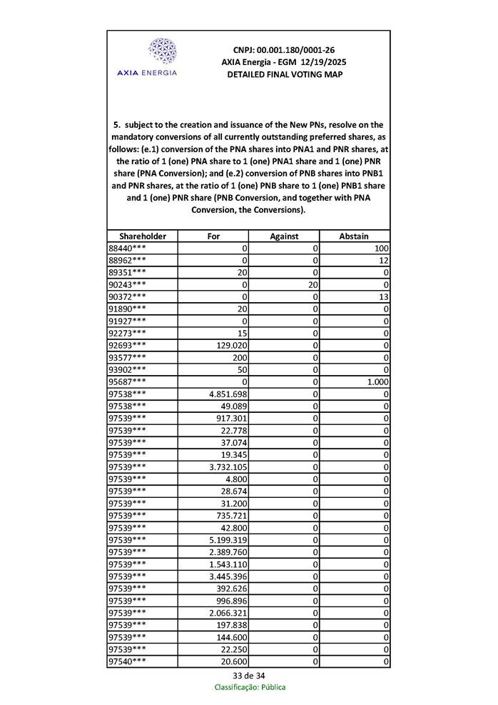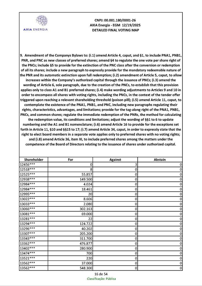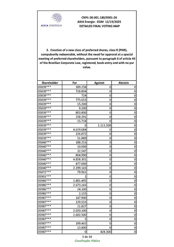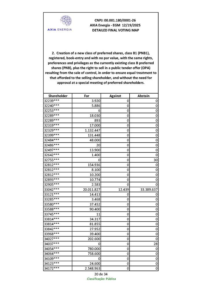 Shareholder For Against Abstain Total 818.181.617 198.176.986 34.862.286 00125*** 1.178.056 0 0 00394*** 0 190.732.084 0 00455*** 6 0 0 00560*** 4.984 0 0 00586*** 10 0 0 00601*** 31 0 0 00739*** 1.428 0 0 00805*** 20 0 0 00914*** 3 0 0 01017*** 1 0 0 01171*** 1.610 0 0 01203*** 1 0 0 01456*** 4 0 0 01496*** 161.306 0 0 01586*** 16 0 0 01643*** 66.985 0 0 01699*** 96.416 0 0 01886*** 12.945 0 0 02020*** 53.603 0 0 02097*** 5.700 0 0 02231*** 611 0 0 02231*** 8.536 0 0 02285*** 102 0 0 02524*** 250 0 0 02745*** 0 5 0 02863*** 1.125.500 0 0 02887*** 26.056 0 0 02895*** 64.700 0 0 02903*** 100 0 0 03027*** 51.786 0 0 03369*** 0 0 136 03370*** 392.332 0 0 03394*** 87.480 0 0 03394*** 7 0 0 1. Creation of a new class of preferred shares, class A1 (PNA1), registered, book-entry and with no par value, with the same rights, preferences and privileges as the currently existing class A preferred shares (PNA), plus the right to sell in a public tender offer (OPA) resulting from the sale of control, in order to ensure equal treatment to that afforded to the selling shareholder, and without the need for approval at a special meeting of holders of preferred shares. CNPJ: 00.001.180/0001-26AXIA Energia - EGM 12/19/2025 DETAILED FINAL VOTING MAP 1 de 34 # Classificação: Pública Shareholder For Against Abstain 1. Creation of a new class of preferred shares, class A1 (PNA1), registered, book-entry and with no par value, with the same rights, preferences and privileges as the currently existing class A preferred shares (PNA), plus the right to sell in a public tender offer (OPA) resulting from the sale of control, in order to ensure equal treatment to that afforded to the selling shareholder, and without the need for approval at a special meeting of holders of preferred shares. CNPJ: 00.001.180/0001-26AXIA Energia - EGM 12/19/2025 DETAILED FINAL VOTING MAP 03473*** 569 0 0 03833*** 28.394 0 0 03902*** 1 0 0 03960*** 24.957 0 0 04005*** 0 50 0 04073*** 292.991 0 0 04297*** 3 0 0 04555*** 0 0 55 04605*** 0 0 200 04609*** 602 0 0 04609*** 1.300 0 0 04616*** 11.687 0 0 04672*** 5 0 0 04709*** 0 1 0 04736*** 28.890 0 0 04751*** 111.059 0 0 04847*** 4 0 0 05075*** 5 0 0 05100*** 43.978 0 0 05147*** 14.000 0 0 05303*** 0 0 1 05316*** 1.030 0 0 05435*** 3 0 0 05448*** 9.727 0 0 05479*** 1.513.900 0 0 05479*** 2.843.378 0 0 05522*** 44 0 0 05589*** 233.315 0 0 05589*** 279.983 0 0 05589*** 28.815 0 0 05719*** 27 0 0 05734*** 415 0 0 05775*** 1.759 0 0 05838*** 15.219 0 0 05839*** 96.081 0 0 2 de 34 # Classificação: Pública Shareholder For Against Abstain 1. Creation of a new class of preferred shares, class A1 (PNA1), registered, book-entry and with no par value, with the same rights, preferences and privileges as the currently existing class A preferred shares (PNA), plus the right to sell in a public tender offer (OPA) resulting from the sale of control, in order to ensure equal treatment to that afforded to the selling shareholder, and without the need for approval at a special meeting of holders of preferred shares. CNPJ: 00.001.180/0001-26AXIA Energia - EGM 12/19/2025 DETAILED FINAL VOTING MAP 05839*** 189.258 0 0 05839*** 718.804 0 0 05839*** 724 0 0 05839*** 775.653 0 0 05839*** 15.200 0 0 05839*** 9.200 0 0 05839*** 803.800 0 0 05839*** 158.291 0 0 05839*** 15.718 0 0 05839*** 0 1.111.508 0 05839*** 4.619.084 0 0 05839*** 226.872 0 0 05839*** 51.889 0 0 05840*** 188.253 0 0 05840*** 10.000 0 0 05840*** 32.547 0 0 05840*** 804.990 0 0 05840*** 4.858.301 0 0 05840*** 477.000 0 0 05840*** 2.199.143 0 0 05872*** 79.961 0 0 05901*** 1 0 0 05986*** 1.881.495 0 0 05986*** 2.673.143 0 0 05986*** 24.100 0 0 05986*** 2.155 0 0 05987*** 147.900 0 0 05987*** 129.553 0 0 05987*** 11.827 0 0 05987*** 2.020.100 0 0 05987*** 1.602.500 0 0 05987*** 5 0 0 05987*** 199.465 0 0 05987*** 13.400 0 0 05987*** 0 428.300 0 3 de 34 # Classificação: Pública Shareholder For Against Abstain 1. Creation of a new class of preferred shares, class A1 (PNA1), registered, book-entry and with no par value, with the same rights, preferences and privileges as the currently existing class A preferred shares (PNA), plus the right to sell in a public tender offer (OPA) resulting from the sale of control, in order to ensure equal treatment to that afforded to the selling shareholder, and without the need for approval at a special meeting of holders of preferred shares. CNPJ: 00.001.180/0001-26AXIA Energia - EGM 12/19/2025 DETAILED FINAL VOTING MAP 05987*** 24.749 0 0 05987*** 188.737 0 0 05987*** 2.862.252 0 0 05987*** 481.572 0 0 05987*** 1.758.400 0 0 06046*** 1.594.573 0 0 06069*** 5.615 0 0 06105*** 10.100 0 0 06134*** 0 108.329 0 06148*** 76.771 0 0 06224*** 6.811 0 0 06239*** 174.268 0 0 06239*** 455.200 0 0 06251*** 9.995 0 0 06318*** 0 0 1 06323*** 530.363 0 0 06370*** 3 0 0 06406*** 0 0 100.000 06491*** 35 0 0 06541*** 284.989 0 0 06571*** 130 0 0 06613*** 77.676 0 0 06832*** 0 23 0 06916*** 622.500 0 0 06943*** 137.641 0 0 06943*** 589.073 0 0 06943*** 922.665 0 0 06949*** 0 0 10 06964*** 298.476 0 0 07023*** 0 0 100 07060*** 239.200 0 0 07086*** 1.000 0 0 07096*** 51.672 0 0 07140*** 0 859.100 0 07140*** 19.426 0 0 4 de 34 # Classificação: Pública Shareholder For Against Abstain 1. Creation of a new class of preferred shares, class A1 (PNA1), registered, book-entry and with no par value, with the same rights, preferences and privileges as the currently existing class A preferred shares (PNA), plus the right to sell in a public tender offer (OPA) resulting from the sale of control, in order to ensure equal treatment to that afforded to the selling shareholder, and without the need for approval at a special meeting of holders of preferred shares. CNPJ: 00.001.180/0001-26AXIA Energia - EGM 12/19/2025 DETAILED FINAL VOTING MAP 07140*** 1.219 0 0 07140*** 26.098 0 0 07187*** 16.269 0 0 07187*** 713 0 0 07191*** 0 857.000 0 07191*** 85.700 0 0 07191*** 105.335 0 0 07226*** 0 0 4 07237*** 589.417 0 0 07237*** 33.388 0 0 07247*** 296