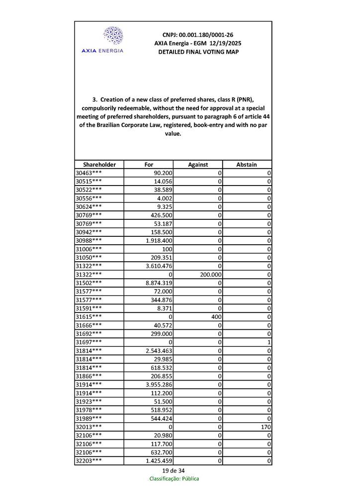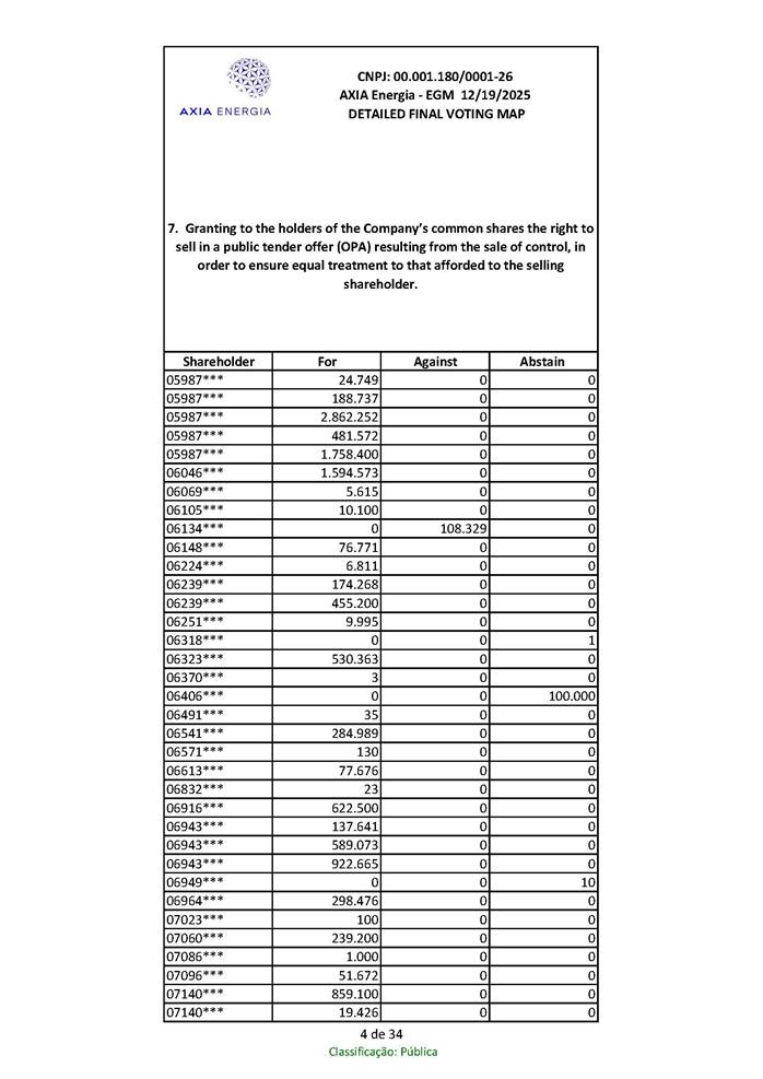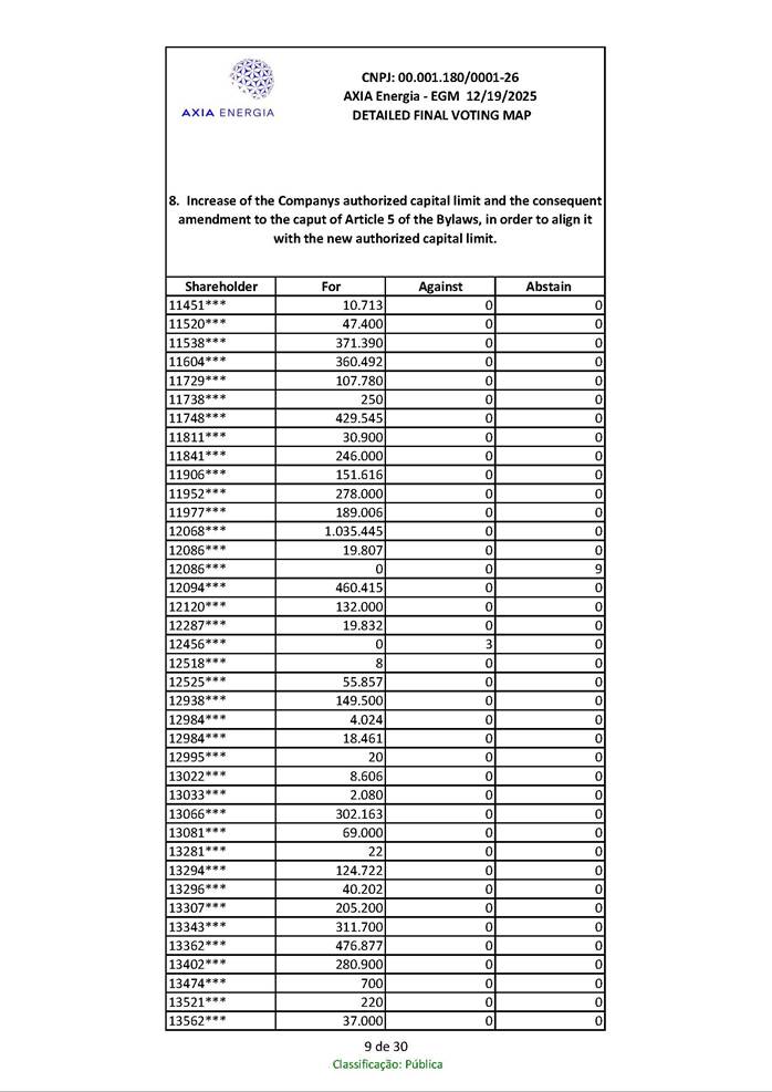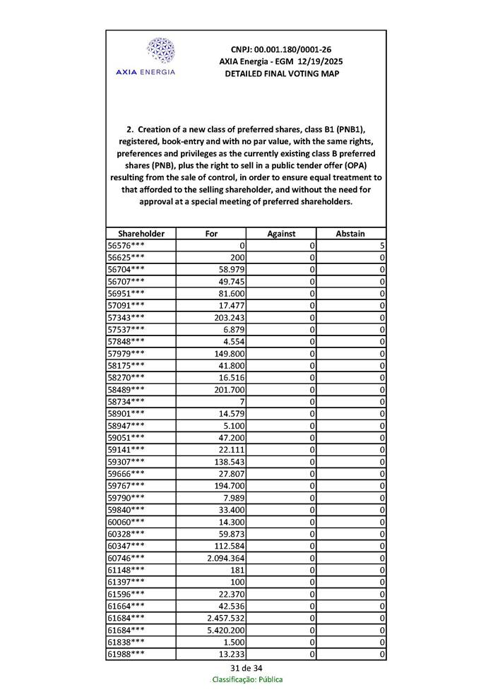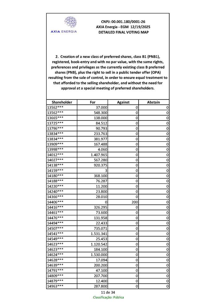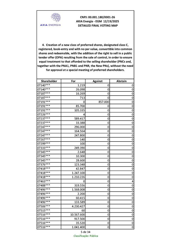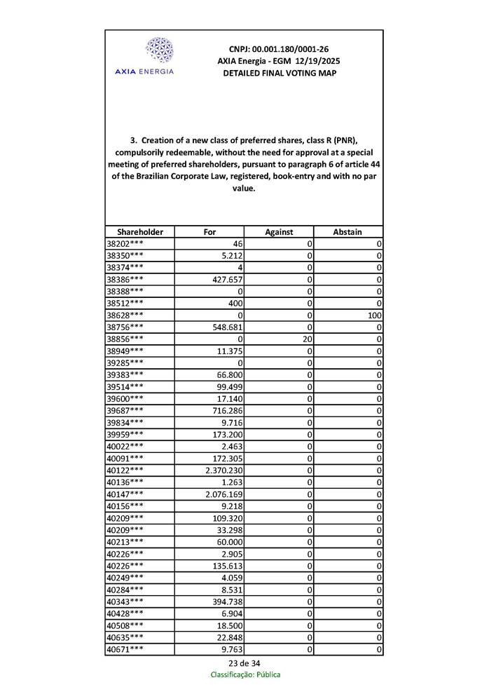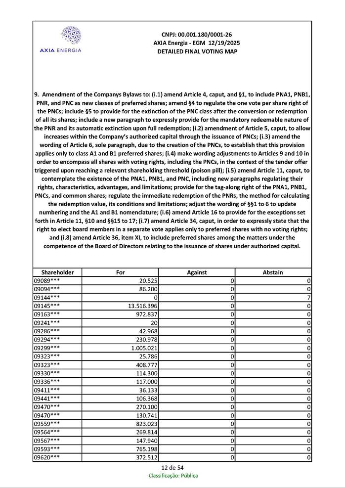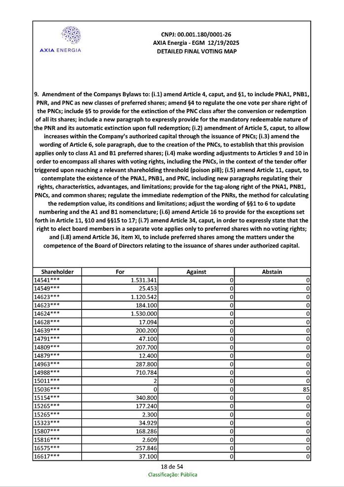 Shareholder For Against Abstain Total 818.181.617 198.176.986 34.862.286 00125*** 1.178.056 0 0 00394*** 0 190.732.084 0 00455*** 6 0 0 00560*** 4.984 0 0 00586*** 10 0 0 00601*** 31 0 0 00739*** 1.428 0 0 00805*** 20 0 0 00914*** 3 0 0 01017*** 1 0 0 01171*** 1.610 0 0 01203*** 1 0 0 01456*** 4 0 0 01496*** 161.306 0 0 01586*** 16 0 0 01643*** 66.985 0 0 01699*** 96.416 0 0 01886*** 12.945 0 0 02020*** 53.603 0 0 02097*** 5.700 0 0 02231*** 611 0 0 02231*** 8.536 0 0 02285*** 102 0 0 02524*** 250 0 0 02745*** 0 5 0 02863*** 1.125.500 0 0 02887*** 26.056 0 0 02895*** 64.700 0 0 02903*** 100 0 0 03027*** 51.786 0 0 03369*** 0 0 136 03370*** 392.332 0 0 03394*** 87.480 0 0 03394*** 7 0 0 1. Creation of a new class of preferred shares, class A1 (PNA1), registered, book-entry and with no par value, with the same rights, preferences and privileges as the currently existing class A preferred shares (PNA), plus the right to sell in a public tender offer (OPA) resulting from the sale of control, in order to ensure equal treatment to that afforded to the selling shareholder, and without the need for approval at a special meeting of holders of preferred shares. CNPJ: 00.001.180/0001-26AXIA Energia - EGM 12/19/2025 DETAILED FINAL VOTING MAP 1 de 34 # Classificação: Pública Shareholder For Against Abstain 1. Creation of a new class of preferred shares, class A1 (PNA1), registered, book-entry and with no par value, with the same rights, preferences and privileges as the currently existing class A preferred shares (PNA), plus the right to sell in a public tender offer (OPA) resulting from the sale of control, in order to ensure equal treatment to that afforded to the selling shareholder, and without the need for approval at a special meeting of holders of preferred shares. CNPJ: 00.001.180/0001-26AXIA Energia - EGM 12/19/2025 DETAILED FINAL VOTING MAP 03473*** 569 0 0 03833*** 28.394 0 0 03902*** 1 0 0 03960*** 24.957 0 0 04005*** 0 50 0 04073*** 292.991 0 0 04297*** 3 0 0 04555*** 0 0 55 04605*** 0 0 200 04609*** 602 0 0 04609*** 1.300 0 0 04616*** 11.687 0 0 04672*** 5 0 0 04709*** 0 1 0 04736*** 28.890 0 0 04751*** 111.059 0 0 04847*** 4 0 0 05075*** 5 0 0 05100*** 43.978 0 0 05147*** 14.000 0 0 05303*** 0 0 1 05316*** 1.030 0 0 05435*** 3 0 0 05448*** 9.727 0 0 05479*** 1.513.900 0 0 05479*** 2.843.378 0 0 05522*** 44 0 0 05589*** 233.315 0 0 05589*** 279.983 0 0 05589*** 28.815 0 0 05719*** 27 0 0 05734*** 415 0 0 05775*** 1.759 0 0 05838*** 15.219 0 0 05839*** 96.081 0 0 2 de 34 # Classificação: Pública Shareholder For Against Abstain 1. Creation of a new class of preferred shares, class A1 (PNA1), registered, book-entry and with no par value, with the same rights, preferences and privileges as the currently existing class A preferred shares (PNA), plus the right to sell in a public tender offer (OPA) resulting from the sale of control, in order to ensure equal treatment to that afforded to the selling shareholder, and without the need for approval at a special meeting of holders of preferred shares. CNPJ: 00.001.180/0001-26AXIA Energia - EGM 12/19/2025 DETAILED FINAL VOTING MAP 05839*** 189.258 0 0 05839*** 718.804 0 0 05839*** 724 0 0 05839*** 775.653 0 0 05839*** 15.200 0 0 05839*** 9.200 0 0 05839*** 803.800 0 0 05839*** 158.291 0 0 05839*** 15.718 0 0 05839*** 0 1.111.508 0 05839*** 4.619.084 0 0 05839*** 226.872 0 0 05839*** 51.889 0 0 05840*** 188.253 0 0 05840*** 10.000 0 0 05840*** 32.547 0 0 05840*** 804.990 0 0 05840*** 4.858.301 0 0 05840*** 477.000 0 0 05840*** 2.199.143 0 0 05872*** 79.961 0 0 05901*** 1 0 0 05986*** 1.881.495 0 0 05986*** 2.673.143 0 0 05986*** 24.100 0 0 05986*** 2.155 0 0 05987*** 147.900 0 0 05987*** 129.553 0 0 05987*** 11.827 0 0 05987*** 2.020.100 0 0 05987*** 1.602.500 0 0 05987*** 5 0 0 05987*** 199.465 0 0 05987*** 13.400 0 0 05987*** 0 428.300 0 3 de 34 # Classificação: Pública Shareholder For Against Abstain 1. Creation of a new class of preferred shares, class A1 (PNA1), registered, book-entry and with no par value, with the same rights, preferences and privileges as the currently existing class A preferred shares (PNA), plus the right to sell in a public tender offer (OPA) resulting from the sale of control, in order to ensure equal treatment to that afforded to the selling shareholder, and without the need for approval at a special meeting of holders of preferred shares. CNPJ: 00.001.180/0001-26AXIA Energia - EGM 12/19/2025 DETAILED FINAL VOTING MAP 05987*** 24.749 0 0 05987*** 188.737 0 0 05987*** 2.862.252 0 0 05987*** 481.572 0 0 05987*** 1.758.400 0 0 06046*** 1.594.573 0 0 06069*** 5.615 0 0 06105*** 10.100 0 0 06134*** 0 108.329 0 06148*** 76.771 0 0 06224*** 6.811 0 0 06239*** 174.268 0 0 06239*** 455.200 0 0 06251*** 9.995 0 0 06318*** 0 0 1 06323*** 530.363 0 0 06370*** 3 0 0 06406*** 0 0 100.000 06491*** 35 0 0 06541*** 284.989 0 0 06571*** 130 0 0 06613*** 77.676 0 0 06832*** 0 23 0 06916*** 622.500 0 0 06943*** 137.641 0 0 06943*** 589.073 0 0 06943*** 922.665 0 0 06949*** 0 0 10 06964*** 298.476 0 0 07023*** 0 0 100 07060*** 239.200 0 0 07086*** 1.000 0 0 07096*** 51.672 0 0 07140*** 0 859.100 0 07140*** 19.426 0 0 4 de 34 # Classificação: Pública Shareholder For Against Abstain 1. Creation of a new class of preferred shares, class A1 (PNA1), registered, book-entry and with no par value, with the same rights, preferences and privileges as the currently existing class A preferred shares (PNA), plus the right to sell in a public tender offer (OPA) resulting from the sale of control, in order to ensure equal treatment to that afforded to the selling shareholder, and without the need for approval at a special meeting of holders of preferred shares. CNPJ: 00.001.180/0001-26AXIA Energia - EGM 12/19/2025 DETAILED FINAL VOTING MAP 07140*** 1.219 0 0 07140*** 26.098 0 0 07187*** 16.269 0 0 07187*** 713 0 0 07191*** 0 857.000 0 07191*** 85.700 0 0 07191*** 105.335 0 0 07226*** 0 0 4 07237*** 589.417 0 0 07237*** 33.388 0 0 07247*** 296
