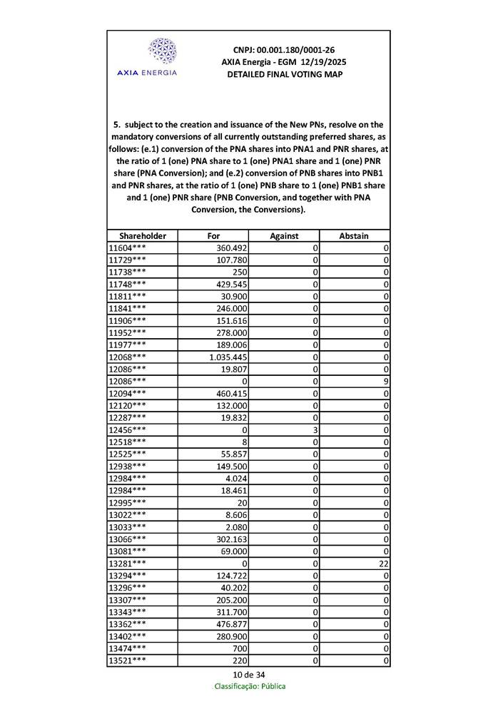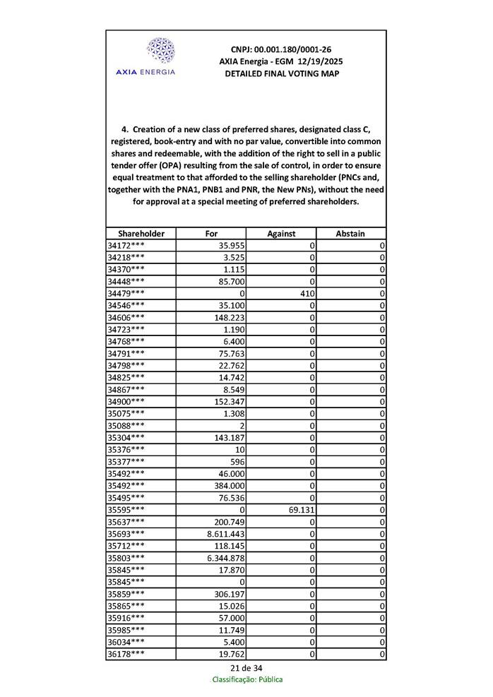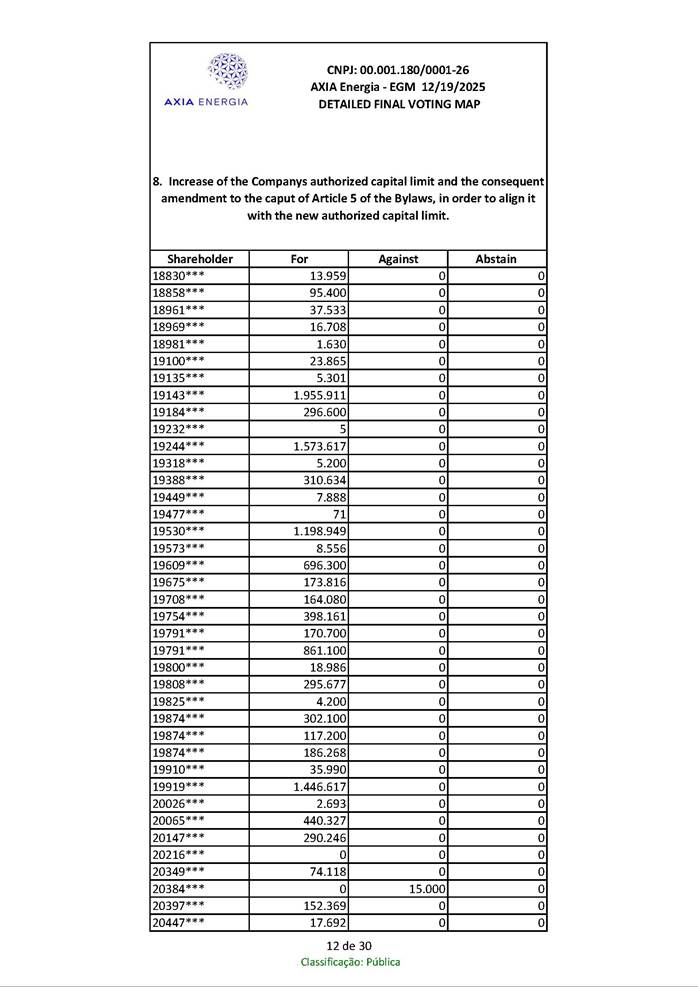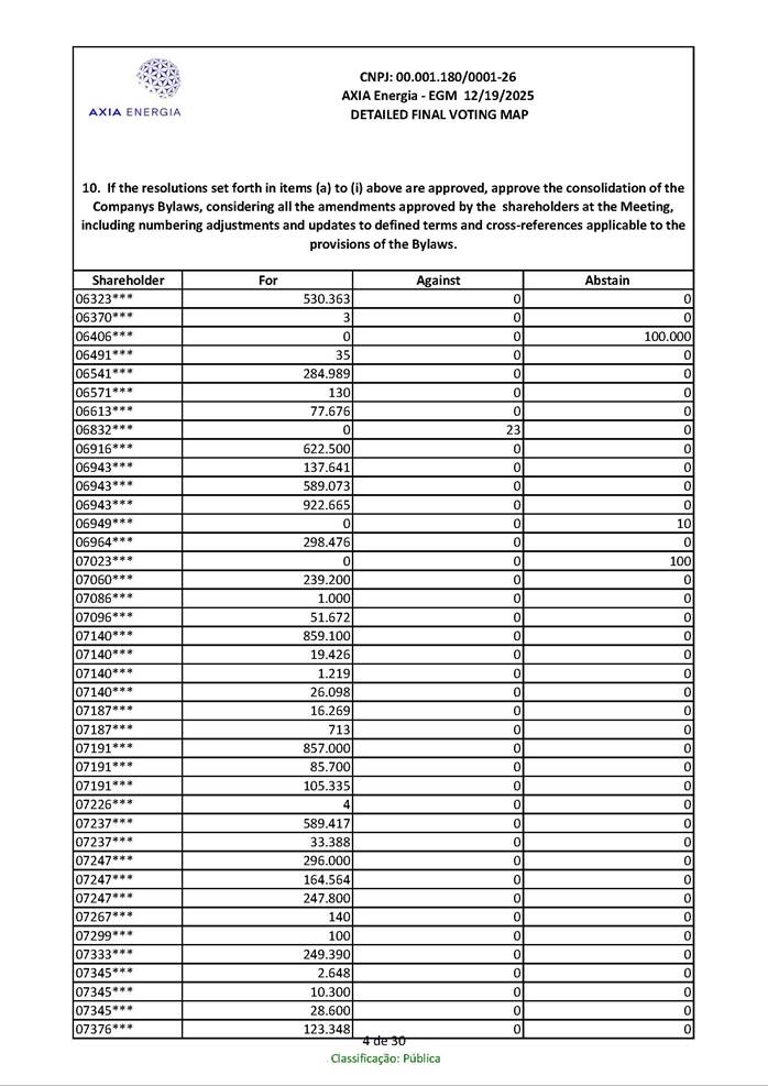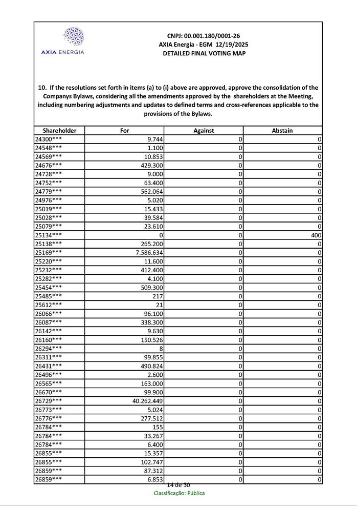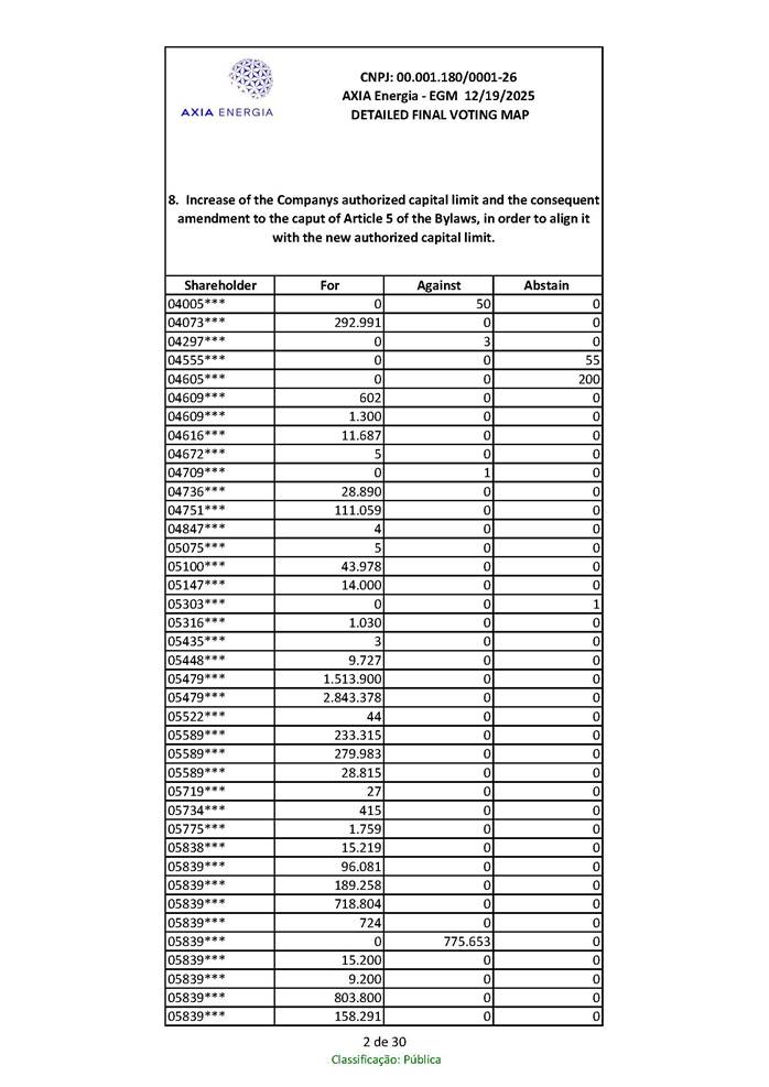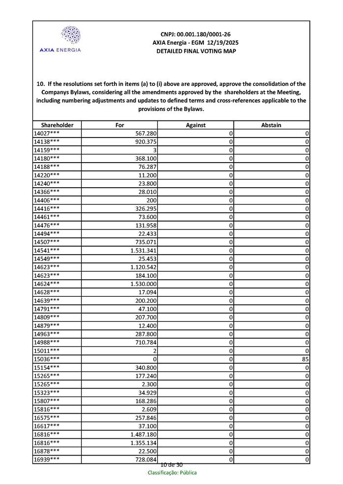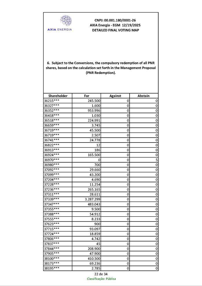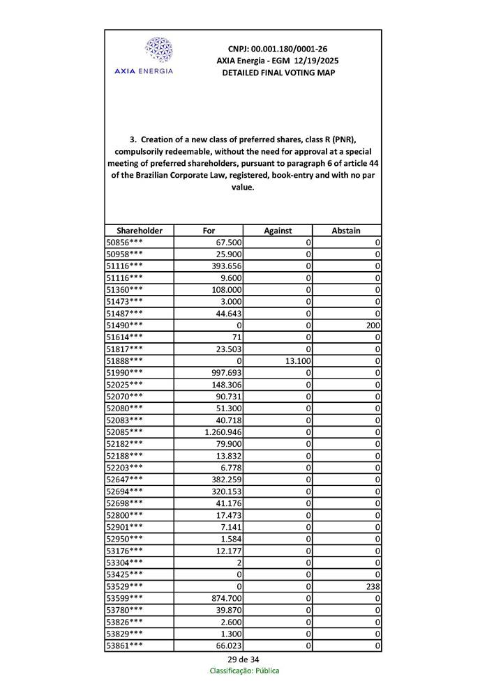 Shareholder For Against Abstain Total 818.181.617 198.176.986 34.862.286 00125*** 1.178.056 0 0 00394*** 0 190.732.084 0 00455*** 6 0 0 00560*** 4.984 0 0 00586*** 10 0 0 00601*** 31 0 0 00739*** 1.428 0 0 00805*** 20 0 0 00914*** 3 0 0 01017*** 1 0 0 01171*** 1.610 0 0 01203*** 1 0 0 01456*** 4 0 0 01496*** 161.306 0 0 01586*** 16 0 0 01643*** 66.985 0 0 01699*** 96.416 0 0 01886*** 12.945 0 0 02020*** 53.603 0 0 02097*** 5.700 0 0 02231*** 611 0 0 02231*** 8.536 0 0 02285*** 102 0 0 02524*** 250 0 0 02745*** 0 5 0 02863*** 1.125.500 0 0 02887*** 26.056 0 0 02895*** 64.700 0 0 02903*** 100 0 0 03027*** 51.786 0 0 03369*** 0 0 136 03370*** 392.332 0 0 03394*** 87.480 0 0 03394*** 7 0 0 1. Creation of a new class of preferred shares, class A1 (PNA1), registered, book-entry and with no par value, with the same rights, preferences and privileges as the currently existing class A preferred shares (PNA), plus the right to sell in a public tender offer (OPA) resulting from the sale of control, in order to ensure equal treatment to that afforded to the selling shareholder, and without the need for approval at a special meeting of holders of preferred shares. CNPJ: 00.001.180/0001-26AXIA Energia - EGM 12/19/2025 DETAILED FINAL VOTING MAP 1 de 34 # Classificação: Pública Shareholder For Against Abstain 1. Creation of a new class of preferred shares, class A1 (PNA1), registered, book-entry and with no par value, with the same rights, preferences and privileges as the currently existing class A preferred shares (PNA), plus the right to sell in a public tender offer (OPA) resulting from the sale of control, in order to ensure equal treatment to that afforded to the selling shareholder, and without the need for approval at a special meeting of holders of preferred shares. CNPJ: 00.001.180/0001-26AXIA Energia - EGM 12/19/2025 DETAILED FINAL VOTING MAP 03473*** 569 0 0 03833*** 28.394 0 0 03902*** 1 0 0 03960*** 24.957 0 0 04005*** 0 50 0 04073*** 292.991 0 0 04297*** 3 0 0 04555*** 0 0 55 04605*** 0 0 200 04609*** 602 0 0 04609*** 1.300 0 0 04616*** 11.687 0 0 04672*** 5 0 0 04709*** 0 1 0 04736*** 28.890 0 0 04751*** 111.059 0 0 04847*** 4 0 0 05075*** 5 0 0 05100*** 43.978 0 0 05147*** 14.000 0 0 05303*** 0 0 1 05316*** 1.030 0 0 05435*** 3 0 0 05448*** 9.727 0 0 05479*** 1.513.900 0 0 05479*** 2.843.378 0 0 05522*** 44 0 0 05589*** 233.315 0 0 05589*** 279.983 0 0 05589*** 28.815 0 0 05719*** 27 0 0 05734*** 415 0 0 05775*** 1.759 0 0 05838*** 15.219 0 0 05839*** 96.081 0 0 2 de 34 # Classificação: Pública Shareholder For Against Abstain 1. Creation of a new class of preferred shares, class A1 (PNA1), registered, book-entry and with no par value, with the same rights, preferences and privileges as the currently existing class A preferred shares (PNA), plus the right to sell in a public tender offer (OPA) resulting from the sale of control, in order to ensure equal treatment to that afforded to the selling shareholder, and without the need for approval at a special meeting of holders of preferred shares. CNPJ: 00.001.180/0001-26AXIA Energia - EGM 12/19/2025 DETAILED FINAL VOTING MAP 05839*** 189.258 0 0 05839*** 718.804 0 0 05839*** 724 0 0 05839*** 775.653 0 0 05839*** 15.200 0 0 05839*** 9.200 0 0 05839*** 803.800 0 0 05839*** 158.291 0 0 05839*** 15.718 0 0 05839*** 0 1.111.508 0 05839*** 4.619.084 0 0 05839*** 226.872 0 0 05839*** 51.889 0 0 05840*** 188.253 0 0 05840*** 10.000 0 0 05840*** 32.547 0 0 05840*** 804.990 0 0 05840*** 4.858.301 0 0 05840*** 477.000 0 0 05840*** 2.199.143 0 0 05872*** 79.961 0 0 05901*** 1 0 0 05986*** 1.881.495 0 0 05986*** 2.673.143 0 0 05986*** 24.100 0 0 05986*** 2.155 0 0 05987*** 147.900 0 0 05987*** 129.553 0 0 05987*** 11.827 0 0 05987*** 2.020.100 0 0 05987*** 1.602.500 0 0 05987*** 5 0 0 05987*** 199.465 0 0 05987*** 13.400 0 0 05987*** 0 428.300 0 3 de 34 # Classificação: Pública Shareholder For Against Abstain 1. Creation of a new class of preferred shares, class A1 (PNA1), registered, book-entry and with no par value, with the same rights, preferences and privileges as the currently existing class A preferred shares (PNA), plus the right to sell in a public tender offer (OPA) resulting from the sale of control, in order to ensure equal treatment to that afforded to the selling shareholder, and without the need for approval at a special meeting of holders of preferred shares. CNPJ: 00.001.180/0001-26AXIA Energia - EGM 12/19/2025 DETAILED FINAL VOTING MAP 05987*** 24.749 0 0 05987*** 188.737 0 0 05987*** 2.862.252 0 0 05987*** 481.572 0 0 05987*** 1.758.400 0 0 06046*** 1.594.573 0 0 06069*** 5.615 0 0 06105*** 10.100 0 0 06134*** 0 108.329 0 06148*** 76.771 0 0 06224*** 6.811 0 0 06239*** 174.268 0 0 06239*** 455.200 0 0 06251*** 9.995 0 0 06318*** 0 0 1 06323*** 530.363 0 0 06370*** 3 0 0 06406*** 0 0 100.000 06491*** 35 0 0 06541*** 284.989 0 0 06571*** 130 0 0 06613*** 77.676 0 0 06832*** 0 23 0 06916*** 622.500 0 0 06943*** 137.641 0 0 06943*** 589.073 0 0 06943*** 922.665 0 0 06949*** 0 0 10 06964*** 298.476 0 0 07023*** 0 0 100 07060*** 239.200 0 0 07086*** 1.000 0 0 07096*** 51.672 0 0 07140*** 0 859.100 0 07140*** 19.426 0 0 4 de 34 # Classificação: Pública Shareholder For Against Abstain 1. Creation of a new class of preferred shares, class A1 (PNA1), registered, book-entry and with no par value, with the same rights, preferences and privileges as the currently existing class A preferred shares (PNA), plus the right to sell in a public tender offer (OPA) resulting from the sale of control, in order to ensure equal treatment to that afforded to the selling shareholder, and without the need for approval at a special meeting of holders of preferred shares. CNPJ: 00.001.180/0001-26AXIA Energia - EGM 12/19/2025 DETAILED FINAL VOTING MAP 07140*** 1.219 0 0 07140*** 26.098 0 0 07187*** 16.269 0 0 07187*** 713 0 0 07191*** 0 857.000 0 07191*** 85.700 0 0 07191*** 105.335 0 0 07226*** 0 0 4 07237*** 589.417 0 0 07237*** 33.388 0 0 07247*** 296