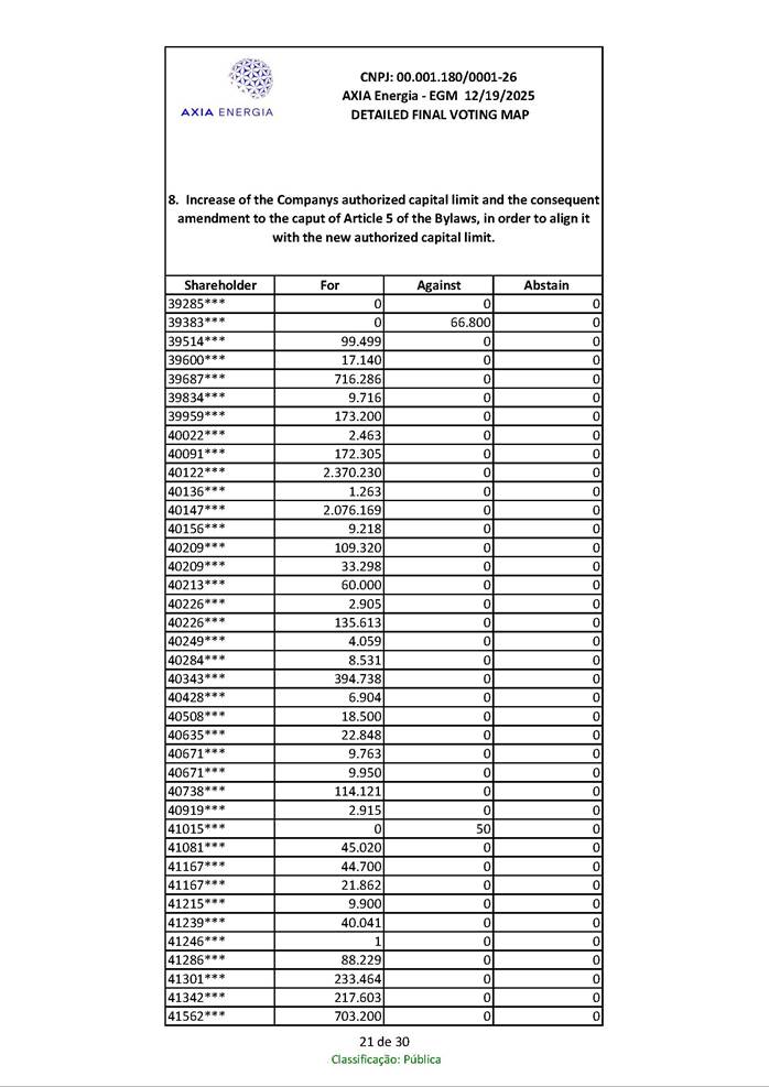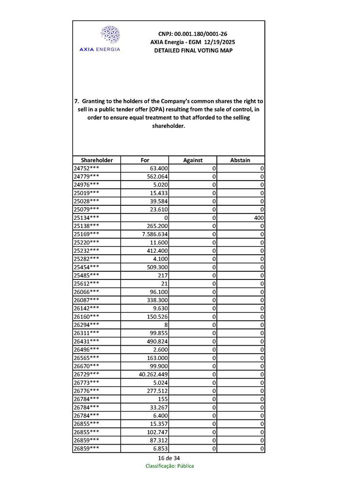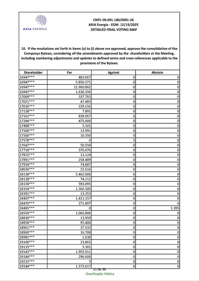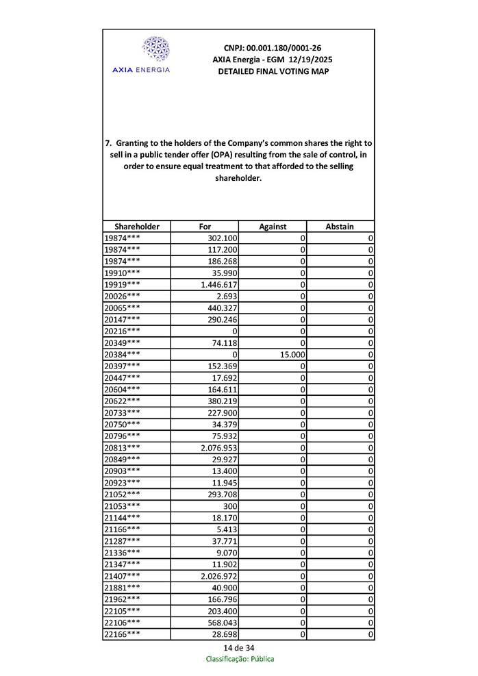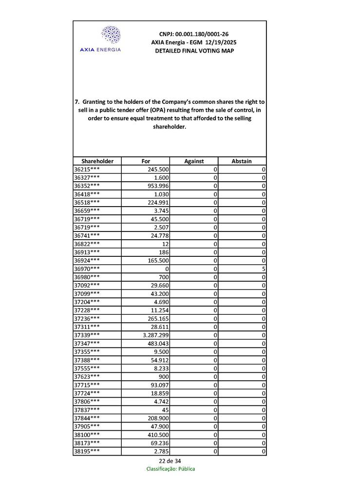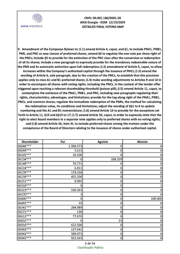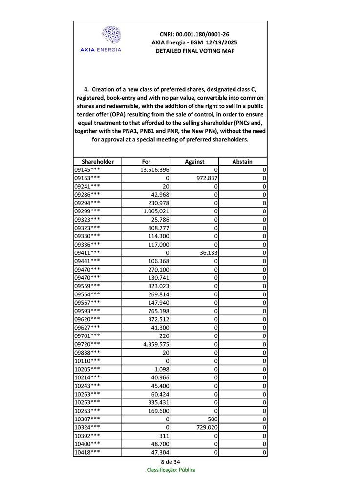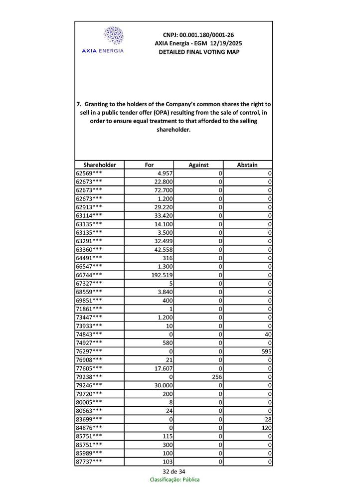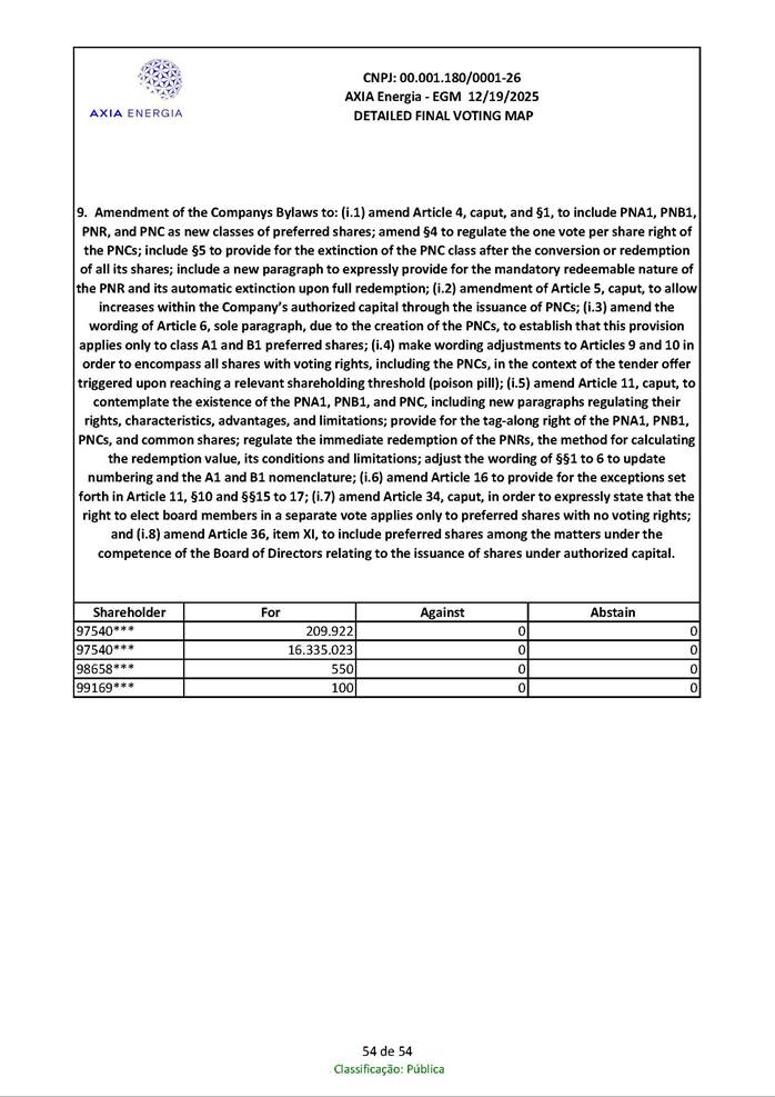 Shareholder For Against Abstain Total 818.181.617 198.176.986 34.862.286 00125*** 1.178.056 0 0 00394*** 0 190.732.084 0 00455*** 6 0 0 00560*** 4.984 0 0 00586*** 10 0 0 00601*** 31 0 0 00739*** 1.428 0 0 00805*** 20 0 0 00914*** 3 0 0 01017*** 1 0 0 01171*** 1.610 0 0 01203*** 1 0 0 01456*** 4 0 0 01496*** 161.306 0 0 01586*** 16 0 0 01643*** 66.985 0 0 01699*** 96.416 0 0 01886*** 12.945 0 0 02020*** 53.603 0 0 02097*** 5.700 0 0 02231*** 611 0 0 02231*** 8.536 0 0 02285*** 102 0 0 02524*** 250 0 0 02745*** 0 5 0 02863*** 1.125.500 0 0 02887*** 26.056 0 0 02895*** 64.700 0 0 02903*** 100 0 0 03027*** 51.786 0 0 03369*** 0 0 136 03370*** 392.332 0 0 03394*** 87.480 0 0 03394*** 7 0 0 1. Creation of a new class of preferred shares, class A1 (PNA1), registered, book-entry and with no par value, with the same rights, preferences and privileges as the currently existing class A preferred shares (PNA), plus the right to sell in a public tender offer (OPA) resulting from the sale of control, in order to ensure equal treatment to that afforded to the selling shareholder, and without the need for approval at a special meeting of holders of preferred shares. CNPJ: 00.001.180/0001-26AXIA Energia - EGM 12/19/2025 DETAILED FINAL VOTING MAP 1 de 34 # Classificação: Pública Shareholder For Against Abstain 1. Creation of a new class of preferred shares, class A1 (PNA1), registered, book-entry and with no par value, with the same rights, preferences and privileges as the currently existing class A preferred shares (PNA), plus the right to sell in a public tender offer (OPA) resulting from the sale of control, in order to ensure equal treatment to that afforded to the selling shareholder, and without the need for approval at a special meeting of holders of preferred shares. CNPJ: 00.001.180/0001-26AXIA Energia - EGM 12/19/2025 DETAILED FINAL VOTING MAP 03473*** 569 0 0 03833*** 28.394 0 0 03902*** 1 0 0 03960*** 24.957 0 0 04005*** 0 50 0 04073*** 292.991 0 0 04297*** 3 0 0 04555*** 0 0 55 04605*** 0 0 200 04609*** 602 0 0 04609*** 1.300 0 0 04616*** 11.687 0 0 04672*** 5 0 0 04709*** 0 1 0 04736*** 28.890 0 0 04751*** 111.059 0 0 04847*** 4 0 0 05075*** 5 0 0 05100*** 43.978 0 0 05147*** 14.000 0 0 05303*** 0 0 1 05316*** 1.030 0 0 05435*** 3 0 0 05448*** 9.727 0 0 05479*** 1.513.900 0 0 05479*** 2.843.378 0 0 05522*** 44 0 0 05589*** 233.315 0 0 05589*** 279.983 0 0 05589*** 28.815 0 0 05719*** 27 0 0 05734*** 415 0 0 05775*** 1.759 0 0 05838*** 15.219 0 0 05839*** 96.081 0 0 2 de 34 # Classificação: Pública Shareholder For Against Abstain 1. Creation of a new class of preferred shares, class A1 (PNA1), registered, book-entry and with no par value, with the same rights, preferences and privileges as the currently existing class A preferred shares (PNA), plus the right to sell in a public tender offer (OPA) resulting from the sale of control, in order to ensure equal treatment to that afforded to the selling shareholder, and without the need for approval at a special meeting of holders of preferred shares. CNPJ: 00.001.180/0001-26AXIA Energia - EGM 12/19/2025 DETAILED FINAL VOTING MAP 05839*** 189.258 0 0 05839*** 718.804 0 0 05839*** 724 0 0 05839*** 775.653 0 0 05839*** 15.200 0 0 05839*** 9.200 0 0 05839*** 803.800 0 0 05839*** 158.291 0 0 05839*** 15.718 0 0 05839*** 0 1.111.508 0 05839*** 4.619.084 0 0 05839*** 226.872 0 0 05839*** 51.889 0 0 05840*** 188.253 0 0 05840*** 10.000 0 0 05840*** 32.547 0 0 05840*** 804.990 0 0 05840*** 4.858.301 0 0 05840*** 477.000 0 0 05840*** 2.199.143 0 0 05872*** 79.961 0 0 05901*** 1 0 0 05986*** 1.881.495 0 0 05986*** 2.673.143 0 0 05986*** 24.100 0 0 05986*** 2.155 0 0 05987*** 147.900 0 0 05987*** 129.553 0 0 05987*** 11.827 0 0 05987*** 2.020.100 0 0 05987*** 1.602.500 0 0 05987*** 5 0 0 05987*** 199.465 0 0 05987*** 13.400 0 0 05987*** 0 428.300 0 3 de 34 # Classificação: Pública Shareholder For Against Abstain 1. Creation of a new class of preferred shares, class A1 (PNA1), registered, book-entry and with no par value, with the same rights, preferences and privileges as the currently existing class A preferred shares (PNA), plus the right to sell in a public tender offer (OPA) resulting from the sale of control, in order to ensure equal treatment to that afforded to the selling shareholder, and without the need for approval at a special meeting of holders of preferred shares. CNPJ: 00.001.180/0001-26AXIA Energia - EGM 12/19/2025 DETAILED FINAL VOTING MAP 05987*** 24.749 0 0 05987*** 188.737 0 0 05987*** 2.862.252 0 0 05987*** 481.572 0 0 05987*** 1.758.400 0 0 06046*** 1.594.573 0 0 06069*** 5.615 0 0 06105*** 10.100 0 0 06134*** 0 108.329 0 06148*** 76.771 0 0 06224*** 6.811 0 0 06239*** 174.268 0 0 06239*** 455.200 0 0 06251*** 9.995 0 0 06318*** 0 0 1 06323*** 530.363 0 0 06370*** 3 0 0 06406*** 0 0 100.000 06491*** 35 0 0 06541*** 284.989 0 0 06571*** 130 0 0 06613*** 77.676 0 0 06832*** 0 23 0 06916*** 622.500 0 0 06943*** 137.641 0 0 06943*** 589.073 0 0 06943*** 922.665 0 0 06949*** 0 0 10 06964*** 298.476 0 0 07023*** 0 0 100 07060*** 239.200 0 0 07086*** 1.000 0 0 07096*** 51.672 0 0 07140*** 0 859.100 0 07140*** 19.426 0 0 4 de 34 # Classificação: Pública Shareholder For Against Abstain 1. Creation of a new class of preferred shares, class A1 (PNA1), registered, book-entry and with no par value, with the same rights, preferences and privileges as the currently existing class A preferred shares (PNA), plus the right to sell in a public tender offer (OPA) resulting from the sale of control, in order to ensure equal treatment to that afforded to the selling shareholder, and without the need for approval at a special meeting of holders of preferred shares. CNPJ: 00.001.180/0001-26AXIA Energia - EGM 12/19/2025 DETAILED FINAL VOTING MAP 07140*** 1.219 0 0 07140*** 26.098 0 0 07187*** 16.269 0 0 07187*** 713 0 0 07191*** 0 857.000 0 07191*** 85.700 0 0 07191*** 105.335 0 0 07226*** 0 0 4 07237*** 589.417 0 0 07237*** 33.388 0 0 07247*** 296
