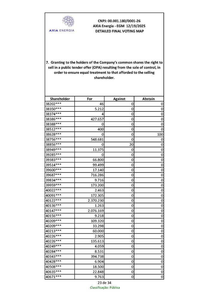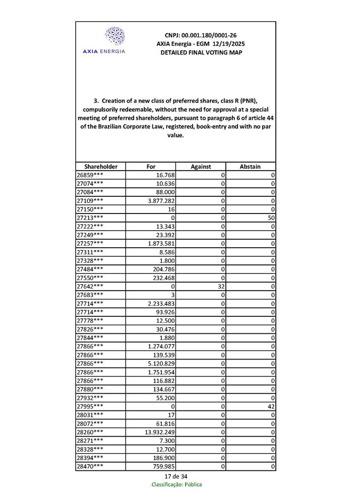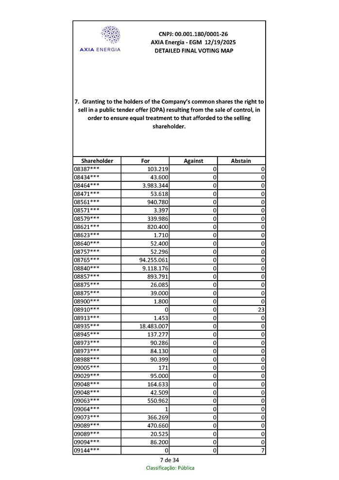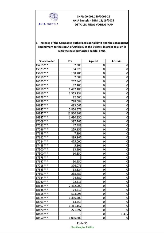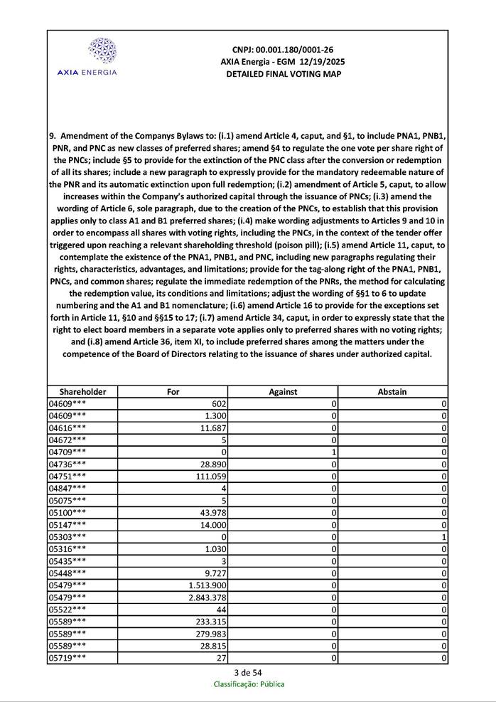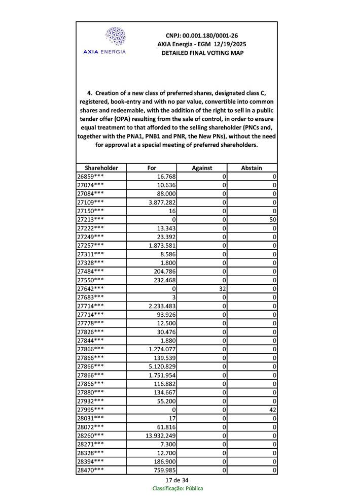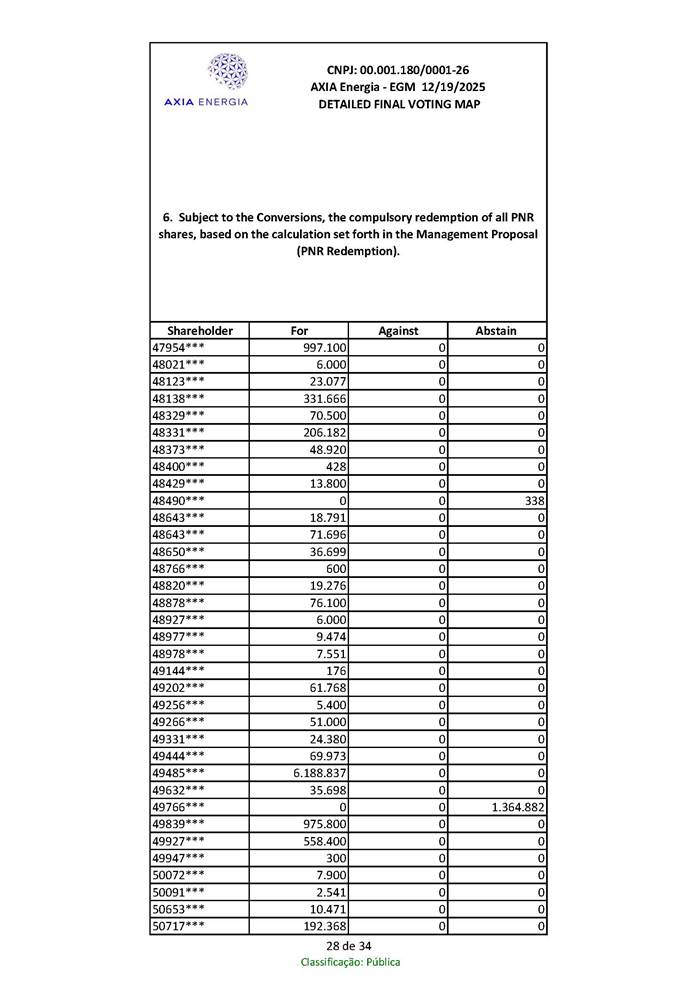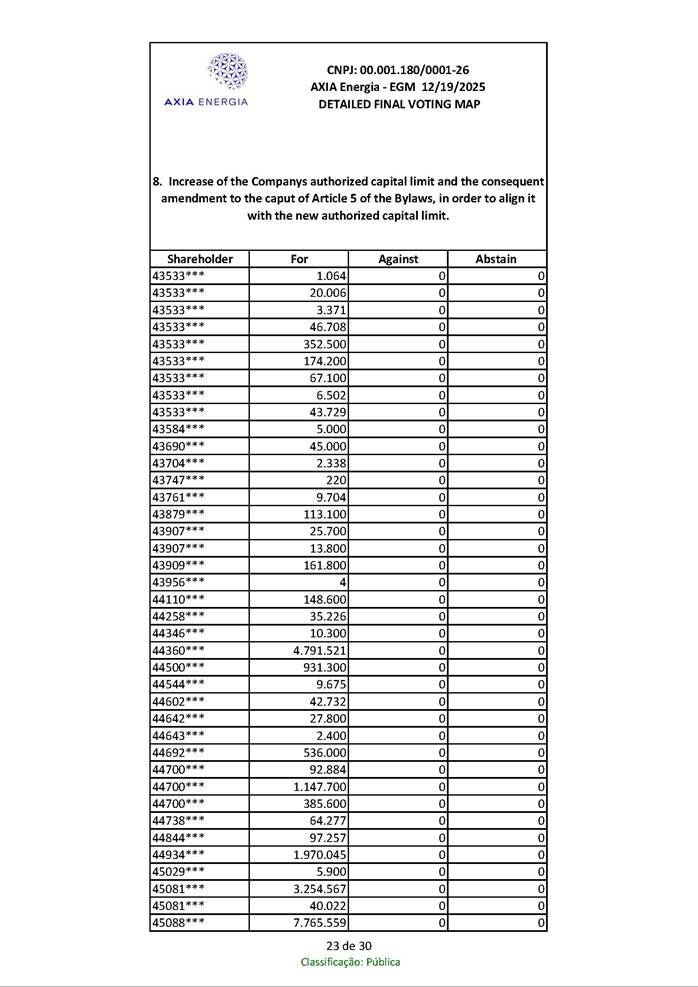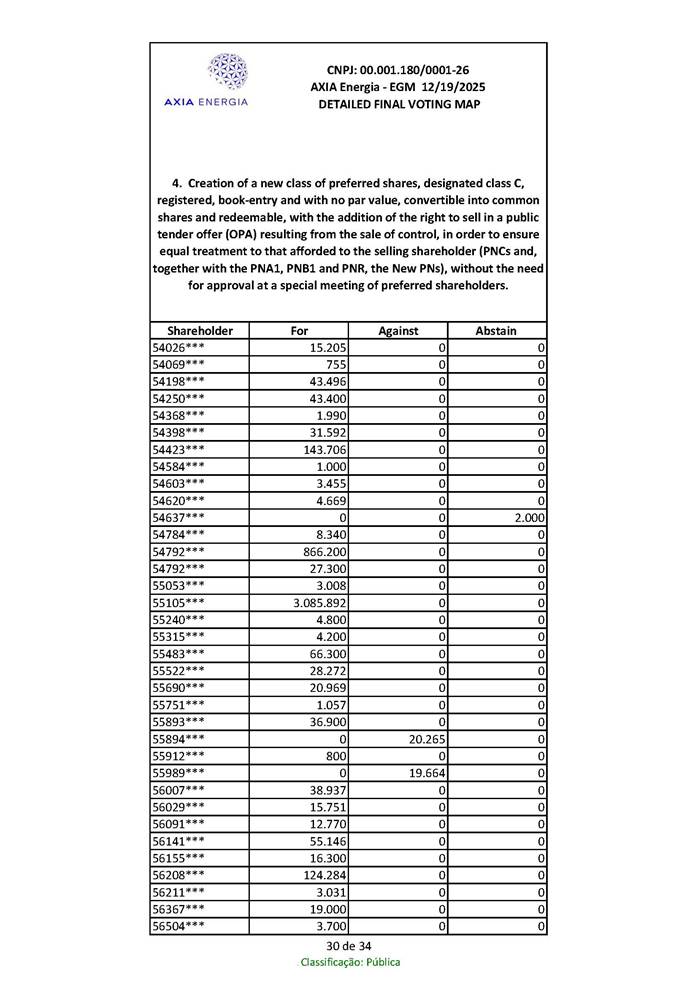 Shareholder For Against Abstain Total 818.181.617 198.176.986 34.862.286 00125*** 1.178.056 0 0 00394*** 0 190.732.084 0 00455*** 6 0 0 00560*** 4.984 0 0 00586*** 10 0 0 00601*** 31 0 0 00739*** 1.428 0 0 00805*** 20 0 0 00914*** 3 0 0 01017*** 1 0 0 01171*** 1.610 0 0 01203*** 1 0 0 01456*** 4 0 0 01496*** 161.306 0 0 01586*** 16 0 0 01643*** 66.985 0 0 01699*** 96.416 0 0 01886*** 12.945 0 0 02020*** 53.603 0 0 02097*** 5.700 0 0 02231*** 611 0 0 02231*** 8.536 0 0 02285*** 102 0 0 02524*** 250 0 0 02745*** 0 5 0 02863*** 1.125.500 0 0 02887*** 26.056 0 0 02895*** 64.700 0 0 02903*** 100 0 0 03027*** 51.786 0 0 03369*** 0 0 136 03370*** 392.332 0 0 03394*** 87.480 0 0 03394*** 7 0 0 1. Creation of a new class of preferred shares, class A1 (PNA1), registered, book-entry and with no par value, with the same rights, preferences and privileges as the currently existing class A preferred shares (PNA), plus the right to sell in a public tender offer (OPA) resulting from the sale of control, in order to ensure equal treatment to that afforded to the selling shareholder, and without the need for approval at a special meeting of holders of preferred shares. CNPJ: 00.001.180/0001-26AXIA Energia - EGM 12/19/2025 DETAILED FINAL VOTING MAP 1 de 34 # Classificação: Pública Shareholder For Against Abstain 1. Creation of a new class of preferred shares, class A1 (PNA1), registered, book-entry and with no par value, with the same rights, preferences and privileges as the currently existing class A preferred shares (PNA), plus the right to sell in a public tender offer (OPA) resulting from the sale of control, in order to ensure equal treatment to that afforded to the selling shareholder, and without the need for approval at a special meeting of holders of preferred shares. CNPJ: 00.001.180/0001-26AXIA Energia - EGM 12/19/2025 DETAILED FINAL VOTING MAP 03473*** 569 0 0 03833*** 28.394 0 0 03902*** 1 0 0 03960*** 24.957 0 0 04005*** 0 50 0 04073*** 292.991 0 0 04297*** 3 0 0 04555*** 0 0 55 04605*** 0 0 200 04609*** 602 0 0 04609*** 1.300 0 0 04616*** 11.687 0 0 04672*** 5 0 0 04709*** 0 1 0 04736*** 28.890 0 0 04751*** 111.059 0 0 04847*** 4 0 0 05075*** 5 0 0 05100*** 43.978 0 0 05147*** 14.000 0 0 05303*** 0 0 1 05316*** 1.030 0 0 05435*** 3 0 0 05448*** 9.727 0 0 05479*** 1.513.900 0 0 05479*** 2.843.378 0 0 05522*** 44 0 0 05589*** 233.315 0 0 05589*** 279.983 0 0 05589*** 28.815 0 0 05719*** 27 0 0 05734*** 415 0 0 05775*** 1.759 0 0 05838*** 15.219 0 0 05839*** 96.081 0 0 2 de 34 # Classificação: Pública Shareholder For Against Abstain 1. Creation of a new class of preferred shares, class A1 (PNA1), registered, book-entry and with no par value, with the same rights, preferences and privileges as the currently existing class A preferred shares (PNA), plus the right to sell in a public tender offer (OPA) resulting from the sale of control, in order to ensure equal treatment to that afforded to the selling shareholder, and without the need for approval at a special meeting of holders of preferred shares. CNPJ: 00.001.180/0001-26AXIA Energia - EGM 12/19/2025 DETAILED FINAL VOTING MAP 05839*** 189.258 0 0 05839*** 718.804 0 0 05839*** 724 0 0 05839*** 775.653 0 0 05839*** 15.200 0 0 05839*** 9.200 0 0 05839*** 803.800 0 0 05839*** 158.291 0 0 05839*** 15.718 0 0 05839*** 0 1.111.508 0 05839*** 4.619.084 0 0 05839*** 226.872 0 0 05839*** 51.889 0 0 05840*** 188.253 0 0 05840*** 10.000 0 0 05840*** 32.547 0 0 05840*** 804.990 0 0 05840*** 4.858.301 0 0 05840*** 477.000 0 0 05840*** 2.199.143 0 0 05872*** 79.961 0 0 05901*** 1 0 0 05986*** 1.881.495 0 0 05986*** 2.673.143 0 0 05986*** 24.100 0 0 05986*** 2.155 0 0 05987*** 147.900 0 0 05987*** 129.553 0 0 05987*** 11.827 0 0 05987*** 2.020.100 0 0 05987*** 1.602.500 0 0 05987*** 5 0 0 05987*** 199.465 0 0 05987*** 13.400 0 0 05987*** 0 428.300 0 3 de 34 # Classificação: Pública Shareholder For Against Abstain 1. Creation of a new class of preferred shares, class A1 (PNA1), registered, book-entry and with no par value, with the same rights, preferences and privileges as the currently existing class A preferred shares (PNA), plus the right to sell in a public tender offer (OPA) resulting from the sale of control, in order to ensure equal treatment to that afforded to the selling shareholder, and without the need for approval at a special meeting of holders of preferred shares. CNPJ: 00.001.180/0001-26AXIA Energia - EGM 12/19/2025 DETAILED FINAL VOTING MAP 05987*** 24.749 0 0 05987*** 188.737 0 0 05987*** 2.862.252 0 0 05987*** 481.572 0 0 05987*** 1.758.400 0 0 06046*** 1.594.573 0 0 06069*** 5.615 0 0 06105*** 10.100 0 0 06134*** 0 108.329 0 06148*** 76.771 0 0 06224*** 6.811 0 0 06239*** 174.268 0 0 06239*** 455.200 0 0 06251*** 9.995 0 0 06318*** 0 0 1 06323*** 530.363 0 0 06370*** 3 0 0 06406*** 0 0 100.000 06491*** 35 0 0 06541*** 284.989 0 0 06571*** 130 0 0 06613*** 77.676 0 0 06832*** 0 23 0 06916*** 622.500 0 0 06943*** 137.641 0 0 06943*** 589.073 0 0 06943*** 922.665 0 0 06949*** 0 0 10 06964*** 298.476 0 0 07023*** 0 0 100 07060*** 239.200 0 0 07086*** 1.000 0 0 07096*** 51.672 0 0 07140*** 0 859.100 0 07140*** 19.426 0 0 4 de 34 # Classificação: Pública Shareholder For Against Abstain 1. Creation of a new class of preferred shares, class A1 (PNA1), registered, book-entry and with no par value, with the same rights, preferences and privileges as the currently existing class A preferred shares (PNA), plus the right to sell in a public tender offer (OPA) resulting from the sale of control, in order to ensure equal treatment to that afforded to the selling shareholder, and without the need for approval at a special meeting of holders of preferred shares. CNPJ: 00.001.180/0001-26AXIA Energia - EGM 12/19/2025 DETAILED FINAL VOTING MAP 07140*** 1.219 0 0 07140*** 26.098 0 0 07187*** 16.269 0 0 07187*** 713 0 0 07191*** 0 857.000 0 07191*** 85.700 0 0 07191*** 105.335 0 0 07226*** 0 0 4 07237*** 589.417 0 0 07237*** 33.388 0 0 07247*** 296