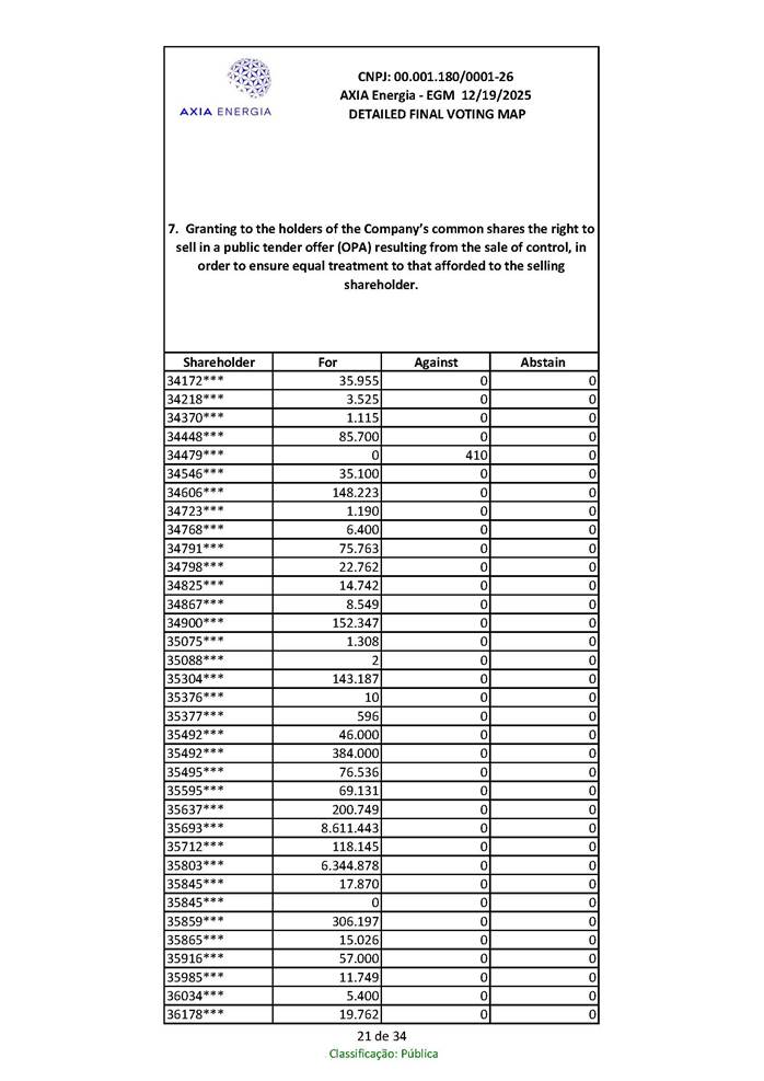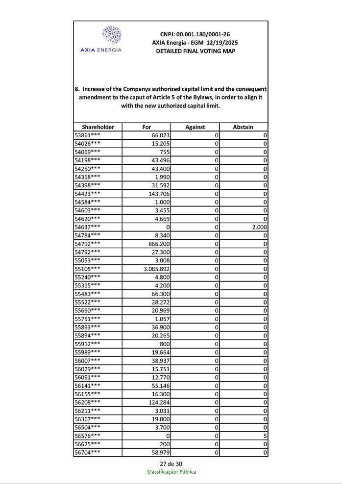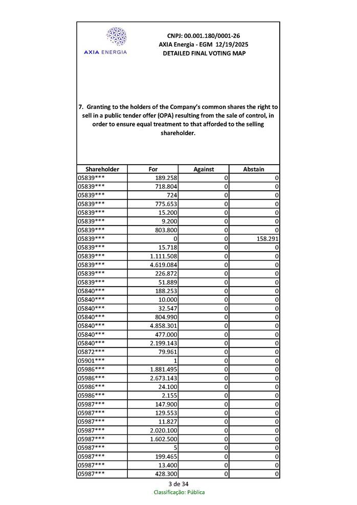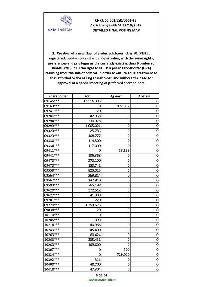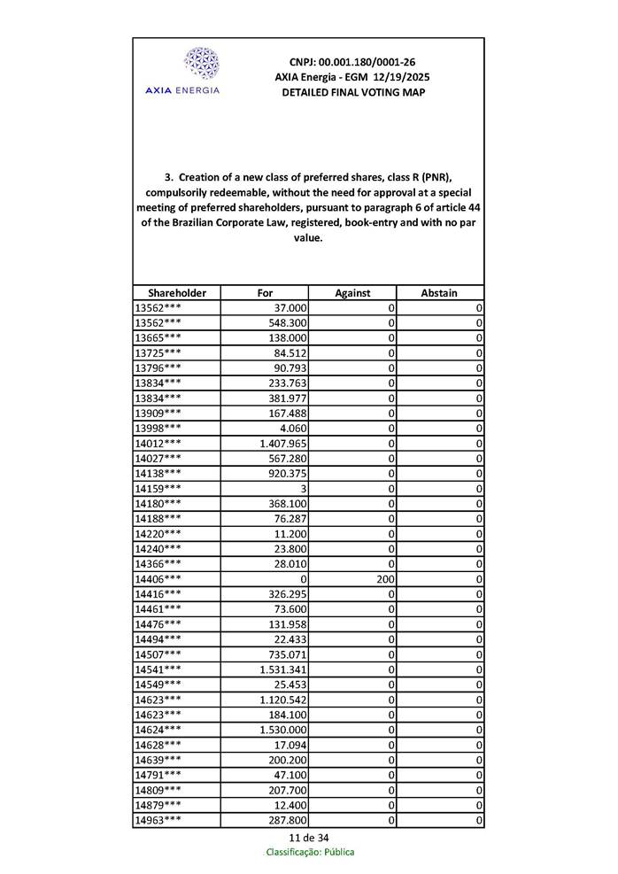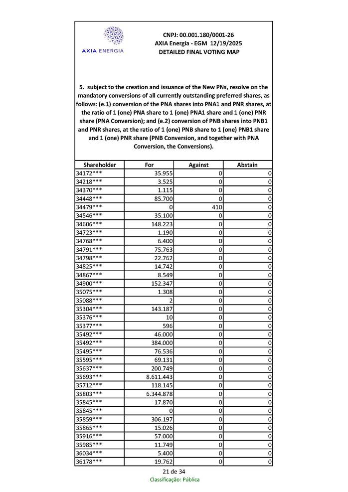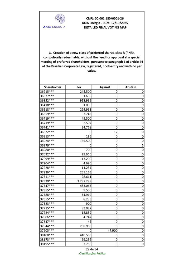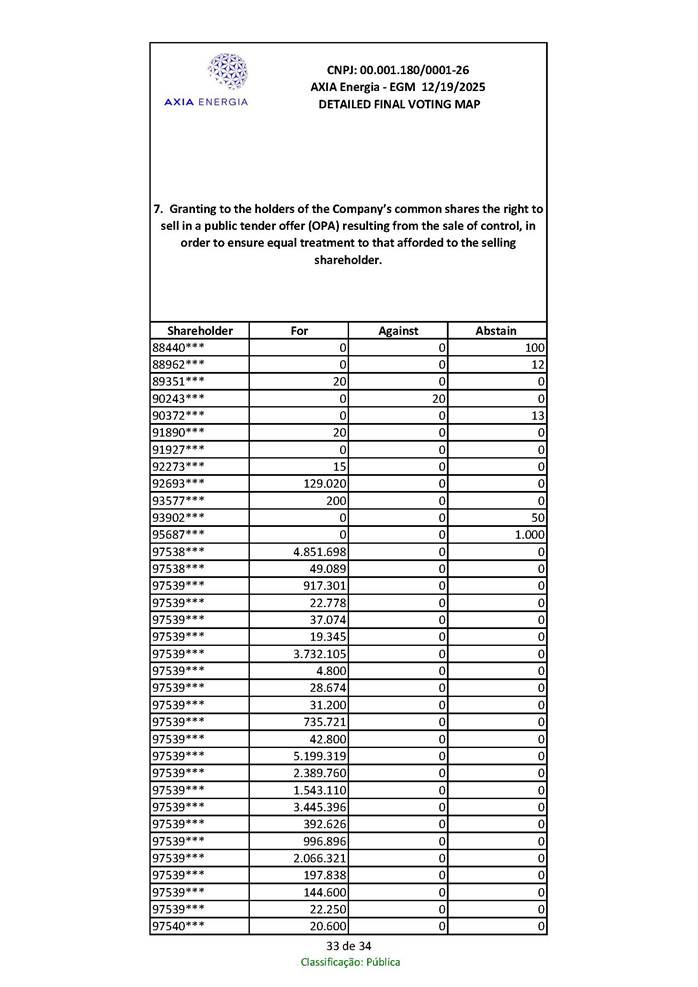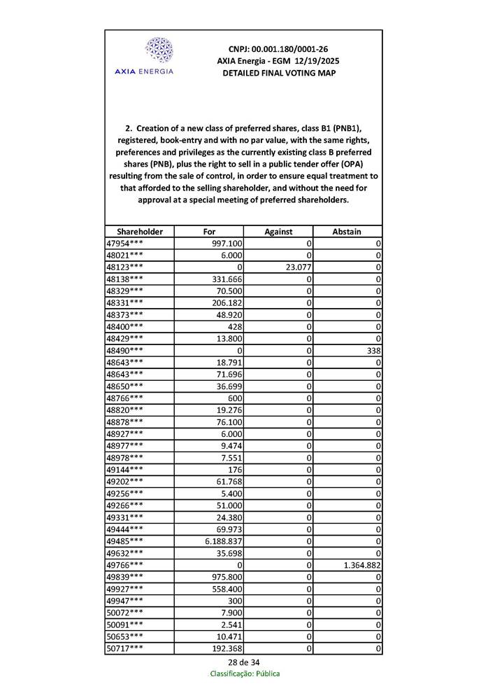 Shareholder For Against Abstain Total 818.181.617 198.176.986 34.862.286 00125*** 1.178.056 0 0 00394*** 0 190.732.084 0 00455*** 6 0 0 00560*** 4.984 0 0 00586*** 10 0 0 00601*** 31 0 0 00739*** 1.428 0 0 00805*** 20 0 0 00914*** 3 0 0 01017*** 1 0 0 01171*** 1.610 0 0 01203*** 1 0 0 01456*** 4 0 0 01496*** 161.306 0 0 01586*** 16 0 0 01643*** 66.985 0 0 01699*** 96.416 0 0 01886*** 12.945 0 0 02020*** 53.603 0 0 02097*** 5.700 0 0 02231*** 611 0 0 02231*** 8.536 0 0 02285*** 102 0 0 02524*** 250 0 0 02745*** 0 5 0 02863*** 1.125.500 0 0 02887*** 26.056 0 0 02895*** 64.700 0 0 02903*** 100 0 0 03027*** 51.786 0 0 03369*** 0 0 136 03370*** 392.332 0 0 03394*** 87.480 0 0 03394*** 7 0 0 1. Creation of a new class of preferred shares, class A1 (PNA1), registered, book-entry and with no par value, with the same rights, preferences and privileges as the currently existing class A preferred shares (PNA), plus the right to sell in a public tender offer (OPA) resulting from the sale of control, in order to ensure equal treatment to that afforded to the selling shareholder, and without the need for approval at a special meeting of holders of preferred shares. CNPJ: 00.001.180/0001-26AXIA Energia - EGM 12/19/2025 DETAILED FINAL VOTING MAP 1 de 34 # Classificação: Pública Shareholder For Against Abstain 1. Creation of a new class of preferred shares, class A1 (PNA1), registered, book-entry and with no par value, with the same rights, preferences and privileges as the currently existing class A preferred shares (PNA), plus the right to sell in a public tender offer (OPA) resulting from the sale of control, in order to ensure equal treatment to that afforded to the selling shareholder, and without the need for approval at a special meeting of holders of preferred shares. CNPJ: 00.001.180/0001-26AXIA Energia - EGM 12/19/2025 DETAILED FINAL VOTING MAP 03473*** 569 0 0 03833*** 28.394 0 0 03902*** 1 0 0 03960*** 24.957 0 0 04005*** 0 50 0 04073*** 292.991 0 0 04297*** 3 0 0 04555*** 0 0 55 04605*** 0 0 200 04609*** 602 0 0 04609*** 1.300 0 0 04616*** 11.687 0 0 04672*** 5 0 0 04709*** 0 1 0 04736*** 28.890 0 0 04751*** 111.059 0 0 04847*** 4 0 0 05075*** 5 0 0 05100*** 43.978 0 0 05147*** 14.000 0 0 05303*** 0 0 1 05316*** 1.030 0 0 05435*** 3 0 0 05448*** 9.727 0 0 05479*** 1.513.900 0 0 05479*** 2.843.378 0 0 05522*** 44 0 0 05589*** 233.315 0 0 05589*** 279.983 0 0 05589*** 28.815 0 0 05719*** 27 0 0 05734*** 415 0 0 05775*** 1.759 0 0 05838*** 15.219 0 0 05839*** 96.081 0 0 2 de 34 # Classificação: Pública Shareholder For Against Abstain 1. Creation of a new class of preferred shares, class A1 (PNA1), registered, book-entry and with no par value, with the same rights, preferences and privileges as the currently existing class A preferred shares (PNA), plus the right to sell in a public tender offer (OPA) resulting from the sale of control, in order to ensure equal treatment to that afforded to the selling shareholder, and without the need for approval at a special meeting of holders of preferred shares. CNPJ: 00.001.180/0001-26AXIA Energia - EGM 12/19/2025 DETAILED FINAL VOTING MAP 05839*** 189.258 0 0 05839*** 718.804 0 0 05839*** 724 0 0 05839*** 775.653 0 0 05839*** 15.200 0 0 05839*** 9.200 0 0 05839*** 803.800 0 0 05839*** 158.291 0 0 05839*** 15.718 0 0 05839*** 0 1.111.508 0 05839*** 4.619.084 0 0 05839*** 226.872 0 0 05839*** 51.889 0 0 05840*** 188.253 0 0 05840*** 10.000 0 0 05840*** 32.547 0 0 05840*** 804.990 0 0 05840*** 4.858.301 0 0 05840*** 477.000 0 0 05840*** 2.199.143 0 0 05872*** 79.961 0 0 05901*** 1 0 0 05986*** 1.881.495 0 0 05986*** 2.673.143 0 0 05986*** 24.100 0 0 05986*** 2.155 0 0 05987*** 147.900 0 0 05987*** 129.553 0 0 05987*** 11.827 0 0 05987*** 2.020.100 0 0 05987*** 1.602.500 0 0 05987*** 5 0 0 05987*** 199.465 0 0 05987*** 13.400 0 0 05987*** 0 428.300 0 3 de 34 # Classificação: Pública Shareholder For Against Abstain 1. Creation of a new class of preferred shares, class A1 (PNA1), registered, book-entry and with no par value, with the same rights, preferences and privileges as the currently existing class A preferred shares (PNA), plus the right to sell in a public tender offer (OPA) resulting from the sale of control, in order to ensure equal treatment to that afforded to the selling shareholder, and without the need for approval at a special meeting of holders of preferred shares. CNPJ: 00.001.180/0001-26AXIA Energia - EGM 12/19/2025 DETAILED FINAL VOTING MAP 05987*** 24.749 0 0 05987*** 188.737 0 0 05987*** 2.862.252 0 0 05987*** 481.572 0 0 05987*** 1.758.400 0 0 06046*** 1.594.573 0 0 06069*** 5.615 0 0 06105*** 10.100 0 0 06134*** 0 108.329 0 06148*** 76.771 0 0 06224*** 6.811 0 0 06239*** 174.268 0 0 06239*** 455.200 0 0 06251*** 9.995 0 0 06318*** 0 0 1 06323*** 530.363 0 0 06370*** 3 0 0 06406*** 0 0 100.000 06491*** 35 0 0 06541*** 284.989 0 0 06571*** 130 0 0 06613*** 77.676 0 0 06832*** 0 23 0 06916*** 622.500 0 0 06943*** 137.641 0 0 06943*** 589.073 0 0 06943*** 922.665 0 0 06949*** 0 0 10 06964*** 298.476 0 0 07023*** 0 0 100 07060*** 239.200 0 0 07086*** 1.000 0 0 07096*** 51.672 0 0 07140*** 0 859.100 0 07140*** 19.426 0 0 4 de 34 # Classificação: Pública Shareholder For Against Abstain 1. Creation of a new class of preferred shares, class A1 (PNA1), registered, book-entry and with no par value, with the same rights, preferences and privileges as the currently existing class A preferred shares (PNA), plus the right to sell in a public tender offer (OPA) resulting from the sale of control, in order to ensure equal treatment to that afforded to the selling shareholder, and without the need for approval at a special meeting of holders of preferred shares. CNPJ: 00.001.180/0001-26AXIA Energia - EGM 12/19/2025 DETAILED FINAL VOTING MAP 07140*** 1.219 0 0 07140*** 26.098 0 0 07187*** 16.269 0 0 07187*** 713 0 0 07191*** 0 857.000 0 07191*** 85.700 0 0 07191*** 105.335 0 0 07226*** 0 0 4 07237*** 589.417 0 0 07237*** 33.388 0 0 07247*** 296