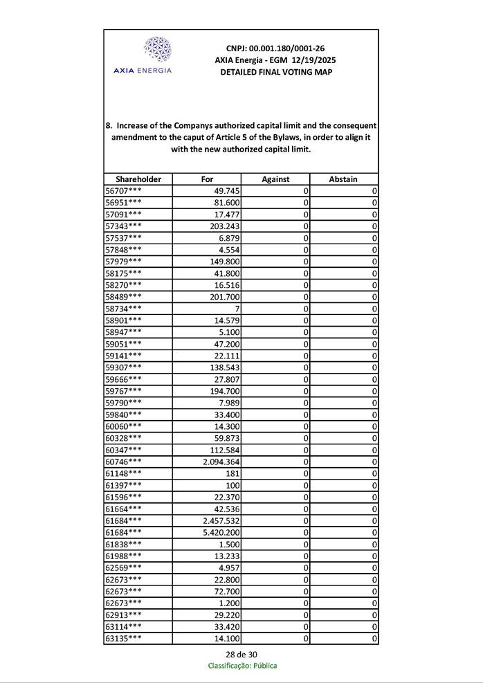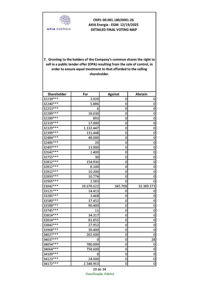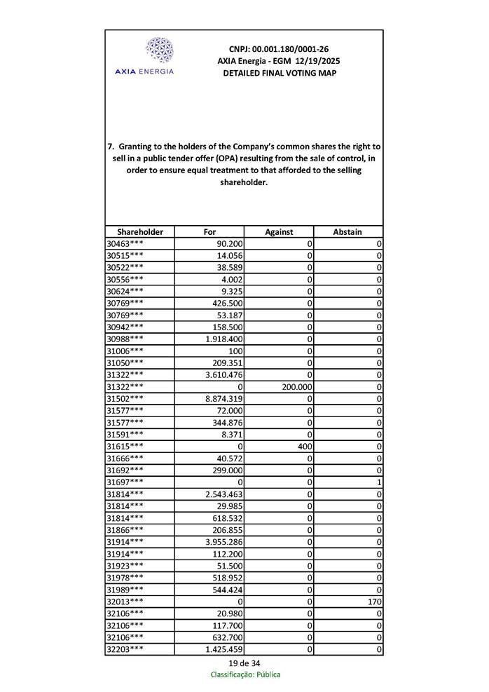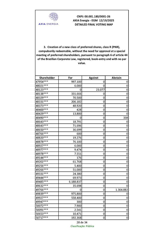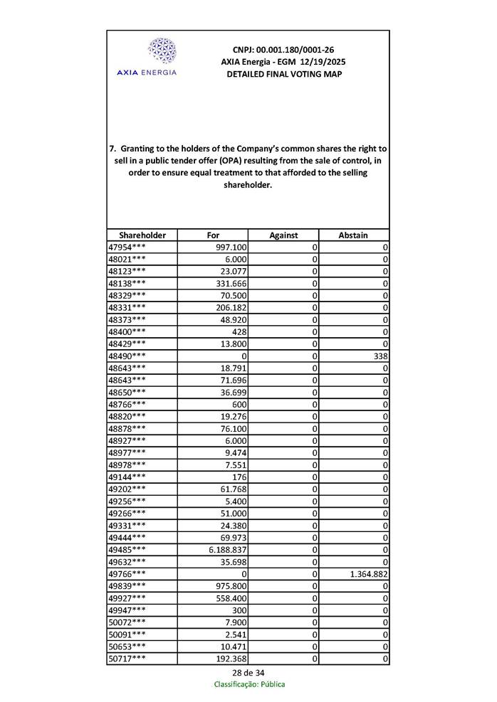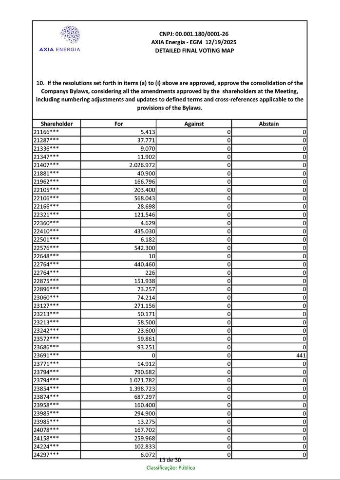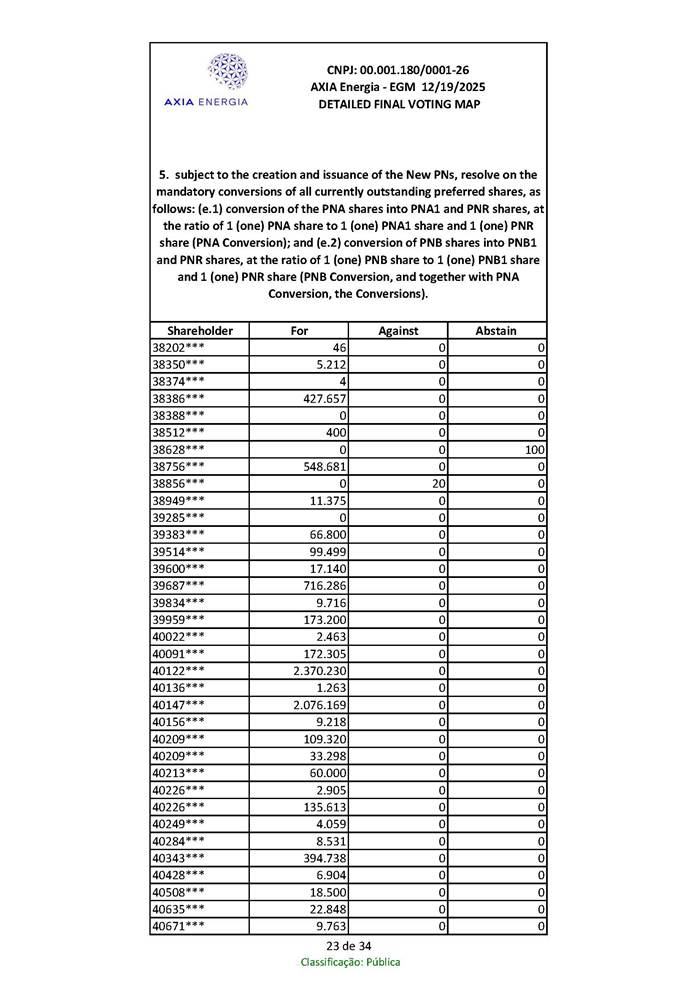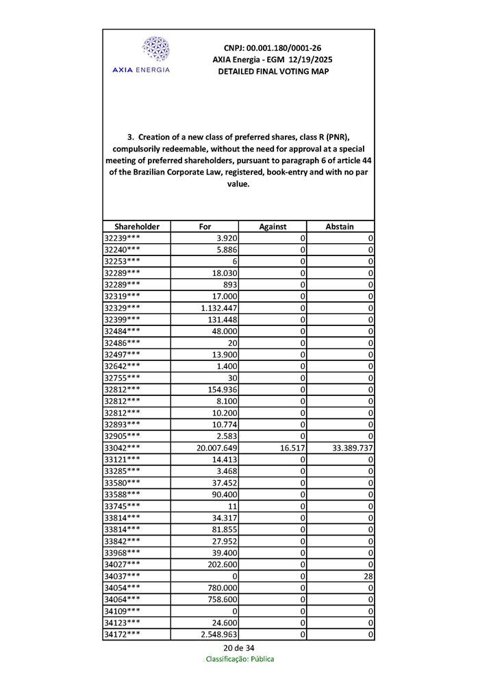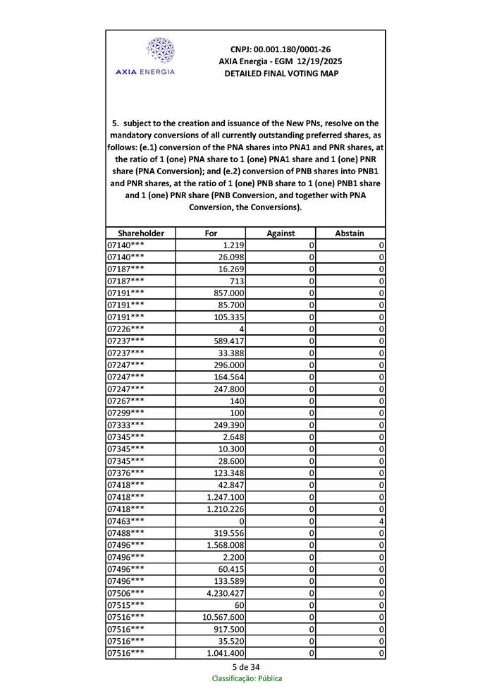 Shareholder For Against Abstain Total 818.181.617 198.176.986 34.862.286 00125*** 1.178.056 0 0 00394*** 0 190.732.084 0 00455*** 6 0 0 00560*** 4.984 0 0 00586*** 10 0 0 00601*** 31 0 0 00739*** 1.428 0 0 00805*** 20 0 0 00914*** 3 0 0 01017*** 1 0 0 01171*** 1.610 0 0 01203*** 1 0 0 01456*** 4 0 0 01496*** 161.306 0 0 01586*** 16 0 0 01643*** 66.985 0 0 01699*** 96.416 0 0 01886*** 12.945 0 0 02020*** 53.603 0 0 02097*** 5.700 0 0 02231*** 611 0 0 02231*** 8.536 0 0 02285*** 102 0 0 02524*** 250 0 0 02745*** 0 5 0 02863*** 1.125.500 0 0 02887*** 26.056 0 0 02895*** 64.700 0 0 02903*** 100 0 0 03027*** 51.786 0 0 03369*** 0 0 136 03370*** 392.332 0 0 03394*** 87.480 0 0 03394*** 7 0 0 1. Creation of a new class of preferred shares, class A1 (PNA1), registered, book-entry and with no par value, with the same rights, preferences and privileges as the currently existing class A preferred shares (PNA), plus the right to sell in a public tender offer (OPA) resulting from the sale of control, in order to ensure equal treatment to that afforded to the selling shareholder, and without the need for approval at a special meeting of holders of preferred shares. CNPJ: 00.001.180/0001-26AXIA Energia - EGM 12/19/2025 DETAILED FINAL VOTING MAP 1 de 34 # Classificação: Pública Shareholder For Against Abstain 1. Creation of a new class of preferred shares, class A1 (PNA1), registered, book-entry and with no par value, with the same rights, preferences and privileges as the currently existing class A preferred shares (PNA), plus the right to sell in a public tender offer (OPA) resulting from the sale of control, in order to ensure equal treatment to that afforded to the selling shareholder, and without the need for approval at a special meeting of holders of preferred shares. CNPJ: 00.001.180/0001-26AXIA Energia - EGM 12/19/2025 DETAILED FINAL VOTING MAP 03473*** 569 0 0 03833*** 28.394 0 0 03902*** 1 0 0 03960*** 24.957 0 0 04005*** 0 50 0 04073*** 292.991 0 0 04297*** 3 0 0 04555*** 0 0 55 04605*** 0 0 200 04609*** 602 0 0 04609*** 1.300 0 0 04616*** 11.687 0 0 04672*** 5 0 0 04709*** 0 1 0 04736*** 28.890 0 0 04751*** 111.059 0 0 04847*** 4 0 0 05075*** 5 0 0 05100*** 43.978 0 0 05147*** 14.000 0 0 05303*** 0 0 1 05316*** 1.030 0 0 05435*** 3 0 0 05448*** 9.727 0 0 05479*** 1.513.900 0 0 05479*** 2.843.378 0 0 05522*** 44 0 0 05589*** 233.315 0 0 05589*** 279.983 0 0 05589*** 28.815 0 0 05719*** 27 0 0 05734*** 415 0 0 05775*** 1.759 0 0 05838*** 15.219 0 0 05839*** 96.081 0 0 2 de 34 # Classificação: Pública Shareholder For Against Abstain 1. Creation of a new class of preferred shares, class A1 (PNA1), registered, book-entry and with no par value, with the same rights, preferences and privileges as the currently existing class A preferred shares (PNA), plus the right to sell in a public tender offer (OPA) resulting from the sale of control, in order to ensure equal treatment to that afforded to the selling shareholder, and without the need for approval at a special meeting of holders of preferred shares. CNPJ: 00.001.180/0001-26AXIA Energia - EGM 12/19/2025 DETAILED FINAL VOTING MAP 05839*** 189.258 0 0 05839*** 718.804 0 0 05839*** 724 0 0 05839*** 775.653 0 0 05839*** 15.200 0 0 05839*** 9.200 0 0 05839*** 803.800 0 0 05839*** 158.291 0 0 05839*** 15.718 0 0 05839*** 0 1.111.508 0 05839*** 4.619.084 0 0 05839*** 226.872 0 0 05839*** 51.889 0 0 05840*** 188.253 0 0 05840*** 10.000 0 0 05840*** 32.547 0 0 05840*** 804.990 0 0 05840*** 4.858.301 0 0 05840*** 477.000 0 0 05840*** 2.199.143 0 0 05872*** 79.961 0 0 05901*** 1 0 0 05986*** 1.881.495 0 0 05986*** 2.673.143 0 0 05986*** 24.100 0 0 05986*** 2.155 0 0 05987*** 147.900 0 0 05987*** 129.553 0 0 05987*** 11.827 0 0 05987*** 2.020.100 0 0 05987*** 1.602.500 0 0 05987*** 5 0 0 05987*** 199.465 0 0 05987*** 13.400 0 0 05987*** 0 428.300 0 3 de 34 # Classificação: Pública Shareholder For Against Abstain 1. Creation of a new class of preferred shares, class A1 (PNA1), registered, book-entry and with no par value, with the same rights, preferences and privileges as the currently existing class A preferred shares (PNA), plus the right to sell in a public tender offer (OPA) resulting from the sale of control, in order to ensure equal treatment to that afforded to the selling shareholder, and without the need for approval at a special meeting of holders of preferred shares. CNPJ: 00.001.180/0001-26AXIA Energia - EGM 12/19/2025 DETAILED FINAL VOTING MAP 05987*** 24.749 0 0 05987*** 188.737 0 0 05987*** 2.862.252 0 0 05987*** 481.572 0 0 05987*** 1.758.400 0 0 06046*** 1.594.573 0 0 06069*** 5.615 0 0 06105*** 10.100 0 0 06134*** 0 108.329 0 06148*** 76.771 0 0 06224*** 6.811 0 0 06239*** 174.268 0 0 06239*** 455.200 0 0 06251*** 9.995 0 0 06318*** 0 0 1 06323*** 530.363 0 0 06370*** 3 0 0 06406*** 0 0 100.000 06491*** 35 0 0 06541*** 284.989 0 0 06571*** 130 0 0 06613*** 77.676 0 0 06832*** 0 23 0 06916*** 622.500 0 0 06943*** 137.641 0 0 06943*** 589.073 0 0 06943*** 922.665 0 0 06949*** 0 0 10 06964*** 298.476 0 0 07023*** 0 0 100 07060*** 239.200 0 0 07086*** 1.000 0 0 07096*** 51.672 0 0 07140*** 0 859.100 0 07140*** 19.426 0 0 4 de 34 # Classificação: Pública Shareholder For Against Abstain 1. Creation of a new class of preferred shares, class A1 (PNA1), registered, book-entry and with no par value, with the same rights, preferences and privileges as the currently existing class A preferred shares (PNA), plus the right to sell in a public tender offer (OPA) resulting from the sale of control, in order to ensure equal treatment to that afforded to the selling shareholder, and without the need for approval at a special meeting of holders of preferred shares. CNPJ: 00.001.180/0001-26AXIA Energia - EGM 12/19/2025 DETAILED FINAL VOTING MAP 07140*** 1.219 0 0 07140*** 26.098 0 0 07187*** 16.269 0 0 07187*** 713 0 0 07191*** 0 857.000 0 07191*** 85.700 0 0 07191*** 105.335 0 0 07226*** 0 0 4 07237*** 589.417 0 0 07237*** 33.388 0 0 07247*** 296