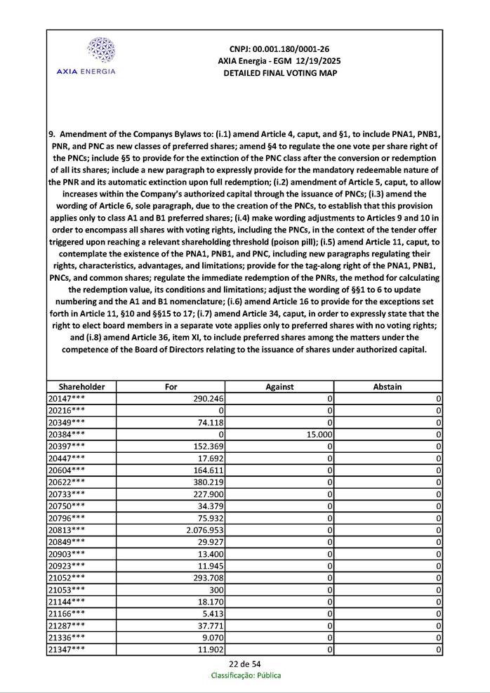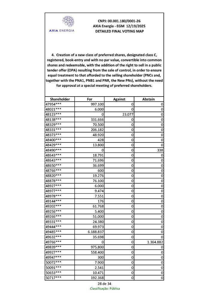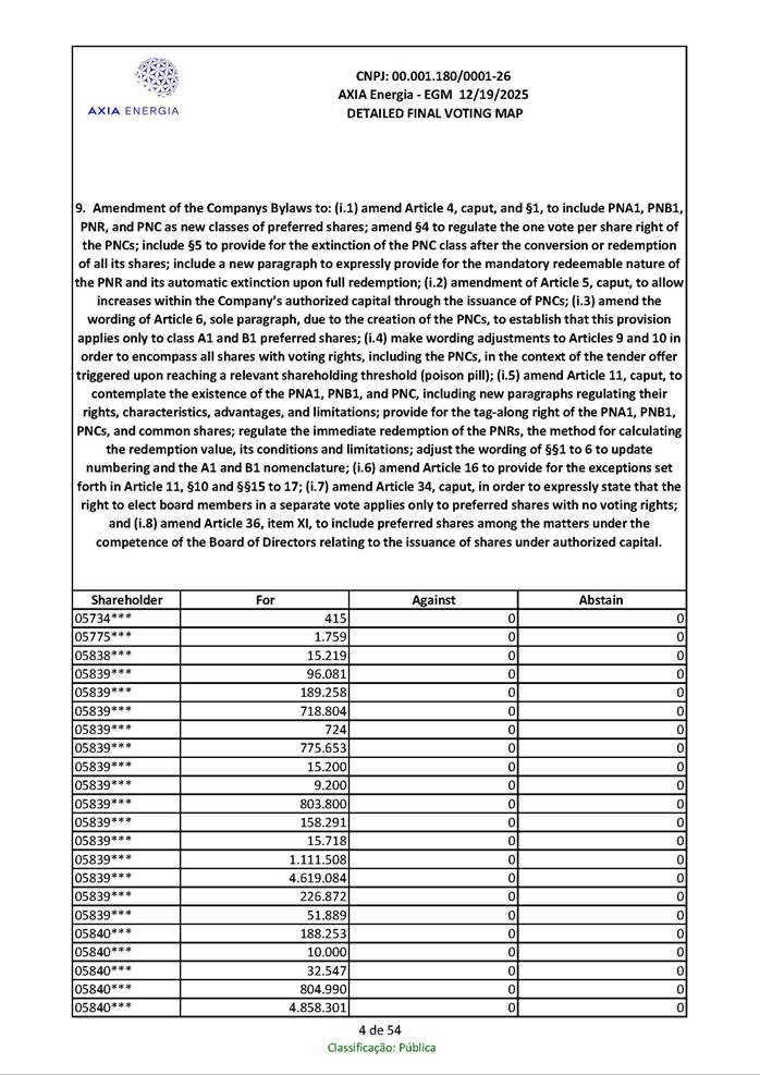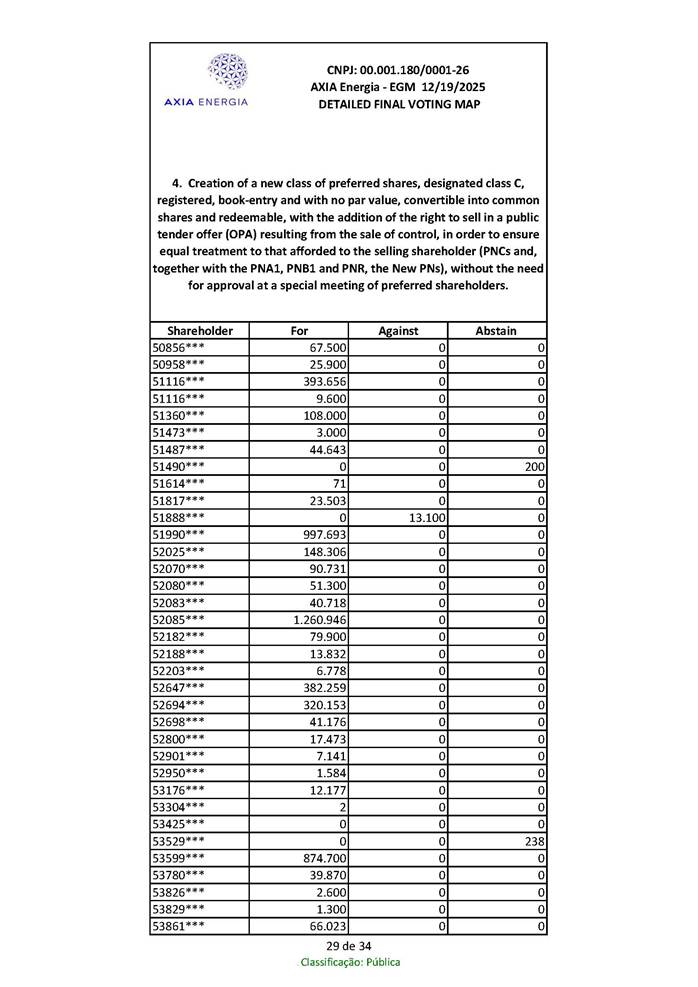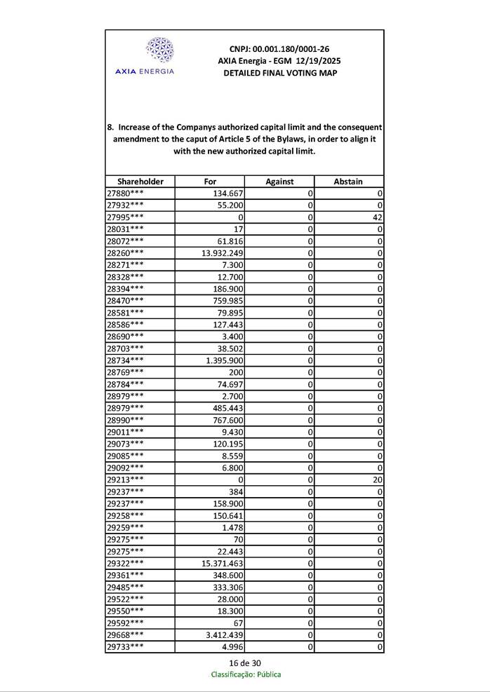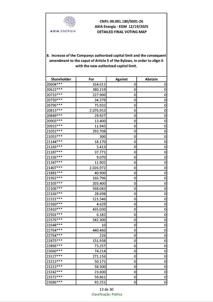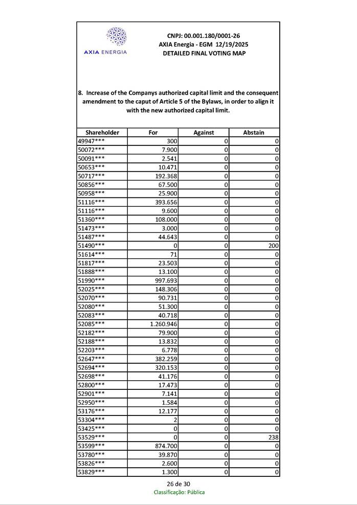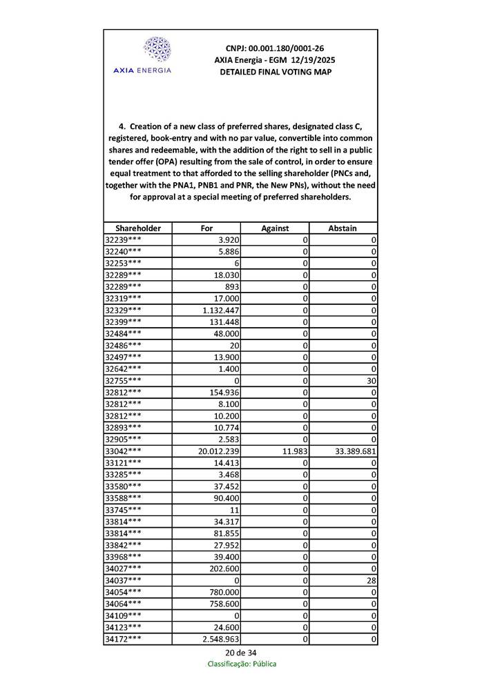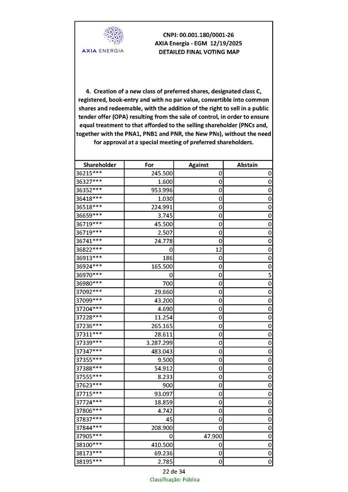 Shareholder For Against Abstain Total 818.181.617 198.176.986 34.862.286 00125*** 1.178.056 0 0 00394*** 0 190.732.084 0 00455*** 6 0 0 00560*** 4.984 0 0 00586*** 10 0 0 00601*** 31 0 0 00739*** 1.428 0 0 00805*** 20 0 0 00914*** 3 0 0 01017*** 1 0 0 01171*** 1.610 0 0 01203*** 1 0 0 01456*** 4 0 0 01496*** 161.306 0 0 01586*** 16 0 0 01643*** 66.985 0 0 01699*** 96.416 0 0 01886*** 12.945 0 0 02020*** 53.603 0 0 02097*** 5.700 0 0 02231*** 611 0 0 02231*** 8.536 0 0 02285*** 102 0 0 02524*** 250 0 0 02745*** 0 5 0 02863*** 1.125.500 0 0 02887*** 26.056 0 0 02895*** 64.700 0 0 02903*** 100 0 0 03027*** 51.786 0 0 03369*** 0 0 136 03370*** 392.332 0 0 03394*** 87.480 0 0 03394*** 7 0 0 1. Creation of a new class of preferred shares, class A1 (PNA1), registered, book-entry and with no par value, with the same rights, preferences and privileges as the currently existing class A preferred shares (PNA), plus the right to sell in a public tender offer (OPA) resulting from the sale of control, in order to ensure equal treatment to that afforded to the selling shareholder, and without the need for approval at a special meeting of holders of preferred shares. CNPJ: 00.001.180/0001-26AXIA Energia - EGM 12/19/2025 DETAILED FINAL VOTING MAP 1 de 34 # Classificação: Pública Shareholder For Against Abstain 1. Creation of a new class of preferred shares, class A1 (PNA1), registered, book-entry and with no par value, with the same rights, preferences and privileges as the currently existing class A preferred shares (PNA), plus the right to sell in a public tender offer (OPA) resulting from the sale of control, in order to ensure equal treatment to that afforded to the selling shareholder, and without the need for approval at a special meeting of holders of preferred shares. CNPJ: 00.001.180/0001-26AXIA Energia - EGM 12/19/2025 DETAILED FINAL VOTING MAP 03473*** 569 0 0 03833*** 28.394 0 0 03902*** 1 0 0 03960*** 24.957 0 0 04005*** 0 50 0 04073*** 292.991 0 0 04297*** 3 0 0 04555*** 0 0 55 04605*** 0 0 200 04609*** 602 0 0 04609*** 1.300 0 0 04616*** 11.687 0 0 04672*** 5 0 0 04709*** 0 1 0 04736*** 28.890 0 0 04751*** 111.059 0 0 04847*** 4 0 0 05075*** 5 0 0 05100*** 43.978 0 0 05147*** 14.000 0 0 05303*** 0 0 1 05316*** 1.030 0 0 05435*** 3 0 0 05448*** 9.727 0 0 05479*** 1.513.900 0 0 05479*** 2.843.378 0 0 05522*** 44 0 0 05589*** 233.315 0 0 05589*** 279.983 0 0 05589*** 28.815 0 0 05719*** 27 0 0 05734*** 415 0 0 05775*** 1.759 0 0 05838*** 15.219 0 0 05839*** 96.081 0 0 2 de 34 # Classificação: Pública Shareholder For Against Abstain 1. Creation of a new class of preferred shares, class A1 (PNA1), registered, book-entry and with no par value, with the same rights, preferences and privileges as the currently existing class A preferred shares (PNA), plus the right to sell in a public tender offer (OPA) resulting from the sale of control, in order to ensure equal treatment to that afforded to the selling shareholder, and without the need for approval at a special meeting of holders of preferred shares. CNPJ: 00.001.180/0001-26AXIA Energia - EGM 12/19/2025 DETAILED FINAL VOTING MAP 05839*** 189.258 0 0 05839*** 718.804 0 0 05839*** 724 0 0 05839*** 775.653 0 0 05839*** 15.200 0 0 05839*** 9.200 0 0 05839*** 803.800 0 0 05839*** 158.291 0 0 05839*** 15.718 0 0 05839*** 0 1.111.508 0 05839*** 4.619.084 0 0 05839*** 226.872 0 0 05839*** 51.889 0 0 05840*** 188.253 0 0 05840*** 10.000 0 0 05840*** 32.547 0 0 05840*** 804.990 0 0 05840*** 4.858.301 0 0 05840*** 477.000 0 0 05840*** 2.199.143 0 0 05872*** 79.961 0 0 05901*** 1 0 0 05986*** 1.881.495 0 0 05986*** 2.673.143 0 0 05986*** 24.100 0 0 05986*** 2.155 0 0 05987*** 147.900 0 0 05987*** 129.553 0 0 05987*** 11.827 0 0 05987*** 2.020.100 0 0 05987*** 1.602.500 0 0 05987*** 5 0 0 05987*** 199.465 0 0 05987*** 13.400 0 0 05987*** 0 428.300 0 3 de 34 # Classificação: Pública Shareholder For Against Abstain 1. Creation of a new class of preferred shares, class A1 (PNA1), registered, book-entry and with no par value, with the same rights, preferences and privileges as the currently existing class A preferred shares (PNA), plus the right to sell in a public tender offer (OPA) resulting from the sale of control, in order to ensure equal treatment to that afforded to the selling shareholder, and without the need for approval at a special meeting of holders of preferred shares. CNPJ: 00.001.180/0001-26AXIA Energia - EGM 12/19/2025 DETAILED FINAL VOTING MAP 05987*** 24.749 0 0 05987*** 188.737 0 0 05987*** 2.862.252 0 0 05987*** 481.572 0 0 05987*** 1.758.400 0 0 06046*** 1.594.573 0 0 06069*** 5.615 0 0 06105*** 10.100 0 0 06134*** 0 108.329 0 06148*** 76.771 0 0 06224*** 6.811 0 0 06239*** 174.268 0 0 06239*** 455.200 0 0 06251*** 9.995 0 0 06318*** 0 0 1 06323*** 530.363 0 0 06370*** 3 0 0 06406*** 0 0 100.000 06491*** 35 0 0 06541*** 284.989 0 0 06571*** 130 0 0 06613*** 77.676 0 0 06832*** 0 23 0 06916*** 622.500 0 0 06943*** 137.641 0 0 06943*** 589.073 0 0 06943*** 922.665 0 0 06949*** 0 0 10 06964*** 298.476 0 0 07023*** 0 0 100 07060*** 239.200 0 0 07086*** 1.000 0 0 07096*** 51.672 0 0 07140*** 0 859.100 0 07140*** 19.426 0 0 4 de 34 # Classificação: Pública Shareholder For Against Abstain 1. Creation of a new class of preferred shares, class A1 (PNA1), registered, book-entry and with no par value, with the same rights, preferences and privileges as the currently existing class A preferred shares (PNA), plus the right to sell in a public tender offer (OPA) resulting from the sale of control, in order to ensure equal treatment to that afforded to the selling shareholder, and without the need for approval at a special meeting of holders of preferred shares. CNPJ: 00.001.180/0001-26AXIA Energia - EGM 12/19/2025 DETAILED FINAL VOTING MAP 07140*** 1.219 0 0 07140*** 26.098 0 0 07187*** 16.269 0 0 07187*** 713 0 0 07191*** 0 857.000 0 07191*** 85.700 0 0 07191*** 105.335 0 0 07226*** 0 0 4 07237*** 589.417 0 0 07237*** 33.388 0 0 07247*** 296