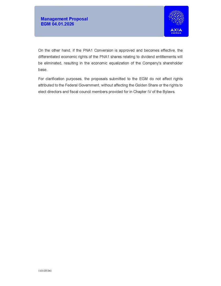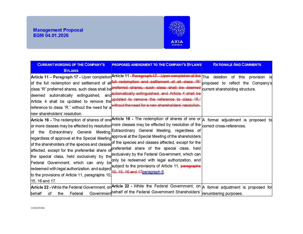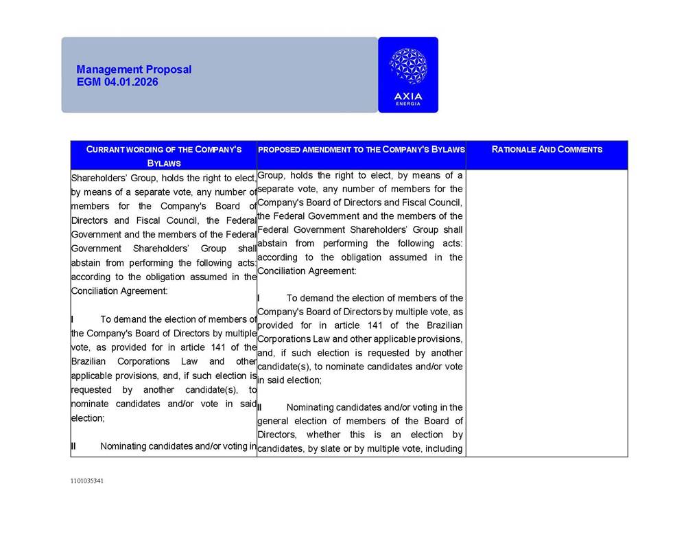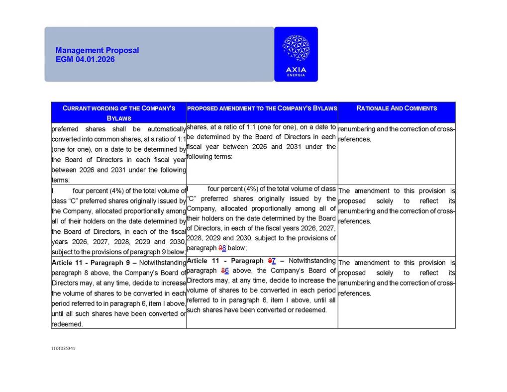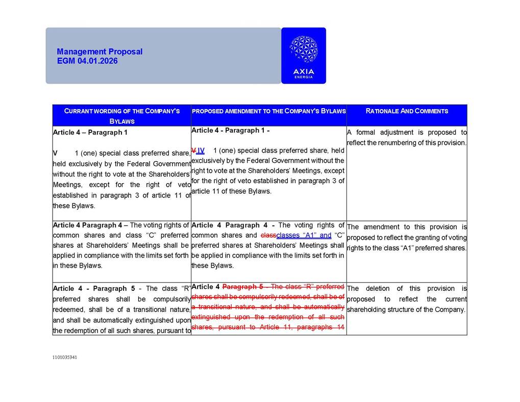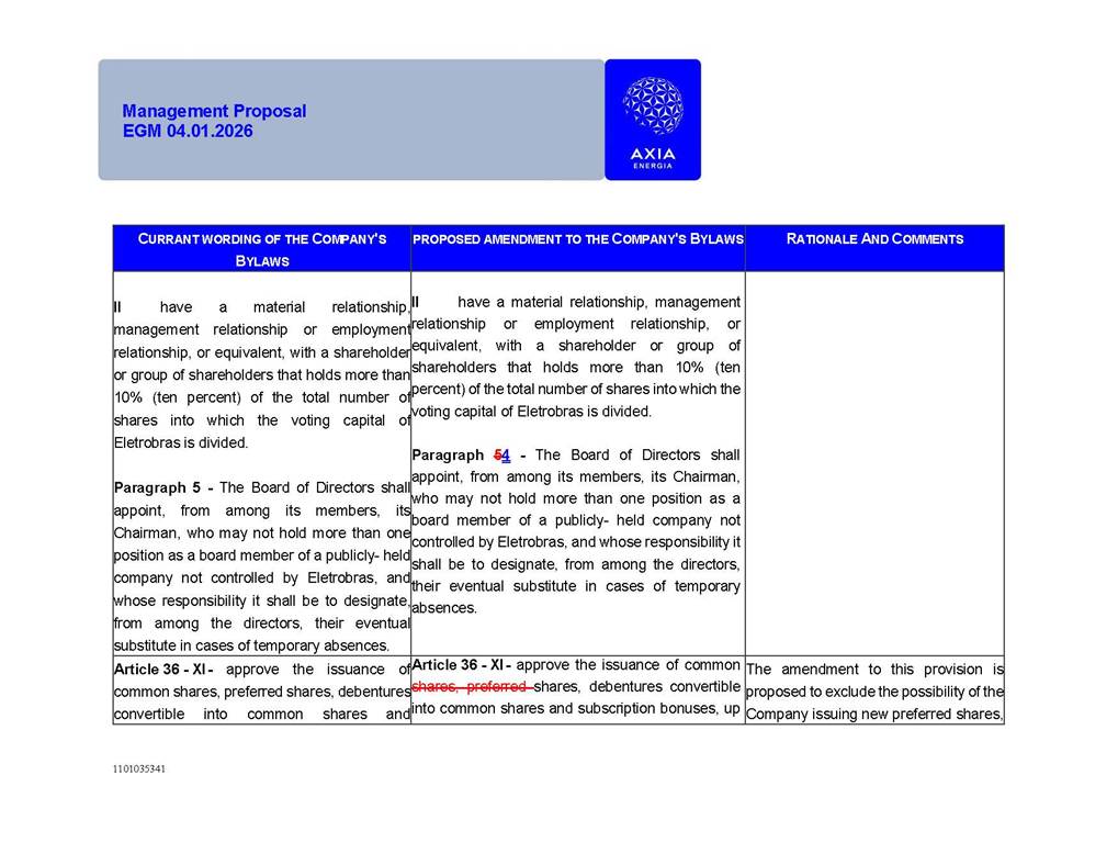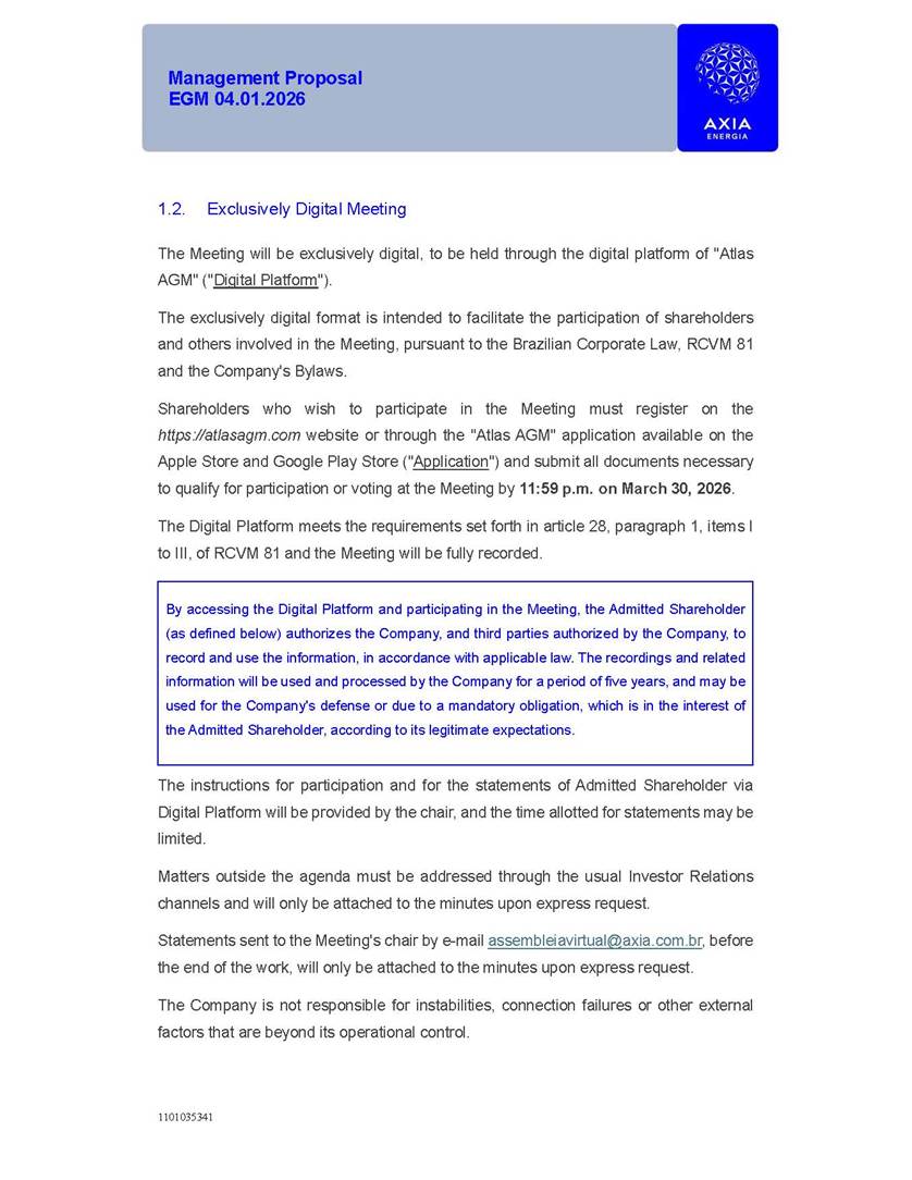 1101035341 Management Proposal EGM 04.01.2026 Management Proposal EGM 04.01.2026 1101035341 Management Proposal EGM 04.01.2026 Index 1. Manual for Participation ................................................................... 47 1.1. Introduction ...................................................................................... 47 1.2. Exclusively Digital Meeting .............................................................. 58 1.3. Remote Voting Ballot (BVD) ............................................................ 69 1.4. Required Documents ..................................................................... 812 1.5. Registration and Accreditation ..................................................... 1013 1.6. Declaration of Membership in a Group of Shareholders .............. 1215 2. Management Proposal .............................................................. 1417 2.1. General Guidelines ...................................................................... 1417 2.2. Agenda ........................................................................................ 1518 2.3. Clarifications on the agenda of the EGM ..................................... 1621 2.4. List of Schedules ......................................................................... 3344 2.5. Conclusion ................................................................................... 3545 SCHEDULE 1 ............................................................................................... 3646 SCHEDULE 2 ............................................................................................... 4259 SCHEDULE 3 ............................................................................................... 4664 SCHEDULE 4 ............................................................................................ 101119 SCHEDULE 5 ........................................................................................... 138157 SCHEDULE 6 ........................................................................................... 189208 SCHEDULE 7 ........................................................................................... 193212 SCHEDULE 8 ........................................................................................... 247266 SCHEDULE 9 ........................................................................................... 284304 1101035341 Management Proposal EGM 04.01.2026 1101035341 Management Proposal EGM 04.01.2026 1. Manual for Participation 1.1. Introduction The Management of CENTRAIS ELÉTRICAS BRASILEIRAS S.A. – Eletrobras, a corporation, headquartered in the City of Rio de Janeiro, State of Rio de Janeiro, at Avenida Graça Aranha, No. 26, Store A, Downtown, Zip code 20030-090, registered in the National Registry of Legal Entities (Cadastro Nacional de Pessoas Jurídicas) ("CNPJ") under No. 00.001.180/0001-26 ("Company" or "AXIA Energia"), with its bylaws filed with the Commercial Registry of the State of Rio de Janeiro (Junta Comercial do Estado do Rio de Janeiro) under NIRE 33.3.00346767, registered with the Brazilian Securities and Exchange Commission (Comissão de Valores Mobiliários) ("CVM") as a publicly-held company category "A" under the code 00243-7, with its securities currently admitted to trading on Level 1 of Corporate Governance of B3 S.A. – Brasil, Bolsa, Balcão ("B3"), pursuant to Brazilian Law No. 6,404, of 1976 ("Brazilian Corporate Law"), and CVM Resolution No. 81, of 2022 ("RCVM 81"), presents this Participation Manual, containing the information, documents and clarifications to guide the participation of shareholders at the Company's Extraordinary General Meeting, to be held exclusively digitally, on first call, on April 1, 2026, at 4 p.m., considering, therefore, to be held at the Company's headquarters ("Meeting" or "EGM" and "Manual", respectively), as well as the management proposal regarding the resolutions on the agenda, including the analysis of the matters submitted to the shareholders at the Meeting ("Management Proposal"). The Company's Management clarifies that, on this same date, it is also disclosing the call notice calling the Special Meeting of Class "A1" Preferred Shareholders ("PNA1") ("PNA1 Special Meeting") and the Special Meeting of Class "B1" Preferred Shareholders ("PNB1") ("PNB1 Special Meeting"), to be held, likewise, on April 1, 2026. As will be detailed in this Management Proposal, the PNA1 Special Meeting and the PNB1 Special Meeting are part of the context of this EGM, being held pursuant to and for the purposes of article 136, §1, of the Brazilian Corporate Law, given that the EGM agenda contemplates proposals for conversion of PNA1 and PNB1 shares. 1101035341 Management Proposal EGM 04.01.2026 1.2. Exclusively Digital Meeting The Meeting will be exclusively digital, to be held through the digital platform of "Atlas AGM" ("Digital Platform"). The exclusively digital format is intended to facilitate the participation of shareholders and others involved in the Meeting, pursuant to the Brazilian Corporate Law, RCVM 81 and the Company's Bylaws. Shareholders who wish to participate in the Meeting must register on the https://atlasagm.com website or through the "Atlas AGM" application available on the Apple Store and Google Play Store ("Application") and submit all documents necessary to qualify for participation or voting at the Meeting by 11:59 p.m. on March 30, 2026. The Digital Platform meets the requirements set forth in article 28, paragraph 1, items I to III, of RCVM 81 and the Meeting will be fully recorded. By accessing the Digital Platform and participating in the Meeting, the Admitted Shareholder (as defined below) authorizes the Company, and third parties authorized by the Company, to record and use the information, in accordance with applicable law. The recordings and related information will be used and processed by the Company for a period of five years, and may be used for the Company's de