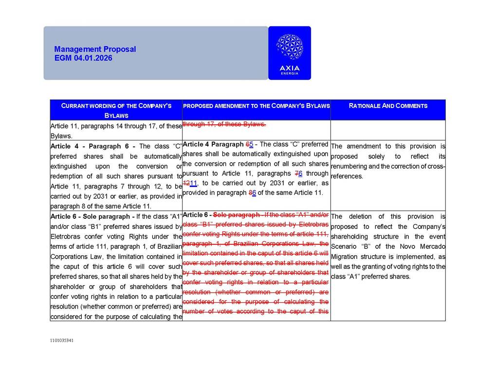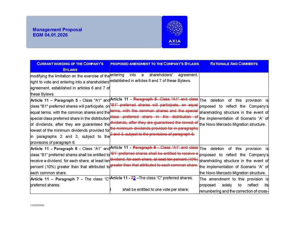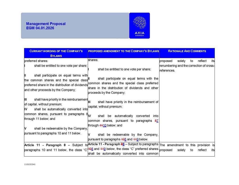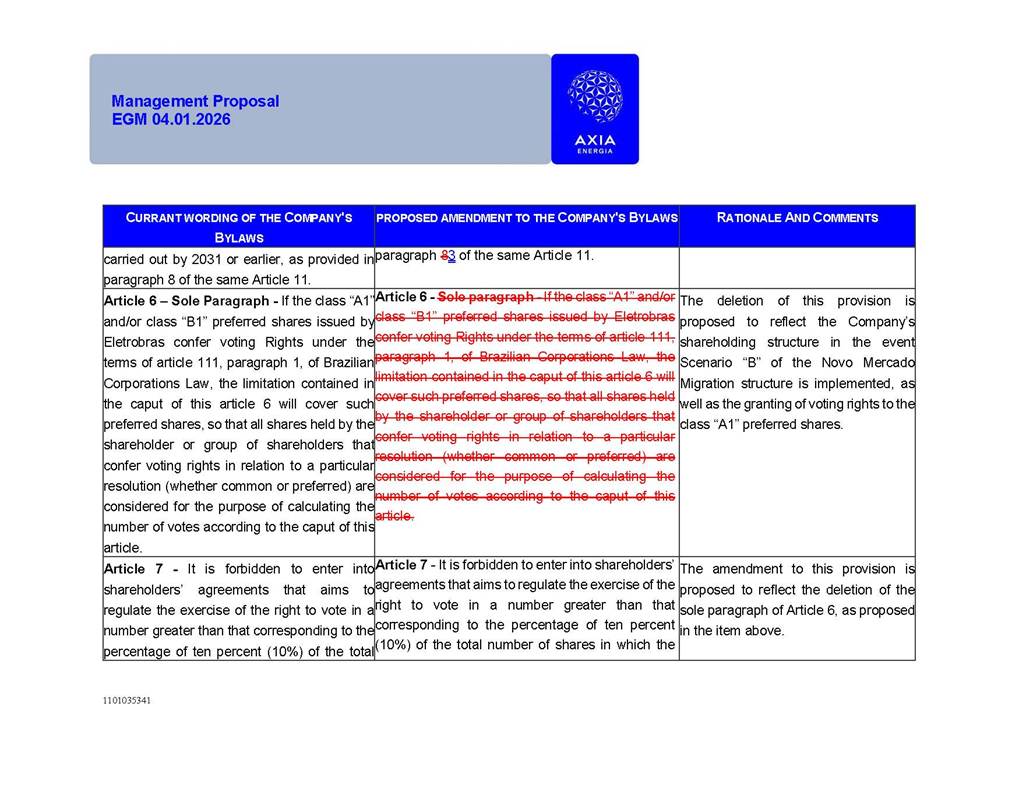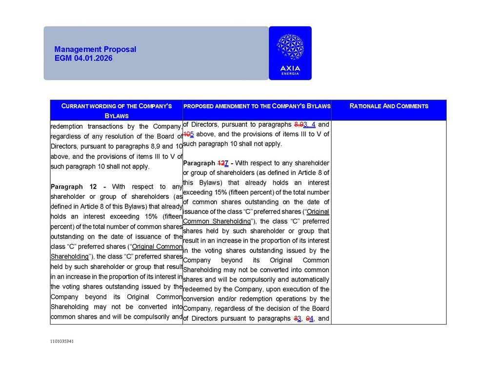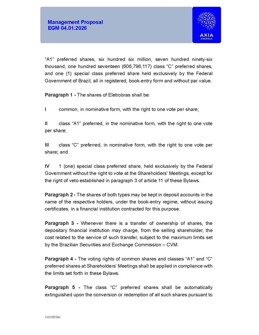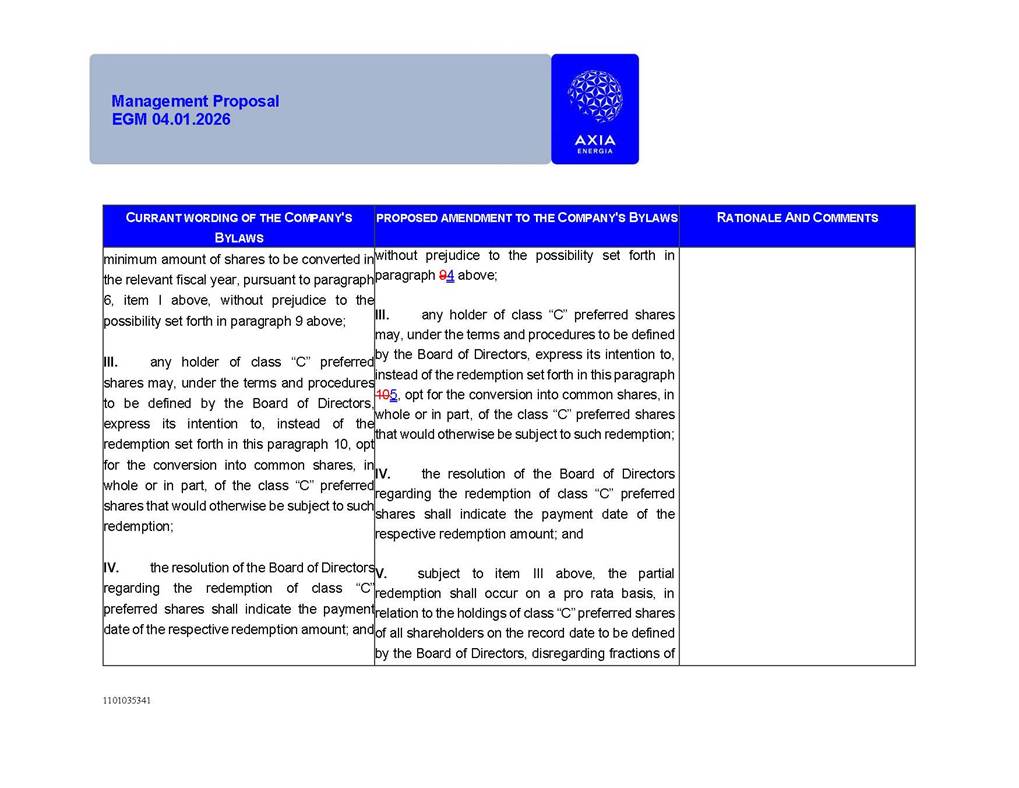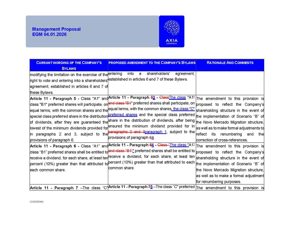 1101035341 Management Proposal EGM 04.01.2026 Management Proposal EGM 04.01.2026 1101035341 Management Proposal EGM 04.01.2026 Index 1. Manual for Participation ................................................................... 47 1.1. Introduction ...................................................................................... 47 1.2. Exclusively Digital Meeting .............................................................. 58 1.3. Remote Voting Ballot (BVD) ............................................................ 69 1.4. Required Documents ..................................................................... 812 1.5. Registration and Accreditation ..................................................... 1013 1.6. Declaration of Membership in a Group of Shareholders .............. 1215 2. Management Proposal .............................................................. 1417 2.1. General Guidelines ...................................................................... 1417 2.2. Agenda ........................................................................................ 1518 2.3. Clarifications on the agenda of the EGM ..................................... 1621 2.4. List of Schedules ......................................................................... 3344 2.5. Conclusion ................................................................................... 3545 SCHEDULE 1 ............................................................................................... 3646 SCHEDULE 2 ............................................................................................... 4259 SCHEDULE 3 ............................................................................................... 4664 SCHEDULE 4 ............................................................................................ 101119 SCHEDULE 5 ........................................................................................... 138157 SCHEDULE 6 ........................................................................................... 189208 SCHEDULE 7 ........................................................................................... 193212 SCHEDULE 8 ........................................................................................... 247266 SCHEDULE 9 ........................................................................................... 284304 1101035341 Management Proposal EGM 04.01.2026 1101035341 Management Proposal EGM 04.01.2026 1. Manual for Participation 1.1. Introduction The Management of CENTRAIS ELÉTRICAS BRASILEIRAS S.A. – Eletrobras, a corporation, headquartered in the City of Rio de Janeiro, State of Rio de Janeiro, at Avenida Graça Aranha, No. 26, Store A, Downtown, Zip code 20030-090, registered in the National Registry of Legal Entities (Cadastro Nacional de Pessoas Jurídicas) ("CNPJ") under No. 00.001.180/0001-26 ("Company" or "AXIA Energia"), with its bylaws filed with the Commercial Registry of the State of Rio de Janeiro (Junta Comercial do Estado do Rio de Janeiro) under NIRE 33.3.00346767, registered with the Brazilian Securities and Exchange Commission (Comissão de Valores Mobiliários) ("CVM") as a publicly-held company category "A" under the code 00243-7, with its securities currently admitted to trading on Level 1 of Corporate Governance of B3 S.A. – Brasil, Bolsa, Balcão ("B3"), pursuant to Brazilian Law No. 6,404, of 1976 ("Brazilian Corporate Law"), and CVM Resolution No. 81, of 2022 ("RCVM 81"), presents this Participation Manual, containing the information, documents and clarifications to guide the participation of shareholders at the Company's Extraordinary General Meeting, to be held exclusively digitally, on first call, on April 1, 2026, at 4 p.m., considering, therefore, to be held at the Company's headquarters ("Meeting" or "EGM" and "Manual", respectively), as well as the management proposal regarding the resolutions on the agenda, including the analysis of the matters submitted to the shareholders at the Meeting ("Management Proposal"). The Company's Management clarifies that, on this same date, it is also disclosing the call notice calling the Special Meeting of Class "A1" Preferred Shareholders ("PNA1") ("PNA1 Special Meeting") and the Special Meeting of Class "B1" Preferred Shareholders ("PNB1") ("PNB1 Special Meeting"), to be held, likewise, on April 1, 2026. As will be detailed in this Management Proposal, the PNA1 Special Meeting and the PNB1 Special Meeting are part of the context of this EGM, being held pursuant to and for the purposes of article 136, §1, of the Brazilian Corporate Law, given that the EGM agenda contemplates proposals for conversion of PNA1 and PNB1 shares. 1101035341 Management Proposal EGM 04.01.2026 1.2. Exclusively Digital Meeting The Meeting will be exclusively digital, to be held through the digital platform of "Atlas AGM" ("Digital Platform"). The exclusively digital format is intended to facilitate the participation of shareholders and others involved in the Meeting, pursuant to the Brazilian Corporate Law, RCVM 81 and the Company's Bylaws. Shareholders who wish to participate in the Meeting must register on the https://atlasagm.com website or through the "Atlas AGM" application available on the Apple Store and Google Play Store ("Application") and submit all documents necessary to qualify for participation or voting at the Meeting by 11:59 p.m. on March 30, 2026. The Digital Platform meets the requirements set forth in article 28, paragraph 1, items I to III, of RCVM 81 and the Meeting will be fully recorded. By accessing the Digital Platform and participating in the Meeting, the Admitted Shareholder (as defined below) authorizes the Company, and third parties authorized by the Company, to record and use the information, in accordance with applicable law. The recordings and related information will be used and processed by the Company for a period of five years, and may be used for the Company's de