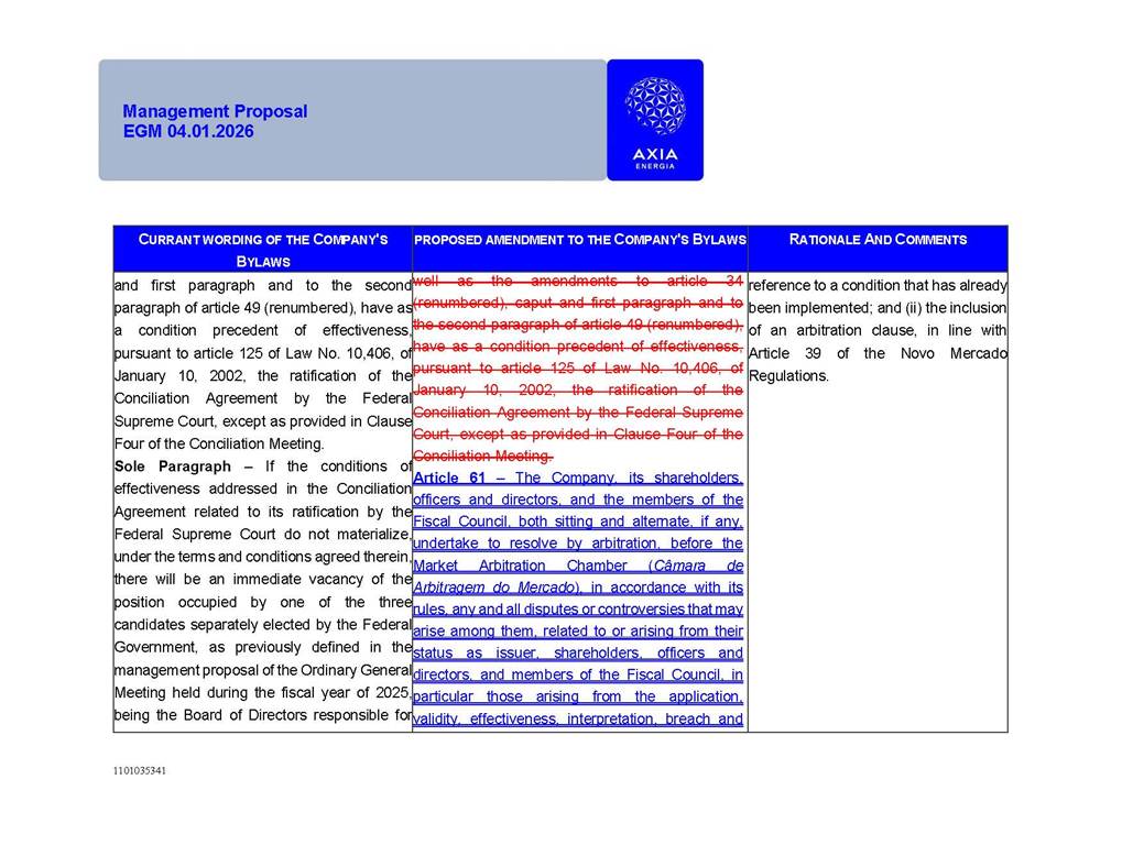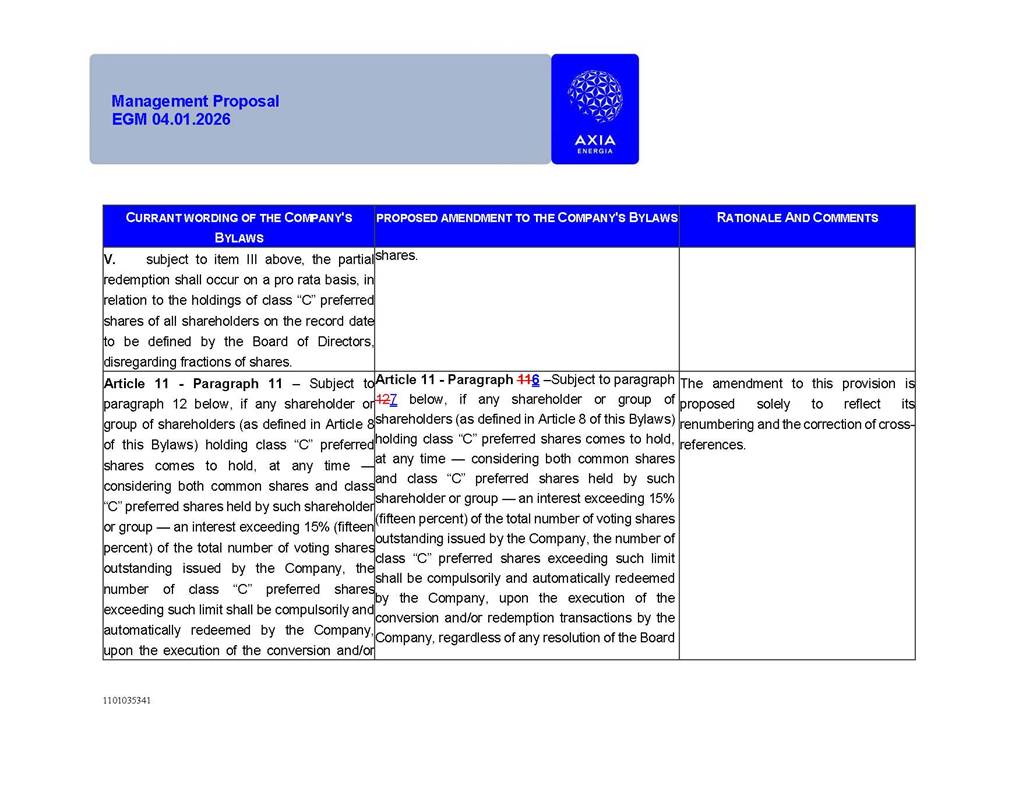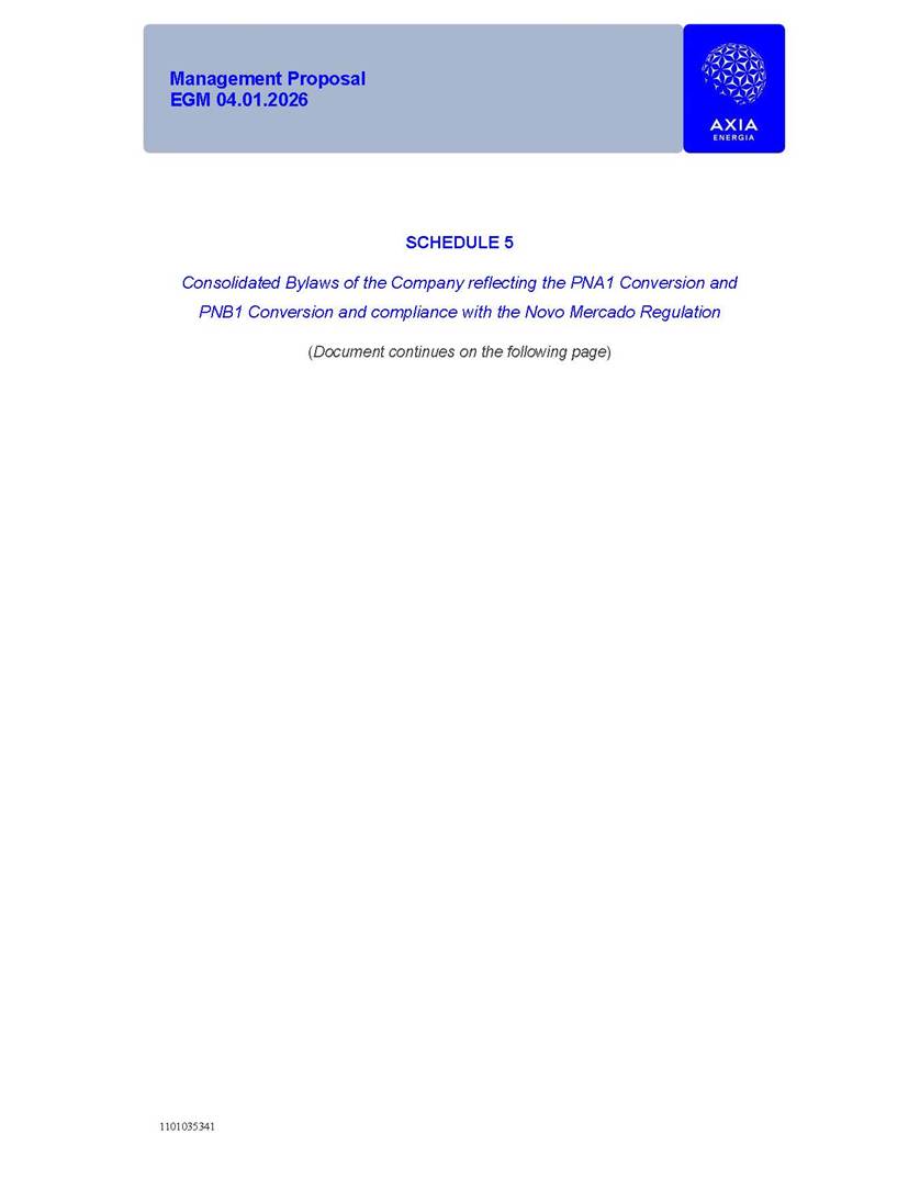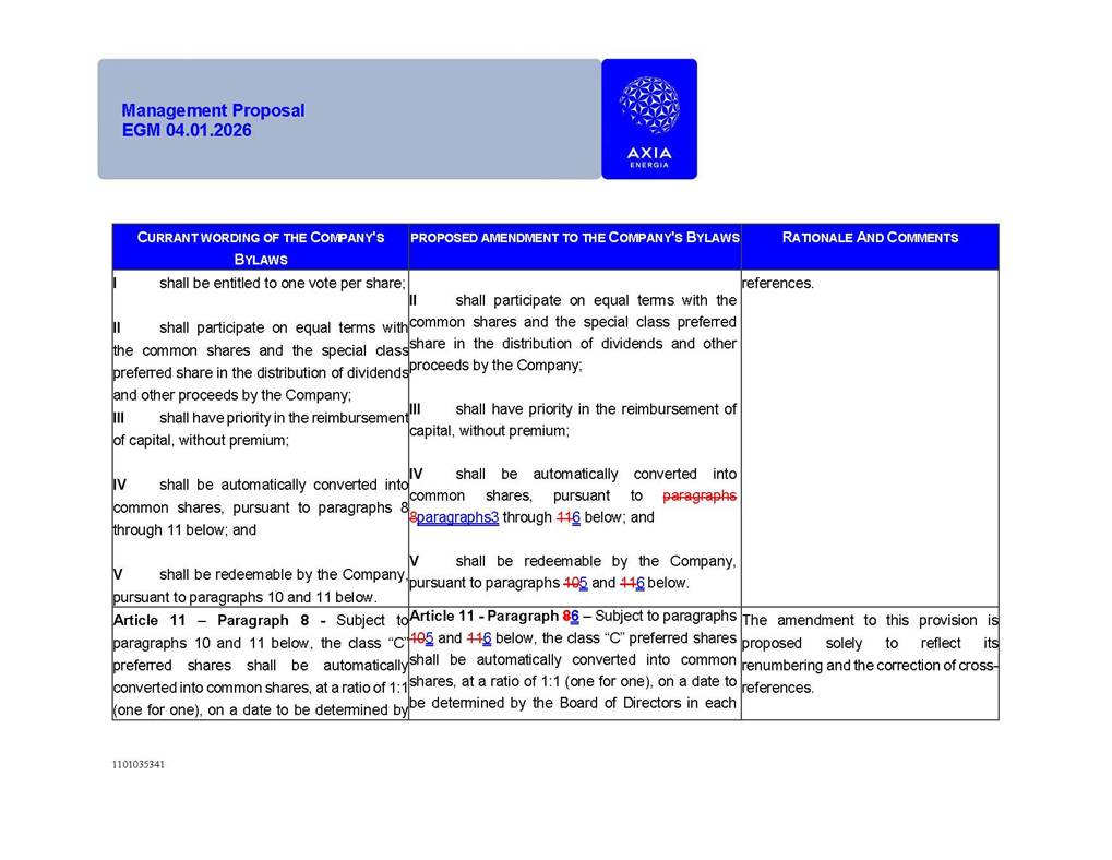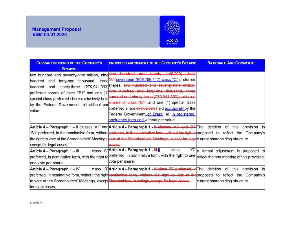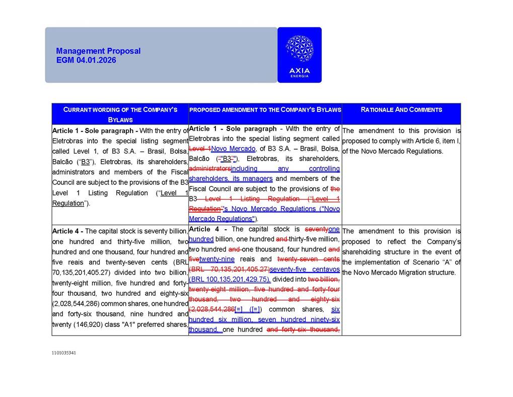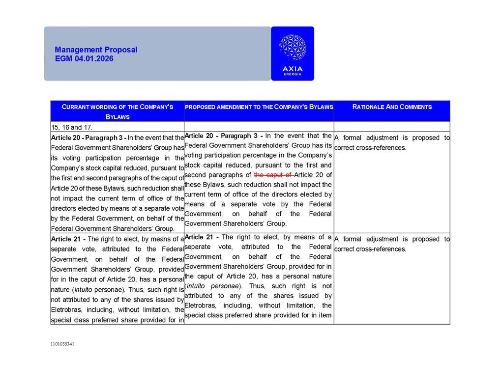 1101035341 Management Proposal EGM 04.01.2026 Management Proposal EGM 04.01.2026 1101035341 Management Proposal EGM 04.01.2026 Index 1. Manual for Participation ................................................................... 47 1.1. Introduction ...................................................................................... 47 1.2. Exclusively Digital Meeting .............................................................. 58 1.3. Remote Voting Ballot (BVD) ............................................................ 69 1.4. Required Documents ..................................................................... 812 1.5. Registration and Accreditation ..................................................... 1013 1.6. Declaration of Membership in a Group of Shareholders .............. 1215 2. Management Proposal .............................................................. 1417 2.1. General Guidelines ...................................................................... 1417 2.2. Agenda ........................................................................................ 1518 2.3. Clarifications on the agenda of the EGM ..................................... 1621 2.4. List of Schedules ......................................................................... 3344 2.5. Conclusion ................................................................................... 3545 SCHEDULE 1 ............................................................................................... 3646 SCHEDULE 2 ............................................................................................... 4259 SCHEDULE 3 ............................................................................................... 4664 SCHEDULE 4 ............................................................................................ 101119 SCHEDULE 5 ........................................................................................... 138157 SCHEDULE 6 ........................................................................................... 189208 SCHEDULE 7 ........................................................................................... 193212 SCHEDULE 8 ........................................................................................... 247266 SCHEDULE 9 ........................................................................................... 284304 1101035341 Management Proposal EGM 04.01.2026 1101035341 Management Proposal EGM 04.01.2026 1. Manual for Participation 1.1. Introduction The Management of CENTRAIS ELÉTRICAS BRASILEIRAS S.A. – Eletrobras, a corporation, headquartered in the City of Rio de Janeiro, State of Rio de Janeiro, at Avenida Graça Aranha, No. 26, Store A, Downtown, Zip code 20030-090, registered in the National Registry of Legal Entities (Cadastro Nacional de Pessoas Jurídicas) ("CNPJ") under No. 00.001.180/0001-26 ("Company" or "AXIA Energia"), with its bylaws filed with the Commercial Registry of the State of Rio de Janeiro (Junta Comercial do Estado do Rio de Janeiro) under NIRE 33.3.00346767, registered with the Brazilian Securities and Exchange Commission (Comissão de Valores Mobiliários) ("CVM") as a publicly-held company category "A" under the code 00243-7, with its securities currently admitted to trading on Level 1 of Corporate Governance of B3 S.A. – Brasil, Bolsa, Balcão ("B3"), pursuant to Brazilian Law No. 6,404, of 1976 ("Brazilian Corporate Law"), and CVM Resolution No. 81, of 2022 ("RCVM 81"), presents this Participation Manual, containing the information, documents and clarifications to guide the participation of shareholders at the Company's Extraordinary General Meeting, to be held exclusively digitally, on first call, on April 1, 2026, at 4 p.m., considering, therefore, to be held at the Company's headquarters ("Meeting" or "EGM" and "Manual", respectively), as well as the management proposal regarding the resolutions on the agenda, including the analysis of the matters submitted to the shareholders at the Meeting ("Management Proposal"). The Company's Management clarifies that, on this same date, it is also disclosing the call notice calling the Special Meeting of Class "A1" Preferred Shareholders ("PNA1") ("PNA1 Special Meeting") and the Special Meeting of Class "B1" Preferred Shareholders ("PNB1") ("PNB1 Special Meeting"), to be held, likewise, on April 1, 2026. As will be detailed in this Management Proposal, the PNA1 Special Meeting and the PNB1 Special Meeting are part of the context of this EGM, being held pursuant to and for the purposes of article 136, §1, of the Brazilian Corporate Law, given that the EGM agenda contemplates proposals for conversion of PNA1 and PNB1 shares. 1101035341 Management Proposal EGM 04.01.2026 1.2. Exclusively Digital Meeting The Meeting will be exclusively digital, to be held through the digital platform of "Atlas AGM" ("Digital Platform"). The exclusively digital format is intended to facilitate the participation of shareholders and others involved in the Meeting, pursuant to the Brazilian Corporate Law, RCVM 81 and the Company's Bylaws. Shareholders who wish to participate in the Meeting must register on the https://atlasagm.com website or through the "Atlas AGM" application available on the Apple Store and Google Play Store ("Application") and submit all documents necessary to qualify for participation or voting at the Meeting by 11:59 p.m. on March 30, 2026. The Digital Platform meets the requirements set forth in article 28, paragraph 1, items I to III, of RCVM 81 and the Meeting will be fully recorded. By accessing the Digital Platform and participating in the Meeting, the Admitted Shareholder (as defined below) authorizes the Company, and third parties authorized by the Company, to record and use the information, in accordance with applicable law. The recordings and related information will be used and processed by the Company for a period of five years, and may be used for the Company's de