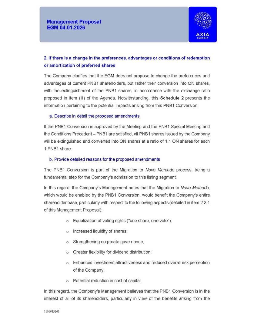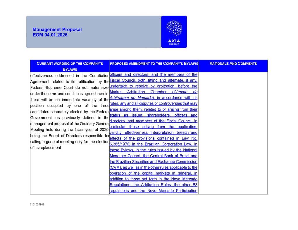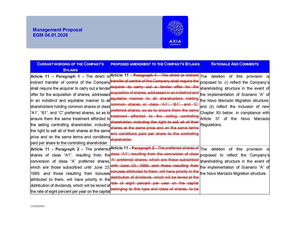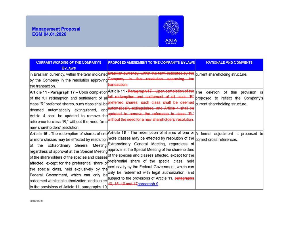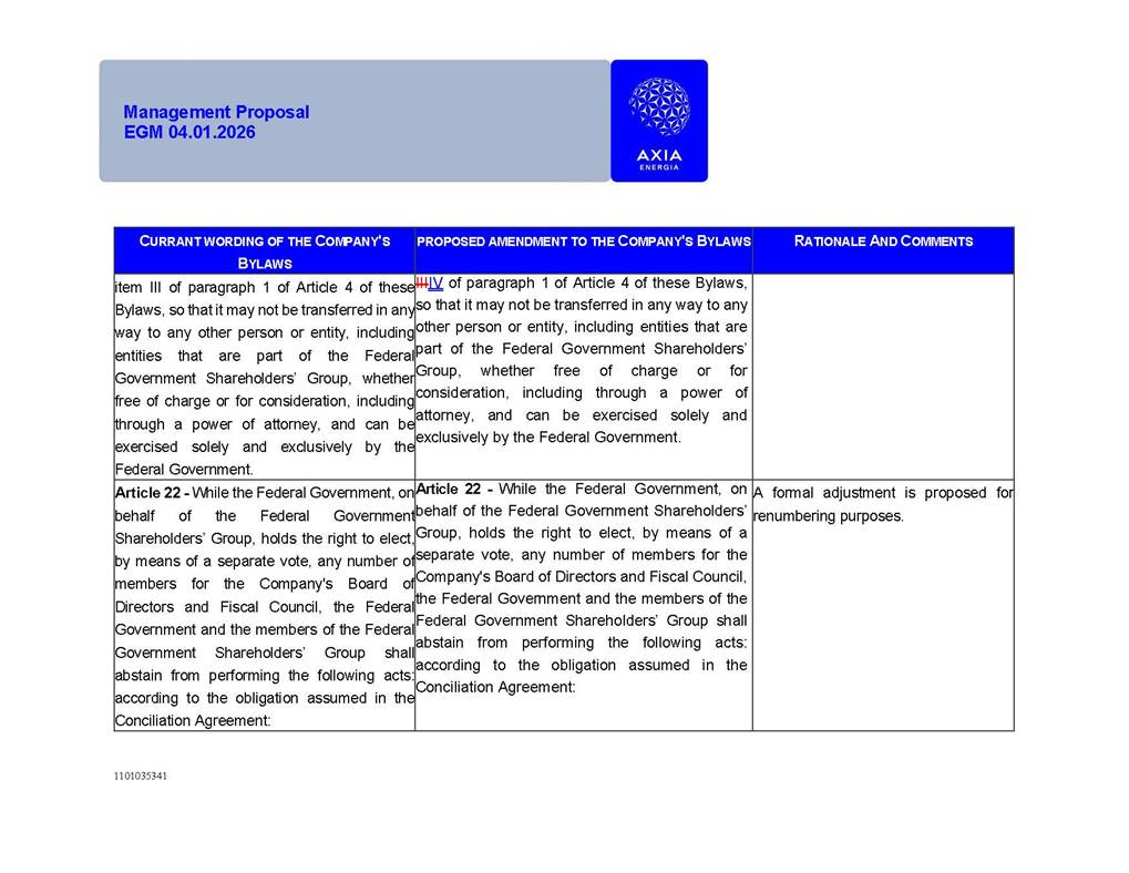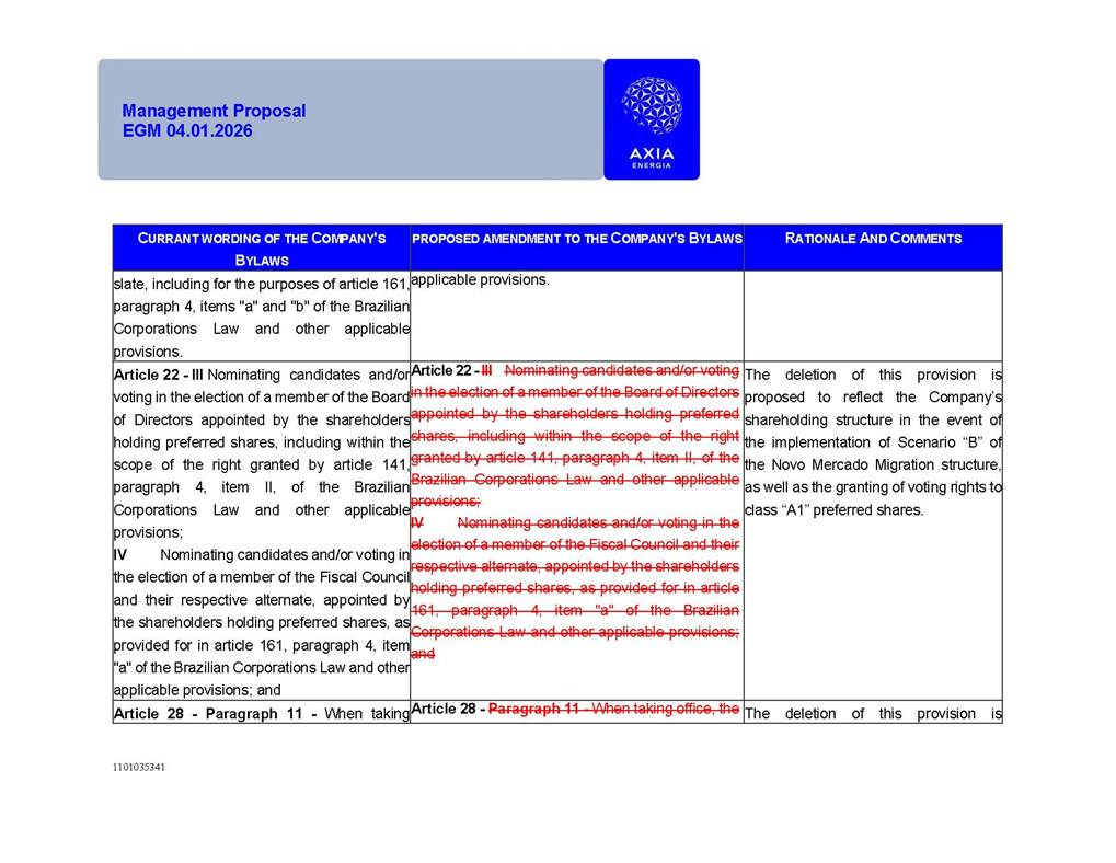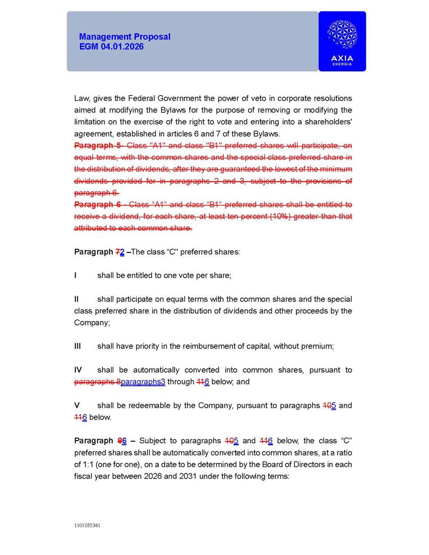 1101035341 Management Proposal EGM 04.01.2026 Management Proposal EGM 04.01.2026 1101035341 Management Proposal EGM 04.01.2026 Index 1. Manual for Participation ................................................................... 47 1.1. Introduction ...................................................................................... 47 1.2. Exclusively Digital Meeting .............................................................. 58 1.3. Remote Voting Ballot (BVD) ............................................................ 69 1.4. Required Documents ..................................................................... 812 1.5. Registration and Accreditation ..................................................... 1013 1.6. Declaration of Membership in a Group of Shareholders .............. 1215 2. Management Proposal .............................................................. 1417 2.1. General Guidelines ...................................................................... 1417 2.2. Agenda ........................................................................................ 1518 2.3. Clarifications on the agenda of the EGM ..................................... 1621 2.4. List of Schedules ......................................................................... 3344 2.5. Conclusion ................................................................................... 3545 SCHEDULE 1 ............................................................................................... 3646 SCHEDULE 2 ............................................................................................... 4259 SCHEDULE 3 ............................................................................................... 4664 SCHEDULE 4 ............................................................................................ 101119 SCHEDULE 5 ........................................................................................... 138157 SCHEDULE 6 ........................................................................................... 189208 SCHEDULE 7 ........................................................................................... 193212 SCHEDULE 8 ........................................................................................... 247266 SCHEDULE 9 ........................................................................................... 284304 1101035341 Management Proposal EGM 04.01.2026 1101035341 Management Proposal EGM 04.01.2026 1. Manual for Participation 1.1. Introduction The Management of CENTRAIS ELÉTRICAS BRASILEIRAS S.A. – Eletrobras, a corporation, headquartered in the City of Rio de Janeiro, State of Rio de Janeiro, at Avenida Graça Aranha, No. 26, Store A, Downtown, Zip code 20030-090, registered in the National Registry of Legal Entities (Cadastro Nacional de Pessoas Jurídicas) ("CNPJ") under No. 00.001.180/0001-26 ("Company" or "AXIA Energia"), with its bylaws filed with the Commercial Registry of the State of Rio de Janeiro (Junta Comercial do Estado do Rio de Janeiro) under NIRE 33.3.00346767, registered with the Brazilian Securities and Exchange Commission (Comissão de Valores Mobiliários) ("CVM") as a publicly-held company category "A" under the code 00243-7, with its securities currently admitted to trading on Level 1 of Corporate Governance of B3 S.A. – Brasil, Bolsa, Balcão ("B3"), pursuant to Brazilian Law No. 6,404, of 1976 ("Brazilian Corporate Law"), and CVM Resolution No. 81, of 2022 ("RCVM 81"), presents this Participation Manual, containing the information, documents and clarifications to guide the participation of shareholders at the Company's Extraordinary General Meeting, to be held exclusively digitally, on first call, on April 1, 2026, at 4 p.m., considering, therefore, to be held at the Company's headquarters ("Meeting" or "EGM" and "Manual", respectively), as well as the management proposal regarding the resolutions on the agenda, including the analysis of the matters submitted to the shareholders at the Meeting ("Management Proposal"). The Company's Management clarifies that, on this same date, it is also disclosing the call notice calling the Special Meeting of Class "A1" Preferred Shareholders ("PNA1") ("PNA1 Special Meeting") and the Special Meeting of Class "B1" Preferred Shareholders ("PNB1") ("PNB1 Special Meeting"), to be held, likewise, on April 1, 2026. As will be detailed in this Management Proposal, the PNA1 Special Meeting and the PNB1 Special Meeting are part of the context of this EGM, being held pursuant to and for the purposes of article 136, §1, of the Brazilian Corporate Law, given that the EGM agenda contemplates proposals for conversion of PNA1 and PNB1 shares. 1101035341 Management Proposal EGM 04.01.2026 1.2. Exclusively Digital Meeting The Meeting will be exclusively digital, to be held through the digital platform of "Atlas AGM" ("Digital Platform"). The exclusively digital format is intended to facilitate the participation of shareholders and others involved in the Meeting, pursuant to the Brazilian Corporate Law, RCVM 81 and the Company's Bylaws. Shareholders who wish to participate in the Meeting must register on the https://atlasagm.com website or through the "Atlas AGM" application available on the Apple Store and Google Play Store ("Application") and submit all documents necessary to qualify for participation or voting at the Meeting by 11:59 p.m. on March 30, 2026. The Digital Platform meets the requirements set forth in article 28, paragraph 1, items I to III, of RCVM 81 and the Meeting will be fully recorded. By accessing the Digital Platform and participating in the Meeting, the Admitted Shareholder (as defined below) authorizes the Company, and third parties authorized by the Company, to record and use the information, in accordance with applicable law. The recordings and related information will be used and processed by the Company for a period of five years, and may be used for the Company's de
