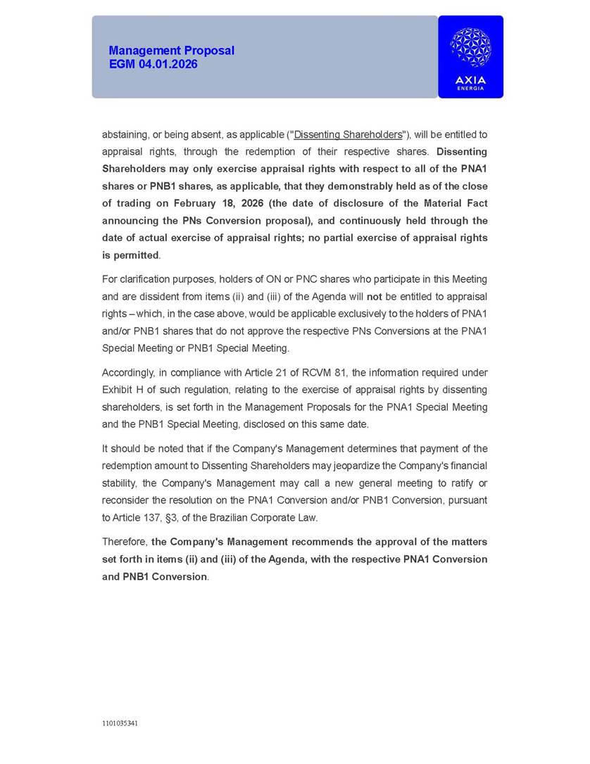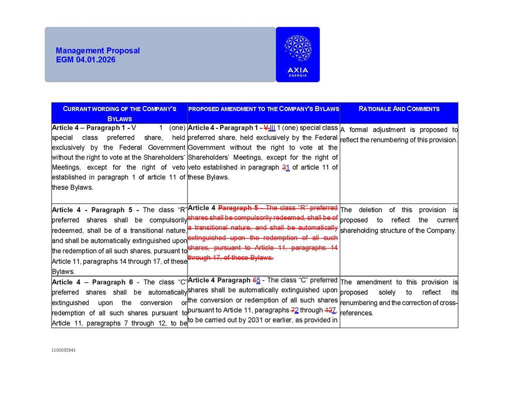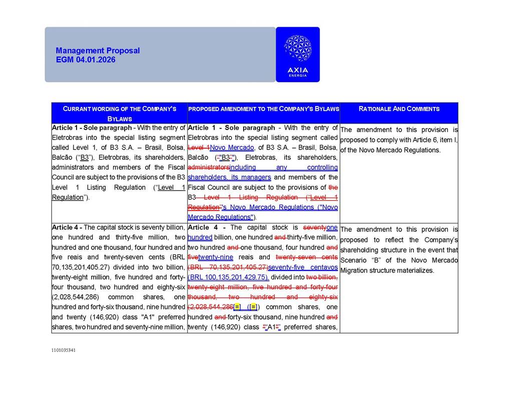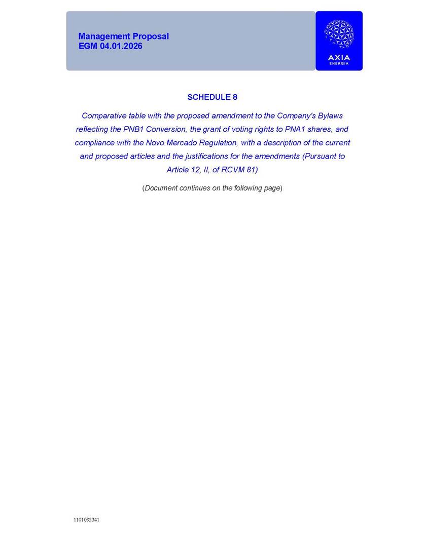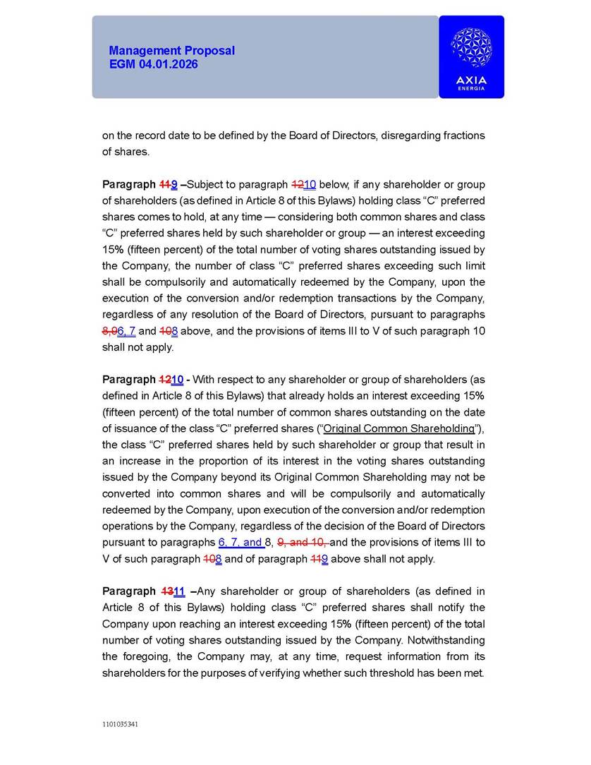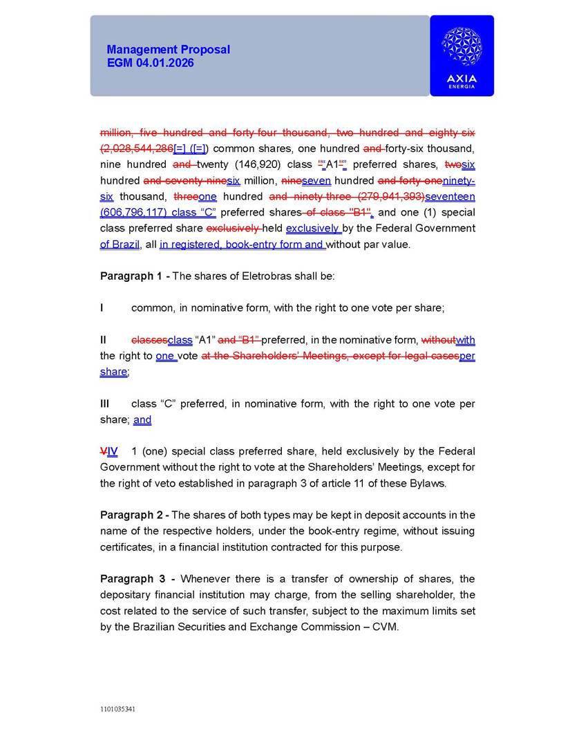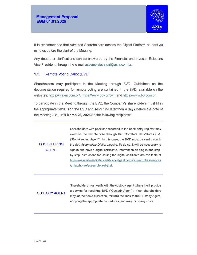 1101035341 Management Proposal EGM 04.01.2026 Management Proposal EGM 04.01.2026 1101035341 Management Proposal EGM 04.01.2026 Index 1. Manual for Participation ................................................................... 47 1.1. Introduction ...................................................................................... 47 1.2. Exclusively Digital Meeting .............................................................. 58 1.3. Remote Voting Ballot (BVD) ............................................................ 69 1.4. Required Documents ..................................................................... 812 1.5. Registration and Accreditation ..................................................... 1013 1.6. Declaration of Membership in a Group of Shareholders .............. 1215 2. Management Proposal .............................................................. 1417 2.1. General Guidelines ...................................................................... 1417 2.2. Agenda ........................................................................................ 1518 2.3. Clarifications on the agenda of the EGM ..................................... 1621 2.4. List of Schedules ......................................................................... 3344 2.5. Conclusion ................................................................................... 3545 SCHEDULE 1 ............................................................................................... 3646 SCHEDULE 2 ............................................................................................... 4259 SCHEDULE 3 ............................................................................................... 4664 SCHEDULE 4 ............................................................................................ 101119 SCHEDULE 5 ........................................................................................... 138157 SCHEDULE 6 ........................................................................................... 189208 SCHEDULE 7 ........................................................................................... 193212 SCHEDULE 8 ........................................................................................... 247266 SCHEDULE 9 ........................................................................................... 284304 1101035341 Management Proposal EGM 04.01.2026 1101035341 Management Proposal EGM 04.01.2026 1. Manual for Participation 1.1. Introduction The Management of CENTRAIS ELÉTRICAS BRASILEIRAS S.A. – Eletrobras, a corporation, headquartered in the City of Rio de Janeiro, State of Rio de Janeiro, at Avenida Graça Aranha, No. 26, Store A, Downtown, Zip code 20030-090, registered in the National Registry of Legal Entities (Cadastro Nacional de Pessoas Jurídicas) ("CNPJ") under No. 00.001.180/0001-26 ("Company" or "AXIA Energia"), with its bylaws filed with the Commercial Registry of the State of Rio de Janeiro (Junta Comercial do Estado do Rio de Janeiro) under NIRE 33.3.00346767, registered with the Brazilian Securities and Exchange Commission (Comissão de Valores Mobiliários) ("CVM") as a publicly-held company category "A" under the code 00243-7, with its securities currently admitted to trading on Level 1 of Corporate Governance of B3 S.A. – Brasil, Bolsa, Balcão ("B3"), pursuant to Brazilian Law No. 6,404, of 1976 ("Brazilian Corporate Law"), and CVM Resolution No. 81, of 2022 ("RCVM 81"), presents this Participation Manual, containing the information, documents and clarifications to guide the participation of shareholders at the Company's Extraordinary General Meeting, to be held exclusively digitally, on first call, on April 1, 2026, at 4 p.m., considering, therefore, to be held at the Company's headquarters ("Meeting" or "EGM" and "Manual", respectively), as well as the management proposal regarding the resolutions on the agenda, including the analysis of the matters submitted to the shareholders at the Meeting ("Management Proposal"). The Company's Management clarifies that, on this same date, it is also disclosing the call notice calling the Special Meeting of Class "A1" Preferred Shareholders ("PNA1") ("PNA1 Special Meeting") and the Special Meeting of Class "B1" Preferred Shareholders ("PNB1") ("PNB1 Special Meeting"), to be held, likewise, on April 1, 2026. As will be detailed in this Management Proposal, the PNA1 Special Meeting and the PNB1 Special Meeting are part of the context of this EGM, being held pursuant to and for the purposes of article 136, §1, of the Brazilian Corporate Law, given that the EGM agenda contemplates proposals for conversion of PNA1 and PNB1 shares. 1101035341 Management Proposal EGM 04.01.2026 1.2. Exclusively Digital Meeting The Meeting will be exclusively digital, to be held through the digital platform of "Atlas AGM" ("Digital Platform"). The exclusively digital format is intended to facilitate the participation of shareholders and others involved in the Meeting, pursuant to the Brazilian Corporate Law, RCVM 81 and the Company's Bylaws. Shareholders who wish to participate in the Meeting must register on the https://atlasagm.com website or through the "Atlas AGM" application available on the Apple Store and Google Play Store ("Application") and submit all documents necessary to qualify for participation or voting at the Meeting by 11:59 p.m. on March 30, 2026. The Digital Platform meets the requirements set forth in article 28, paragraph 1, items I to III, of RCVM 81 and the Meeting will be fully recorded. By accessing the Digital Platform and participating in the Meeting, the Admitted Shareholder (as defined below) authorizes the Company, and third parties authorized by the Company, to record and use the information, in accordance with applicable law. The recordings and related information will be used and processed by the Company for a period of five years, and may be used for the Company's de