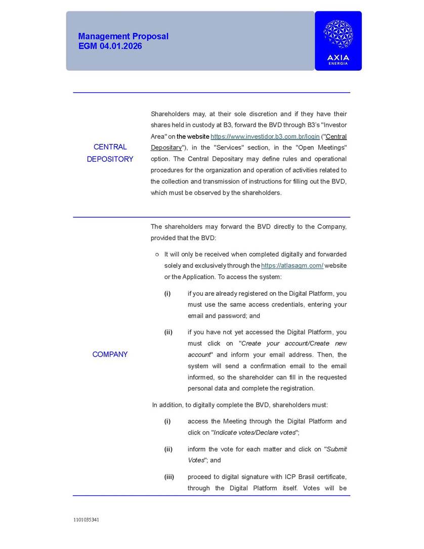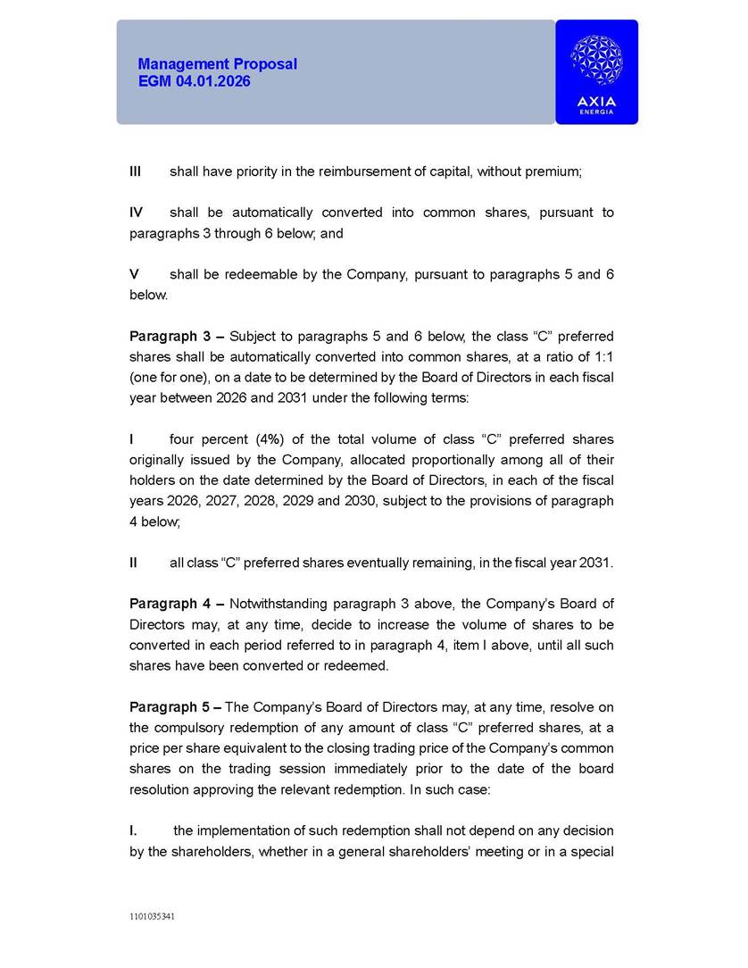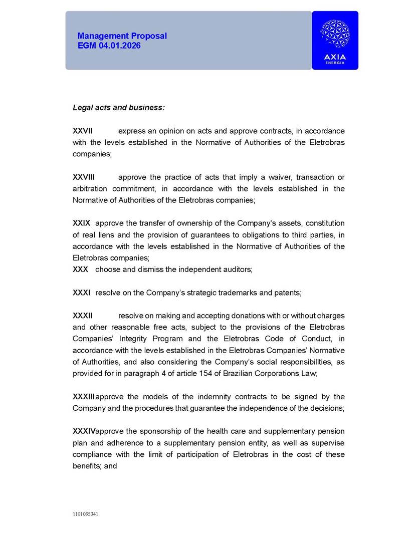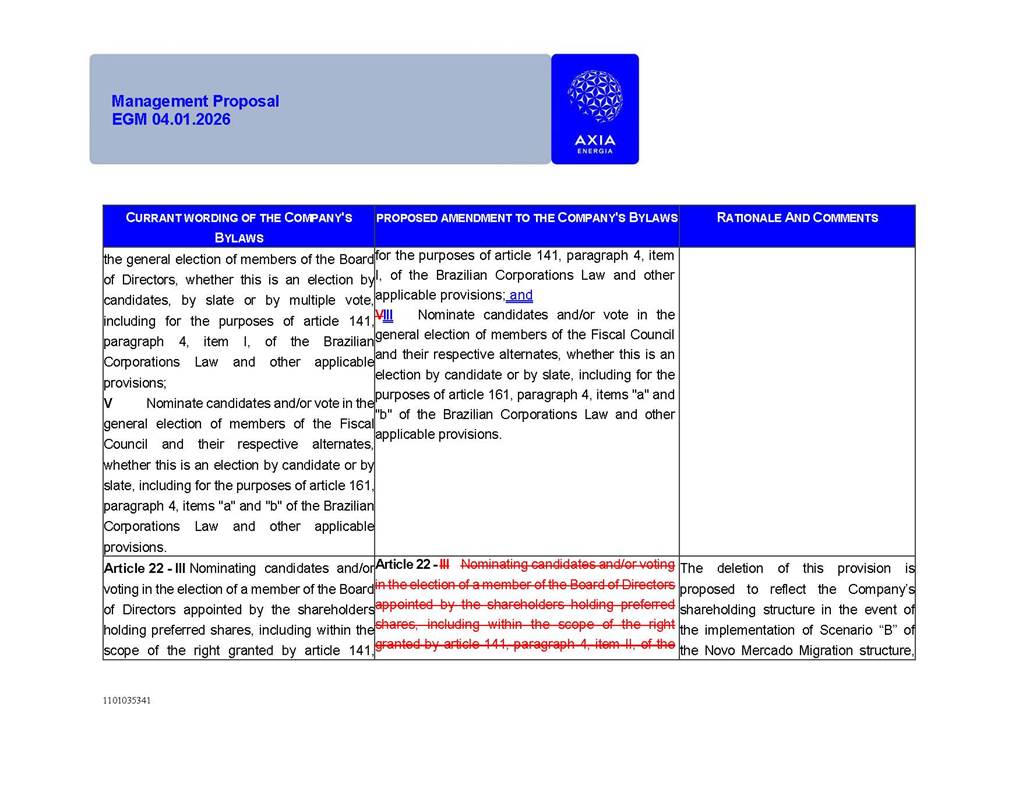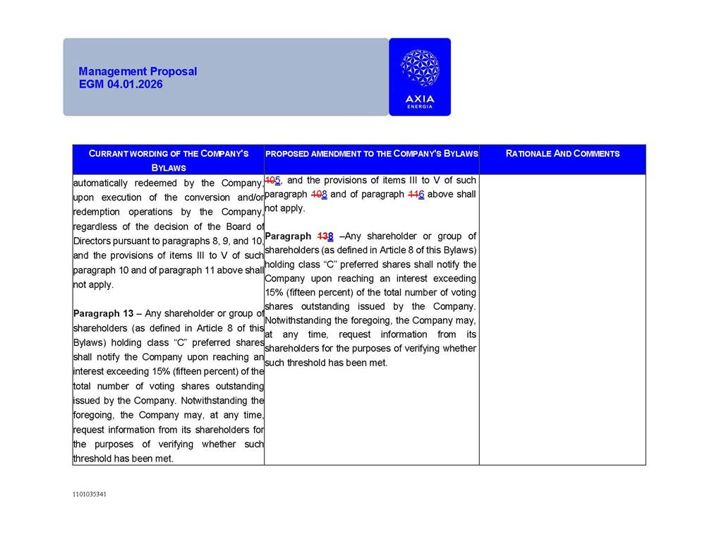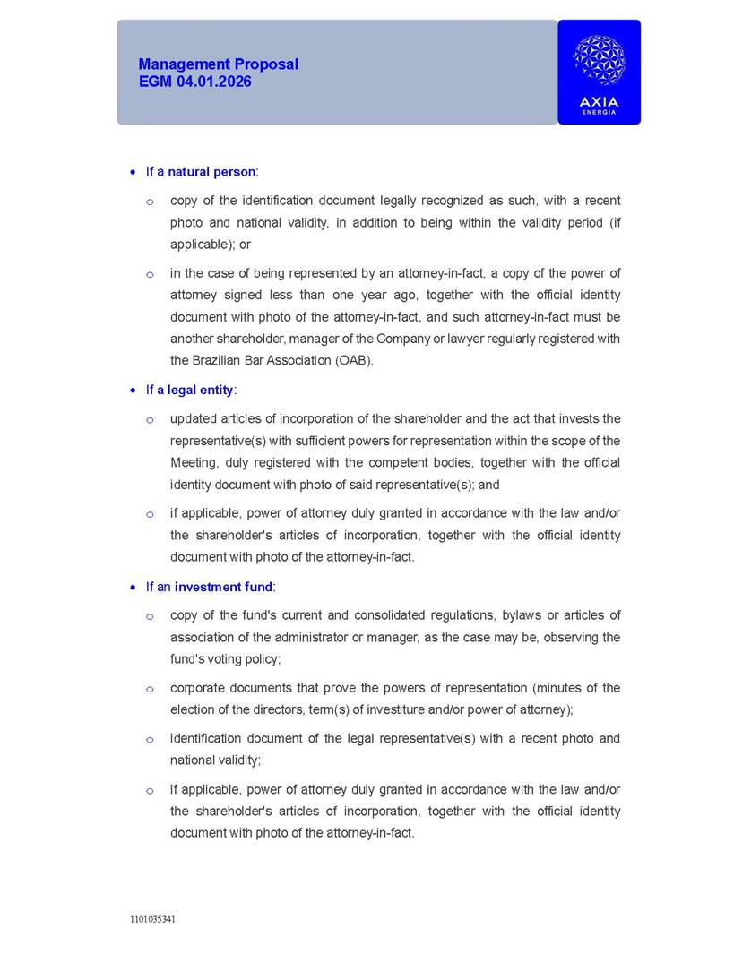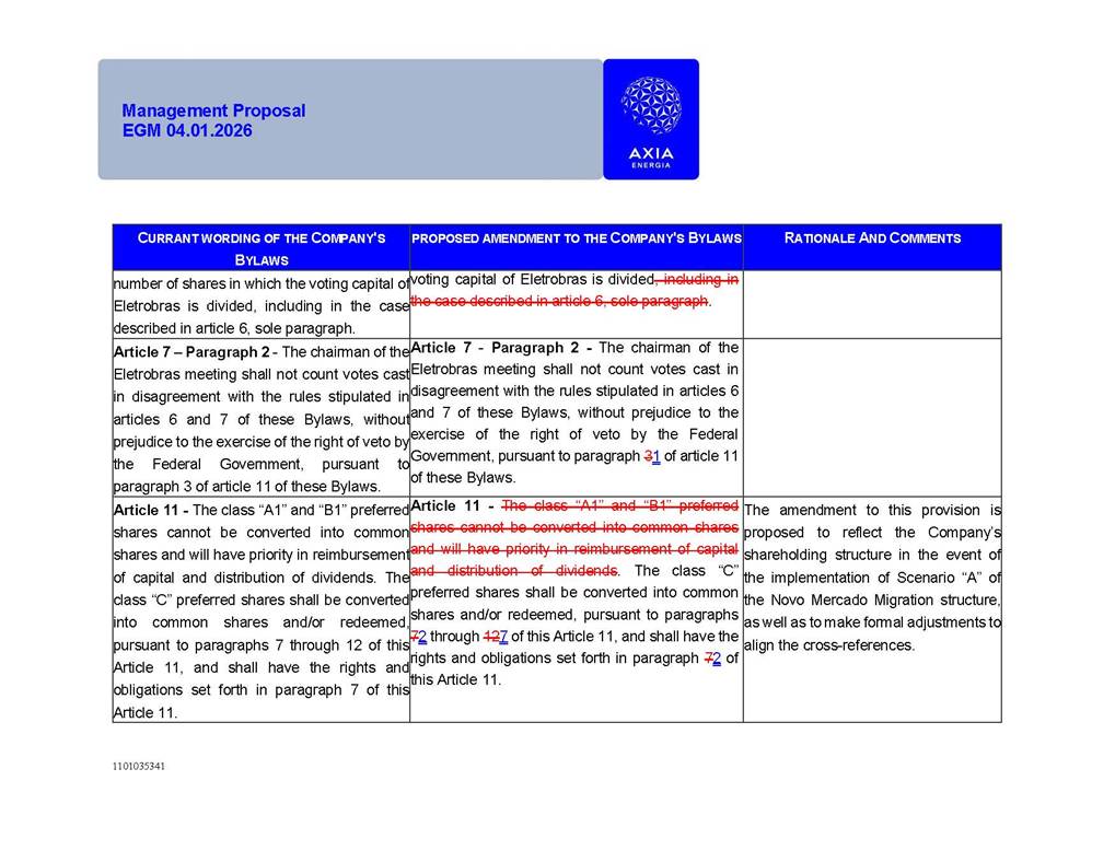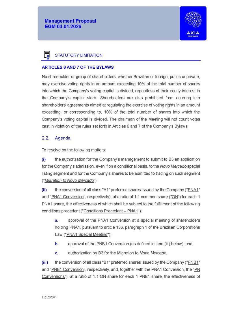 1101035341 Management Proposal EGM 04.01.2026 Management Proposal EGM 04.01.2026 1101035341 Management Proposal EGM 04.01.2026 Index 1. Manual for Participation ................................................................... 47 1.1. Introduction ...................................................................................... 47 1.2. Exclusively Digital Meeting .............................................................. 58 1.3. Remote Voting Ballot (BVD) ............................................................ 69 1.4. Required Documents ..................................................................... 812 1.5. Registration and Accreditation ..................................................... 1013 1.6. Declaration of Membership in a Group of Shareholders .............. 1215 2. Management Proposal .............................................................. 1417 2.1. General Guidelines ...................................................................... 1417 2.2. Agenda ........................................................................................ 1518 2.3. Clarifications on the agenda of the EGM ..................................... 1621 2.4. List of Schedules ......................................................................... 3344 2.5. Conclusion ................................................................................... 3545 SCHEDULE 1 ............................................................................................... 3646 SCHEDULE 2 ............................................................................................... 4259 SCHEDULE 3 ............................................................................................... 4664 SCHEDULE 4 ............................................................................................ 101119 SCHEDULE 5 ........................................................................................... 138157 SCHEDULE 6 ........................................................................................... 189208 SCHEDULE 7 ........................................................................................... 193212 SCHEDULE 8 ........................................................................................... 247266 SCHEDULE 9 ........................................................................................... 284304 1101035341 Management Proposal EGM 04.01.2026 1101035341 Management Proposal EGM 04.01.2026 1. Manual for Participation 1.1. Introduction The Management of CENTRAIS ELÉTRICAS BRASILEIRAS S.A. – Eletrobras, a corporation, headquartered in the City of Rio de Janeiro, State of Rio de Janeiro, at Avenida Graça Aranha, No. 26, Store A, Downtown, Zip code 20030-090, registered in the National Registry of Legal Entities (Cadastro Nacional de Pessoas Jurídicas) ("CNPJ") under No. 00.001.180/0001-26 ("Company" or "AXIA Energia"), with its bylaws filed with the Commercial Registry of the State of Rio de Janeiro (Junta Comercial do Estado do Rio de Janeiro) under NIRE 33.3.00346767, registered with the Brazilian Securities and Exchange Commission (Comissão de Valores Mobiliários) ("CVM") as a publicly-held company category "A" under the code 00243-7, with its securities currently admitted to trading on Level 1 of Corporate Governance of B3 S.A. – Brasil, Bolsa, Balcão ("B3"), pursuant to Brazilian Law No. 6,404, of 1976 ("Brazilian Corporate Law"), and CVM Resolution No. 81, of 2022 ("RCVM 81"), presents this Participation Manual, containing the information, documents and clarifications to guide the participation of shareholders at the Company's Extraordinary General Meeting, to be held exclusively digitally, on first call, on April 1, 2026, at 4 p.m., considering, therefore, to be held at the Company's headquarters ("Meeting" or "EGM" and "Manual", respectively), as well as the management proposal regarding the resolutions on the agenda, including the analysis of the matters submitted to the shareholders at the Meeting ("Management Proposal"). The Company's Management clarifies that, on this same date, it is also disclosing the call notice calling the Special Meeting of Class "A1" Preferred Shareholders ("PNA1") ("PNA1 Special Meeting") and the Special Meeting of Class "B1" Preferred Shareholders ("PNB1") ("PNB1 Special Meeting"), to be held, likewise, on April 1, 2026. As will be detailed in this Management Proposal, the PNA1 Special Meeting and the PNB1 Special Meeting are part of the context of this EGM, being held pursuant to and for the purposes of article 136, §1, of the Brazilian Corporate Law, given that the EGM agenda contemplates proposals for conversion of PNA1 and PNB1 shares. 1101035341 Management Proposal EGM 04.01.2026 1.2. Exclusively Digital Meeting The Meeting will be exclusively digital, to be held through the digital platform of "Atlas AGM" ("Digital Platform"). The exclusively digital format is intended to facilitate the participation of shareholders and others involved in the Meeting, pursuant to the Brazilian Corporate Law, RCVM 81 and the Company's Bylaws. Shareholders who wish to participate in the Meeting must register on the https://atlasagm.com website or through the "Atlas AGM" application available on the Apple Store and Google Play Store ("Application") and submit all documents necessary to qualify for participation or voting at the Meeting by 11:59 p.m. on March 30, 2026. The Digital Platform meets the requirements set forth in article 28, paragraph 1, items I to III, of RCVM 81 and the Meeting will be fully recorded. By accessing the Digital Platform and participating in the Meeting, the Admitted Shareholder (as defined below) authorizes the Company, and third parties authorized by the Company, to record and use the information, in accordance with applicable law. The recordings and related information will be used and processed by the Company for a period of five years, and may be used for the Company's de