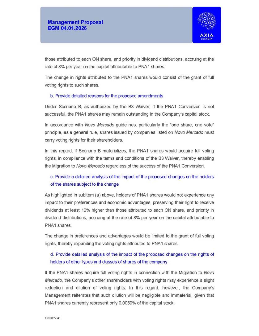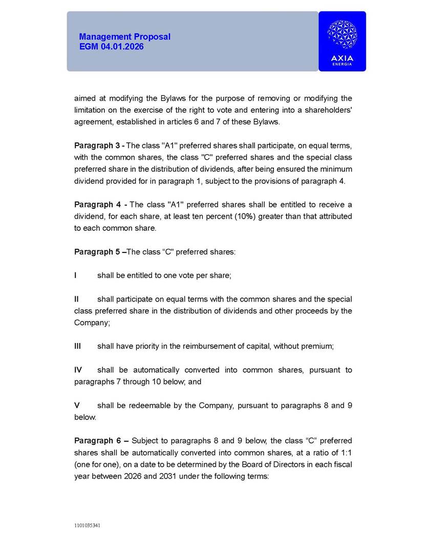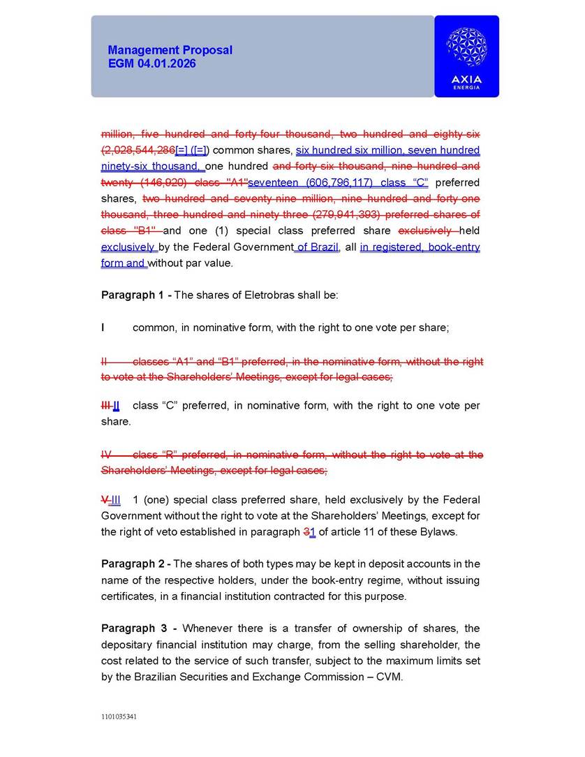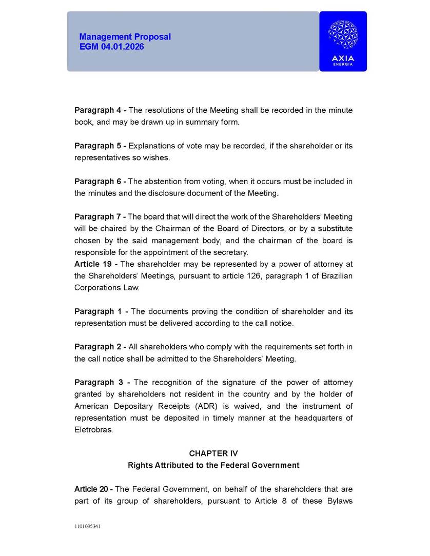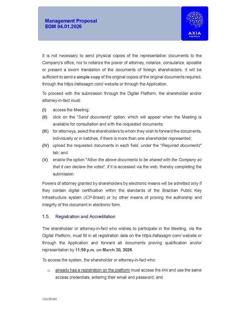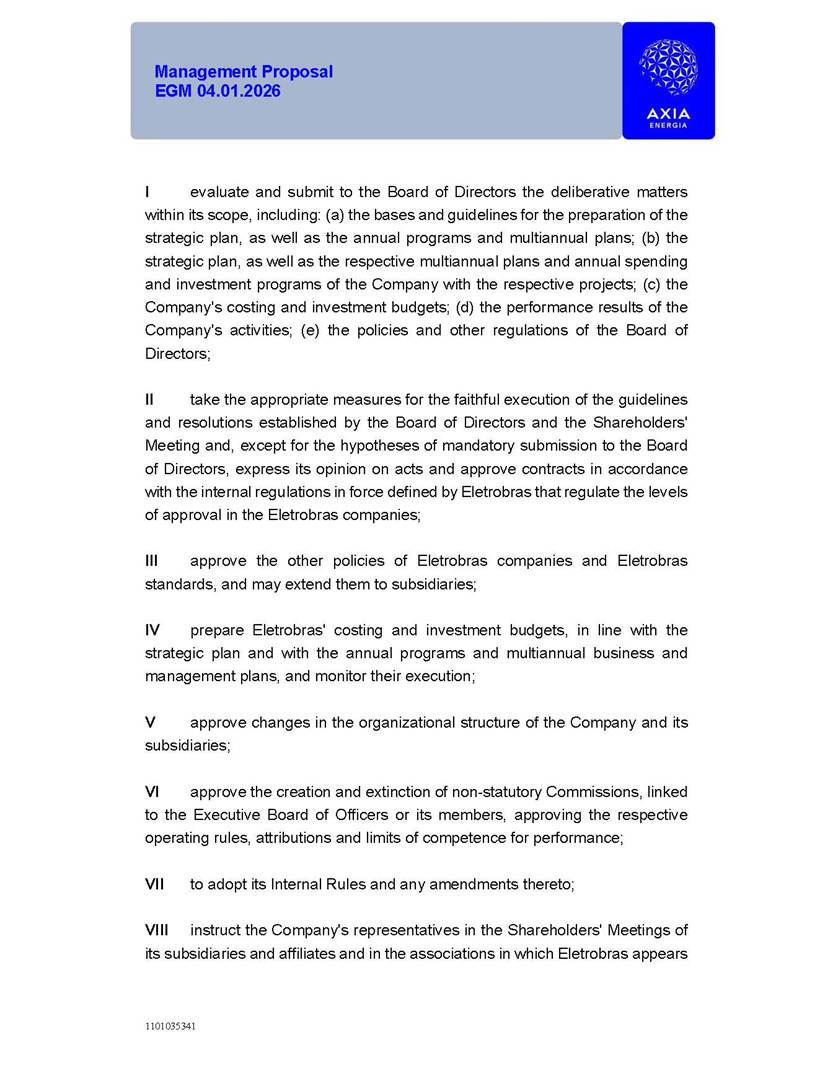 1101035341 Management Proposal EGM 04.01.2026 Management Proposal EGM 04.01.2026 1101035341 Management Proposal EGM 04.01.2026 Index 1. Manual for Participation ................................................................... 47 1.1. Introduction ...................................................................................... 47 1.2. Exclusively Digital Meeting .............................................................. 58 1.3. Remote Voting Ballot (BVD) ............................................................ 69 1.4. Required Documents ..................................................................... 812 1.5. Registration and Accreditation ..................................................... 1013 1.6. Declaration of Membership in a Group of Shareholders .............. 1215 2. Management Proposal .............................................................. 1417 2.1. General Guidelines ...................................................................... 1417 2.2. Agenda ........................................................................................ 1518 2.3. Clarifications on the agenda of the EGM ..................................... 1621 2.4. List of Schedules ......................................................................... 3344 2.5. Conclusion ................................................................................... 3545 SCHEDULE 1 ............................................................................................... 3646 SCHEDULE 2 ............................................................................................... 4259 SCHEDULE 3 ............................................................................................... 4664 SCHEDULE 4 ............................................................................................ 101119 SCHEDULE 5 ........................................................................................... 138157 SCHEDULE 6 ........................................................................................... 189208 SCHEDULE 7 ........................................................................................... 193212 SCHEDULE 8 ........................................................................................... 247266 SCHEDULE 9 ........................................................................................... 284304 1101035341 Management Proposal EGM 04.01.2026 1101035341 Management Proposal EGM 04.01.2026 1. Manual for Participation 1.1. Introduction The Management of CENTRAIS ELÉTRICAS BRASILEIRAS S.A. – Eletrobras, a corporation, headquartered in the City of Rio de Janeiro, State of Rio de Janeiro, at Avenida Graça Aranha, No. 26, Store A, Downtown, Zip code 20030-090, registered in the National Registry of Legal Entities (Cadastro Nacional de Pessoas Jurídicas) ("CNPJ") under No. 00.001.180/0001-26 ("Company" or "AXIA Energia"), with its bylaws filed with the Commercial Registry of the State of Rio de Janeiro (Junta Comercial do Estado do Rio de Janeiro) under NIRE 33.3.00346767, registered with the Brazilian Securities and Exchange Commission (Comissão de Valores Mobiliários) ("CVM") as a publicly-held company category "A" under the code 00243-7, with its securities currently admitted to trading on Level 1 of Corporate Governance of B3 S.A. – Brasil, Bolsa, Balcão ("B3"), pursuant to Brazilian Law No. 6,404, of 1976 ("Brazilian Corporate Law"), and CVM Resolution No. 81, of 2022 ("RCVM 81"), presents this Participation Manual, containing the information, documents and clarifications to guide the participation of shareholders at the Company's Extraordinary General Meeting, to be held exclusively digitally, on first call, on April 1, 2026, at 4 p.m., considering, therefore, to be held at the Company's headquarters ("Meeting" or "EGM" and "Manual", respectively), as well as the management proposal regarding the resolutions on the agenda, including the analysis of the matters submitted to the shareholders at the Meeting ("Management Proposal"). The Company's Management clarifies that, on this same date, it is also disclosing the call notice calling the Special Meeting of Class "A1" Preferred Shareholders ("PNA1") ("PNA1 Special Meeting") and the Special Meeting of Class "B1" Preferred Shareholders ("PNB1") ("PNB1 Special Meeting"), to be held, likewise, on April 1, 2026. As will be detailed in this Management Proposal, the PNA1 Special Meeting and the PNB1 Special Meeting are part of the context of this EGM, being held pursuant to and for the purposes of article 136, §1, of the Brazilian Corporate Law, given that the EGM agenda contemplates proposals for conversion of PNA1 and PNB1 shares. 1101035341 Management Proposal EGM 04.01.2026 1.2. Exclusively Digital Meeting The Meeting will be exclusively digital, to be held through the digital platform of "Atlas AGM" ("Digital Platform"). The exclusively digital format is intended to facilitate the participation of shareholders and others involved in the Meeting, pursuant to the Brazilian Corporate Law, RCVM 81 and the Company's Bylaws. Shareholders who wish to participate in the Meeting must register on the https://atlasagm.com website or through the "Atlas AGM" application available on the Apple Store and Google Play Store ("Application") and submit all documents necessary to qualify for participation or voting at the Meeting by 11:59 p.m. on March 30, 2026. The Digital Platform meets the requirements set forth in article 28, paragraph 1, items I to III, of RCVM 81 and the Meeting will be fully recorded. By accessing the Digital Platform and participating in the Meeting, the Admitted Shareholder (as defined below) authorizes the Company, and third parties authorized by the Company, to record and use the information, in accordance with applicable law. The recordings and related information will be used and processed by the Company for a period of five years, and may be used for the Company's de