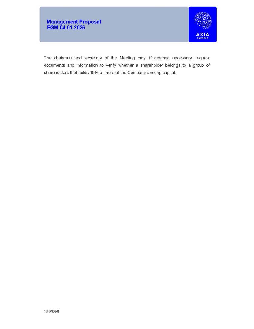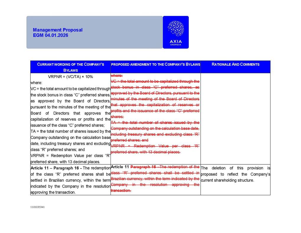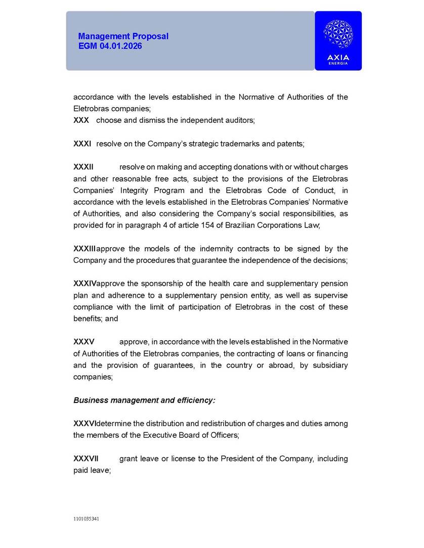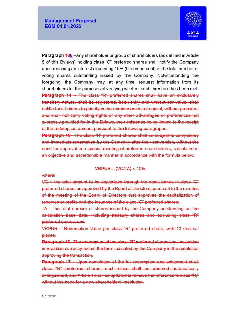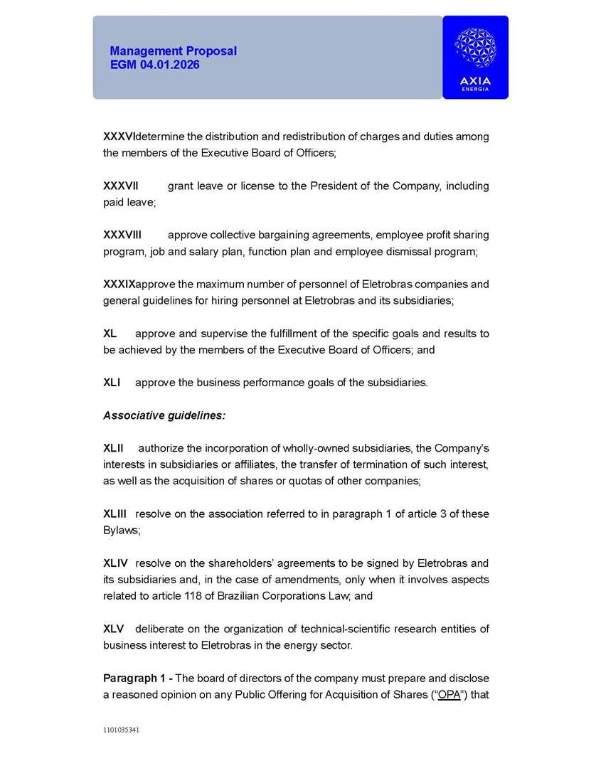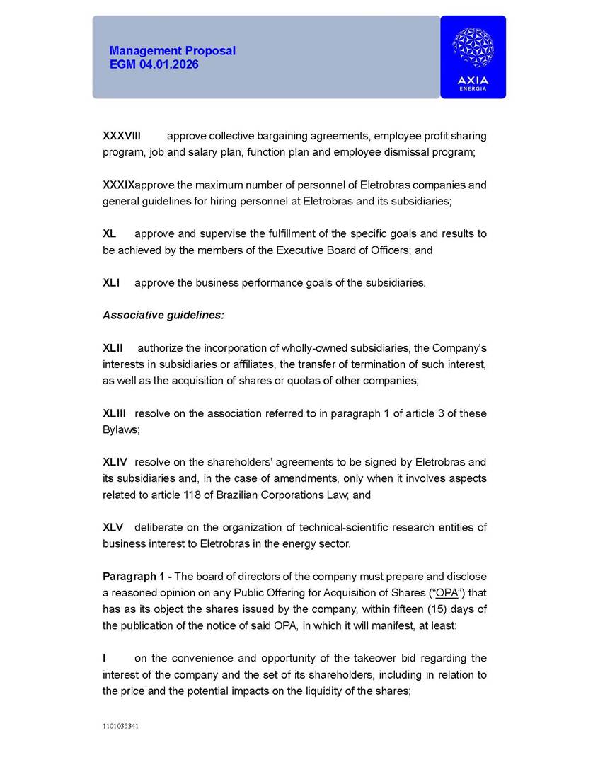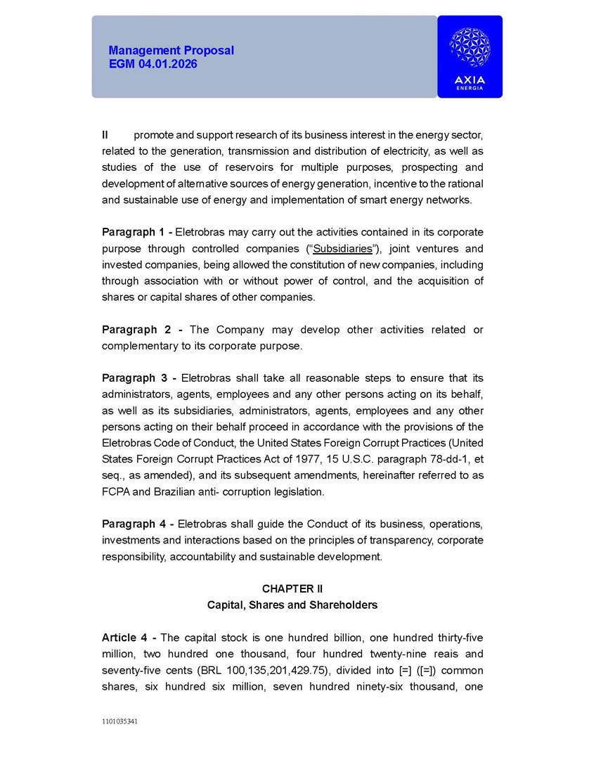 1101035341 Management Proposal EGM 04.01.2026 Management Proposal EGM 04.01.2026 1101035341 Management Proposal EGM 04.01.2026 Index 1. Manual for Participation ................................................................... 47 1.1. Introduction ...................................................................................... 47 1.2. Exclusively Digital Meeting .............................................................. 58 1.3. Remote Voting Ballot (BVD) ............................................................ 69 1.4. Required Documents ..................................................................... 812 1.5. Registration and Accreditation ..................................................... 1013 1.6. Declaration of Membership in a Group of Shareholders .............. 1215 2. Management Proposal .............................................................. 1417 2.1. General Guidelines ...................................................................... 1417 2.2. Agenda ........................................................................................ 1518 2.3. Clarifications on the agenda of the EGM ..................................... 1621 2.4. List of Schedules ......................................................................... 3344 2.5. Conclusion ................................................................................... 3545 SCHEDULE 1 ............................................................................................... 3646 SCHEDULE 2 ............................................................................................... 4259 SCHEDULE 3 ............................................................................................... 4664 SCHEDULE 4 ............................................................................................ 101119 SCHEDULE 5 ........................................................................................... 138157 SCHEDULE 6 ........................................................................................... 189208 SCHEDULE 7 ........................................................................................... 193212 SCHEDULE 8 ........................................................................................... 247266 SCHEDULE 9 ........................................................................................... 284304 1101035341 Management Proposal EGM 04.01.2026 1101035341 Management Proposal EGM 04.01.2026 1. Manual for Participation 1.1. Introduction The Management of CENTRAIS ELÉTRICAS BRASILEIRAS S.A. – Eletrobras, a corporation, headquartered in the City of Rio de Janeiro, State of Rio de Janeiro, at Avenida Graça Aranha, No. 26, Store A, Downtown, Zip code 20030-090, registered in the National Registry of Legal Entities (Cadastro Nacional de Pessoas Jurídicas) ("CNPJ") under No. 00.001.180/0001-26 ("Company" or "AXIA Energia"), with its bylaws filed with the Commercial Registry of the State of Rio de Janeiro (Junta Comercial do Estado do Rio de Janeiro) under NIRE 33.3.00346767, registered with the Brazilian Securities and Exchange Commission (Comissão de Valores Mobiliários) ("CVM") as a publicly-held company category "A" under the code 00243-7, with its securities currently admitted to trading on Level 1 of Corporate Governance of B3 S.A. – Brasil, Bolsa, Balcão ("B3"), pursuant to Brazilian Law No. 6,404, of 1976 ("Brazilian Corporate Law"), and CVM Resolution No. 81, of 2022 ("RCVM 81"), presents this Participation Manual, containing the information, documents and clarifications to guide the participation of shareholders at the Company's Extraordinary General Meeting, to be held exclusively digitally, on first call, on April 1, 2026, at 4 p.m., considering, therefore, to be held at the Company's headquarters ("Meeting" or "EGM" and "Manual", respectively), as well as the management proposal regarding the resolutions on the agenda, including the analysis of the matters submitted to the shareholders at the Meeting ("Management Proposal"). The Company's Management clarifies that, on this same date, it is also disclosing the call notice calling the Special Meeting of Class "A1" Preferred Shareholders ("PNA1") ("PNA1 Special Meeting") and the Special Meeting of Class "B1" Preferred Shareholders ("PNB1") ("PNB1 Special Meeting"), to be held, likewise, on April 1, 2026. As will be detailed in this Management Proposal, the PNA1 Special Meeting and the PNB1 Special Meeting are part of the context of this EGM, being held pursuant to and for the purposes of article 136, §1, of the Brazilian Corporate Law, given that the EGM agenda contemplates proposals for conversion of PNA1 and PNB1 shares. 1101035341 Management Proposal EGM 04.01.2026 1.2. Exclusively Digital Meeting The Meeting will be exclusively digital, to be held through the digital platform of "Atlas AGM" ("Digital Platform"). The exclusively digital format is intended to facilitate the participation of shareholders and others involved in the Meeting, pursuant to the Brazilian Corporate Law, RCVM 81 and the Company's Bylaws. Shareholders who wish to participate in the Meeting must register on the https://atlasagm.com website or through the "Atlas AGM" application available on the Apple Store and Google Play Store ("Application") and submit all documents necessary to qualify for participation or voting at the Meeting by 11:59 p.m. on March 30, 2026. The Digital Platform meets the requirements set forth in article 28, paragraph 1, items I to III, of RCVM 81 and the Meeting will be fully recorded. By accessing the Digital Platform and participating in the Meeting, the Admitted Shareholder (as defined below) authorizes the Company, and third parties authorized by the Company, to record and use the information, in accordance with applicable law. The recordings and related information will be used and processed by the Company for a period of five years, and may be used for the Company's de