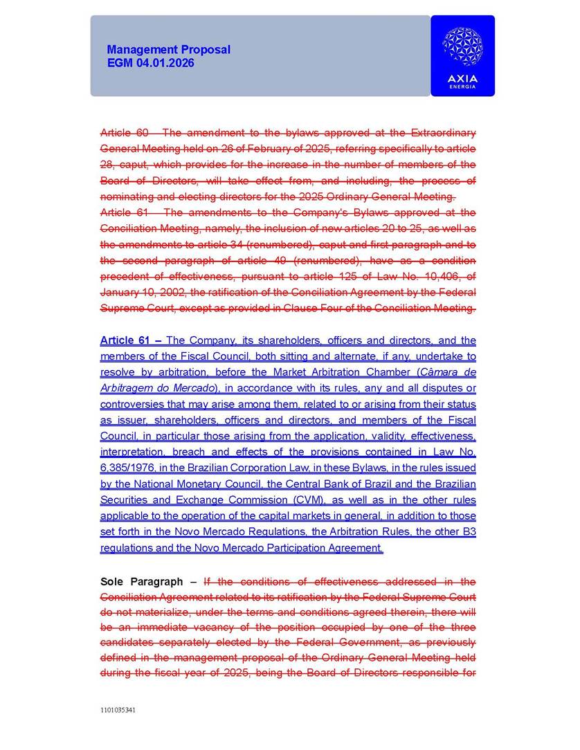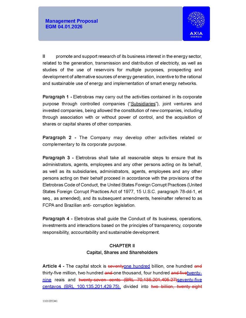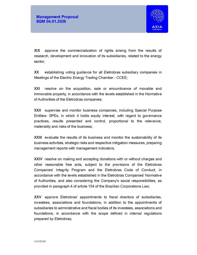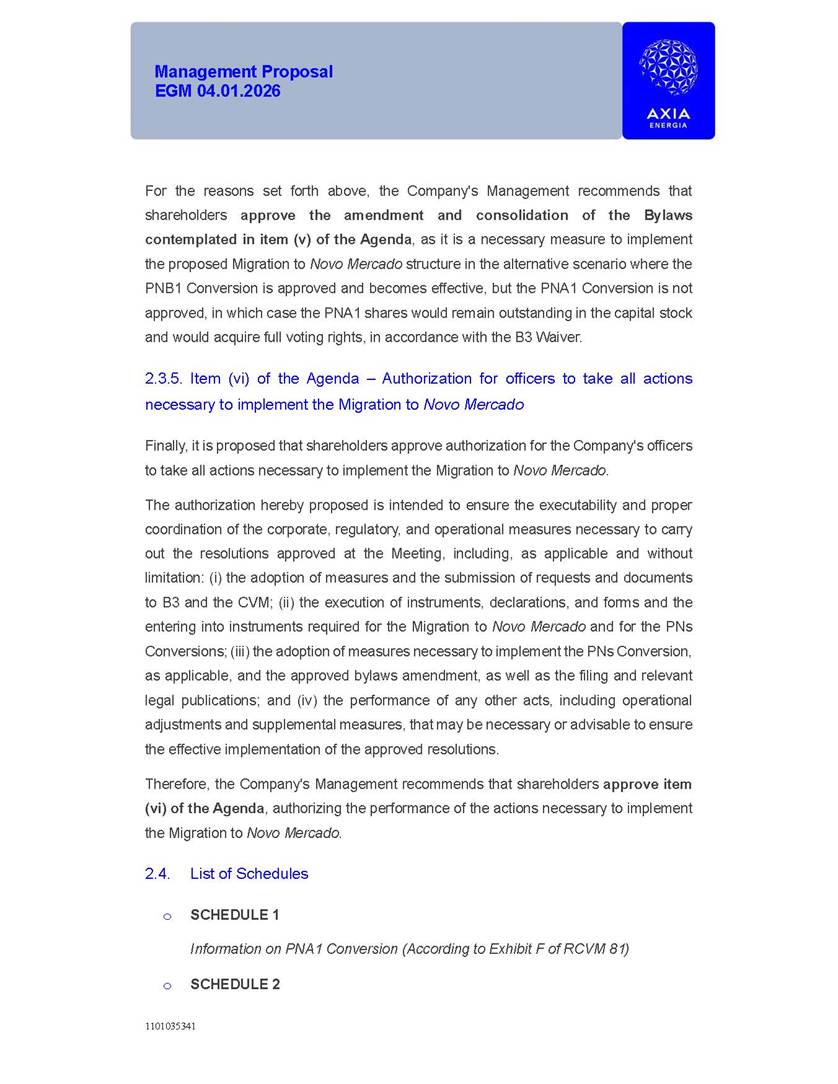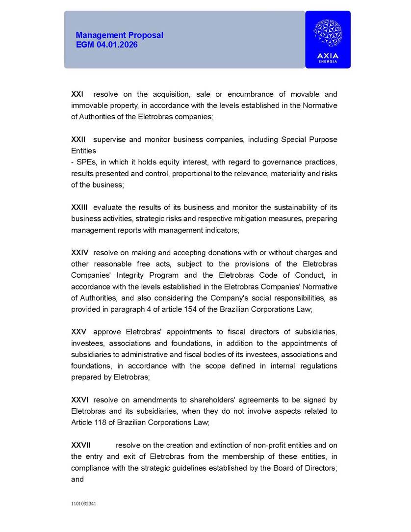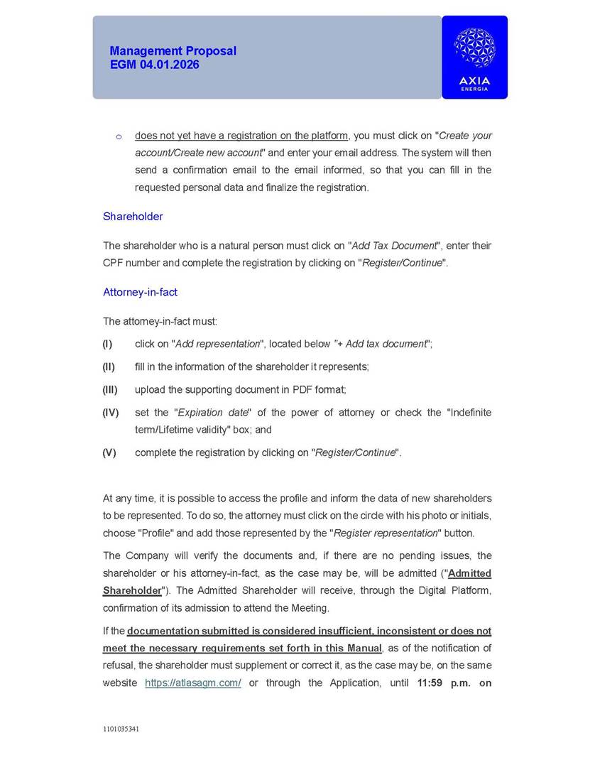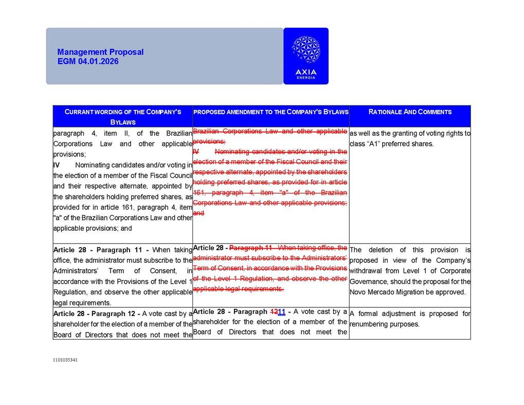 1101035341 Management Proposal EGM 04.01.2026 Management Proposal EGM 04.01.2026 1101035341 Management Proposal EGM 04.01.2026 Index 1. Manual for Participation ................................................................... 47 1.1. Introduction ...................................................................................... 47 1.2. Exclusively Digital Meeting .............................................................. 58 1.3. Remote Voting Ballot (BVD) ............................................................ 69 1.4. Required Documents ..................................................................... 812 1.5. Registration and Accreditation ..................................................... 1013 1.6. Declaration of Membership in a Group of Shareholders .............. 1215 2. Management Proposal .............................................................. 1417 2.1. General Guidelines ...................................................................... 1417 2.2. Agenda ........................................................................................ 1518 2.3. Clarifications on the agenda of the EGM ..................................... 1621 2.4. List of Schedules ......................................................................... 3344 2.5. Conclusion ................................................................................... 3545 SCHEDULE 1 ............................................................................................... 3646 SCHEDULE 2 ............................................................................................... 4259 SCHEDULE 3 ............................................................................................... 4664 SCHEDULE 4 ............................................................................................ 101119 SCHEDULE 5 ........................................................................................... 138157 SCHEDULE 6 ........................................................................................... 189208 SCHEDULE 7 ........................................................................................... 193212 SCHEDULE 8 ........................................................................................... 247266 SCHEDULE 9 ........................................................................................... 284304 1101035341 Management Proposal EGM 04.01.2026 1101035341 Management Proposal EGM 04.01.2026 1. Manual for Participation 1.1. Introduction The Management of CENTRAIS ELÉTRICAS BRASILEIRAS S.A. – Eletrobras, a corporation, headquartered in the City of Rio de Janeiro, State of Rio de Janeiro, at Avenida Graça Aranha, No. 26, Store A, Downtown, Zip code 20030-090, registered in the National Registry of Legal Entities (Cadastro Nacional de Pessoas Jurídicas) ("CNPJ") under No. 00.001.180/0001-26 ("Company" or "AXIA Energia"), with its bylaws filed with the Commercial Registry of the State of Rio de Janeiro (Junta Comercial do Estado do Rio de Janeiro) under NIRE 33.3.00346767, registered with the Brazilian Securities and Exchange Commission (Comissão de Valores Mobiliários) ("CVM") as a publicly-held company category "A" under the code 00243-7, with its securities currently admitted to trading on Level 1 of Corporate Governance of B3 S.A. – Brasil, Bolsa, Balcão ("B3"), pursuant to Brazilian Law No. 6,404, of 1976 ("Brazilian Corporate Law"), and CVM Resolution No. 81, of 2022 ("RCVM 81"), presents this Participation Manual, containing the information, documents and clarifications to guide the participation of shareholders at the Company's Extraordinary General Meeting, to be held exclusively digitally, on first call, on April 1, 2026, at 4 p.m., considering, therefore, to be held at the Company's headquarters ("Meeting" or "EGM" and "Manual", respectively), as well as the management proposal regarding the resolutions on the agenda, including the analysis of the matters submitted to the shareholders at the Meeting ("Management Proposal"). The Company's Management clarifies that, on this same date, it is also disclosing the call notice calling the Special Meeting of Class "A1" Preferred Shareholders ("PNA1") ("PNA1 Special Meeting") and the Special Meeting of Class "B1" Preferred Shareholders ("PNB1") ("PNB1 Special Meeting"), to be held, likewise, on April 1, 2026. As will be detailed in this Management Proposal, the PNA1 Special Meeting and the PNB1 Special Meeting are part of the context of this EGM, being held pursuant to and for the purposes of article 136, §1, of the Brazilian Corporate Law, given that the EGM agenda contemplates proposals for conversion of PNA1 and PNB1 shares. 1101035341 Management Proposal EGM 04.01.2026 1.2. Exclusively Digital Meeting The Meeting will be exclusively digital, to be held through the digital platform of "Atlas AGM" ("Digital Platform"). The exclusively digital format is intended to facilitate the participation of shareholders and others involved in the Meeting, pursuant to the Brazilian Corporate Law, RCVM 81 and the Company's Bylaws. Shareholders who wish to participate in the Meeting must register on the https://atlasagm.com website or through the "Atlas AGM" application available on the Apple Store and Google Play Store ("Application") and submit all documents necessary to qualify for participation or voting at the Meeting by 11:59 p.m. on March 30, 2026. The Digital Platform meets the requirements set forth in article 28, paragraph 1, items I to III, of RCVM 81 and the Meeting will be fully recorded. By accessing the Digital Platform and participating in the Meeting, the Admitted Shareholder (as defined below) authorizes the Company, and third parties authorized by the Company, to record and use the information, in accordance with applicable law. The recordings and related information will be used and processed by the Company for a period of five years, and may be used for the Company's de