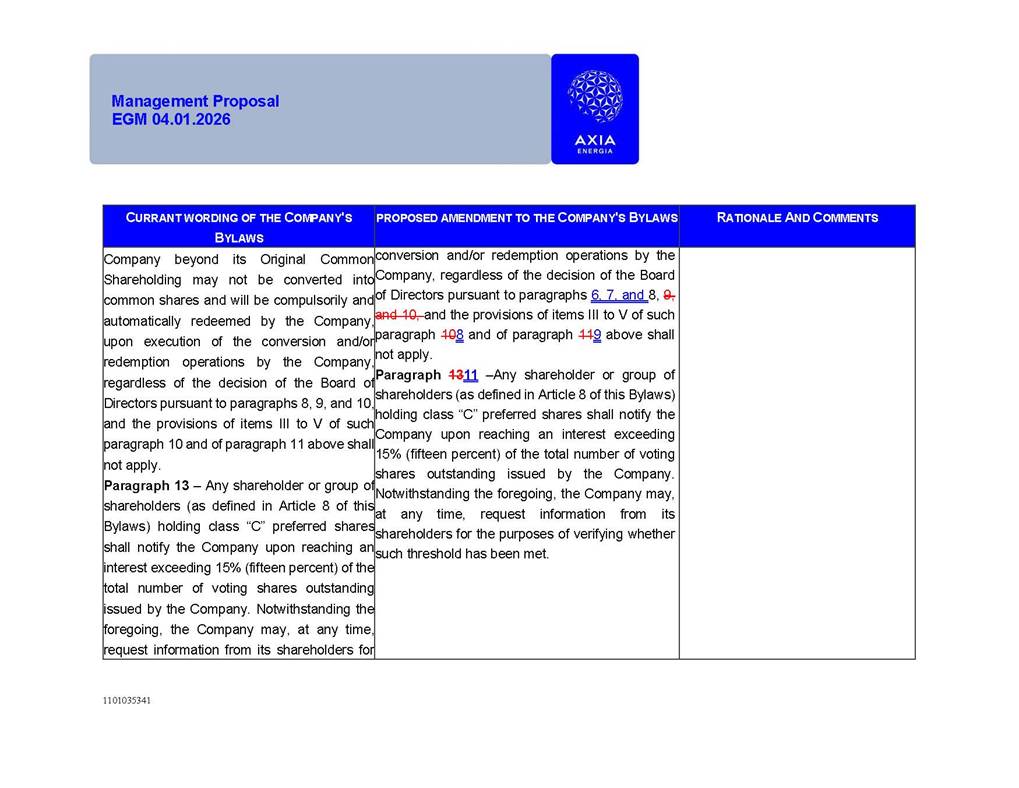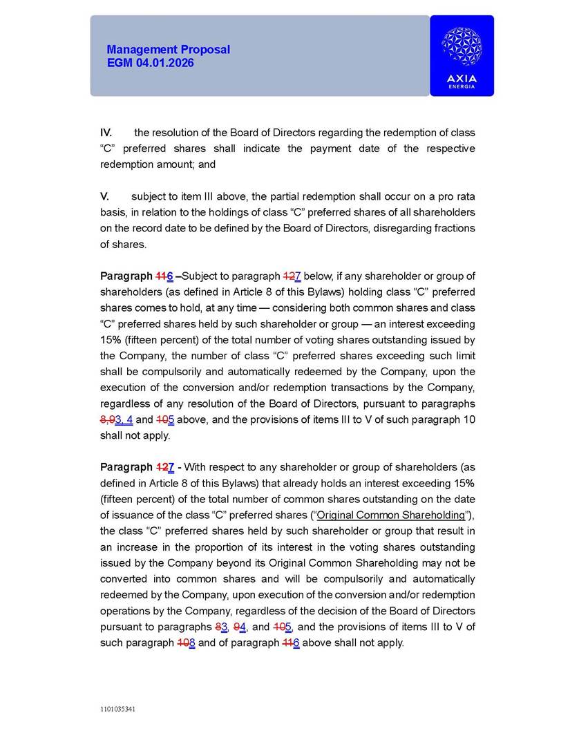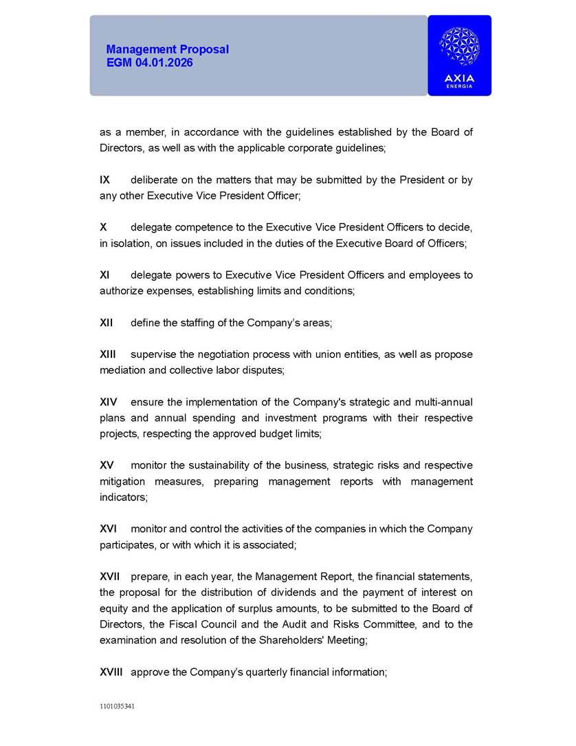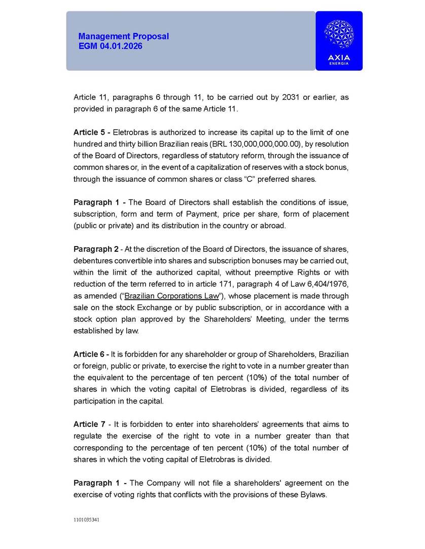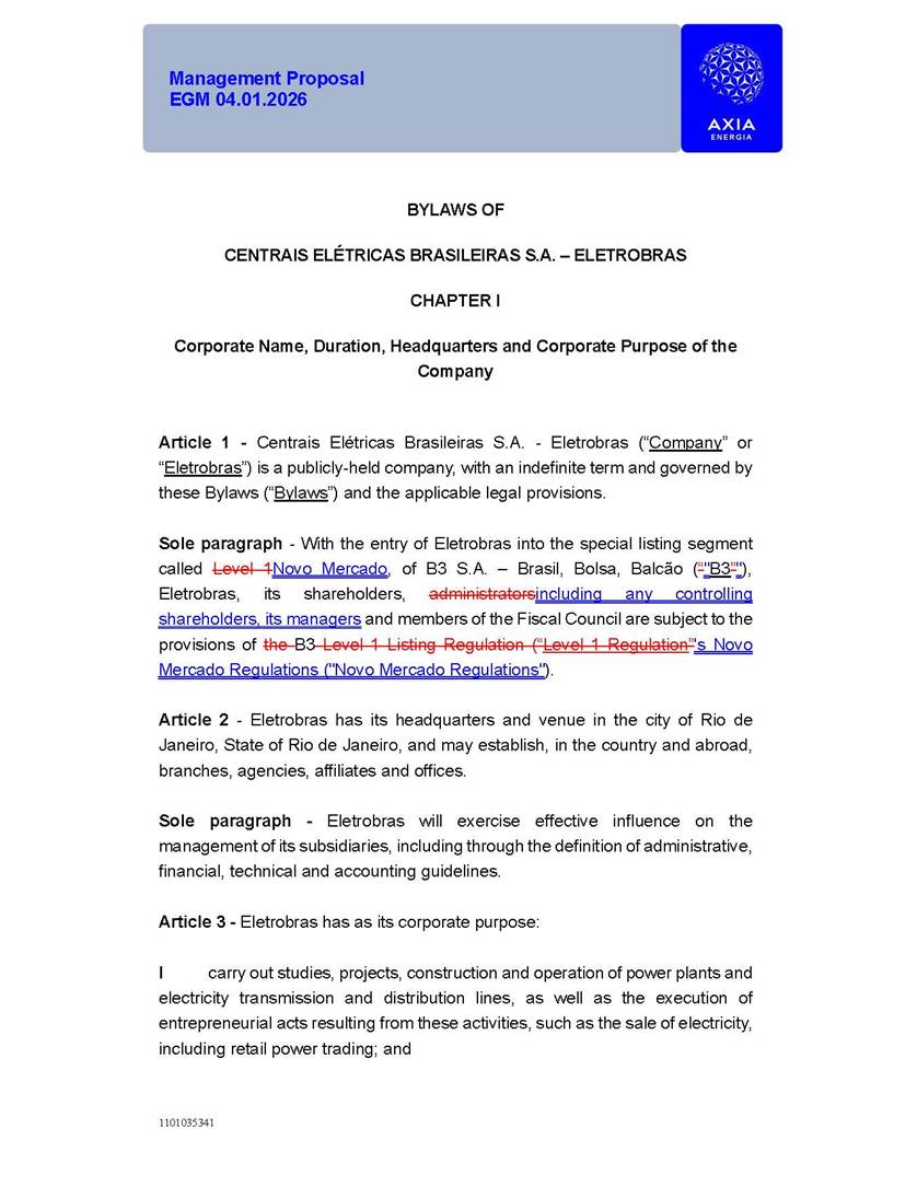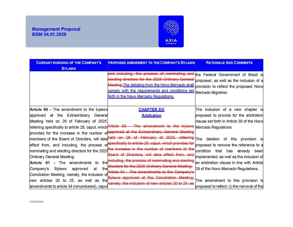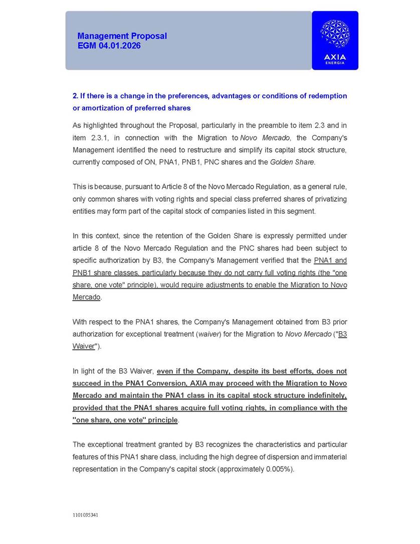 1101035341 Management Proposal EGM 04.01.2026 Management Proposal EGM 04.01.2026 1101035341 Management Proposal EGM 04.01.2026 Index 1. Manual for Participation ................................................................... 47 1.1. Introduction ...................................................................................... 47 1.2. Exclusively Digital Meeting .............................................................. 58 1.3. Remote Voting Ballot (BVD) ............................................................ 69 1.4. Required Documents ..................................................................... 812 1.5. Registration and Accreditation ..................................................... 1013 1.6. Declaration of Membership in a Group of Shareholders .............. 1215 2. Management Proposal .............................................................. 1417 2.1. General Guidelines ...................................................................... 1417 2.2. Agenda ........................................................................................ 1518 2.3. Clarifications on the agenda of the EGM ..................................... 1621 2.4. List of Schedules ......................................................................... 3344 2.5. Conclusion ................................................................................... 3545 SCHEDULE 1 ............................................................................................... 3646 SCHEDULE 2 ............................................................................................... 4259 SCHEDULE 3 ............................................................................................... 4664 SCHEDULE 4 ............................................................................................ 101119 SCHEDULE 5 ........................................................................................... 138157 SCHEDULE 6 ........................................................................................... 189208 SCHEDULE 7 ........................................................................................... 193212 SCHEDULE 8 ........................................................................................... 247266 SCHEDULE 9 ........................................................................................... 284304 1101035341 Management Proposal EGM 04.01.2026 1101035341 Management Proposal EGM 04.01.2026 1. Manual for Participation 1.1. Introduction The Management of CENTRAIS ELÉTRICAS BRASILEIRAS S.A. – Eletrobras, a corporation, headquartered in the City of Rio de Janeiro, State of Rio de Janeiro, at Avenida Graça Aranha, No. 26, Store A, Downtown, Zip code 20030-090, registered in the National Registry of Legal Entities (Cadastro Nacional de Pessoas Jurídicas) ("CNPJ") under No. 00.001.180/0001-26 ("Company" or "AXIA Energia"), with its bylaws filed with the Commercial Registry of the State of Rio de Janeiro (Junta Comercial do Estado do Rio de Janeiro) under NIRE 33.3.00346767, registered with the Brazilian Securities and Exchange Commission (Comissão de Valores Mobiliários) ("CVM") as a publicly-held company category "A" under the code 00243-7, with its securities currently admitted to trading on Level 1 of Corporate Governance of B3 S.A. – Brasil, Bolsa, Balcão ("B3"), pursuant to Brazilian Law No. 6,404, of 1976 ("Brazilian Corporate Law"), and CVM Resolution No. 81, of 2022 ("RCVM 81"), presents this Participation Manual, containing the information, documents and clarifications to guide the participation of shareholders at the Company's Extraordinary General Meeting, to be held exclusively digitally, on first call, on April 1, 2026, at 4 p.m., considering, therefore, to be held at the Company's headquarters ("Meeting" or "EGM" and "Manual", respectively), as well as the management proposal regarding the resolutions on the agenda, including the analysis of the matters submitted to the shareholders at the Meeting ("Management Proposal"). The Company's Management clarifies that, on this same date, it is also disclosing the call notice calling the Special Meeting of Class "A1" Preferred Shareholders ("PNA1") ("PNA1 Special Meeting") and the Special Meeting of Class "B1" Preferred Shareholders ("PNB1") ("PNB1 Special Meeting"), to be held, likewise, on April 1, 2026. As will be detailed in this Management Proposal, the PNA1 Special Meeting and the PNB1 Special Meeting are part of the context of this EGM, being held pursuant to and for the purposes of article 136, §1, of the Brazilian Corporate Law, given that the EGM agenda contemplates proposals for conversion of PNA1 and PNB1 shares. 1101035341 Management Proposal EGM 04.01.2026 1.2. Exclusively Digital Meeting The Meeting will be exclusively digital, to be held through the digital platform of "Atlas AGM" ("Digital Platform"). The exclusively digital format is intended to facilitate the participation of shareholders and others involved in the Meeting, pursuant to the Brazilian Corporate Law, RCVM 81 and the Company's Bylaws. Shareholders who wish to participate in the Meeting must register on the https://atlasagm.com website or through the "Atlas AGM" application available on the Apple Store and Google Play Store ("Application") and submit all documents necessary to qualify for participation or voting at the Meeting by 11:59 p.m. on March 30, 2026. The Digital Platform meets the requirements set forth in article 28, paragraph 1, items I to III, of RCVM 81 and the Meeting will be fully recorded. By accessing the Digital Platform and participating in the Meeting, the Admitted Shareholder (as defined below) authorizes the Company, and third parties authorized by the Company, to record and use the information, in accordance with applicable law. The recordings and related information will be used and processed by the Company for a period of five years, and may be used for the Company's de