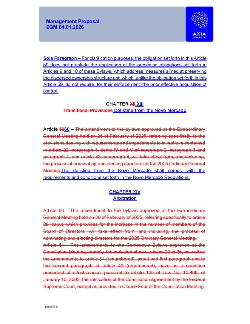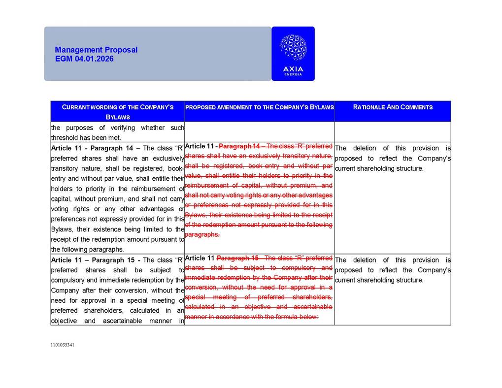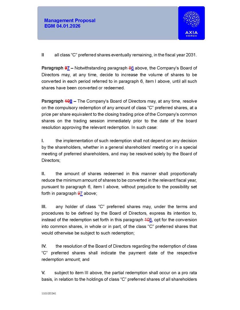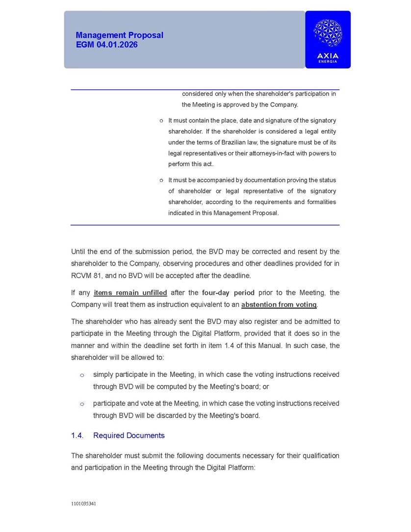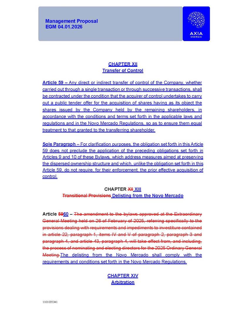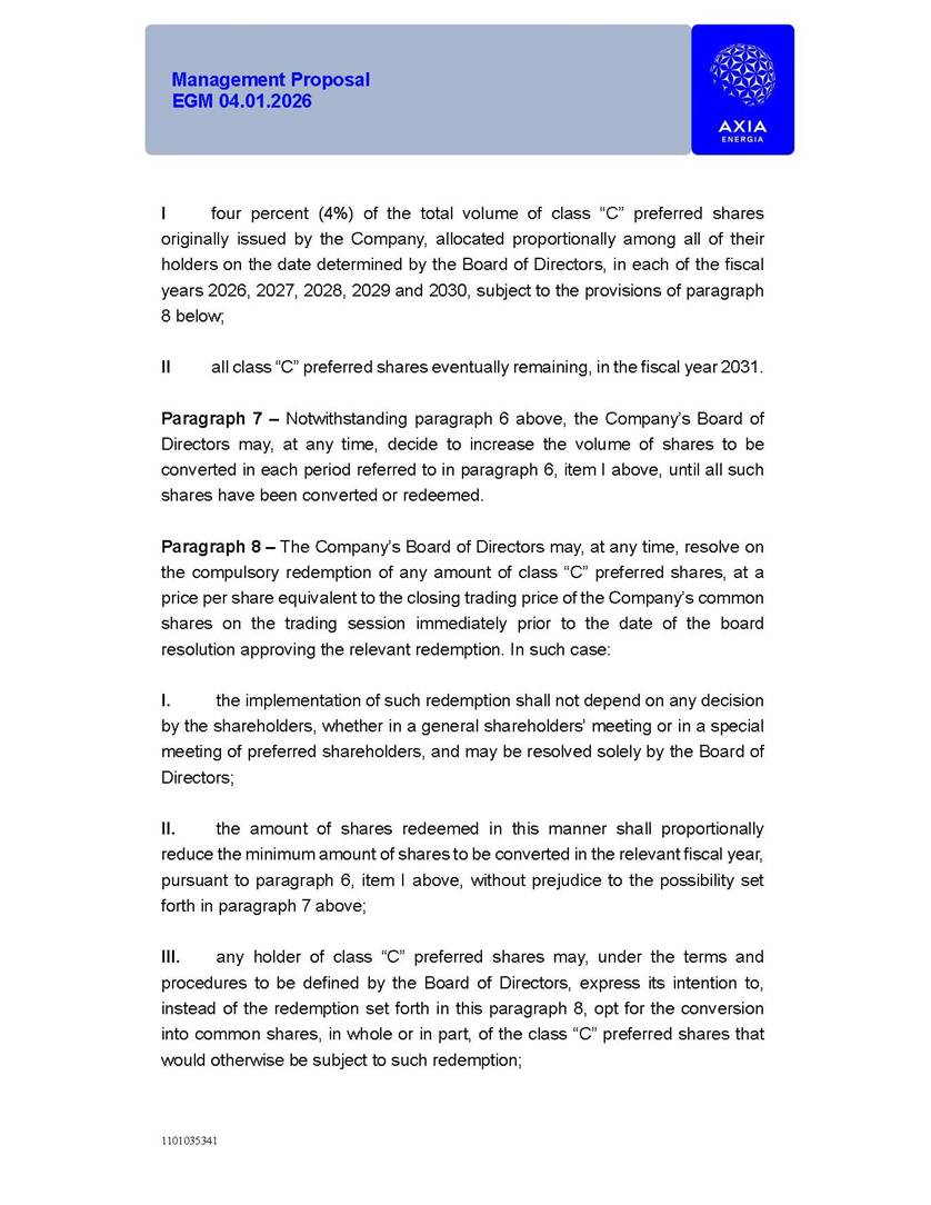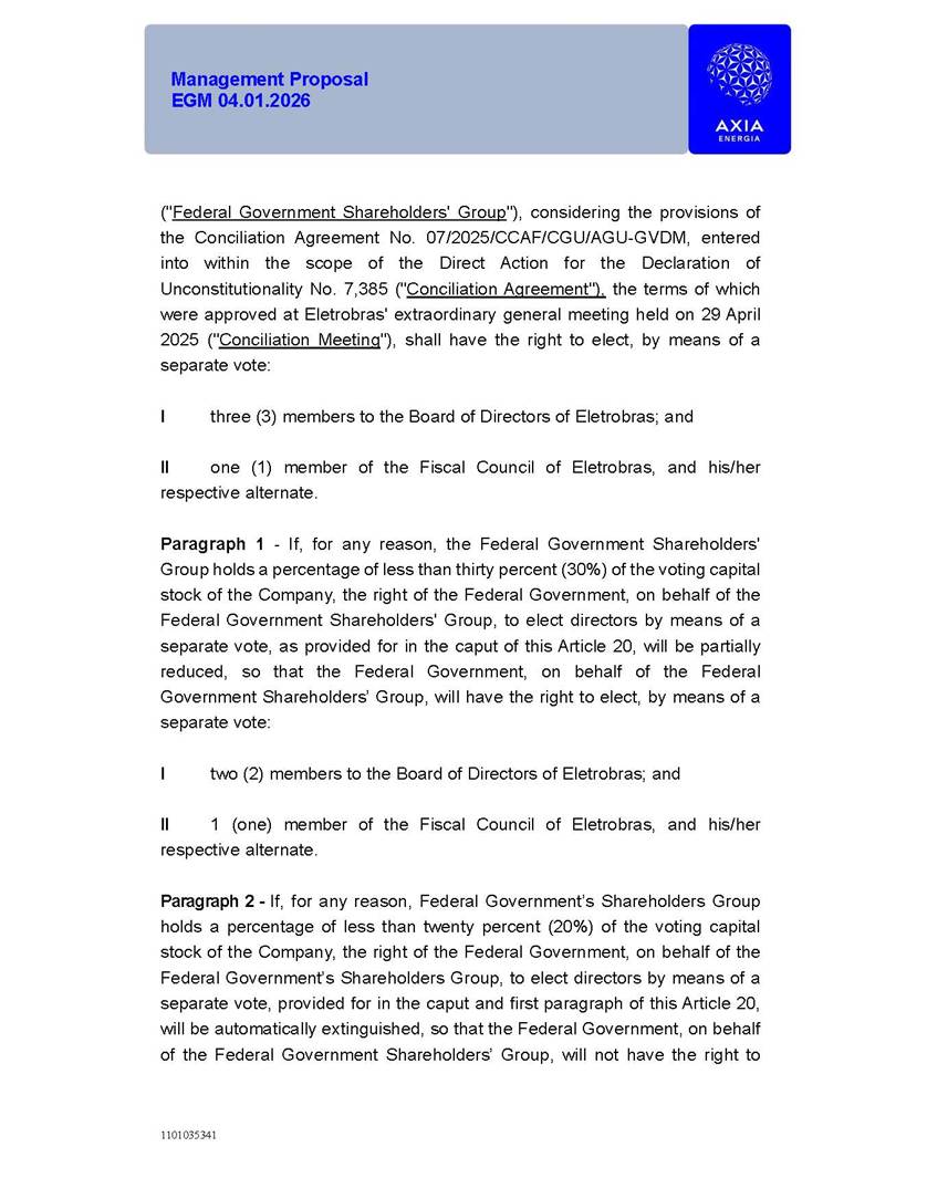 1101035341 Management Proposal EGM 04.01.2026 Management Proposal EGM 04.01.2026 1101035341 Management Proposal EGM 04.01.2026 Index 1. Manual for Participation ................................................................... 47 1.1. Introduction ...................................................................................... 47 1.2. Exclusively Digital Meeting .............................................................. 58 1.3. Remote Voting Ballot (BVD) ............................................................ 69 1.4. Required Documents ..................................................................... 812 1.5. Registration and Accreditation ..................................................... 1013 1.6. Declaration of Membership in a Group of Shareholders .............. 1215 2. Management Proposal .............................................................. 1417 2.1. General Guidelines ...................................................................... 1417 2.2. Agenda ........................................................................................ 1518 2.3. Clarifications on the agenda of the EGM ..................................... 1621 2.4. List of Schedules ......................................................................... 3344 2.5. Conclusion ................................................................................... 3545 SCHEDULE 1 ............................................................................................... 3646 SCHEDULE 2 ............................................................................................... 4259 SCHEDULE 3 ............................................................................................... 4664 SCHEDULE 4 ............................................................................................ 101119 SCHEDULE 5 ........................................................................................... 138157 SCHEDULE 6 ........................................................................................... 189208 SCHEDULE 7 ........................................................................................... 193212 SCHEDULE 8 ........................................................................................... 247266 SCHEDULE 9 ........................................................................................... 284304 1101035341 Management Proposal EGM 04.01.2026 1101035341 Management Proposal EGM 04.01.2026 1. Manual for Participation 1.1. Introduction The Management of CENTRAIS ELÉTRICAS BRASILEIRAS S.A. – Eletrobras, a corporation, headquartered in the City of Rio de Janeiro, State of Rio de Janeiro, at Avenida Graça Aranha, No. 26, Store A, Downtown, Zip code 20030-090, registered in the National Registry of Legal Entities (Cadastro Nacional de Pessoas Jurídicas) ("CNPJ") under No. 00.001.180/0001-26 ("Company" or "AXIA Energia"), with its bylaws filed with the Commercial Registry of the State of Rio de Janeiro (Junta Comercial do Estado do Rio de Janeiro) under NIRE 33.3.00346767, registered with the Brazilian Securities and Exchange Commission (Comissão de Valores Mobiliários) ("CVM") as a publicly-held company category "A" under the code 00243-7, with its securities currently admitted to trading on Level 1 of Corporate Governance of B3 S.A. – Brasil, Bolsa, Balcão ("B3"), pursuant to Brazilian Law No. 6,404, of 1976 ("Brazilian Corporate Law"), and CVM Resolution No. 81, of 2022 ("RCVM 81"), presents this Participation Manual, containing the information, documents and clarifications to guide the participation of shareholders at the Company's Extraordinary General Meeting, to be held exclusively digitally, on first call, on April 1, 2026, at 4 p.m., considering, therefore, to be held at the Company's headquarters ("Meeting" or "EGM" and "Manual", respectively), as well as the management proposal regarding the resolutions on the agenda, including the analysis of the matters submitted to the shareholders at the Meeting ("Management Proposal"). The Company's Management clarifies that, on this same date, it is also disclosing the call notice calling the Special Meeting of Class "A1" Preferred Shareholders ("PNA1") ("PNA1 Special Meeting") and the Special Meeting of Class "B1" Preferred Shareholders ("PNB1") ("PNB1 Special Meeting"), to be held, likewise, on April 1, 2026. As will be detailed in this Management Proposal, the PNA1 Special Meeting and the PNB1 Special Meeting are part of the context of this EGM, being held pursuant to and for the purposes of article 136, §1, of the Brazilian Corporate Law, given that the EGM agenda contemplates proposals for conversion of PNA1 and PNB1 shares. 1101035341 Management Proposal EGM 04.01.2026 1.2. Exclusively Digital Meeting The Meeting will be exclusively digital, to be held through the digital platform of "Atlas AGM" ("Digital Platform"). The exclusively digital format is intended to facilitate the participation of shareholders and others involved in the Meeting, pursuant to the Brazilian Corporate Law, RCVM 81 and the Company's Bylaws. Shareholders who wish to participate in the Meeting must register on the https://atlasagm.com website or through the "Atlas AGM" application available on the Apple Store and Google Play Store ("Application") and submit all documents necessary to qualify for participation or voting at the Meeting by 11:59 p.m. on March 30, 2026. The Digital Platform meets the requirements set forth in article 28, paragraph 1, items I to III, of RCVM 81 and the Meeting will be fully recorded. By accessing the Digital Platform and participating in the Meeting, the Admitted Shareholder (as defined below) authorizes the Company, and third parties authorized by the Company, to record and use the information, in accordance with applicable law. The recordings and related information will be used and processed by the Company for a period of five years, and may be used for the Company's de