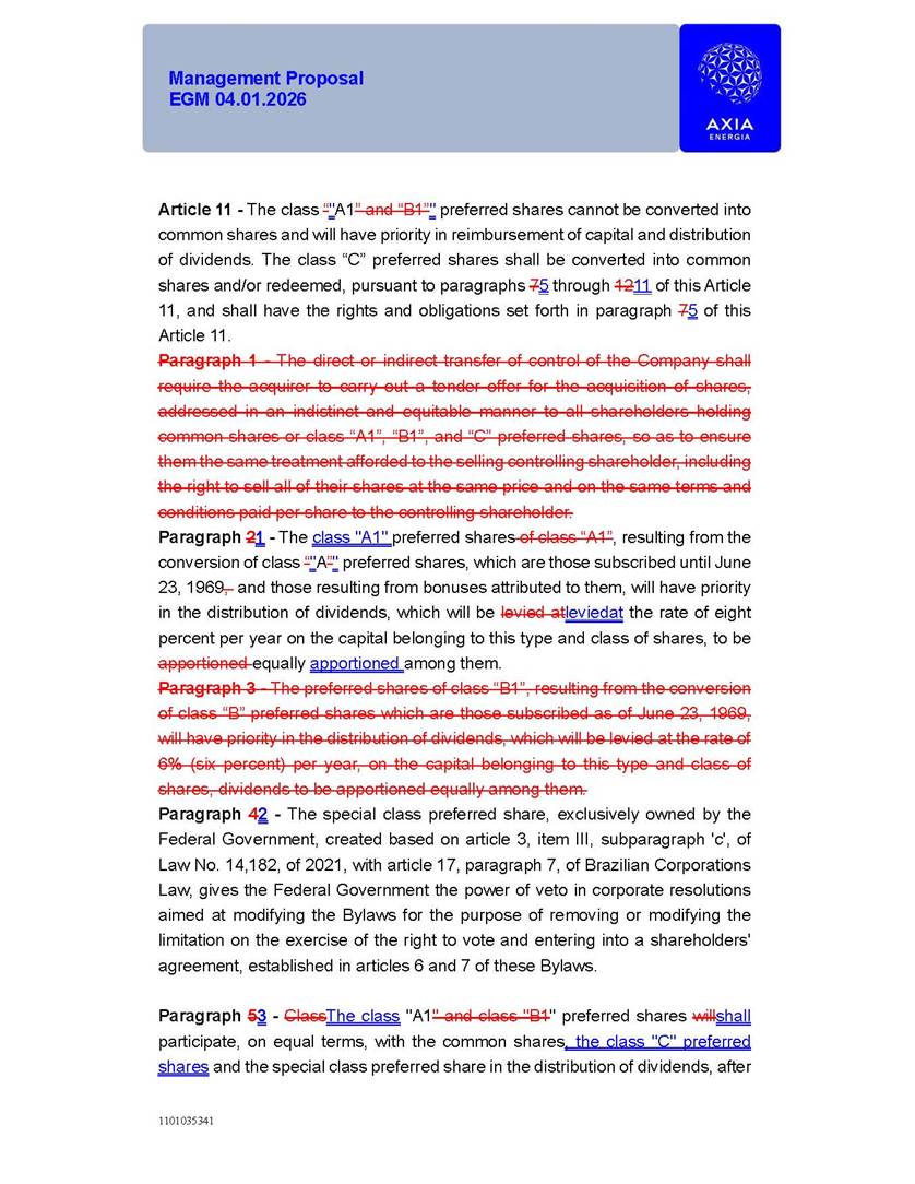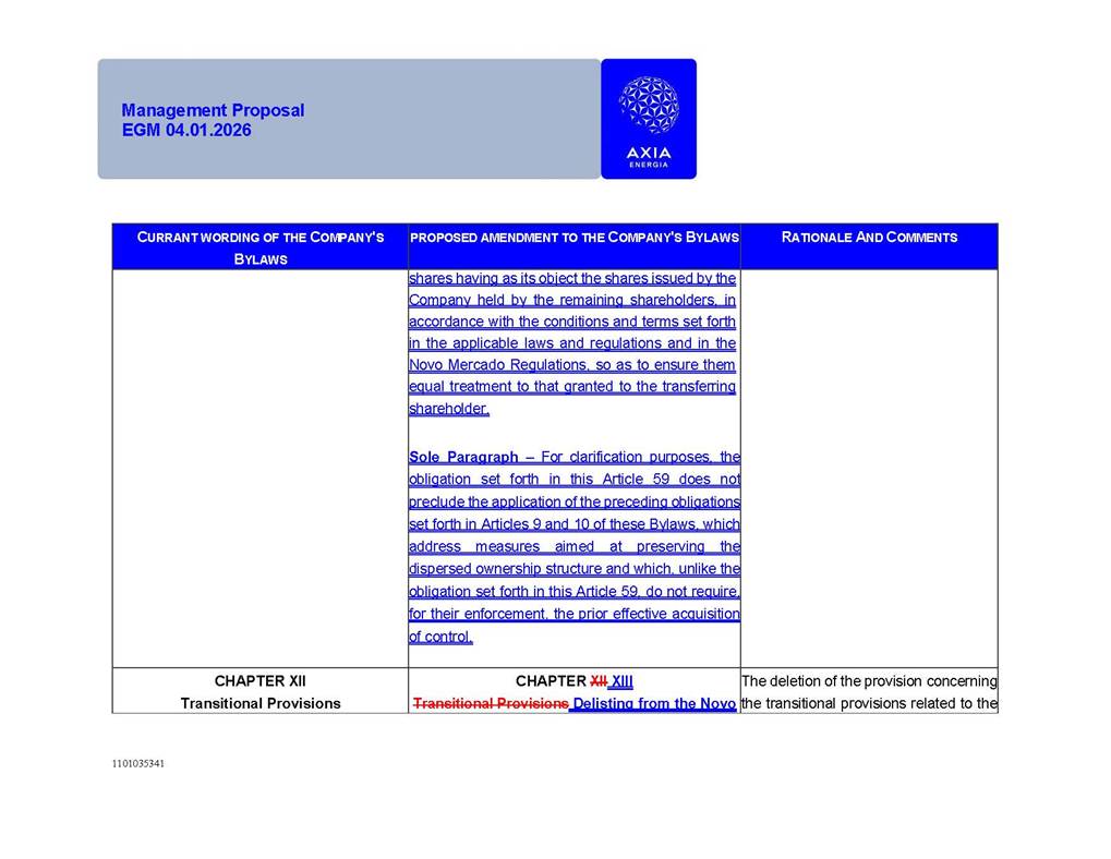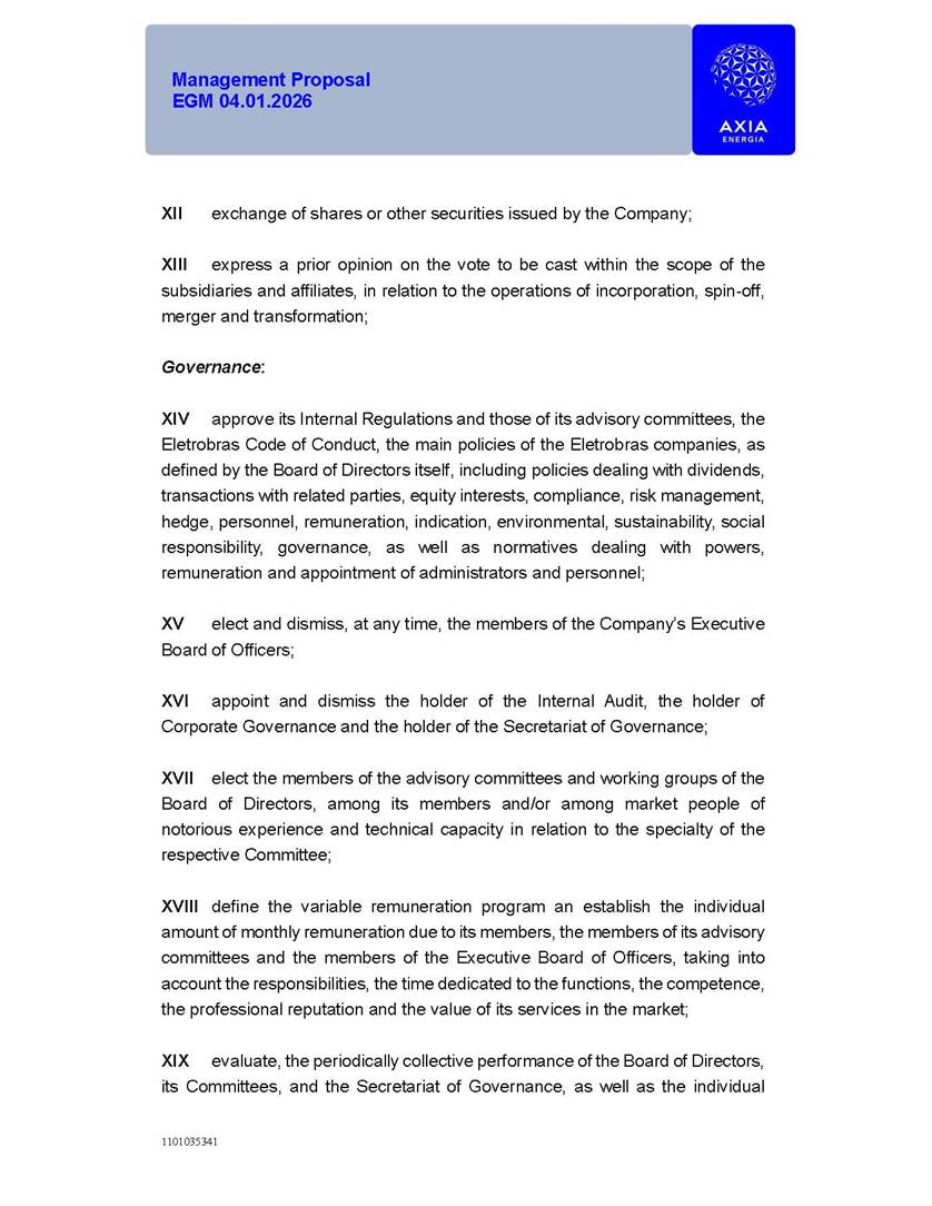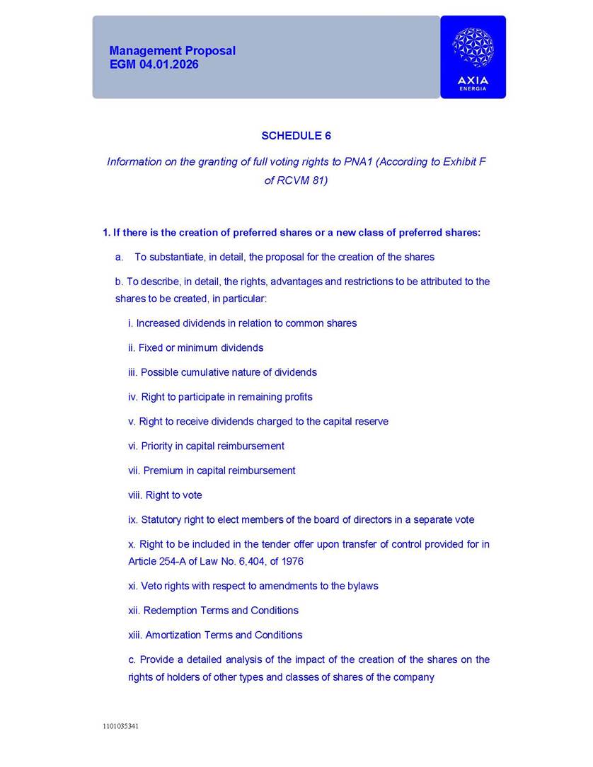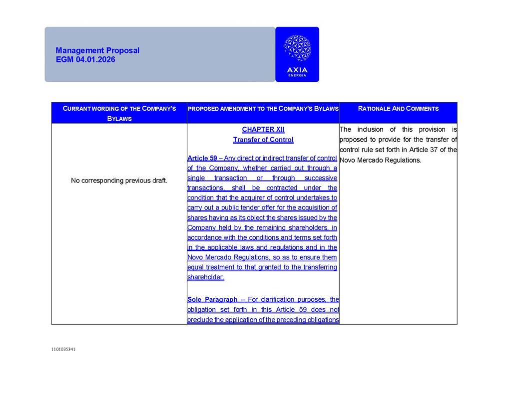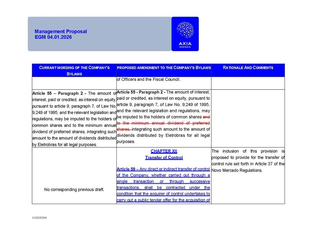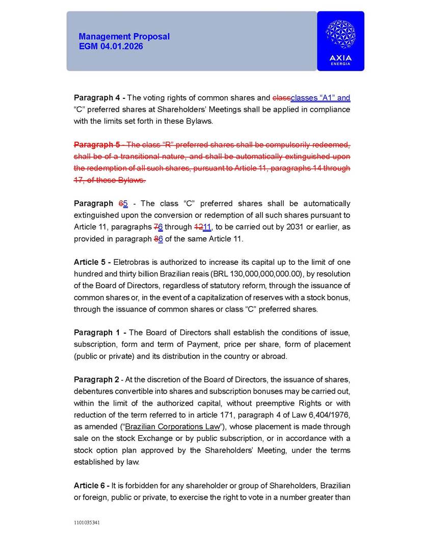 1101035341 Management Proposal EGM 04.01.2026 Management Proposal EGM 04.01.2026 1101035341 Management Proposal EGM 04.01.2026 Index 1. Manual for Participation ................................................................... 47 1.1. Introduction ...................................................................................... 47 1.2. Exclusively Digital Meeting .............................................................. 58 1.3. Remote Voting Ballot (BVD) ............................................................ 69 1.4. Required Documents ..................................................................... 812 1.5. Registration and Accreditation ..................................................... 1013 1.6. Declaration of Membership in a Group of Shareholders .............. 1215 2. Management Proposal .............................................................. 1417 2.1. General Guidelines ...................................................................... 1417 2.2. Agenda ........................................................................................ 1518 2.3. Clarifications on the agenda of the EGM ..................................... 1621 2.4. List of Schedules ......................................................................... 3344 2.5. Conclusion ................................................................................... 3545 SCHEDULE 1 ............................................................................................... 3646 SCHEDULE 2 ............................................................................................... 4259 SCHEDULE 3 ............................................................................................... 4664 SCHEDULE 4 ............................................................................................ 101119 SCHEDULE 5 ........................................................................................... 138157 SCHEDULE 6 ........................................................................................... 189208 SCHEDULE 7 ........................................................................................... 193212 SCHEDULE 8 ........................................................................................... 247266 SCHEDULE 9 ........................................................................................... 284304 1101035341 Management Proposal EGM 04.01.2026 1101035341 Management Proposal EGM 04.01.2026 1. Manual for Participation 1.1. Introduction The Management of CENTRAIS ELÉTRICAS BRASILEIRAS S.A. – Eletrobras, a corporation, headquartered in the City of Rio de Janeiro, State of Rio de Janeiro, at Avenida Graça Aranha, No. 26, Store A, Downtown, Zip code 20030-090, registered in the National Registry of Legal Entities (Cadastro Nacional de Pessoas Jurídicas) ("CNPJ") under No. 00.001.180/0001-26 ("Company" or "AXIA Energia"), with its bylaws filed with the Commercial Registry of the State of Rio de Janeiro (Junta Comercial do Estado do Rio de Janeiro) under NIRE 33.3.00346767, registered with the Brazilian Securities and Exchange Commission (Comissão de Valores Mobiliários) ("CVM") as a publicly-held company category "A" under the code 00243-7, with its securities currently admitted to trading on Level 1 of Corporate Governance of B3 S.A. – Brasil, Bolsa, Balcão ("B3"), pursuant to Brazilian Law No. 6,404, of 1976 ("Brazilian Corporate Law"), and CVM Resolution No. 81, of 2022 ("RCVM 81"), presents this Participation Manual, containing the information, documents and clarifications to guide the participation of shareholders at the Company's Extraordinary General Meeting, to be held exclusively digitally, on first call, on April 1, 2026, at 4 p.m., considering, therefore, to be held at the Company's headquarters ("Meeting" or "EGM" and "Manual", respectively), as well as the management proposal regarding the resolutions on the agenda, including the analysis of the matters submitted to the shareholders at the Meeting ("Management Proposal"). The Company's Management clarifies that, on this same date, it is also disclosing the call notice calling the Special Meeting of Class "A1" Preferred Shareholders ("PNA1") ("PNA1 Special Meeting") and the Special Meeting of Class "B1" Preferred Shareholders ("PNB1") ("PNB1 Special Meeting"), to be held, likewise, on April 1, 2026. As will be detailed in this Management Proposal, the PNA1 Special Meeting and the PNB1 Special Meeting are part of the context of this EGM, being held pursuant to and for the purposes of article 136, §1, of the Brazilian Corporate Law, given that the EGM agenda contemplates proposals for conversion of PNA1 and PNB1 shares. 1101035341 Management Proposal EGM 04.01.2026 1.2. Exclusively Digital Meeting The Meeting will be exclusively digital, to be held through the digital platform of "Atlas AGM" ("Digital Platform"). The exclusively digital format is intended to facilitate the participation of shareholders and others involved in the Meeting, pursuant to the Brazilian Corporate Law, RCVM 81 and the Company's Bylaws. Shareholders who wish to participate in the Meeting must register on the https://atlasagm.com website or through the "Atlas AGM" application available on the Apple Store and Google Play Store ("Application") and submit all documents necessary to qualify for participation or voting at the Meeting by 11:59 p.m. on March 30, 2026. The Digital Platform meets the requirements set forth in article 28, paragraph 1, items I to III, of RCVM 81 and the Meeting will be fully recorded. By accessing the Digital Platform and participating in the Meeting, the Admitted Shareholder (as defined below) authorizes the Company, and third parties authorized by the Company, to record and use the information, in accordance with applicable law. The recordings and related information will be used and processed by the Company for a period of five years, and may be used for the Company's de