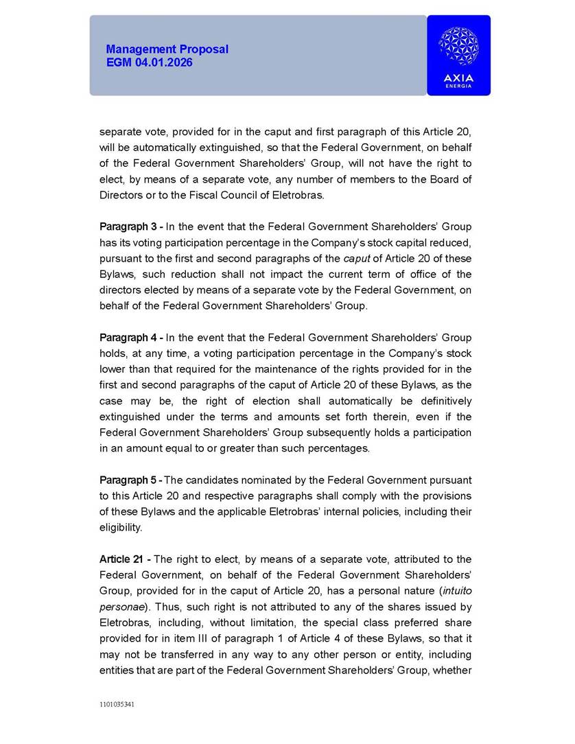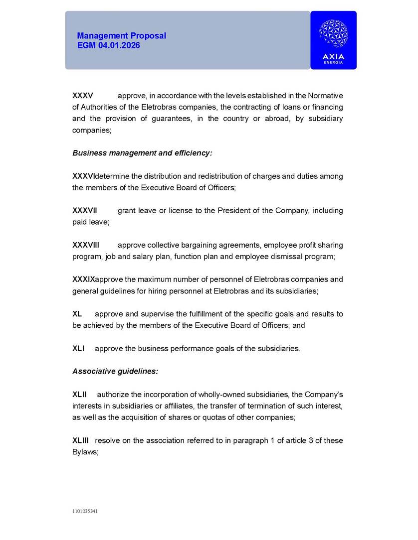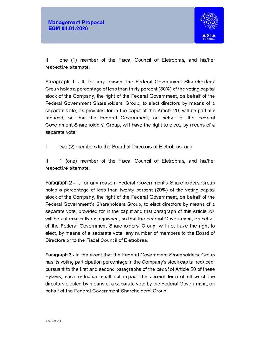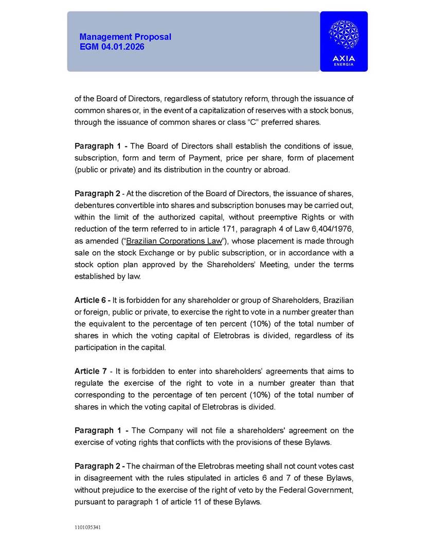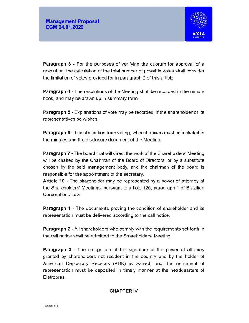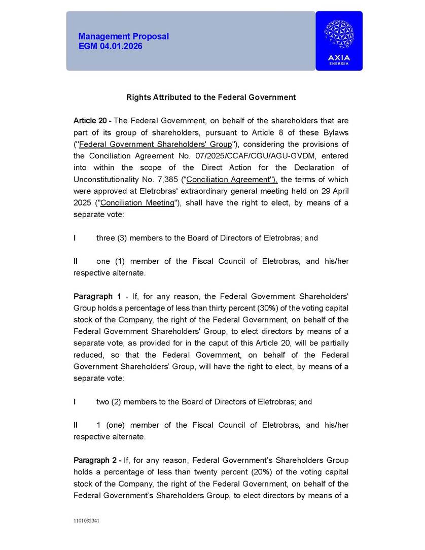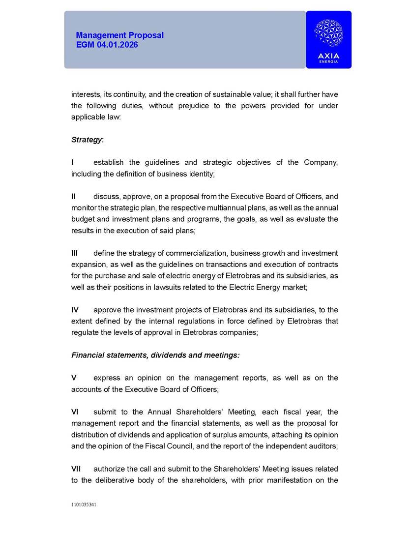1101035341 Management Proposal EGM 04.01.2026 Management Proposal EGM 04.01.2026 1101035341 Management Proposal EGM 04.01.2026 Index 1. Manual for Participation ................................................................... 47 1.1. Introduction ...................................................................................... 47 1.2. Exclusively Digital Meeting .............................................................. 58 1.3. Remote Voting Ballot (BVD) ............................................................ 69 1.4. Required Documents ..................................................................... 812 1.5. Registration and Accreditation ..................................................... 1013 1.6. Declaration of Membership in a Group of Shareholders .............. 1215 2. Management Proposal .............................................................. 1417 2.1. General Guidelines ...................................................................... 1417 2.2. Agenda ........................................................................................ 1518 2.3. Clarifications on the agenda of the EGM ..................................... 1621 2.4. List of Schedules ......................................................................... 3344 2.5. Conclusion ................................................................................... 3545 SCHEDULE 1 ............................................................................................... 3646 SCHEDULE 2 ............................................................................................... 4259 SCHEDULE 3 ............................................................................................... 4664 SCHEDULE 4 ............................................................................................ 101119 SCHEDULE 5 ........................................................................................... 138157 SCHEDULE 6 ........................................................................................... 189208 SCHEDULE 7 ........................................................................................... 193212 SCHEDULE 8 ........................................................................................... 247266 SCHEDULE 9 ........................................................................................... 284304 1101035341 Management Proposal EGM 04.01.2026 1101035341 Management Proposal EGM 04.01.2026 1. Manual for Participation 1.1. Introduction The Management of CENTRAIS ELÉTRICAS BRASILEIRAS S.A. – Eletrobras, a corporation, headquartered in the City of Rio de Janeiro, State of Rio de Janeiro, at Avenida Graça Aranha, No. 26, Store A, Downtown, Zip code 20030-090, registered in the National Registry of Legal Entities (Cadastro Nacional de Pessoas Jurídicas) ("CNPJ") under No. 00.001.180/0001-26 ("Company" or "AXIA Energia"), with its bylaws filed with the Commercial Registry of the State of Rio de Janeiro (Junta Comercial do Estado do Rio de Janeiro) under NIRE 33.3.00346767, registered with the Brazilian Securities and Exchange Commission (Comissão de Valores Mobiliários) ("CVM") as a publicly-held company category "A" under the code 00243-7, with its securities currently admitted to trading on Level 1 of Corporate Governance of B3 S.A. – Brasil, Bolsa, Balcão ("B3"), pursuant to Brazilian Law No. 6,404, of 1976 ("Brazilian Corporate Law"), and CVM Resolution No. 81, of 2022 ("RCVM 81"), presents this Participation Manual, containing the information, documents and clarifications to guide the participation of shareholders at the Company's Extraordinary General Meeting, to be held exclusively digitally, on first call, on April 1, 2026, at 4 p.m., considering, therefore, to be held at the Company's headquarters ("Meeting" or "EGM" and "Manual", respectively), as well as the management proposal regarding the resolutions on the agenda, including the analysis of the matters submitted to the shareholders at the Meeting ("Management Proposal"). The Company's Management clarifies that, on this same date, it is also disclosing the call notice calling the Special Meeting of Class "A1" Preferred Shareholders ("PNA1") ("PNA1 Special Meeting") and the Special Meeting of Class "B1" Preferred Shareholders ("PNB1") ("PNB1 Special Meeting"), to be held, likewise, on April 1, 2026. As will be detailed in this Management Proposal, the PNA1 Special Meeting and the PNB1 Special Meeting are part of the context of this EGM, being held pursuant to and for the purposes of article 136, §1, of the Brazilian Corporate Law, given that the EGM agenda contemplates proposals for conversion of PNA1 and PNB1 shares. 1101035341 Management Proposal EGM 04.01.2026 1.2. Exclusively Digital Meeting The Meeting will be exclusively digital, to be held through the digital platform of "Atlas AGM" ("Digital Platform"). The exclusively digital format is intended to facilitate the participation of shareholders and others involved in the Meeting, pursuant to the Brazilian Corporate Law, RCVM 81 and the Company's Bylaws. Shareholders who wish to participate in the Meeting must register on the https://atlasagm.com website or through the "Atlas AGM" application available on the Apple Store and Google Play Store ("Application") and submit all documents necessary to qualify for participation or voting at the Meeting by 11:59 p.m. on March 30, 2026. The Digital Platform meets the requirements set forth in article 28, paragraph 1, items I to III, of RCVM 81 and the Meeting will be fully recorded. By accessing the Digital Platform and participating in the Meeting, the Admitted Shareholder (as defined below) authorizes the Company, and third parties authorized by the Company, to record and use the information, in accordance with applicable law. The recordings and related information will be used and processed by the Company for a period of five years, and may be used for the Company's de