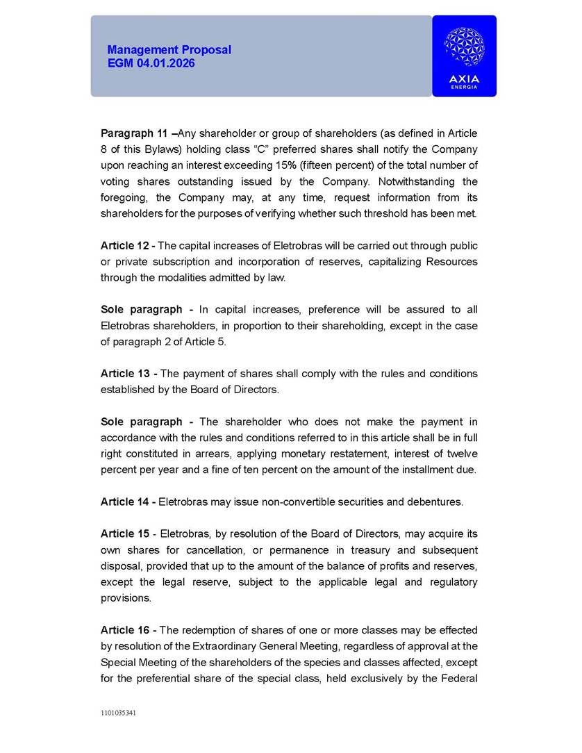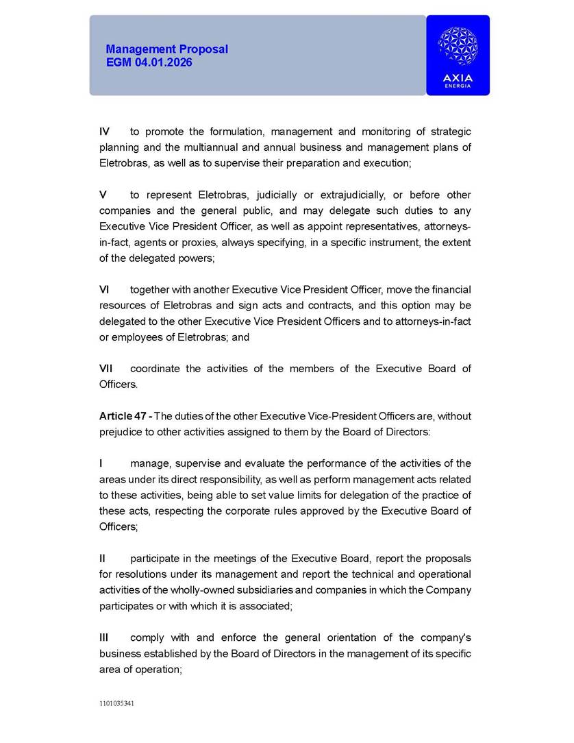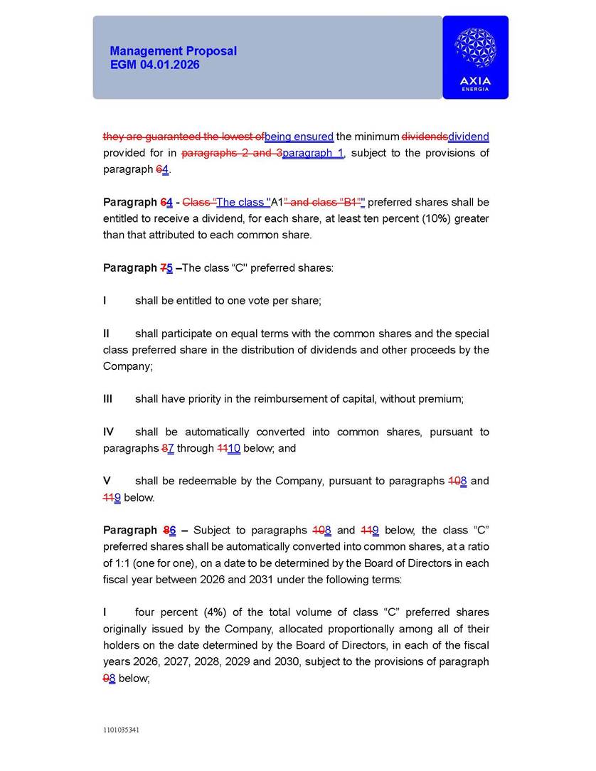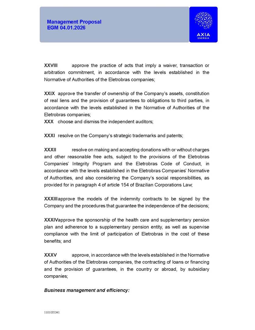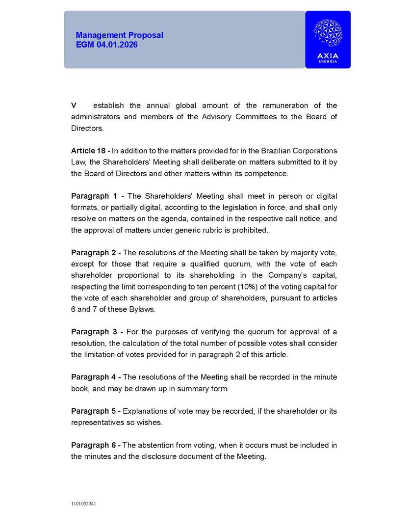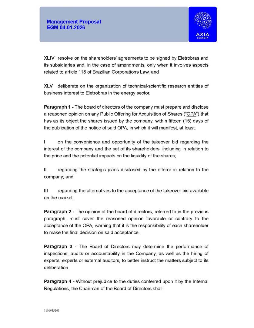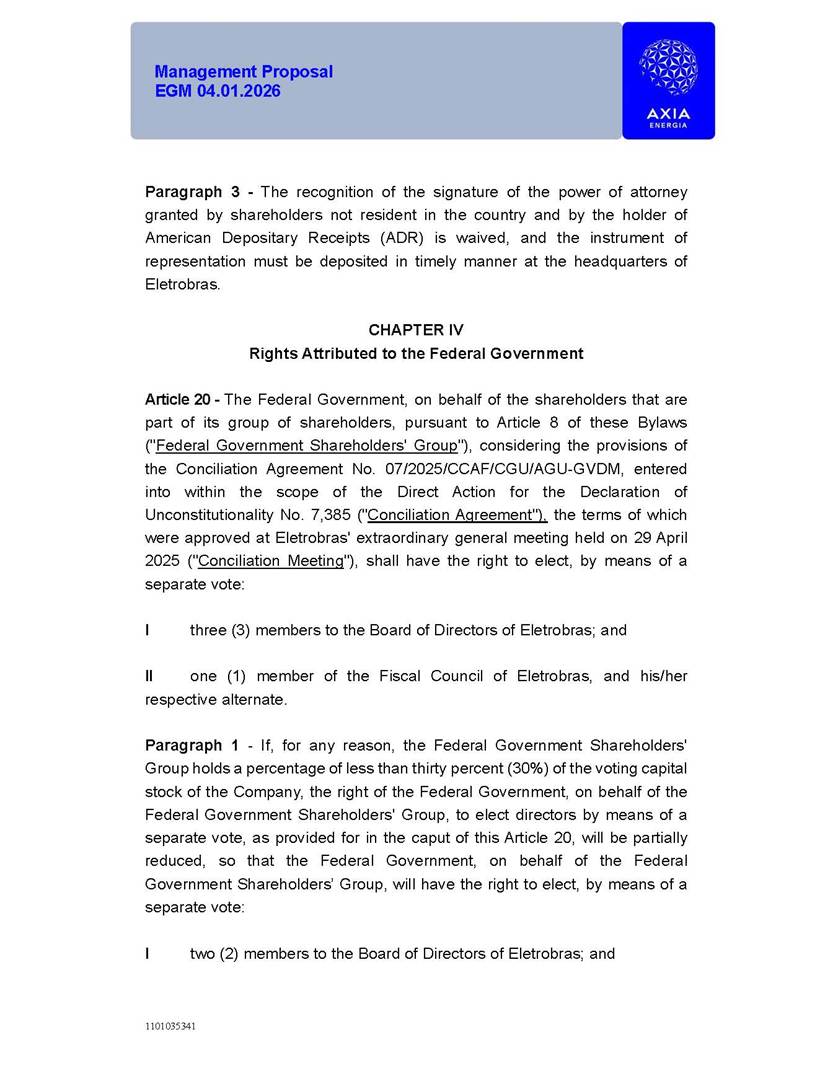 1101035341 Management Proposal EGM 04.01.2026 Management Proposal EGM 04.01.2026 1101035341 Management Proposal EGM 04.01.2026 Index 1. Manual for Participation ................................................................... 47 1.1. Introduction ...................................................................................... 47 1.2. Exclusively Digital Meeting .............................................................. 58 1.3. Remote Voting Ballot (BVD) ............................................................ 69 1.4. Required Documents ..................................................................... 812 1.5. Registration and Accreditation ..................................................... 1013 1.6. Declaration of Membership in a Group of Shareholders .............. 1215 2. Management Proposal .............................................................. 1417 2.1. General Guidelines ...................................................................... 1417 2.2. Agenda ........................................................................................ 1518 2.3. Clarifications on the agenda of the EGM ..................................... 1621 2.4. List of Schedules ......................................................................... 3344 2.5. Conclusion ................................................................................... 3545 SCHEDULE 1 ............................................................................................... 3646 SCHEDULE 2 ............................................................................................... 4259 SCHEDULE 3 ............................................................................................... 4664 SCHEDULE 4 ............................................................................................ 101119 SCHEDULE 5 ........................................................................................... 138157 SCHEDULE 6 ........................................................................................... 189208 SCHEDULE 7 ........................................................................................... 193212 SCHEDULE 8 ........................................................................................... 247266 SCHEDULE 9 ........................................................................................... 284304 1101035341 Management Proposal EGM 04.01.2026 1101035341 Management Proposal EGM 04.01.2026 1. Manual for Participation 1.1. Introduction The Management of CENTRAIS ELÉTRICAS BRASILEIRAS S.A. – Eletrobras, a corporation, headquartered in the City of Rio de Janeiro, State of Rio de Janeiro, at Avenida Graça Aranha, No. 26, Store A, Downtown, Zip code 20030-090, registered in the National Registry of Legal Entities (Cadastro Nacional de Pessoas Jurídicas) ("CNPJ") under No. 00.001.180/0001-26 ("Company" or "AXIA Energia"), with its bylaws filed with the Commercial Registry of the State of Rio de Janeiro (Junta Comercial do Estado do Rio de Janeiro) under NIRE 33.3.00346767, registered with the Brazilian Securities and Exchange Commission (Comissão de Valores Mobiliários) ("CVM") as a publicly-held company category "A" under the code 00243-7, with its securities currently admitted to trading on Level 1 of Corporate Governance of B3 S.A. – Brasil, Bolsa, Balcão ("B3"), pursuant to Brazilian Law No. 6,404, of 1976 ("Brazilian Corporate Law"), and CVM Resolution No. 81, of 2022 ("RCVM 81"), presents this Participation Manual, containing the information, documents and clarifications to guide the participation of shareholders at the Company's Extraordinary General Meeting, to be held exclusively digitally, on first call, on April 1, 2026, at 4 p.m., considering, therefore, to be held at the Company's headquarters ("Meeting" or "EGM" and "Manual", respectively), as well as the management proposal regarding the resolutions on the agenda, including the analysis of the matters submitted to the shareholders at the Meeting ("Management Proposal"). The Company's Management clarifies that, on this same date, it is also disclosing the call notice calling the Special Meeting of Class "A1" Preferred Shareholders ("PNA1") ("PNA1 Special Meeting") and the Special Meeting of Class "B1" Preferred Shareholders ("PNB1") ("PNB1 Special Meeting"), to be held, likewise, on April 1, 2026. As will be detailed in this Management Proposal, the PNA1 Special Meeting and the PNB1 Special Meeting are part of the context of this EGM, being held pursuant to and for the purposes of article 136, §1, of the Brazilian Corporate Law, given that the EGM agenda contemplates proposals for conversion of PNA1 and PNB1 shares. 1101035341 Management Proposal EGM 04.01.2026 1.2. Exclusively Digital Meeting The Meeting will be exclusively digital, to be held through the digital platform of "Atlas AGM" ("Digital Platform"). The exclusively digital format is intended to facilitate the participation of shareholders and others involved in the Meeting, pursuant to the Brazilian Corporate Law, RCVM 81 and the Company's Bylaws. Shareholders who wish to participate in the Meeting must register on the https://atlasagm.com website or through the "Atlas AGM" application available on the Apple Store and Google Play Store ("Application") and submit all documents necessary to qualify for participation or voting at the Meeting by 11:59 p.m. on March 30, 2026. The Digital Platform meets the requirements set forth in article 28, paragraph 1, items I to III, of RCVM 81 and the Meeting will be fully recorded. By accessing the Digital Platform and participating in the Meeting, the Admitted Shareholder (as defined below) authorizes the Company, and third parties authorized by the Company, to record and use the information, in accordance with applicable law. The recordings and related information will be used and processed by the Company for a period of five years, and may be used for the Company's de