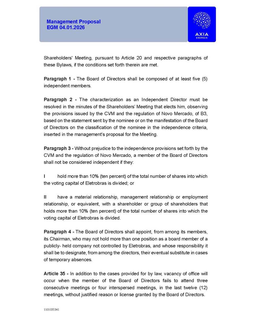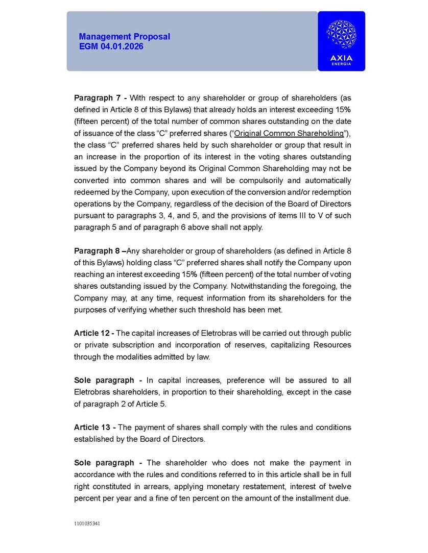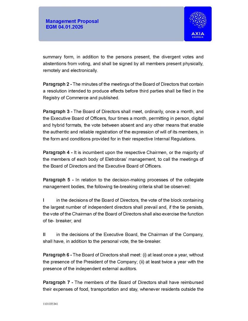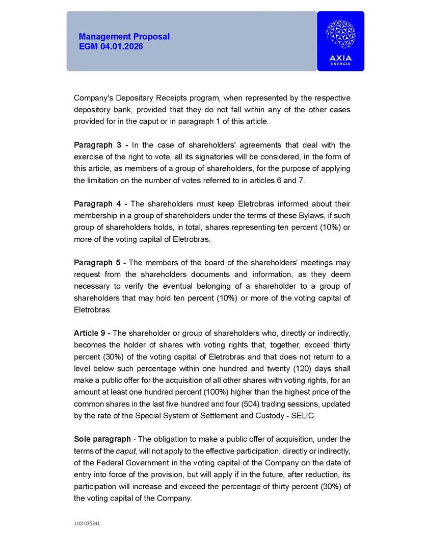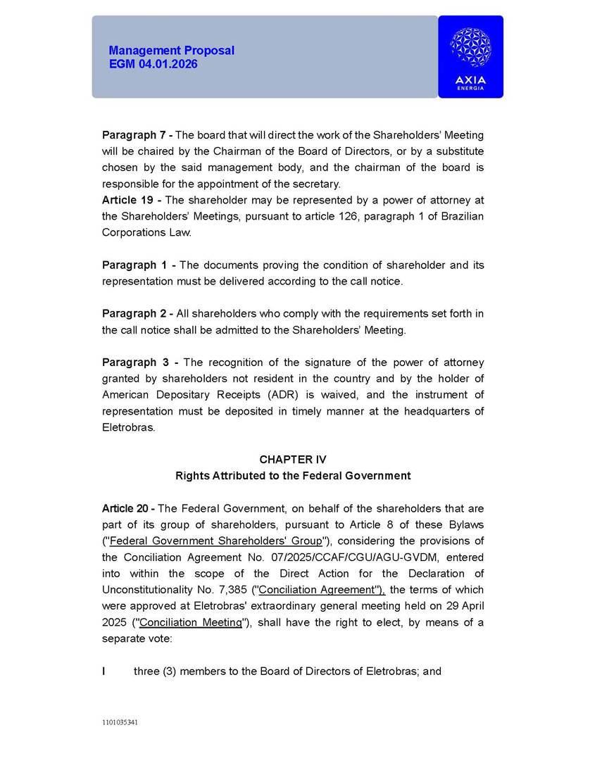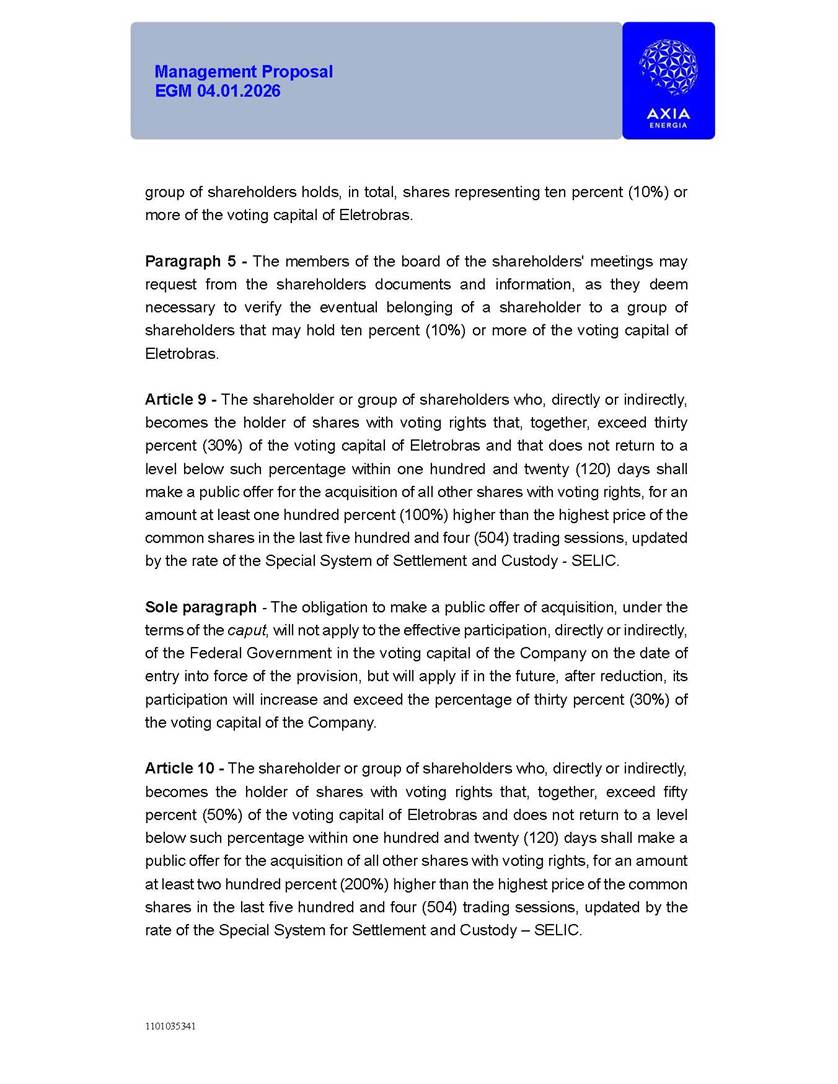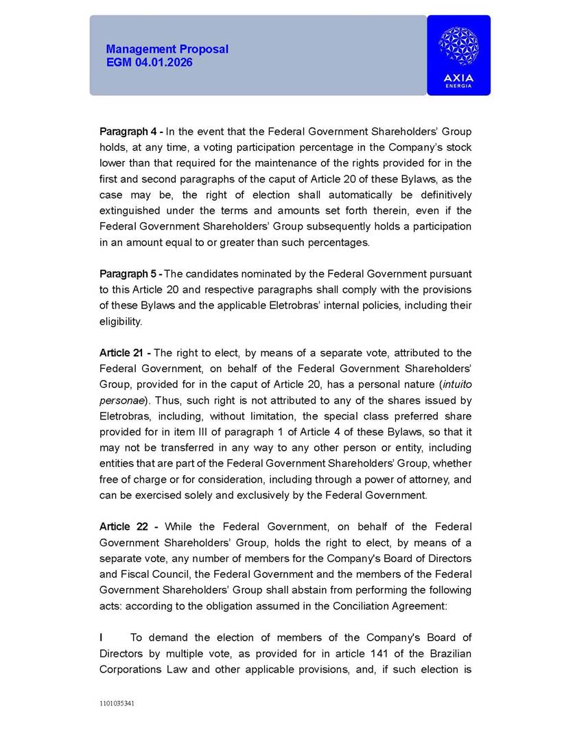 1101035341 Management Proposal EGM 04.01.2026 Management Proposal EGM 04.01.2026 1101035341 Management Proposal EGM 04.01.2026 Index 1. Manual for Participation ................................................................... 47 1.1. Introduction ...................................................................................... 47 1.2. Exclusively Digital Meeting .............................................................. 58 1.3. Remote Voting Ballot (BVD) ............................................................ 69 1.4. Required Documents ..................................................................... 812 1.5. Registration and Accreditation ..................................................... 1013 1.6. Declaration of Membership in a Group of Shareholders .............. 1215 2. Management Proposal .............................................................. 1417 2.1. General Guidelines ...................................................................... 1417 2.2. Agenda ........................................................................................ 1518 2.3. Clarifications on the agenda of the EGM ..................................... 1621 2.4. List of Schedules ......................................................................... 3344 2.5. Conclusion ................................................................................... 3545 SCHEDULE 1 ............................................................................................... 3646 SCHEDULE 2 ............................................................................................... 4259 SCHEDULE 3 ............................................................................................... 4664 SCHEDULE 4 ............................................................................................ 101119 SCHEDULE 5 ........................................................................................... 138157 SCHEDULE 6 ........................................................................................... 189208 SCHEDULE 7 ........................................................................................... 193212 SCHEDULE 8 ........................................................................................... 247266 SCHEDULE 9 ........................................................................................... 284304 1101035341 Management Proposal EGM 04.01.2026 1101035341 Management Proposal EGM 04.01.2026 1. Manual for Participation 1.1. Introduction The Management of CENTRAIS ELÉTRICAS BRASILEIRAS S.A. – Eletrobras, a corporation, headquartered in the City of Rio de Janeiro, State of Rio de Janeiro, at Avenida Graça Aranha, No. 26, Store A, Downtown, Zip code 20030-090, registered in the National Registry of Legal Entities (Cadastro Nacional de Pessoas Jurídicas) ("CNPJ") under No. 00.001.180/0001-26 ("Company" or "AXIA Energia"), with its bylaws filed with the Commercial Registry of the State of Rio de Janeiro (Junta Comercial do Estado do Rio de Janeiro) under NIRE 33.3.00346767, registered with the Brazilian Securities and Exchange Commission (Comissão de Valores Mobiliários) ("CVM") as a publicly-held company category "A" under the code 00243-7, with its securities currently admitted to trading on Level 1 of Corporate Governance of B3 S.A. – Brasil, Bolsa, Balcão ("B3"), pursuant to Brazilian Law No. 6,404, of 1976 ("Brazilian Corporate Law"), and CVM Resolution No. 81, of 2022 ("RCVM 81"), presents this Participation Manual, containing the information, documents and clarifications to guide the participation of shareholders at the Company's Extraordinary General Meeting, to be held exclusively digitally, on first call, on April 1, 2026, at 4 p.m., considering, therefore, to be held at the Company's headquarters ("Meeting" or "EGM" and "Manual", respectively), as well as the management proposal regarding the resolutions on the agenda, including the analysis of the matters submitted to the shareholders at the Meeting ("Management Proposal"). The Company's Management clarifies that, on this same date, it is also disclosing the call notice calling the Special Meeting of Class "A1" Preferred Shareholders ("PNA1") ("PNA1 Special Meeting") and the Special Meeting of Class "B1" Preferred Shareholders ("PNB1") ("PNB1 Special Meeting"), to be held, likewise, on April 1, 2026. As will be detailed in this Management Proposal, the PNA1 Special Meeting and the PNB1 Special Meeting are part of the context of this EGM, being held pursuant to and for the purposes of article 136, §1, of the Brazilian Corporate Law, given that the EGM agenda contemplates proposals for conversion of PNA1 and PNB1 shares. 1101035341 Management Proposal EGM 04.01.2026 1.2. Exclusively Digital Meeting The Meeting will be exclusively digital, to be held through the digital platform of "Atlas AGM" ("Digital Platform"). The exclusively digital format is intended to facilitate the participation of shareholders and others involved in the Meeting, pursuant to the Brazilian Corporate Law, RCVM 81 and the Company's Bylaws. Shareholders who wish to participate in the Meeting must register on the https://atlasagm.com website or through the "Atlas AGM" application available on the Apple Store and Google Play Store ("Application") and submit all documents necessary to qualify for participation or voting at the Meeting by 11:59 p.m. on March 30, 2026. The Digital Platform meets the requirements set forth in article 28, paragraph 1, items I to III, of RCVM 81 and the Meeting will be fully recorded. By accessing the Digital Platform and participating in the Meeting, the Admitted Shareholder (as defined below) authorizes the Company, and third parties authorized by the Company, to record and use the information, in accordance with applicable law. The recordings and related information will be used and processed by the Company for a period of five years, and may be used for the Company's de