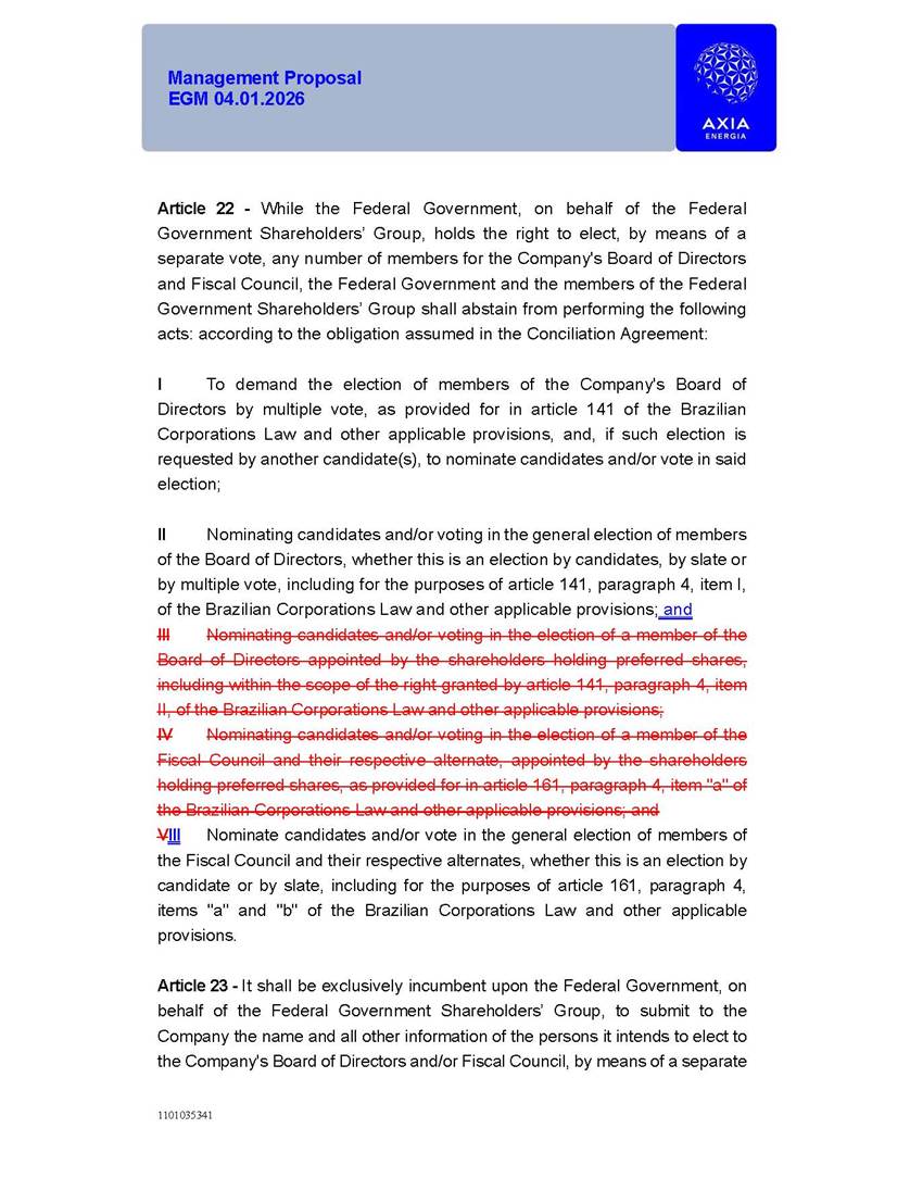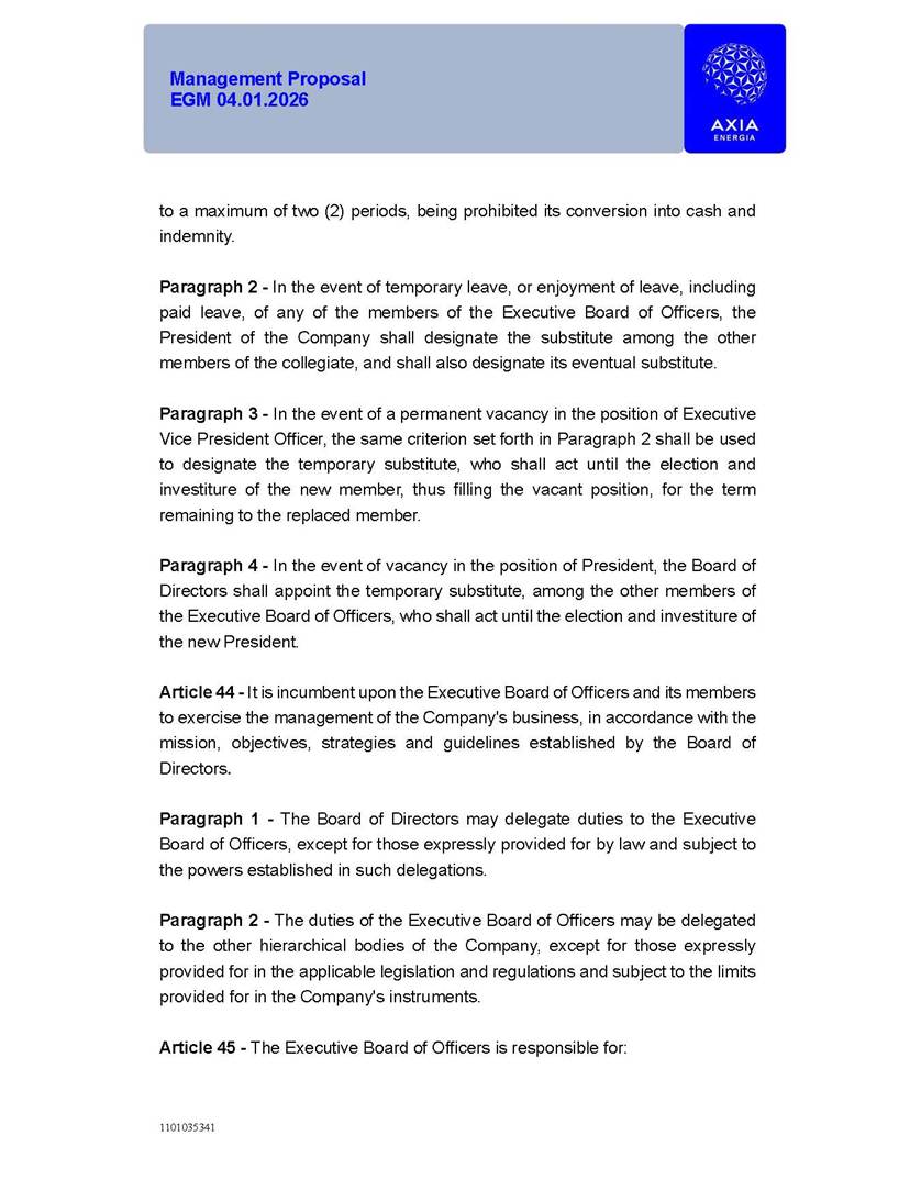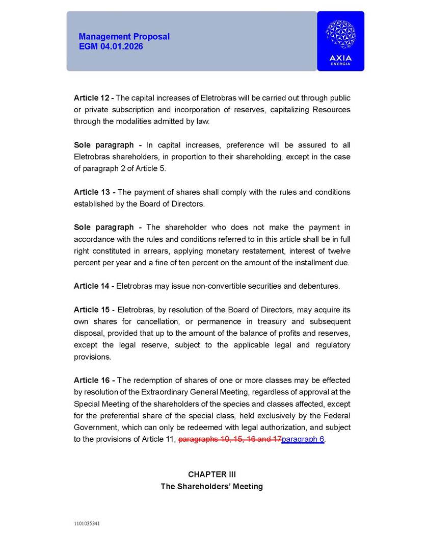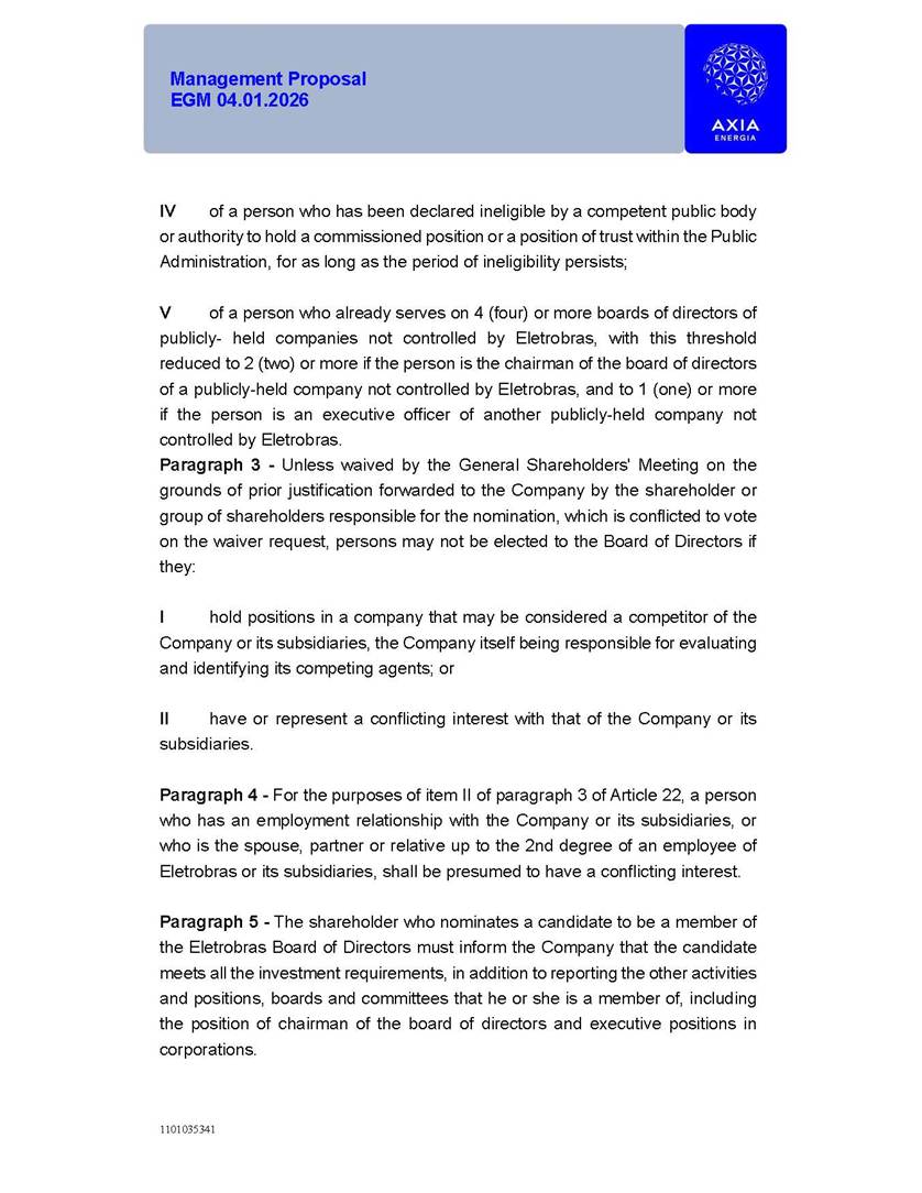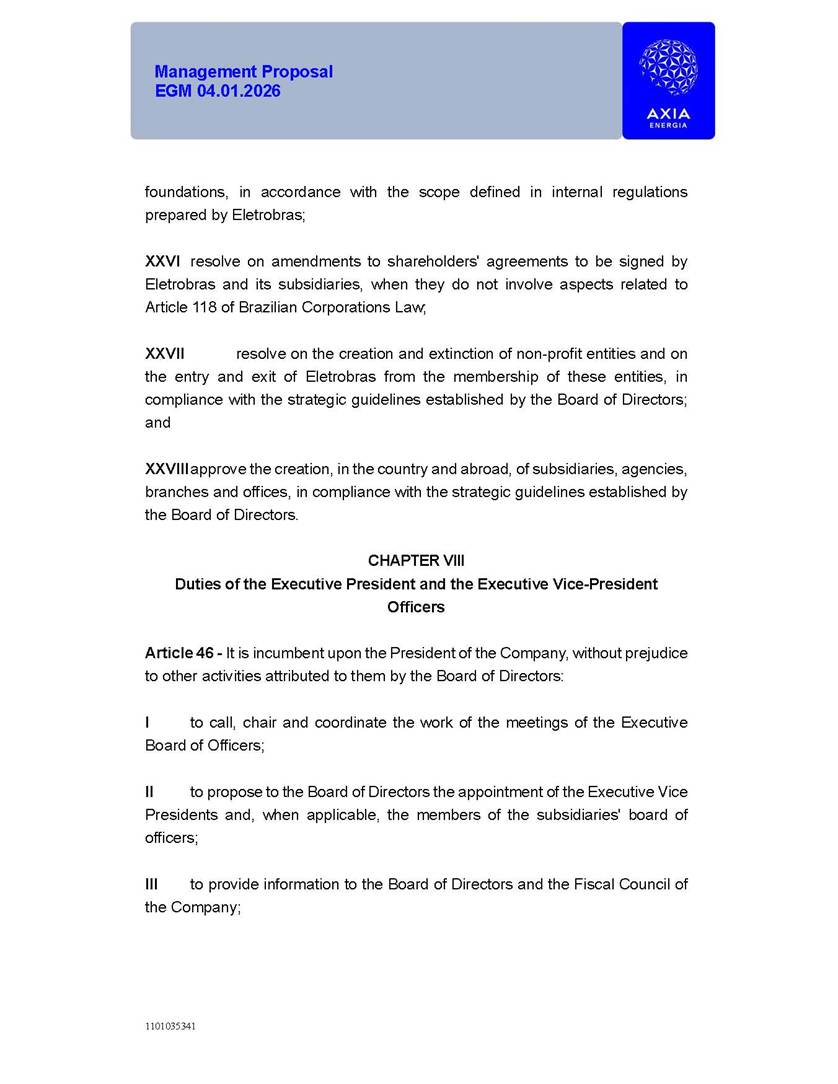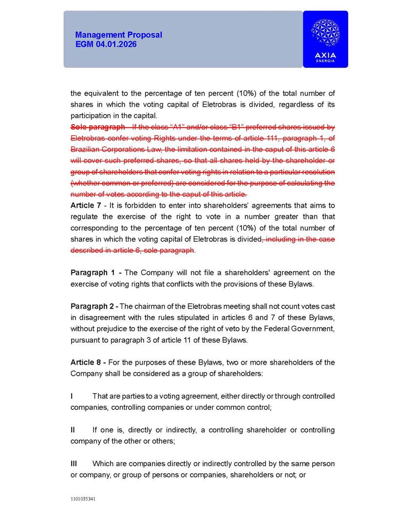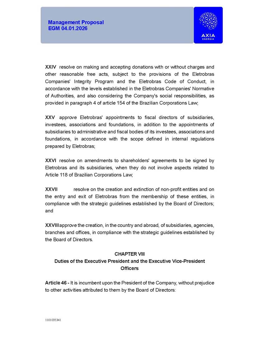 1101035341 Management Proposal EGM 04.01.2026 Management Proposal EGM 04.01.2026 1101035341 Management Proposal EGM 04.01.2026 Index 1. Manual for Participation ................................................................... 47 1.1. Introduction ...................................................................................... 47 1.2. Exclusively Digital Meeting .............................................................. 58 1.3. Remote Voting Ballot (BVD) ............................................................ 69 1.4. Required Documents ..................................................................... 812 1.5. Registration and Accreditation ..................................................... 1013 1.6. Declaration of Membership in a Group of Shareholders .............. 1215 2. Management Proposal .............................................................. 1417 2.1. General Guidelines ...................................................................... 1417 2.2. Agenda ........................................................................................ 1518 2.3. Clarifications on the agenda of the EGM ..................................... 1621 2.4. List of Schedules ......................................................................... 3344 2.5. Conclusion ................................................................................... 3545 SCHEDULE 1 ............................................................................................... 3646 SCHEDULE 2 ............................................................................................... 4259 SCHEDULE 3 ............................................................................................... 4664 SCHEDULE 4 ............................................................................................ 101119 SCHEDULE 5 ........................................................................................... 138157 SCHEDULE 6 ........................................................................................... 189208 SCHEDULE 7 ........................................................................................... 193212 SCHEDULE 8 ........................................................................................... 247266 SCHEDULE 9 ........................................................................................... 284304 1101035341 Management Proposal EGM 04.01.2026 1101035341 Management Proposal EGM 04.01.2026 1. Manual for Participation 1.1. Introduction The Management of CENTRAIS ELÉTRICAS BRASILEIRAS S.A. – Eletrobras, a corporation, headquartered in the City of Rio de Janeiro, State of Rio de Janeiro, at Avenida Graça Aranha, No. 26, Store A, Downtown, Zip code 20030-090, registered in the National Registry of Legal Entities (Cadastro Nacional de Pessoas Jurídicas) ("CNPJ") under No. 00.001.180/0001-26 ("Company" or "AXIA Energia"), with its bylaws filed with the Commercial Registry of the State of Rio de Janeiro (Junta Comercial do Estado do Rio de Janeiro) under NIRE 33.3.00346767, registered with the Brazilian Securities and Exchange Commission (Comissão de Valores Mobiliários) ("CVM") as a publicly-held company category "A" under the code 00243-7, with its securities currently admitted to trading on Level 1 of Corporate Governance of B3 S.A. – Brasil, Bolsa, Balcão ("B3"), pursuant to Brazilian Law No. 6,404, of 1976 ("Brazilian Corporate Law"), and CVM Resolution No. 81, of 2022 ("RCVM 81"), presents this Participation Manual, containing the information, documents and clarifications to guide the participation of shareholders at the Company's Extraordinary General Meeting, to be held exclusively digitally, on first call, on April 1, 2026, at 4 p.m., considering, therefore, to be held at the Company's headquarters ("Meeting" or "EGM" and "Manual", respectively), as well as the management proposal regarding the resolutions on the agenda, including the analysis of the matters submitted to the shareholders at the Meeting ("Management Proposal"). The Company's Management clarifies that, on this same date, it is also disclosing the call notice calling the Special Meeting of Class "A1" Preferred Shareholders ("PNA1") ("PNA1 Special Meeting") and the Special Meeting of Class "B1" Preferred Shareholders ("PNB1") ("PNB1 Special Meeting"), to be held, likewise, on April 1, 2026. As will be detailed in this Management Proposal, the PNA1 Special Meeting and the PNB1 Special Meeting are part of the context of this EGM, being held pursuant to and for the purposes of article 136, §1, of the Brazilian Corporate Law, given that the EGM agenda contemplates proposals for conversion of PNA1 and PNB1 shares. 1101035341 Management Proposal EGM 04.01.2026 1.2. Exclusively Digital Meeting The Meeting will be exclusively digital, to be held through the digital platform of "Atlas AGM" ("Digital Platform"). The exclusively digital format is intended to facilitate the participation of shareholders and others involved in the Meeting, pursuant to the Brazilian Corporate Law, RCVM 81 and the Company's Bylaws. Shareholders who wish to participate in the Meeting must register on the https://atlasagm.com website or through the "Atlas AGM" application available on the Apple Store and Google Play Store ("Application") and submit all documents necessary to qualify for participation or voting at the Meeting by 11:59 p.m. on March 30, 2026. The Digital Platform meets the requirements set forth in article 28, paragraph 1, items I to III, of RCVM 81 and the Meeting will be fully recorded. By accessing the Digital Platform and participating in the Meeting, the Admitted Shareholder (as defined below) authorizes the Company, and third parties authorized by the Company, to record and use the information, in accordance with applicable law. The recordings and related information will be used and processed by the Company for a period of five years, and may be used for the Company's de