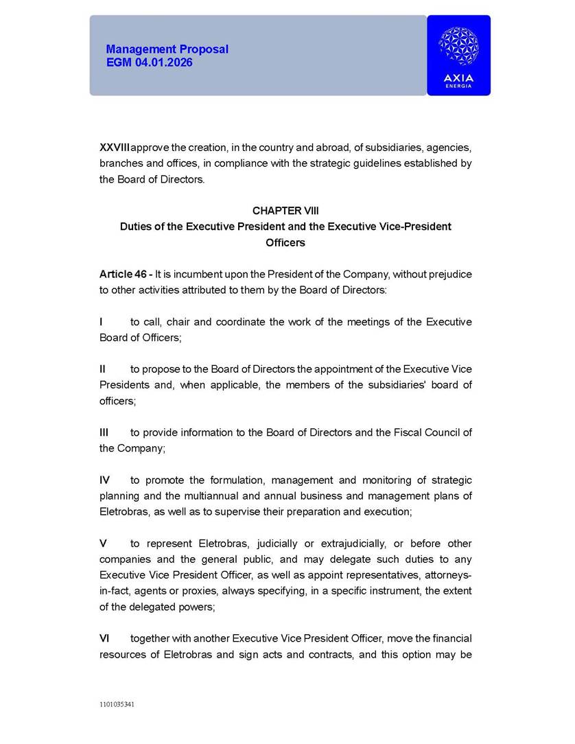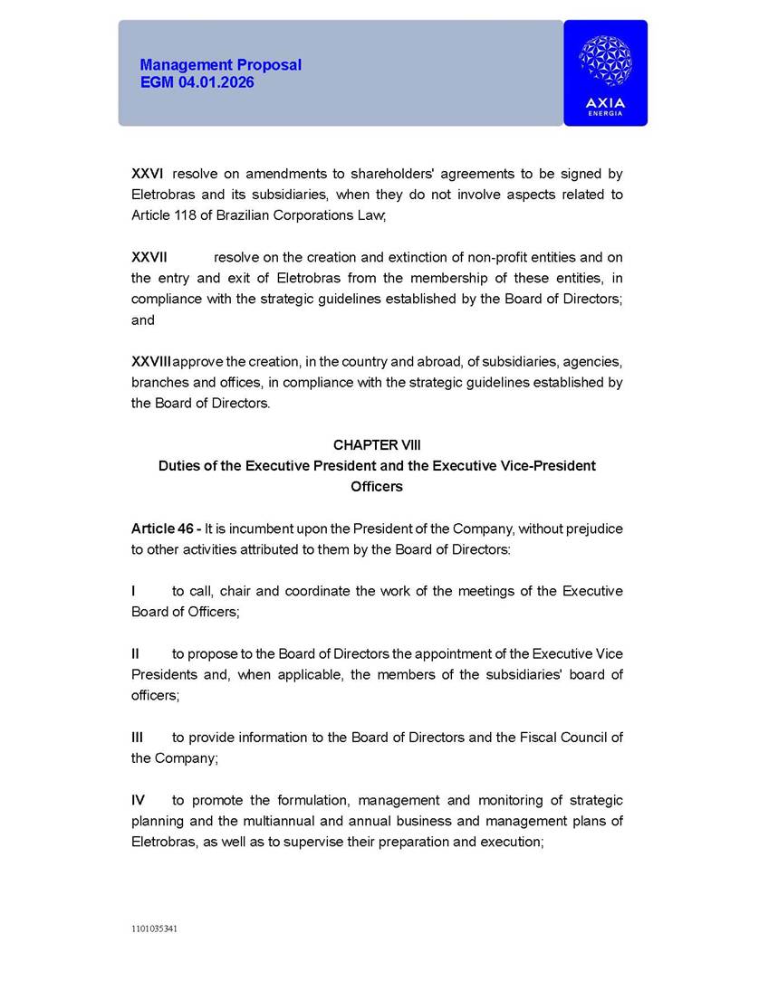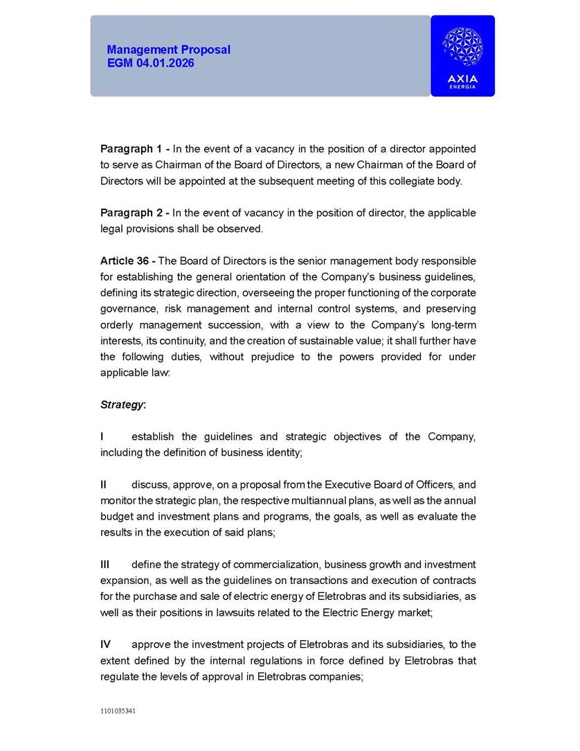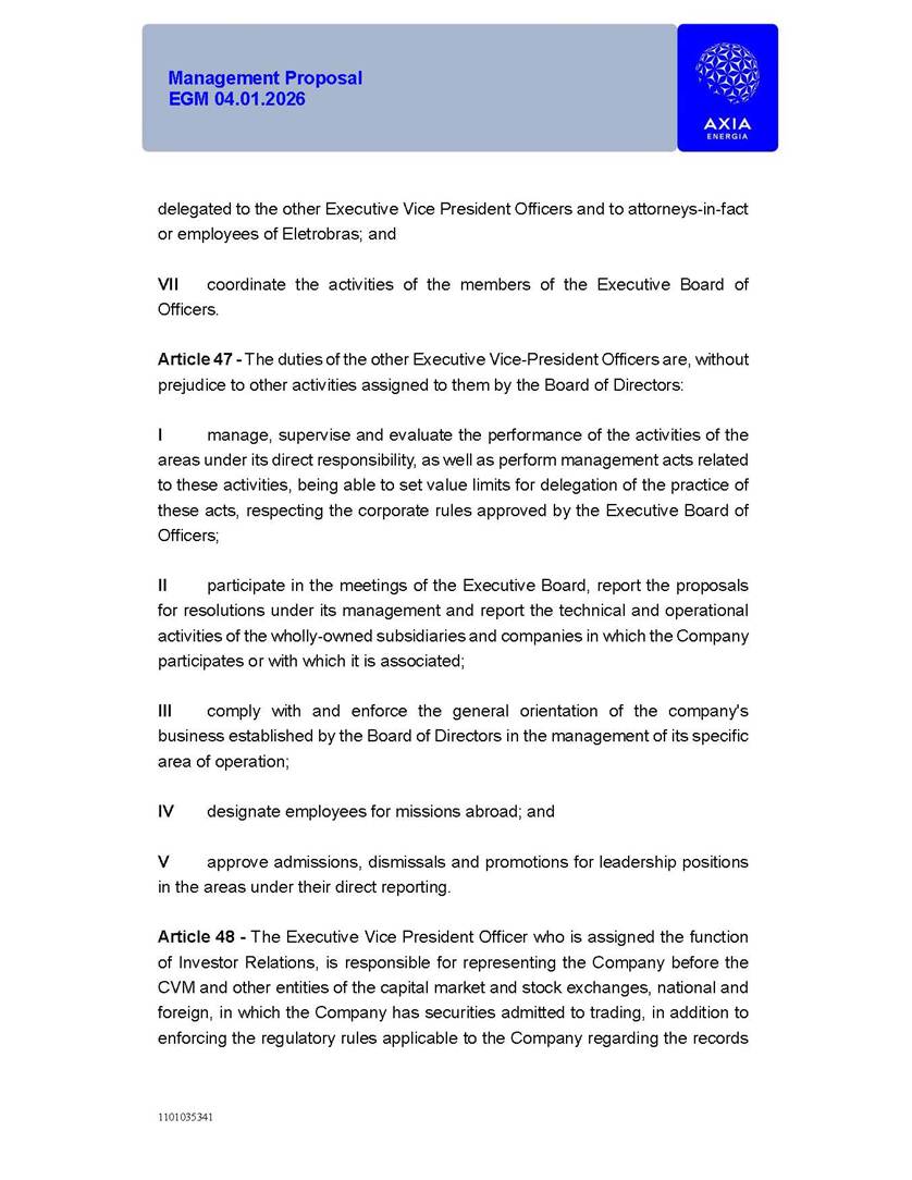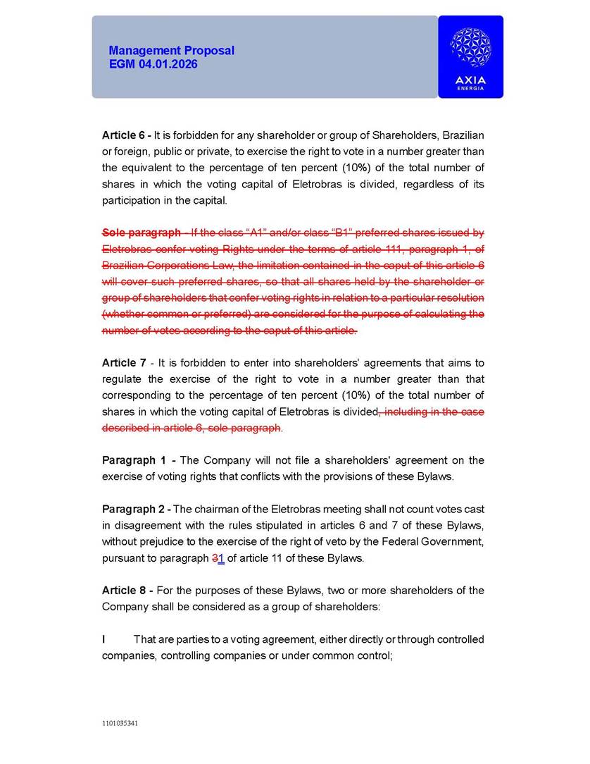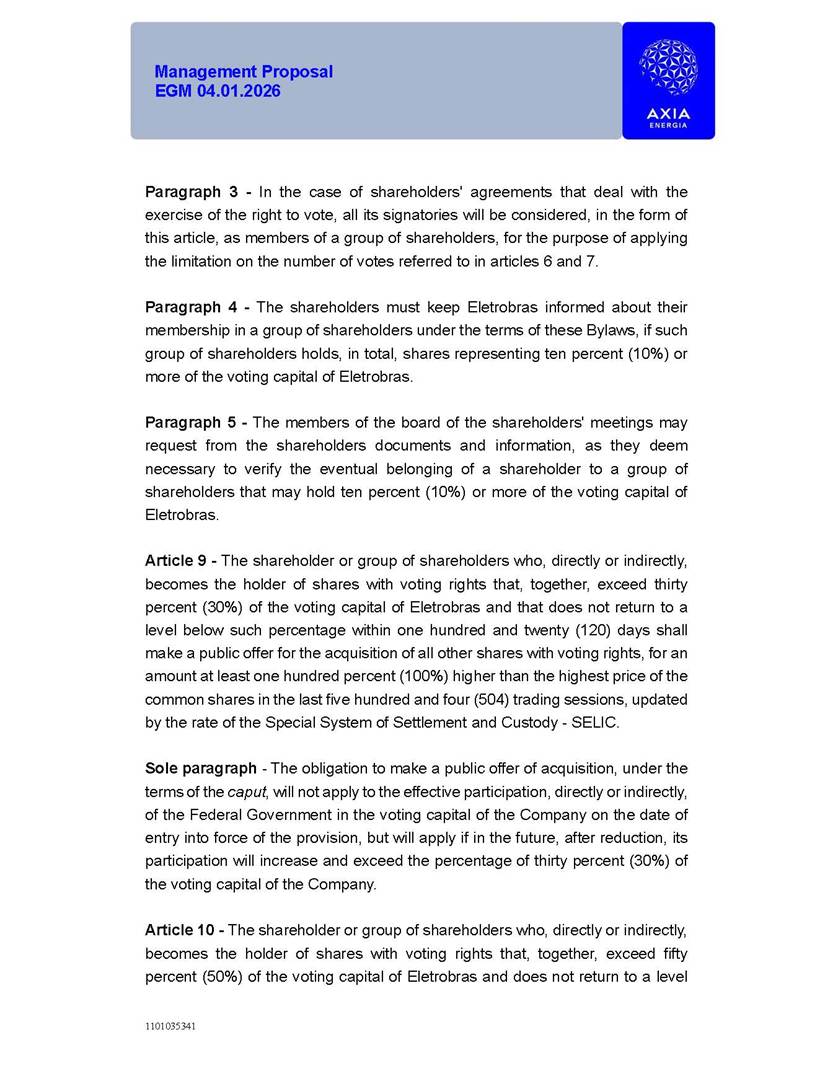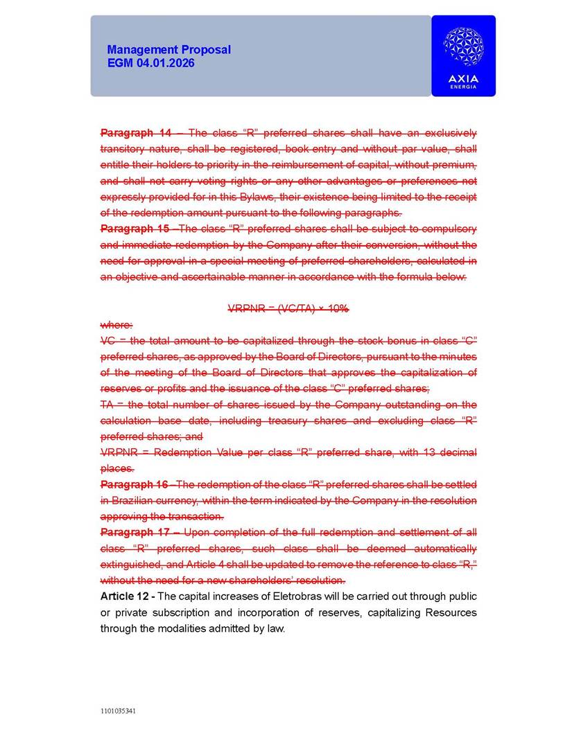 1101035341 Management Proposal EGM 04.01.2026 Management Proposal EGM 04.01.2026 1101035341 Management Proposal EGM 04.01.2026 Index 1. Manual for Participation ................................................................... 47 1.1. Introduction ...................................................................................... 47 1.2. Exclusively Digital Meeting .............................................................. 58 1.3. Remote Voting Ballot (BVD) ............................................................ 69 1.4. Required Documents ..................................................................... 812 1.5. Registration and Accreditation ..................................................... 1013 1.6. Declaration of Membership in a Group of Shareholders .............. 1215 2. Management Proposal .............................................................. 1417 2.1. General Guidelines ...................................................................... 1417 2.2. Agenda ........................................................................................ 1518 2.3. Clarifications on the agenda of the EGM ..................................... 1621 2.4. List of Schedules ......................................................................... 3344 2.5. Conclusion ................................................................................... 3545 SCHEDULE 1 ............................................................................................... 3646 SCHEDULE 2 ............................................................................................... 4259 SCHEDULE 3 ............................................................................................... 4664 SCHEDULE 4 ............................................................................................ 101119 SCHEDULE 5 ........................................................................................... 138157 SCHEDULE 6 ........................................................................................... 189208 SCHEDULE 7 ........................................................................................... 193212 SCHEDULE 8 ........................................................................................... 247266 SCHEDULE 9 ........................................................................................... 284304 1101035341 Management Proposal EGM 04.01.2026 1101035341 Management Proposal EGM 04.01.2026 1. Manual for Participation 1.1. Introduction The Management of CENTRAIS ELÉTRICAS BRASILEIRAS S.A. – Eletrobras, a corporation, headquartered in the City of Rio de Janeiro, State of Rio de Janeiro, at Avenida Graça Aranha, No. 26, Store A, Downtown, Zip code 20030-090, registered in the National Registry of Legal Entities (Cadastro Nacional de Pessoas Jurídicas) ("CNPJ") under No. 00.001.180/0001-26 ("Company" or "AXIA Energia"), with its bylaws filed with the Commercial Registry of the State of Rio de Janeiro (Junta Comercial do Estado do Rio de Janeiro) under NIRE 33.3.00346767, registered with the Brazilian Securities and Exchange Commission (Comissão de Valores Mobiliários) ("CVM") as a publicly-held company category "A" under the code 00243-7, with its securities currently admitted to trading on Level 1 of Corporate Governance of B3 S.A. – Brasil, Bolsa, Balcão ("B3"), pursuant to Brazilian Law No. 6,404, of 1976 ("Brazilian Corporate Law"), and CVM Resolution No. 81, of 2022 ("RCVM 81"), presents this Participation Manual, containing the information, documents and clarifications to guide the participation of shareholders at the Company's Extraordinary General Meeting, to be held exclusively digitally, on first call, on April 1, 2026, at 4 p.m., considering, therefore, to be held at the Company's headquarters ("Meeting" or "EGM" and "Manual", respectively), as well as the management proposal regarding the resolutions on the agenda, including the analysis of the matters submitted to the shareholders at the Meeting ("Management Proposal"). The Company's Management clarifies that, on this same date, it is also disclosing the call notice calling the Special Meeting of Class "A1" Preferred Shareholders ("PNA1") ("PNA1 Special Meeting") and the Special Meeting of Class "B1" Preferred Shareholders ("PNB1") ("PNB1 Special Meeting"), to be held, likewise, on April 1, 2026. As will be detailed in this Management Proposal, the PNA1 Special Meeting and the PNB1 Special Meeting are part of the context of this EGM, being held pursuant to and for the purposes of article 136, §1, of the Brazilian Corporate Law, given that the EGM agenda contemplates proposals for conversion of PNA1 and PNB1 shares. 1101035341 Management Proposal EGM 04.01.2026 1.2. Exclusively Digital Meeting The Meeting will be exclusively digital, to be held through the digital platform of "Atlas AGM" ("Digital Platform"). The exclusively digital format is intended to facilitate the participation of shareholders and others involved in the Meeting, pursuant to the Brazilian Corporate Law, RCVM 81 and the Company's Bylaws. Shareholders who wish to participate in the Meeting must register on the https://atlasagm.com website or through the "Atlas AGM" application available on the Apple Store and Google Play Store ("Application") and submit all documents necessary to qualify for participation or voting at the Meeting by 11:59 p.m. on March 30, 2026. The Digital Platform meets the requirements set forth in article 28, paragraph 1, items I to III, of RCVM 81 and the Meeting will be fully recorded. By accessing the Digital Platform and participating in the Meeting, the Admitted Shareholder (as defined below) authorizes the Company, and third parties authorized by the Company, to record and use the information, in accordance with applicable law. The recordings and related information will be used and processed by the Company for a period of five years, and may be used for the Company's de