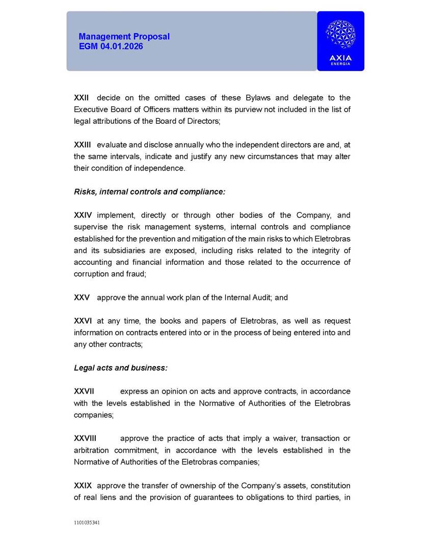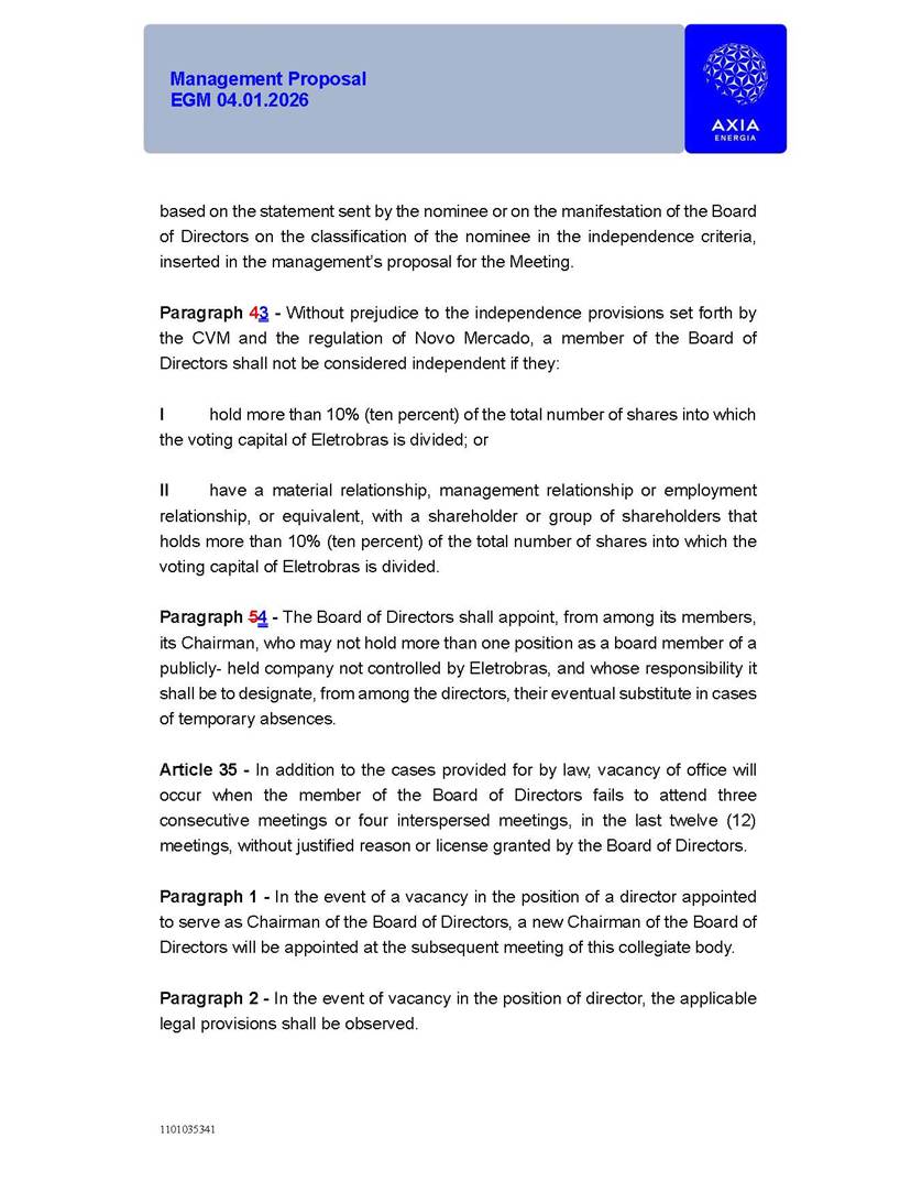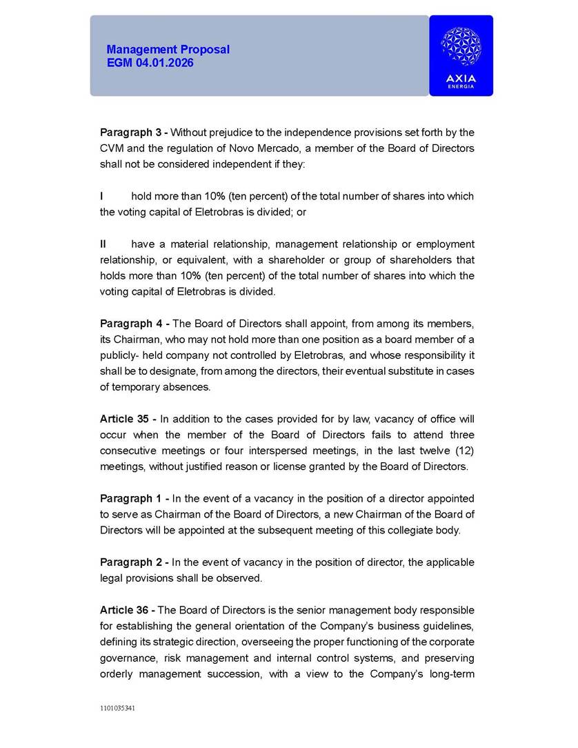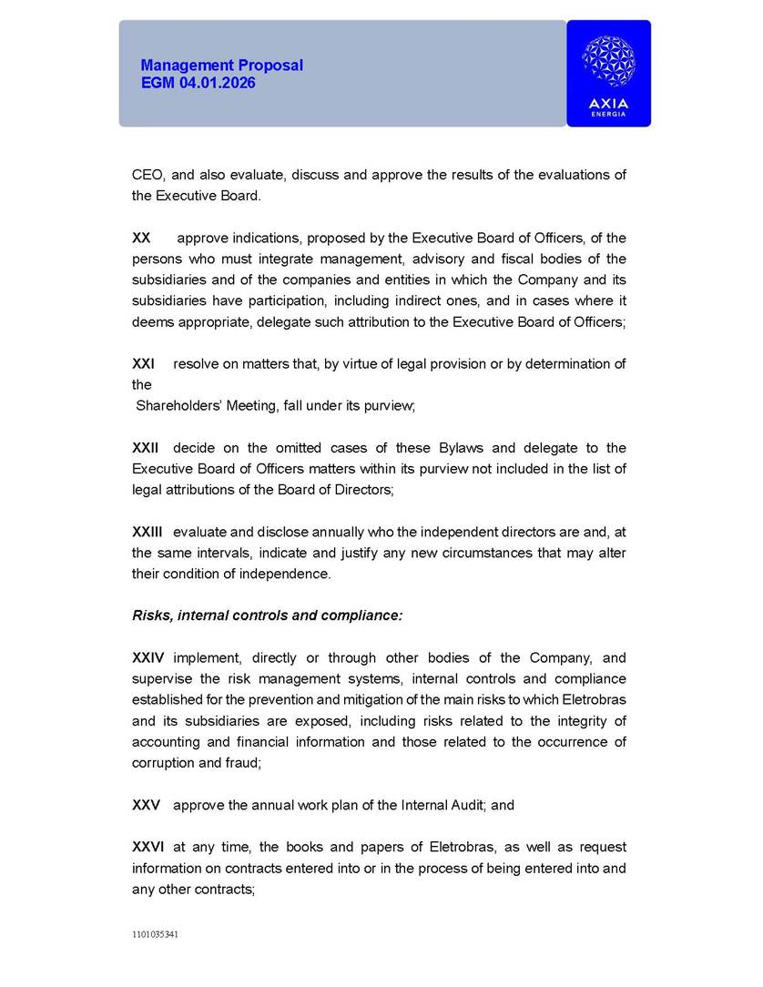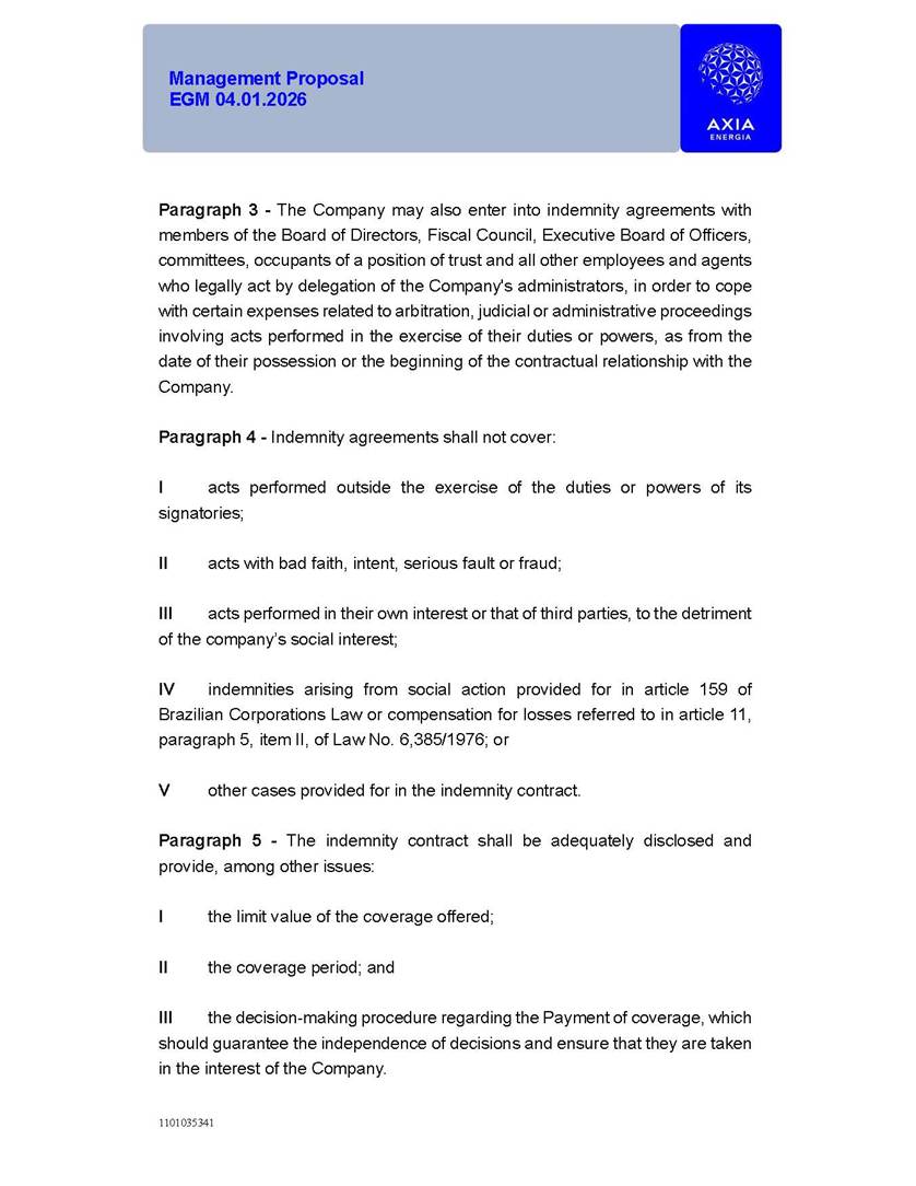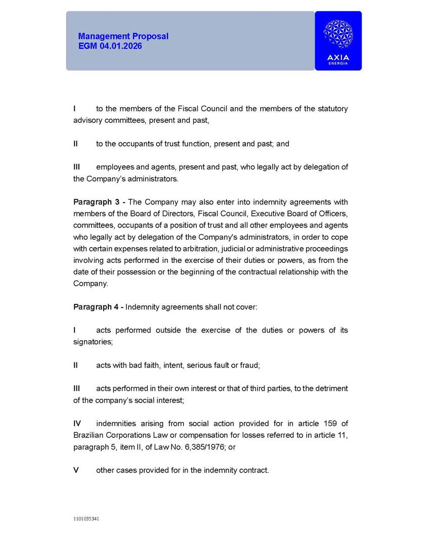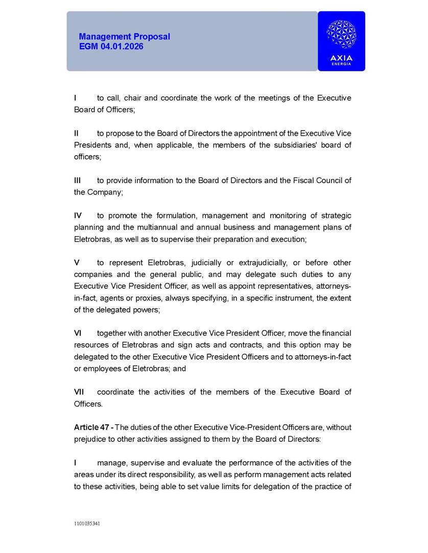 1101035341 Management Proposal EGM 04.01.2026 Management Proposal EGM 04.01.2026 1101035341 Management Proposal EGM 04.01.2026 Index 1. Manual for Participation ................................................................... 47 1.1. Introduction ...................................................................................... 47 1.2. Exclusively Digital Meeting .............................................................. 58 1.3. Remote Voting Ballot (BVD) ............................................................ 69 1.4. Required Documents ..................................................................... 812 1.5. Registration and Accreditation ..................................................... 1013 1.6. Declaration of Membership in a Group of Shareholders .............. 1215 2. Management Proposal .............................................................. 1417 2.1. General Guidelines ...................................................................... 1417 2.2. Agenda ........................................................................................ 1518 2.3. Clarifications on the agenda of the EGM ..................................... 1621 2.4. List of Schedules ......................................................................... 3344 2.5. Conclusion ................................................................................... 3545 SCHEDULE 1 ............................................................................................... 3646 SCHEDULE 2 ............................................................................................... 4259 SCHEDULE 3 ............................................................................................... 4664 SCHEDULE 4 ............................................................................................ 101119 SCHEDULE 5 ........................................................................................... 138157 SCHEDULE 6 ........................................................................................... 189208 SCHEDULE 7 ........................................................................................... 193212 SCHEDULE 8 ........................................................................................... 247266 SCHEDULE 9 ........................................................................................... 284304 1101035341 Management Proposal EGM 04.01.2026 1101035341 Management Proposal EGM 04.01.2026 1. Manual for Participation 1.1. Introduction The Management of CENTRAIS ELÉTRICAS BRASILEIRAS S.A. – Eletrobras, a corporation, headquartered in the City of Rio de Janeiro, State of Rio de Janeiro, at Avenida Graça Aranha, No. 26, Store A, Downtown, Zip code 20030-090, registered in the National Registry of Legal Entities (Cadastro Nacional de Pessoas Jurídicas) ("CNPJ") under No. 00.001.180/0001-26 ("Company" or "AXIA Energia"), with its bylaws filed with the Commercial Registry of the State of Rio de Janeiro (Junta Comercial do Estado do Rio de Janeiro) under NIRE 33.3.00346767, registered with the Brazilian Securities and Exchange Commission (Comissão de Valores Mobiliários) ("CVM") as a publicly-held company category "A" under the code 00243-7, with its securities currently admitted to trading on Level 1 of Corporate Governance of B3 S.A. – Brasil, Bolsa, Balcão ("B3"), pursuant to Brazilian Law No. 6,404, of 1976 ("Brazilian Corporate Law"), and CVM Resolution No. 81, of 2022 ("RCVM 81"), presents this Participation Manual, containing the information, documents and clarifications to guide the participation of shareholders at the Company's Extraordinary General Meeting, to be held exclusively digitally, on first call, on April 1, 2026, at 4 p.m., considering, therefore, to be held at the Company's headquarters ("Meeting" or "EGM" and "Manual", respectively), as well as the management proposal regarding the resolutions on the agenda, including the analysis of the matters submitted to the shareholders at the Meeting ("Management Proposal"). The Company's Management clarifies that, on this same date, it is also disclosing the call notice calling the Special Meeting of Class "A1" Preferred Shareholders ("PNA1") ("PNA1 Special Meeting") and the Special Meeting of Class "B1" Preferred Shareholders ("PNB1") ("PNB1 Special Meeting"), to be held, likewise, on April 1, 2026. As will be detailed in this Management Proposal, the PNA1 Special Meeting and the PNB1 Special Meeting are part of the context of this EGM, being held pursuant to and for the purposes of article 136, §1, of the Brazilian Corporate Law, given that the EGM agenda contemplates proposals for conversion of PNA1 and PNB1 shares. 1101035341 Management Proposal EGM 04.01.2026 1.2. Exclusively Digital Meeting The Meeting will be exclusively digital, to be held through the digital platform of "Atlas AGM" ("Digital Platform"). The exclusively digital format is intended to facilitate the participation of shareholders and others involved in the Meeting, pursuant to the Brazilian Corporate Law, RCVM 81 and the Company's Bylaws. Shareholders who wish to participate in the Meeting must register on the https://atlasagm.com website or through the "Atlas AGM" application available on the Apple Store and Google Play Store ("Application") and submit all documents necessary to qualify for participation or voting at the Meeting by 11:59 p.m. on March 30, 2026. The Digital Platform meets the requirements set forth in article 28, paragraph 1, items I to III, of RCVM 81 and the Meeting will be fully recorded. By accessing the Digital Platform and participating in the Meeting, the Admitted Shareholder (as defined below) authorizes the Company, and third parties authorized by the Company, to record and use the information, in accordance with applicable law. The recordings and related information will be used and processed by the Company for a period of five years, and may be used for the Company's de