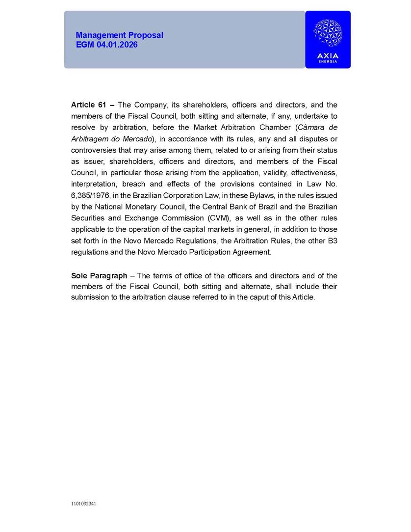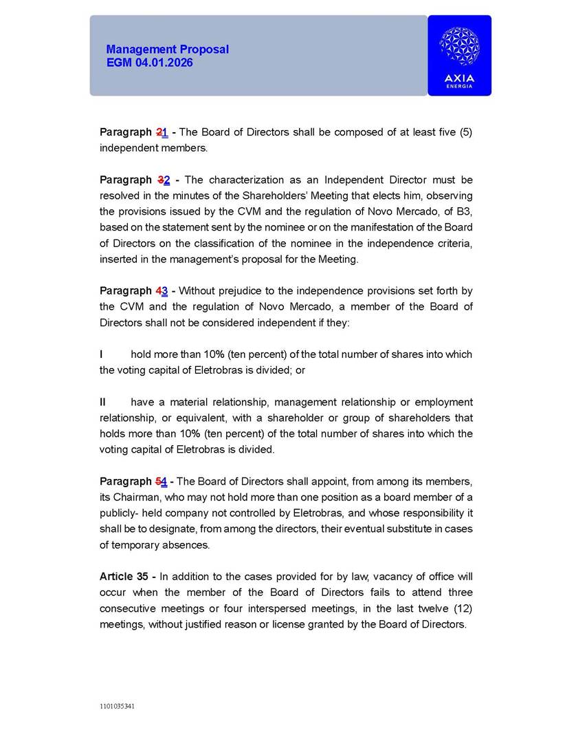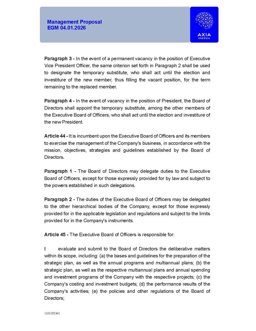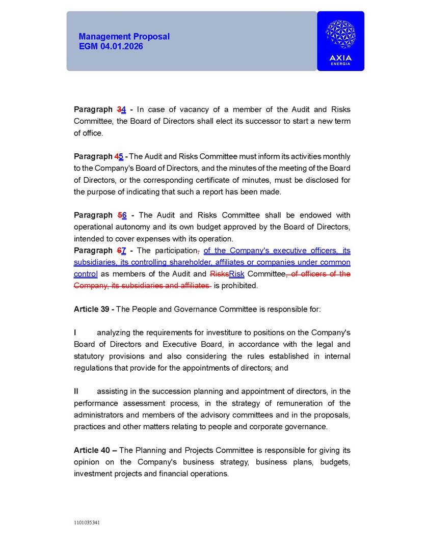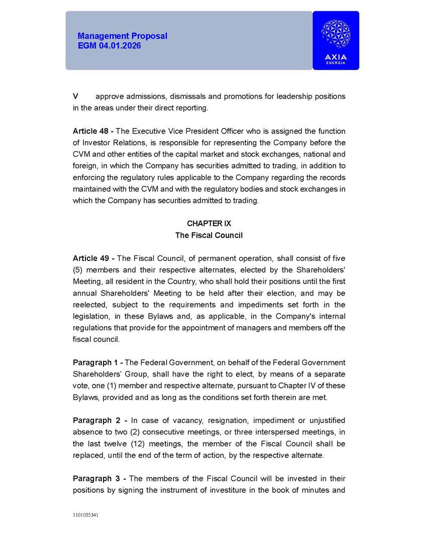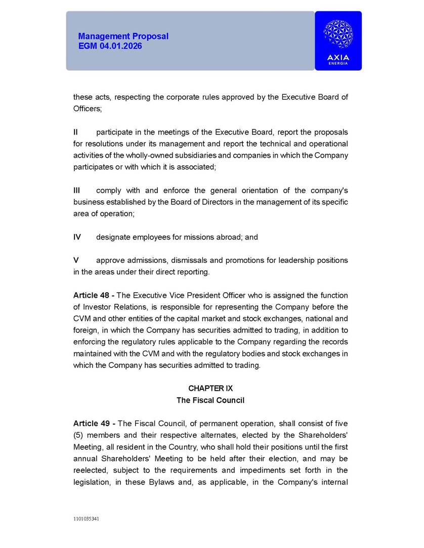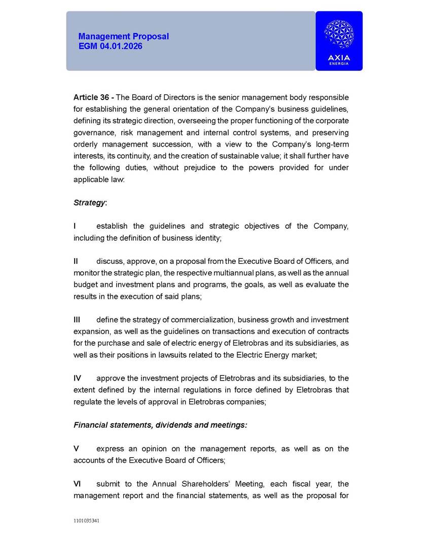 1101035341 Management Proposal EGM 04.01.2026 Management Proposal EGM 04.01.2026 1101035341 Management Proposal EGM 04.01.2026 Index 1. Manual for Participation ................................................................... 47 1.1. Introduction ...................................................................................... 47 1.2. Exclusively Digital Meeting .............................................................. 58 1.3. Remote Voting Ballot (BVD) ............................................................ 69 1.4. Required Documents ..................................................................... 812 1.5. Registration and Accreditation ..................................................... 1013 1.6. Declaration of Membership in a Group of Shareholders .............. 1215 2. Management Proposal .............................................................. 1417 2.1. General Guidelines ...................................................................... 1417 2.2. Agenda ........................................................................................ 1518 2.3. Clarifications on the agenda of the EGM ..................................... 1621 2.4. List of Schedules ......................................................................... 3344 2.5. Conclusion ................................................................................... 3545 SCHEDULE 1 ............................................................................................... 3646 SCHEDULE 2 ............................................................................................... 4259 SCHEDULE 3 ............................................................................................... 4664 SCHEDULE 4 ............................................................................................ 101119 SCHEDULE 5 ........................................................................................... 138157 SCHEDULE 6 ........................................................................................... 189208 SCHEDULE 7 ........................................................................................... 193212 SCHEDULE 8 ........................................................................................... 247266 SCHEDULE 9 ........................................................................................... 284304 1101035341 Management Proposal EGM 04.01.2026 1101035341 Management Proposal EGM 04.01.2026 1. Manual for Participation 1.1. Introduction The Management of CENTRAIS ELÉTRICAS BRASILEIRAS S.A. – Eletrobras, a corporation, headquartered in the City of Rio de Janeiro, State of Rio de Janeiro, at Avenida Graça Aranha, No. 26, Store A, Downtown, Zip code 20030-090, registered in the National Registry of Legal Entities (Cadastro Nacional de Pessoas Jurídicas) ("CNPJ") under No. 00.001.180/0001-26 ("Company" or "AXIA Energia"), with its bylaws filed with the Commercial Registry of the State of Rio de Janeiro (Junta Comercial do Estado do Rio de Janeiro) under NIRE 33.3.00346767, registered with the Brazilian Securities and Exchange Commission (Comissão de Valores Mobiliários) ("CVM") as a publicly-held company category "A" under the code 00243-7, with its securities currently admitted to trading on Level 1 of Corporate Governance of B3 S.A. – Brasil, Bolsa, Balcão ("B3"), pursuant to Brazilian Law No. 6,404, of 1976 ("Brazilian Corporate Law"), and CVM Resolution No. 81, of 2022 ("RCVM 81"), presents this Participation Manual, containing the information, documents and clarifications to guide the participation of shareholders at the Company's Extraordinary General Meeting, to be held exclusively digitally, on first call, on April 1, 2026, at 4 p.m., considering, therefore, to be held at the Company's headquarters ("Meeting" or "EGM" and "Manual", respectively), as well as the management proposal regarding the resolutions on the agenda, including the analysis of the matters submitted to the shareholders at the Meeting ("Management Proposal"). The Company's Management clarifies that, on this same date, it is also disclosing the call notice calling the Special Meeting of Class "A1" Preferred Shareholders ("PNA1") ("PNA1 Special Meeting") and the Special Meeting of Class "B1" Preferred Shareholders ("PNB1") ("PNB1 Special Meeting"), to be held, likewise, on April 1, 2026. As will be detailed in this Management Proposal, the PNA1 Special Meeting and the PNB1 Special Meeting are part of the context of this EGM, being held pursuant to and for the purposes of article 136, §1, of the Brazilian Corporate Law, given that the EGM agenda contemplates proposals for conversion of PNA1 and PNB1 shares. 1101035341 Management Proposal EGM 04.01.2026 1.2. Exclusively Digital Meeting The Meeting will be exclusively digital, to be held through the digital platform of "Atlas AGM" ("Digital Platform"). The exclusively digital format is intended to facilitate the participation of shareholders and others involved in the Meeting, pursuant to the Brazilian Corporate Law, RCVM 81 and the Company's Bylaws. Shareholders who wish to participate in the Meeting must register on the https://atlasagm.com website or through the "Atlas AGM" application available on the Apple Store and Google Play Store ("Application") and submit all documents necessary to qualify for participation or voting at the Meeting by 11:59 p.m. on March 30, 2026. The Digital Platform meets the requirements set forth in article 28, paragraph 1, items I to III, of RCVM 81 and the Meeting will be fully recorded. By accessing the Digital Platform and participating in the Meeting, the Admitted Shareholder (as defined below) authorizes the Company, and third parties authorized by the Company, to record and use the information, in accordance with applicable law. The recordings and related information will be used and processed by the Company for a period of five years, and may be used for the Company's de