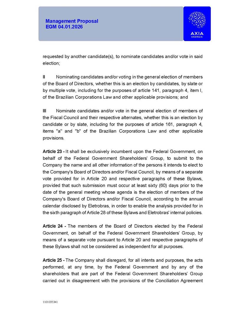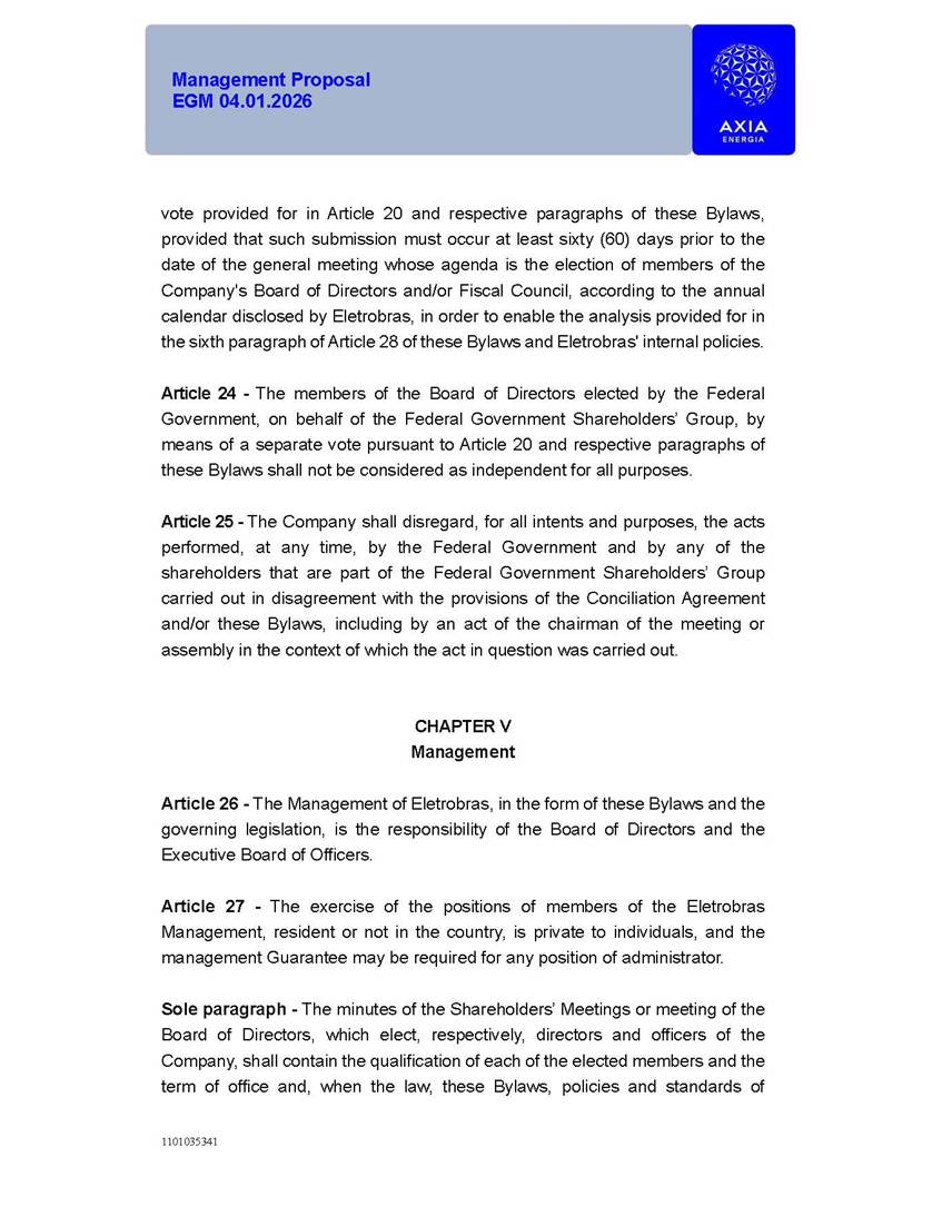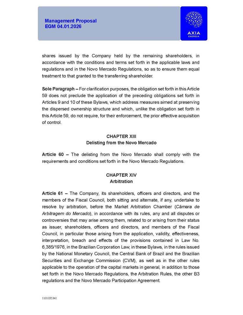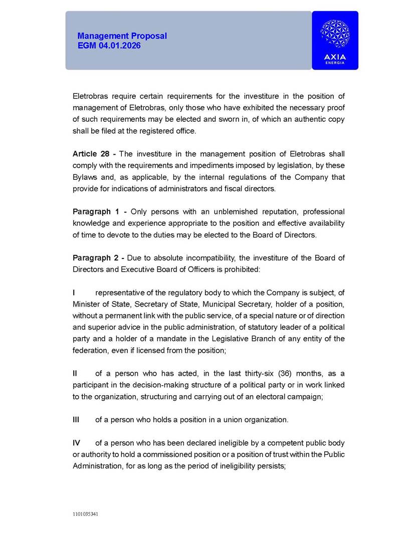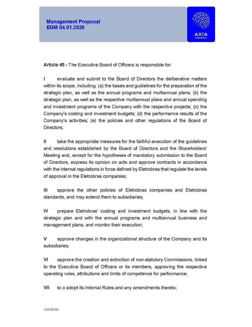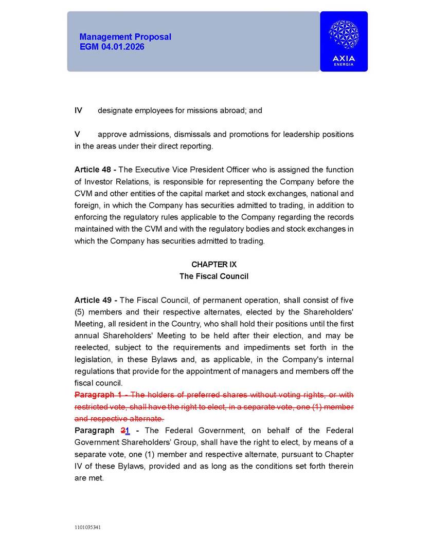 1101035341 Management Proposal EGM 04.01.2026 Management Proposal EGM 04.01.2026 1101035341 Management Proposal EGM 04.01.2026 Index 1. Manual for Participation ................................................................... 47 1.1. Introduction ...................................................................................... 47 1.2. Exclusively Digital Meeting .............................................................. 58 1.3. Remote Voting Ballot (BVD) ............................................................ 69 1.4. Required Documents ..................................................................... 812 1.5. Registration and Accreditation ..................................................... 1013 1.6. Declaration of Membership in a Group of Shareholders .............. 1215 2. Management Proposal .............................................................. 1417 2.1. General Guidelines ...................................................................... 1417 2.2. Agenda ........................................................................................ 1518 2.3. Clarifications on the agenda of the EGM ..................................... 1621 2.4. List of Schedules ......................................................................... 3344 2.5. Conclusion ................................................................................... 3545 SCHEDULE 1 ............................................................................................... 3646 SCHEDULE 2 ............................................................................................... 4259 SCHEDULE 3 ............................................................................................... 4664 SCHEDULE 4 ............................................................................................ 101119 SCHEDULE 5 ........................................................................................... 138157 SCHEDULE 6 ........................................................................................... 189208 SCHEDULE 7 ........................................................................................... 193212 SCHEDULE 8 ........................................................................................... 247266 SCHEDULE 9 ........................................................................................... 284304 1101035341 Management Proposal EGM 04.01.2026 1101035341 Management Proposal EGM 04.01.2026 1. Manual for Participation 1.1. Introduction The Management of CENTRAIS ELÉTRICAS BRASILEIRAS S.A. – Eletrobras, a corporation, headquartered in the City of Rio de Janeiro, State of Rio de Janeiro, at Avenida Graça Aranha, No. 26, Store A, Downtown, Zip code 20030-090, registered in the National Registry of Legal Entities (Cadastro Nacional de Pessoas Jurídicas) ("CNPJ") under No. 00.001.180/0001-26 ("Company" or "AXIA Energia"), with its bylaws filed with the Commercial Registry of the State of Rio de Janeiro (Junta Comercial do Estado do Rio de Janeiro) under NIRE 33.3.00346767, registered with the Brazilian Securities and Exchange Commission (Comissão de Valores Mobiliários) ("CVM") as a publicly-held company category "A" under the code 00243-7, with its securities currently admitted to trading on Level 1 of Corporate Governance of B3 S.A. – Brasil, Bolsa, Balcão ("B3"), pursuant to Brazilian Law No. 6,404, of 1976 ("Brazilian Corporate Law"), and CVM Resolution No. 81, of 2022 ("RCVM 81"), presents this Participation Manual, containing the information, documents and clarifications to guide the participation of shareholders at the Company's Extraordinary General Meeting, to be held exclusively digitally, on first call, on April 1, 2026, at 4 p.m., considering, therefore, to be held at the Company's headquarters ("Meeting" or "EGM" and "Manual", respectively), as well as the management proposal regarding the resolutions on the agenda, including the analysis of the matters submitted to the shareholders at the Meeting ("Management Proposal"). The Company's Management clarifies that, on this same date, it is also disclosing the call notice calling the Special Meeting of Class "A1" Preferred Shareholders ("PNA1") ("PNA1 Special Meeting") and the Special Meeting of Class "B1" Preferred Shareholders ("PNB1") ("PNB1 Special Meeting"), to be held, likewise, on April 1, 2026. As will be detailed in this Management Proposal, the PNA1 Special Meeting and the PNB1 Special Meeting are part of the context of this EGM, being held pursuant to and for the purposes of article 136, §1, of the Brazilian Corporate Law, given that the EGM agenda contemplates proposals for conversion of PNA1 and PNB1 shares. 1101035341 Management Proposal EGM 04.01.2026 1.2. Exclusively Digital Meeting The Meeting will be exclusively digital, to be held through the digital platform of "Atlas AGM" ("Digital Platform"). The exclusively digital format is intended to facilitate the participation of shareholders and others involved in the Meeting, pursuant to the Brazilian Corporate Law, RCVM 81 and the Company's Bylaws. Shareholders who wish to participate in the Meeting must register on the https://atlasagm.com website or through the "Atlas AGM" application available on the Apple Store and Google Play Store ("Application") and submit all documents necessary to qualify for participation or voting at the Meeting by 11:59 p.m. on March 30, 2026. The Digital Platform meets the requirements set forth in article 28, paragraph 1, items I to III, of RCVM 81 and the Meeting will be fully recorded. By accessing the Digital Platform and participating in the Meeting, the Admitted Shareholder (as defined below) authorizes the Company, and third parties authorized by the Company, to record and use the information, in accordance with applicable law. The recordings and related information will be used and processed by the Company for a period of five years, and may be used for the Company's de