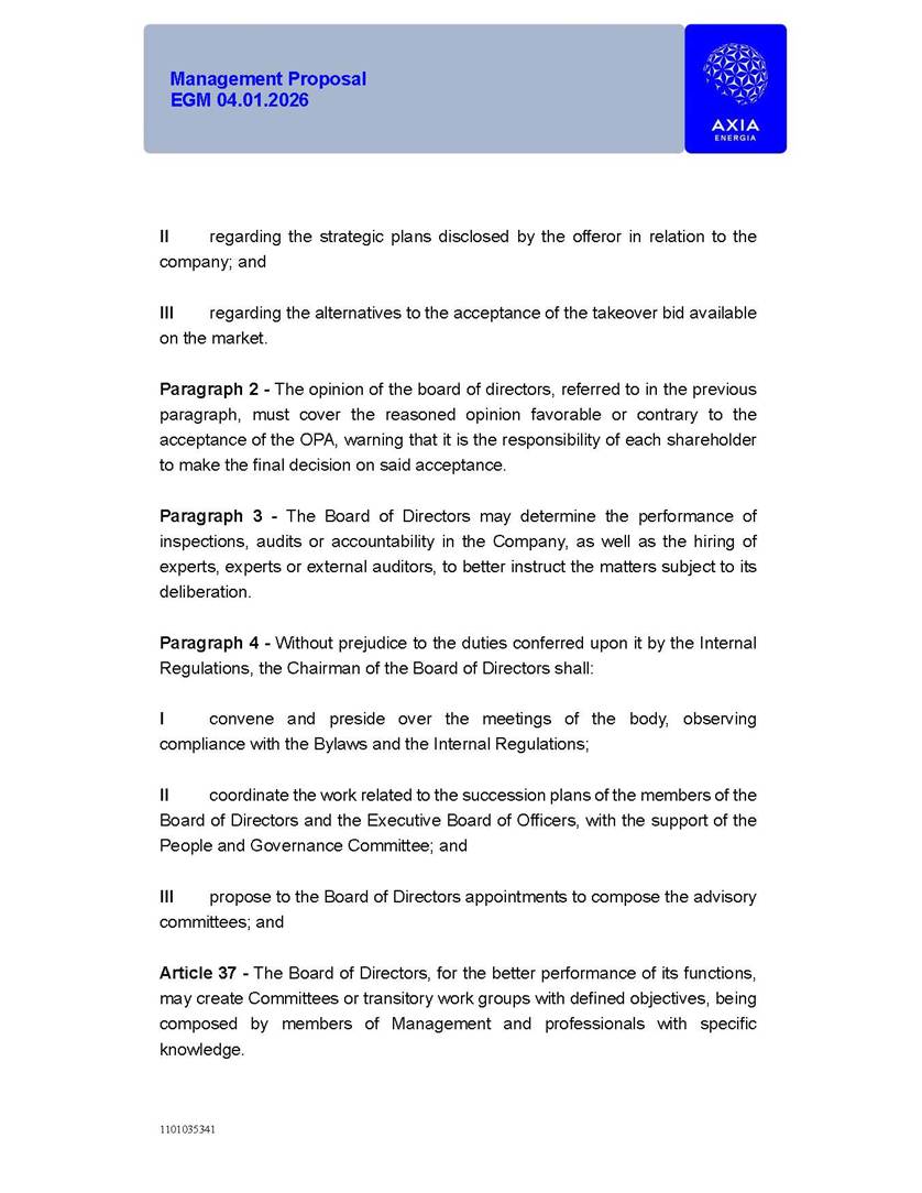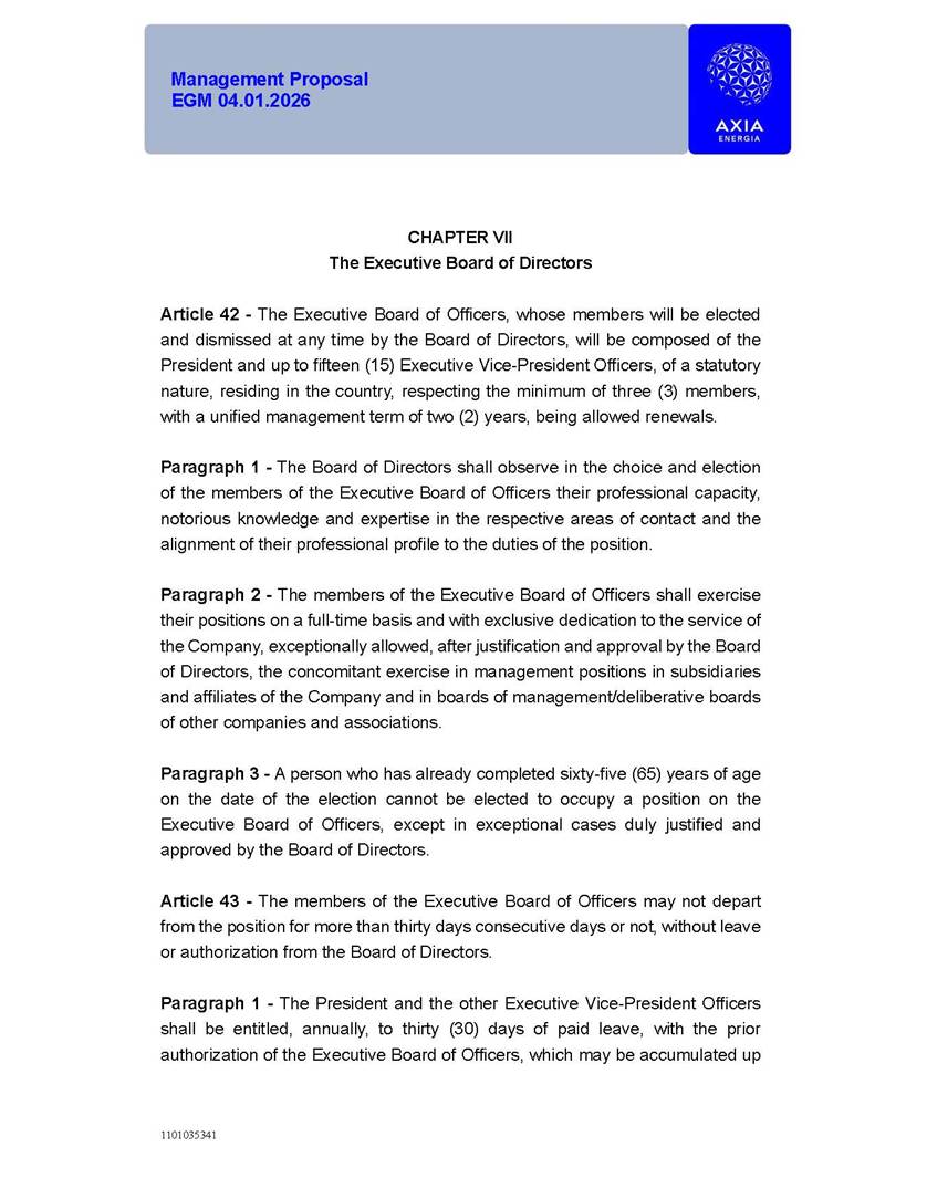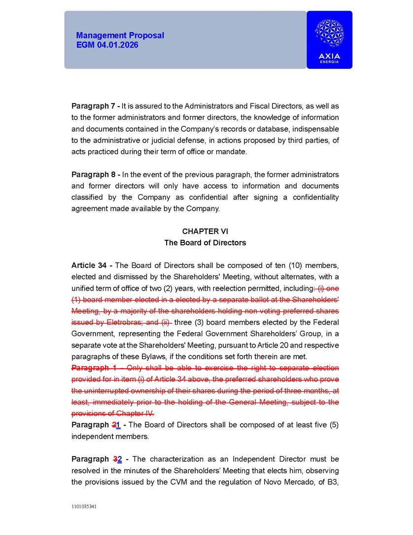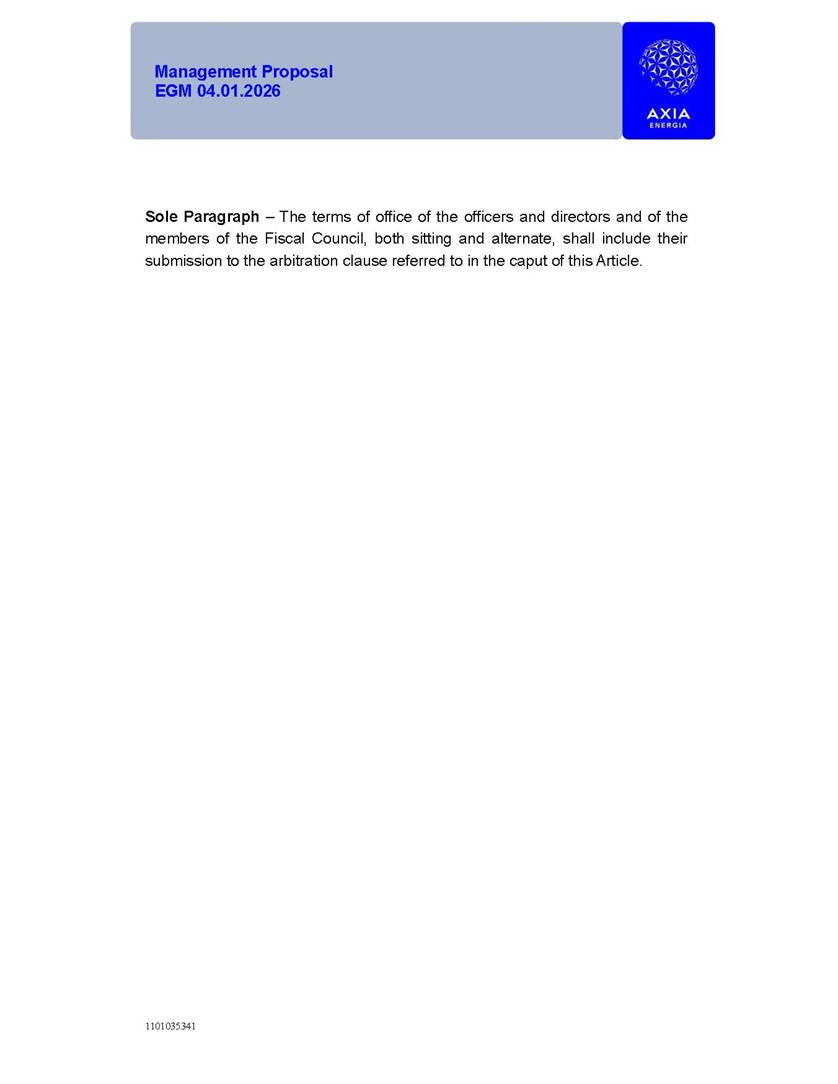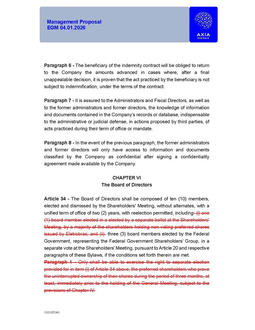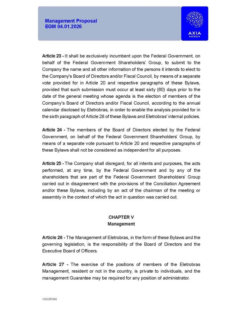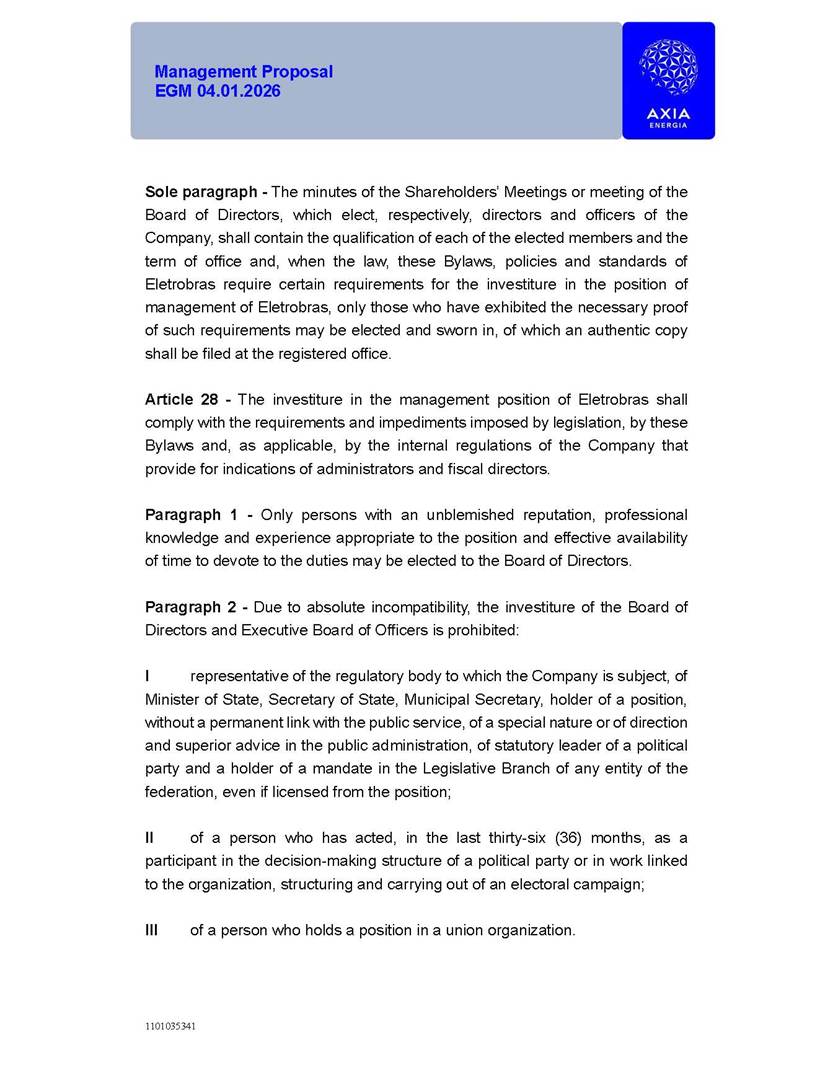 1101035341 Management Proposal EGM 04.01.2026 Management Proposal EGM 04.01.2026 1101035341 Management Proposal EGM 04.01.2026 Index 1. Manual for Participation ................................................................... 47 1.1. Introduction ...................................................................................... 47 1.2. Exclusively Digital Meeting .............................................................. 58 1.3. Remote Voting Ballot (BVD) ............................................................ 69 1.4. Required Documents ..................................................................... 812 1.5. Registration and Accreditation ..................................................... 1013 1.6. Declaration of Membership in a Group of Shareholders .............. 1215 2. Management Proposal .............................................................. 1417 2.1. General Guidelines ...................................................................... 1417 2.2. Agenda ........................................................................................ 1518 2.3. Clarifications on the agenda of the EGM ..................................... 1621 2.4. List of Schedules ......................................................................... 3344 2.5. Conclusion ................................................................................... 3545 SCHEDULE 1 ............................................................................................... 3646 SCHEDULE 2 ............................................................................................... 4259 SCHEDULE 3 ............................................................................................... 4664 SCHEDULE 4 ............................................................................................ 101119 SCHEDULE 5 ........................................................................................... 138157 SCHEDULE 6 ........................................................................................... 189208 SCHEDULE 7 ........................................................................................... 193212 SCHEDULE 8 ........................................................................................... 247266 SCHEDULE 9 ........................................................................................... 284304 1101035341 Management Proposal EGM 04.01.2026 1101035341 Management Proposal EGM 04.01.2026 1. Manual for Participation 1.1. Introduction The Management of CENTRAIS ELÉTRICAS BRASILEIRAS S.A. – Eletrobras, a corporation, headquartered in the City of Rio de Janeiro, State of Rio de Janeiro, at Avenida Graça Aranha, No. 26, Store A, Downtown, Zip code 20030-090, registered in the National Registry of Legal Entities (Cadastro Nacional de Pessoas Jurídicas) ("CNPJ") under No. 00.001.180/0001-26 ("Company" or "AXIA Energia"), with its bylaws filed with the Commercial Registry of the State of Rio de Janeiro (Junta Comercial do Estado do Rio de Janeiro) under NIRE 33.3.00346767, registered with the Brazilian Securities and Exchange Commission (Comissão de Valores Mobiliários) ("CVM") as a publicly-held company category "A" under the code 00243-7, with its securities currently admitted to trading on Level 1 of Corporate Governance of B3 S.A. – Brasil, Bolsa, Balcão ("B3"), pursuant to Brazilian Law No. 6,404, of 1976 ("Brazilian Corporate Law"), and CVM Resolution No. 81, of 2022 ("RCVM 81"), presents this Participation Manual, containing the information, documents and clarifications to guide the participation of shareholders at the Company's Extraordinary General Meeting, to be held exclusively digitally, on first call, on April 1, 2026, at 4 p.m., considering, therefore, to be held at the Company's headquarters ("Meeting" or "EGM" and "Manual", respectively), as well as the management proposal regarding the resolutions on the agenda, including the analysis of the matters submitted to the shareholders at the Meeting ("Management Proposal"). The Company's Management clarifies that, on this same date, it is also disclosing the call notice calling the Special Meeting of Class "A1" Preferred Shareholders ("PNA1") ("PNA1 Special Meeting") and the Special Meeting of Class "B1" Preferred Shareholders ("PNB1") ("PNB1 Special Meeting"), to be held, likewise, on April 1, 2026. As will be detailed in this Management Proposal, the PNA1 Special Meeting and the PNB1 Special Meeting are part of the context of this EGM, being held pursuant to and for the purposes of article 136, §1, of the Brazilian Corporate Law, given that the EGM agenda contemplates proposals for conversion of PNA1 and PNB1 shares. 1101035341 Management Proposal EGM 04.01.2026 1.2. Exclusively Digital Meeting The Meeting will be exclusively digital, to be held through the digital platform of "Atlas AGM" ("Digital Platform"). The exclusively digital format is intended to facilitate the participation of shareholders and others involved in the Meeting, pursuant to the Brazilian Corporate Law, RCVM 81 and the Company's Bylaws. Shareholders who wish to participate in the Meeting must register on the https://atlasagm.com website or through the "Atlas AGM" application available on the Apple Store and Google Play Store ("Application") and submit all documents necessary to qualify for participation or voting at the Meeting by 11:59 p.m. on March 30, 2026. The Digital Platform meets the requirements set forth in article 28, paragraph 1, items I to III, of RCVM 81 and the Meeting will be fully recorded. By accessing the Digital Platform and participating in the Meeting, the Admitted Shareholder (as defined below) authorizes the Company, and third parties authorized by the Company, to record and use the information, in accordance with applicable law. The recordings and related information will be used and processed by the Company for a period of five years, and may be used for the Company's de