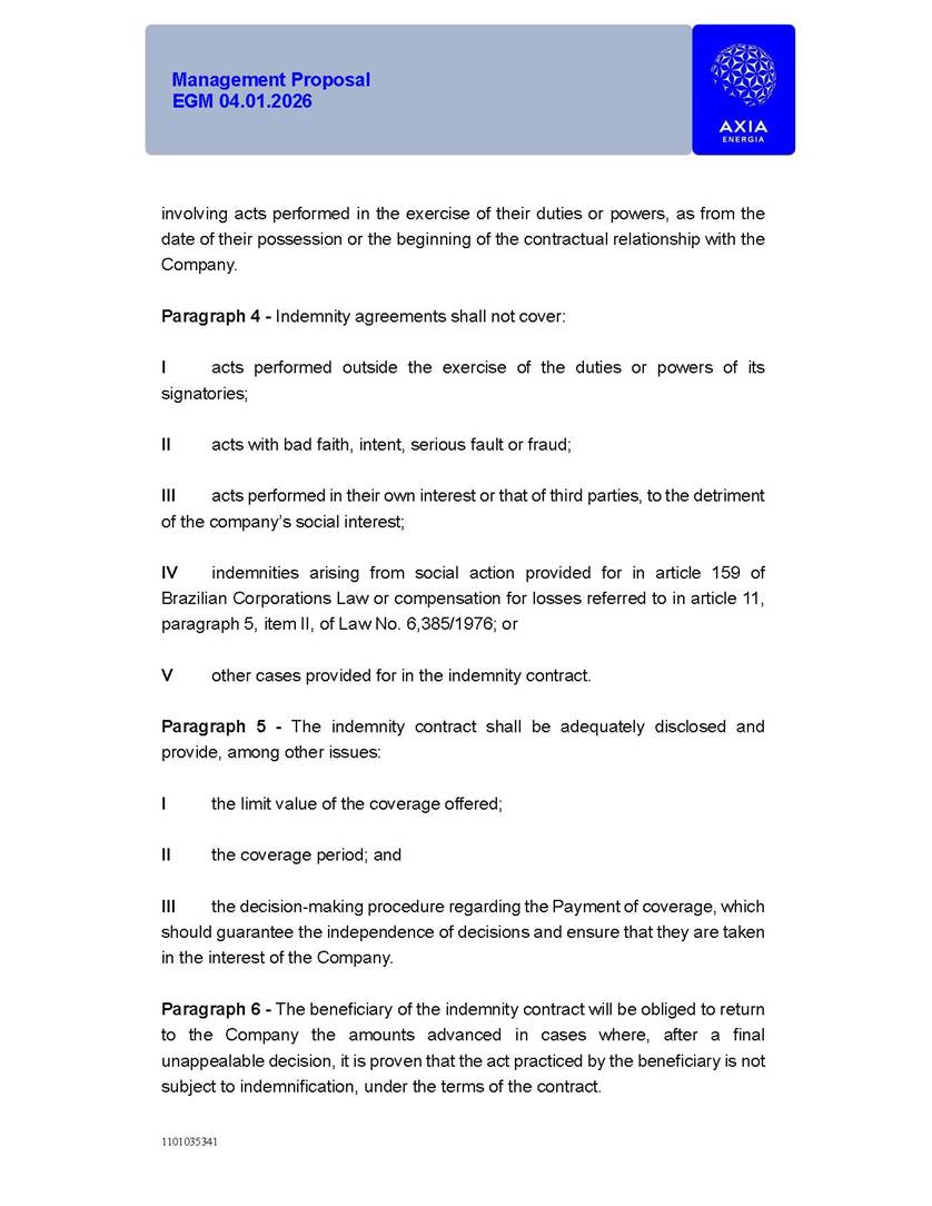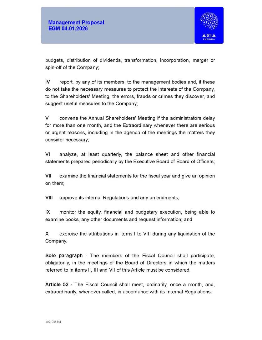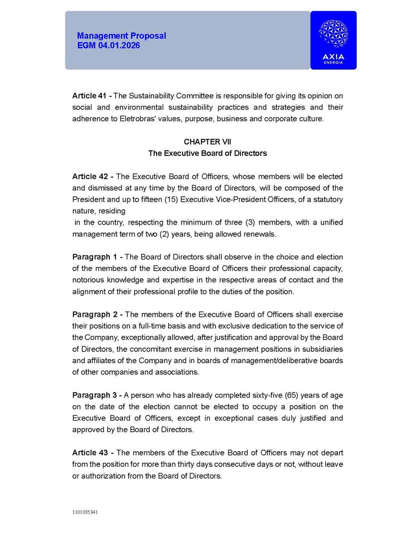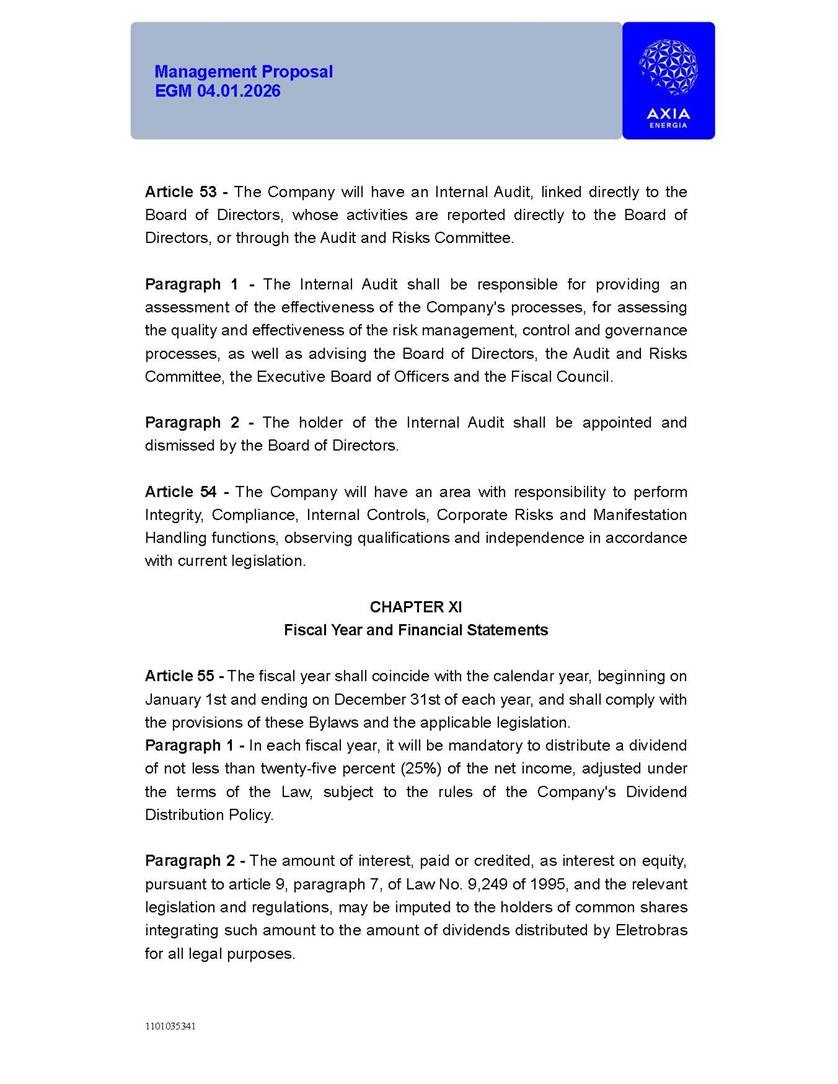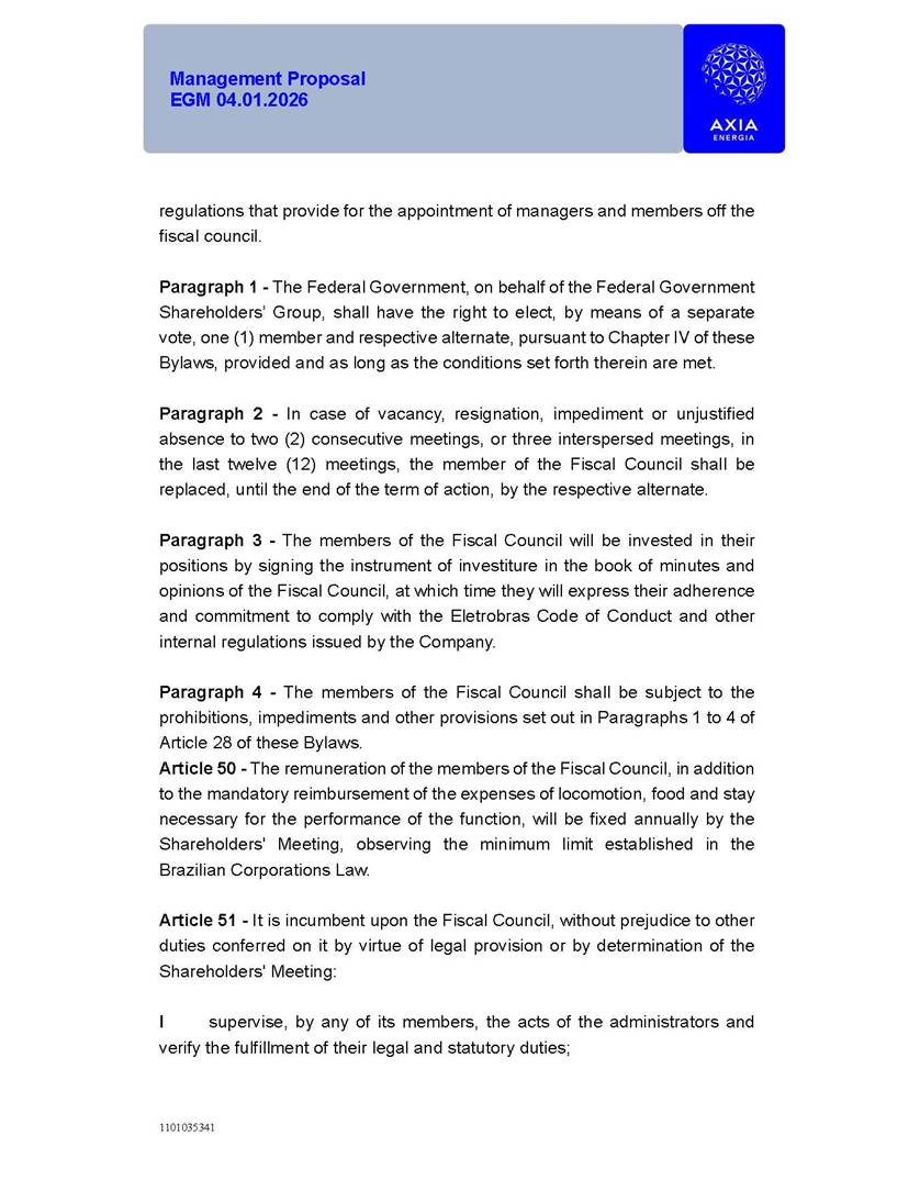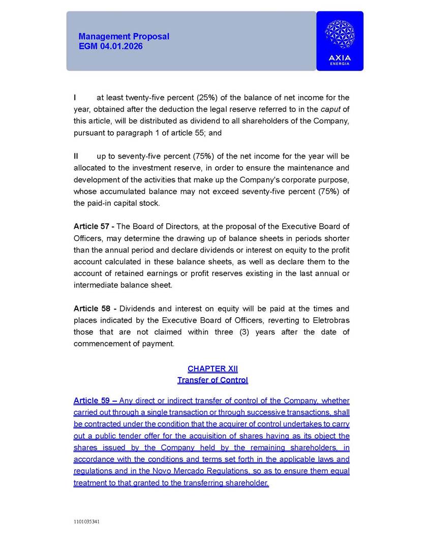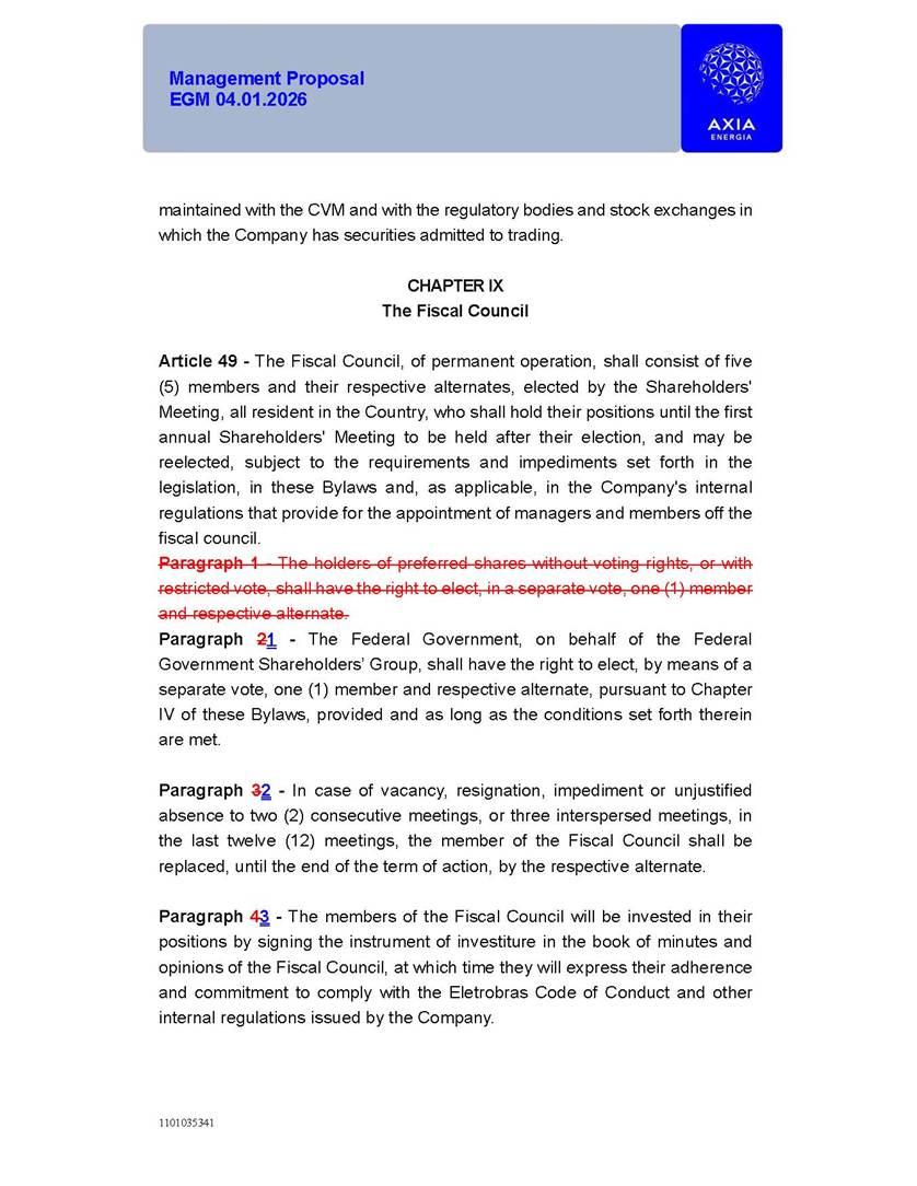 1101035341 Management Proposal EGM 04.01.2026 Management Proposal EGM 04.01.2026 1101035341 Management Proposal EGM 04.01.2026 Index 1. Manual for Participation ................................................................... 47 1.1. Introduction ...................................................................................... 47 1.2. Exclusively Digital Meeting .............................................................. 58 1.3. Remote Voting Ballot (BVD) ............................................................ 69 1.4. Required Documents ..................................................................... 812 1.5. Registration and Accreditation ..................................................... 1013 1.6. Declaration of Membership in a Group of Shareholders .............. 1215 2. Management Proposal .............................................................. 1417 2.1. General Guidelines ...................................................................... 1417 2.2. Agenda ........................................................................................ 1518 2.3. Clarifications on the agenda of the EGM ..................................... 1621 2.4. List of Schedules ......................................................................... 3344 2.5. Conclusion ................................................................................... 3545 SCHEDULE 1 ............................................................................................... 3646 SCHEDULE 2 ............................................................................................... 4259 SCHEDULE 3 ............................................................................................... 4664 SCHEDULE 4 ............................................................................................ 101119 SCHEDULE 5 ........................................................................................... 138157 SCHEDULE 6 ........................................................................................... 189208 SCHEDULE 7 ........................................................................................... 193212 SCHEDULE 8 ........................................................................................... 247266 SCHEDULE 9 ........................................................................................... 284304 1101035341 Management Proposal EGM 04.01.2026 1101035341 Management Proposal EGM 04.01.2026 1. Manual for Participation 1.1. Introduction The Management of CENTRAIS ELÉTRICAS BRASILEIRAS S.A. – Eletrobras, a corporation, headquartered in the City of Rio de Janeiro, State of Rio de Janeiro, at Avenida Graça Aranha, No. 26, Store A, Downtown, Zip code 20030-090, registered in the National Registry of Legal Entities (Cadastro Nacional de Pessoas Jurídicas) ("CNPJ") under No. 00.001.180/0001-26 ("Company" or "AXIA Energia"), with its bylaws filed with the Commercial Registry of the State of Rio de Janeiro (Junta Comercial do Estado do Rio de Janeiro) under NIRE 33.3.00346767, registered with the Brazilian Securities and Exchange Commission (Comissão de Valores Mobiliários) ("CVM") as a publicly-held company category "A" under the code 00243-7, with its securities currently admitted to trading on Level 1 of Corporate Governance of B3 S.A. – Brasil, Bolsa, Balcão ("B3"), pursuant to Brazilian Law No. 6,404, of 1976 ("Brazilian Corporate Law"), and CVM Resolution No. 81, of 2022 ("RCVM 81"), presents this Participation Manual, containing the information, documents and clarifications to guide the participation of shareholders at the Company's Extraordinary General Meeting, to be held exclusively digitally, on first call, on April 1, 2026, at 4 p.m., considering, therefore, to be held at the Company's headquarters ("Meeting" or "EGM" and "Manual", respectively), as well as the management proposal regarding the resolutions on the agenda, including the analysis of the matters submitted to the shareholders at the Meeting ("Management Proposal"). The Company's Management clarifies that, on this same date, it is also disclosing the call notice calling the Special Meeting of Class "A1" Preferred Shareholders ("PNA1") ("PNA1 Special Meeting") and the Special Meeting of Class "B1" Preferred Shareholders ("PNB1") ("PNB1 Special Meeting"), to be held, likewise, on April 1, 2026. As will be detailed in this Management Proposal, the PNA1 Special Meeting and the PNB1 Special Meeting are part of the context of this EGM, being held pursuant to and for the purposes of article 136, §1, of the Brazilian Corporate Law, given that the EGM agenda contemplates proposals for conversion of PNA1 and PNB1 shares. 1101035341 Management Proposal EGM 04.01.2026 1.2. Exclusively Digital Meeting The Meeting will be exclusively digital, to be held through the digital platform of "Atlas AGM" ("Digital Platform"). The exclusively digital format is intended to facilitate the participation of shareholders and others involved in the Meeting, pursuant to the Brazilian Corporate Law, RCVM 81 and the Company's Bylaws. Shareholders who wish to participate in the Meeting must register on the https://atlasagm.com website or through the "Atlas AGM" application available on the Apple Store and Google Play Store ("Application") and submit all documents necessary to qualify for participation or voting at the Meeting by 11:59 p.m. on March 30, 2026. The Digital Platform meets the requirements set forth in article 28, paragraph 1, items I to III, of RCVM 81 and the Meeting will be fully recorded. By accessing the Digital Platform and participating in the Meeting, the Admitted Shareholder (as defined below) authorizes the Company, and third parties authorized by the Company, to record and use the information, in accordance with applicable law. The recordings and related information will be used and processed by the Company for a period of five years, and may be used for the Company's de