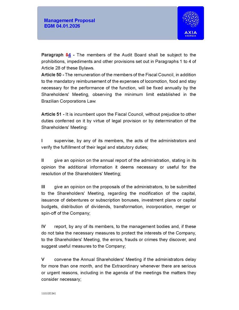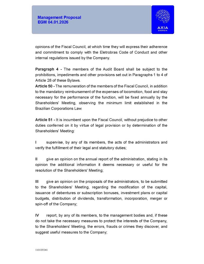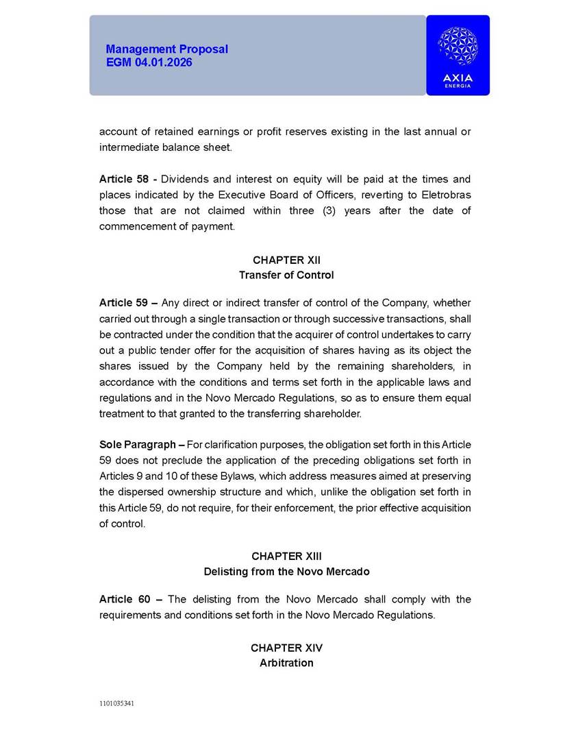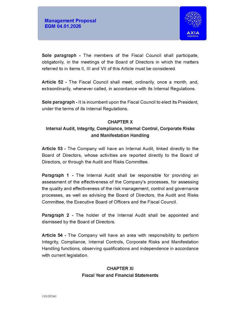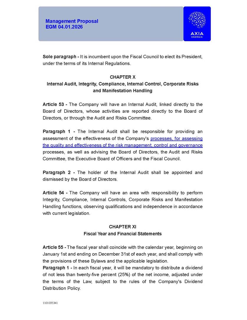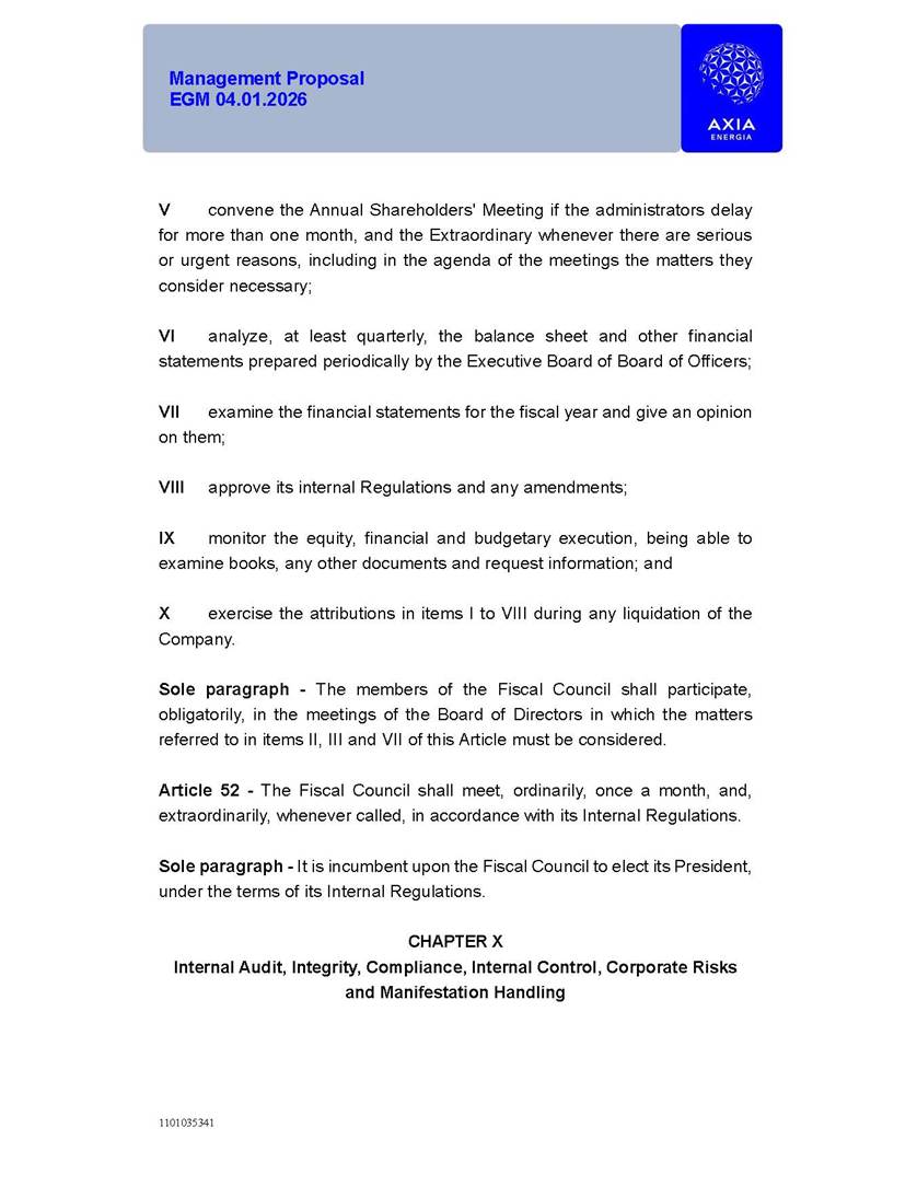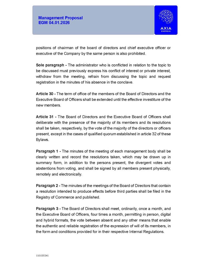 1101035341 Management Proposal EGM 04.01.2026 Management Proposal EGM 04.01.2026 1101035341 Management Proposal EGM 04.01.2026 Index 1. Manual for Participation ................................................................... 47 1.1. Introduction ...................................................................................... 47 1.2. Exclusively Digital Meeting .............................................................. 58 1.3. Remote Voting Ballot (BVD) ............................................................ 69 1.4. Required Documents ..................................................................... 812 1.5. Registration and Accreditation ..................................................... 1013 1.6. Declaration of Membership in a Group of Shareholders .............. 1215 2. Management Proposal .............................................................. 1417 2.1. General Guidelines ...................................................................... 1417 2.2. Agenda ........................................................................................ 1518 2.3. Clarifications on the agenda of the EGM ..................................... 1621 2.4. List of Schedules ......................................................................... 3344 2.5. Conclusion ................................................................................... 3545 SCHEDULE 1 ............................................................................................... 3646 SCHEDULE 2 ............................................................................................... 4259 SCHEDULE 3 ............................................................................................... 4664 SCHEDULE 4 ............................................................................................ 101119 SCHEDULE 5 ........................................................................................... 138157 SCHEDULE 6 ........................................................................................... 189208 SCHEDULE 7 ........................................................................................... 193212 SCHEDULE 8 ........................................................................................... 247266 SCHEDULE 9 ........................................................................................... 284304 1101035341 Management Proposal EGM 04.01.2026 1101035341 Management Proposal EGM 04.01.2026 1. Manual for Participation 1.1. Introduction The Management of CENTRAIS ELÉTRICAS BRASILEIRAS S.A. – Eletrobras, a corporation, headquartered in the City of Rio de Janeiro, State of Rio de Janeiro, at Avenida Graça Aranha, No. 26, Store A, Downtown, Zip code 20030-090, registered in the National Registry of Legal Entities (Cadastro Nacional de Pessoas Jurídicas) ("CNPJ") under No. 00.001.180/0001-26 ("Company" or "AXIA Energia"), with its bylaws filed with the Commercial Registry of the State of Rio de Janeiro (Junta Comercial do Estado do Rio de Janeiro) under NIRE 33.3.00346767, registered with the Brazilian Securities and Exchange Commission (Comissão de Valores Mobiliários) ("CVM") as a publicly-held company category "A" under the code 00243-7, with its securities currently admitted to trading on Level 1 of Corporate Governance of B3 S.A. – Brasil, Bolsa, Balcão ("B3"), pursuant to Brazilian Law No. 6,404, of 1976 ("Brazilian Corporate Law"), and CVM Resolution No. 81, of 2022 ("RCVM 81"), presents this Participation Manual, containing the information, documents and clarifications to guide the participation of shareholders at the Company's Extraordinary General Meeting, to be held exclusively digitally, on first call, on April 1, 2026, at 4 p.m., considering, therefore, to be held at the Company's headquarters ("Meeting" or "EGM" and "Manual", respectively), as well as the management proposal regarding the resolutions on the agenda, including the analysis of the matters submitted to the shareholders at the Meeting ("Management Proposal"). The Company's Management clarifies that, on this same date, it is also disclosing the call notice calling the Special Meeting of Class "A1" Preferred Shareholders ("PNA1") ("PNA1 Special Meeting") and the Special Meeting of Class "B1" Preferred Shareholders ("PNB1") ("PNB1 Special Meeting"), to be held, likewise, on April 1, 2026. As will be detailed in this Management Proposal, the PNA1 Special Meeting and the PNB1 Special Meeting are part of the context of this EGM, being held pursuant to and for the purposes of article 136, §1, of the Brazilian Corporate Law, given that the EGM agenda contemplates proposals for conversion of PNA1 and PNB1 shares. 1101035341 Management Proposal EGM 04.01.2026 1.2. Exclusively Digital Meeting The Meeting will be exclusively digital, to be held through the digital platform of "Atlas AGM" ("Digital Platform"). The exclusively digital format is intended to facilitate the participation of shareholders and others involved in the Meeting, pursuant to the Brazilian Corporate Law, RCVM 81 and the Company's Bylaws. Shareholders who wish to participate in the Meeting must register on the https://atlasagm.com website or through the "Atlas AGM" application available on the Apple Store and Google Play Store ("Application") and submit all documents necessary to qualify for participation or voting at the Meeting by 11:59 p.m. on March 30, 2026. The Digital Platform meets the requirements set forth in article 28, paragraph 1, items I to III, of RCVM 81 and the Meeting will be fully recorded. By accessing the Digital Platform and participating in the Meeting, the Admitted Shareholder (as defined below) authorizes the Company, and third parties authorized by the Company, to record and use the information, in accordance with applicable law. The recordings and related information will be used and processed by the Company for a period of five years, and may be used for the Company's de