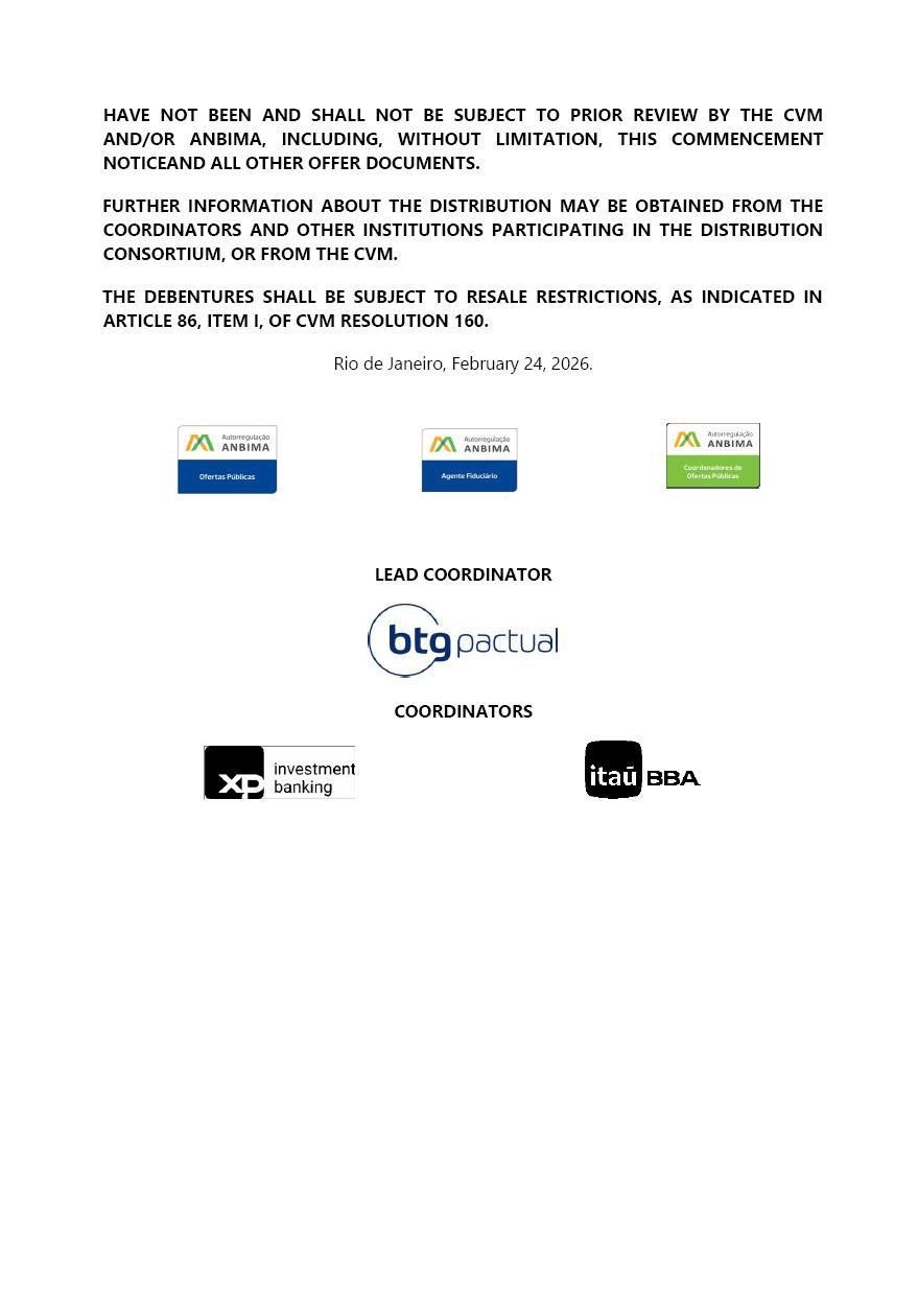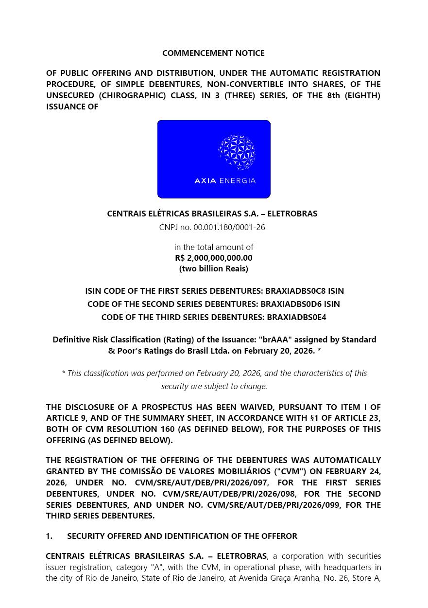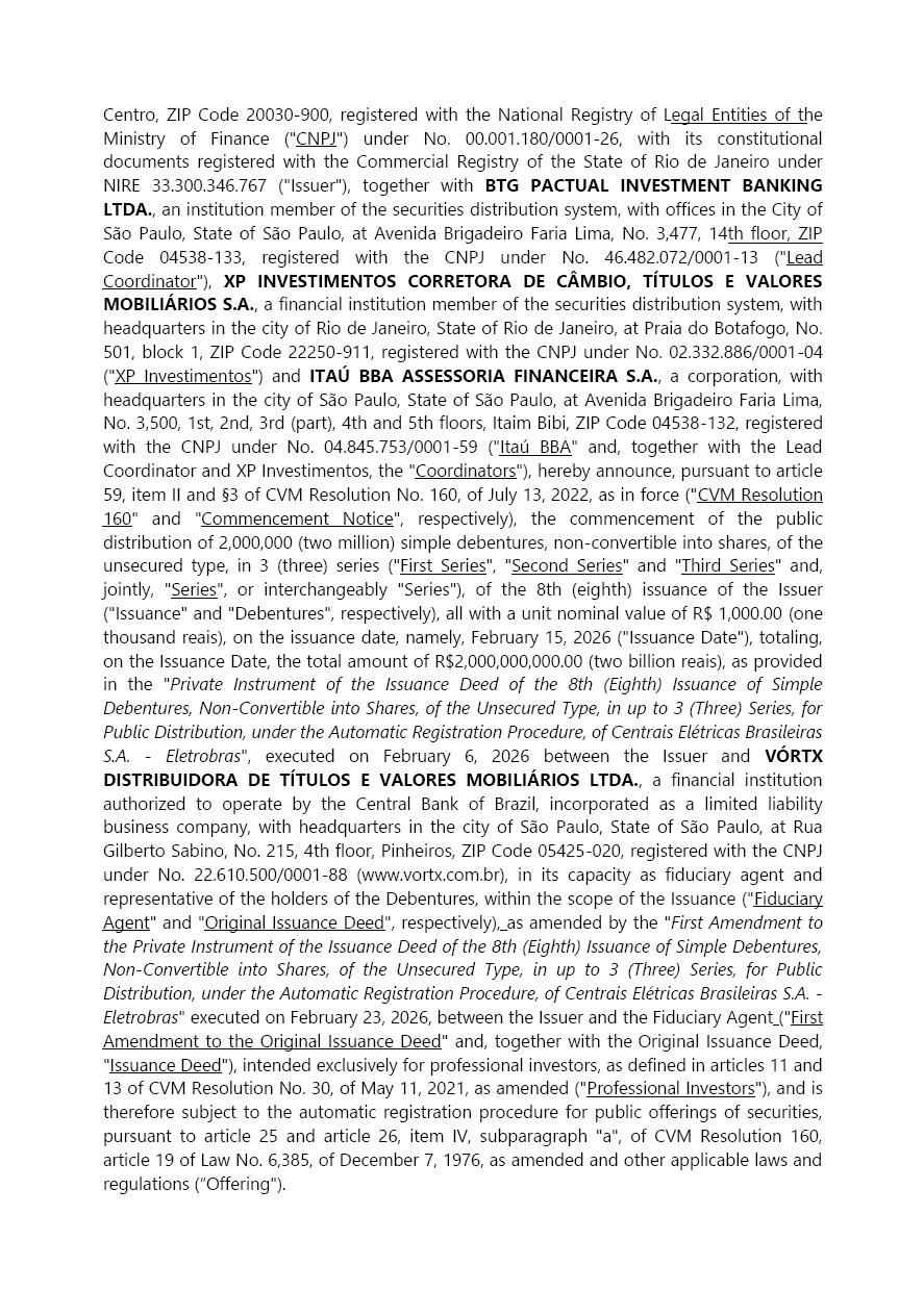 COMMENCEMENT NOTICE OF PUBLIC OFFERING AND DISTRIBUTION, UNDER THE AUTOMATIC REGISTRATION PROCEDURE, OF SIMPLE DEBENTURES, NON-CONVERTIBLE INTO SHARES, OF THE UNSECURED (CHIROGRAPHIC) CLASS, IN 3 (THREE) SERIES, OF THE 8th (EIGHTH) ISSUANCE OF CENTRAIS ELÉTRICAS BRASILEIRAS S.A. – ELETROBRAS CNPJ no. 00.001.180/0001-26 in the total amount of R$ 2,000,000,000.00 (two billion Reais) ISIN CODE OF THE FIRST SERIES DEBENTURES: BRAXIADBS0C8 ISIN CODE OF THE SECOND SERIES DEBENTURES: BRAXIADBS0D6 ISIN CODE OF THE THIRD SERIES DEBENTURES: BRAXIADBS0E4 Definitive Risk Classification (Rating) of the Issuance: "brAAA" assigned by Standard & Poor's Ratings do Brasil Ltda. on February 20, 2026. * * This classification was performed on February 20, 2026, and the characteristics of this security are subject to change. THE DISCLOSURE OF A PROSPECTUS HAS BEEN WAIVED, PURSUANT TO ITEM I OF ARTICLE 9, AND OF THE SUMMARY SHEET, IN ACCORDANCE WITH §1 OF ARTICLE 23, BOTH OF CVM RESOLUTION 160 (AS DEFINED BELOW), FOR THE PURPOSES OF THIS OFFERING (AS DEFINED BELOW). THE REGISTRATION OF THE OFFERING OF THE DEBENTURES WAS AUTOMATICALLY GRANTED BY THE COMISSÃO DE VALORES MOBILIÁRIOS ("CVM") ON FEBRUARY 24, 2026, UNDER NO. CVM/SRE/AUT/DEB/PRI/2026/097, FOR THE FIRST SERIES DEBENTURES, UNDER NO. CVM/SRE/AUT/DEB/PRI/2026/098, FOR THE SECOND SERIES DEBENTURES, AND UNDER NO. CVM/SRE/AUT/DEB/PRI/2026/099, FOR THE THIRD SERIES DEBENTURES. 1. SECURITY OFFERED AND IDENTIFICATION OF THE OFFEROR CENTRAIS ELÉTRICAS BRASILEIRAS S.A. – ELETROBRAS, a corporation with securities issuer registration, category "A", with the CVM, in operational phase, with headquarters in the city of Rio de Janeiro, State of Rio de Janeiro, at Avenida Graça Aranha, No. 26, Store A, Centro, ZIP Code 20030-900, registered with the National Registry of Legal Entities of the Ministry of Finance ("CNPJ") under No. 00.001.180/0001-26, with its constitutional documents registered with the Commercial Registry of the State of Rio de Janeiro under NIRE 33.300.346.767 ("Issuer"), together with BTG PACTUAL INVESTMENT BANKING LTDA., an institution member of the securities distribution system, with offices in the City of São Paulo, State of São Paulo, at Avenida Brigadeiro Faria Lima, No. 3,477, 14th floor, ZIP Code 04538-133, registered with the CNPJ under No. 46.482.072/0001-13 ("Lead Coordinator"), XP INVESTIMENTOS CORRETORA DE CÂMBIO, TÍTULOS E VALORES MOBILIÁRIOS S.A., a financial institution member of the securities distribution system, with headquarters in the city of Rio de Janeiro, State of Rio de Janeiro, at Praia do Botafogo, No. 501, block 1, ZIP Code 22250-911, registered with the CNPJ under No. 02.332.886/0001-04 ("XP Investimentos") and ITAÚ BBA ASSESSORIA FINANCEIRA S.A., a corporation, with headquarters in the city of São Paulo, State of São Paulo, at Avenida Brigadeiro Faria Lima, No. 3,500, 1st, 2nd, 3rd (part), 4th and 5th floors, Itaim Bibi, ZIP Code 04538-132, registered with the CNPJ under No. 04.845.753/0001-59 ("Itaú BBA" and, together with the Lead Coordinator and XP Investimentos, the "Coordinators"), hereby announce, pursuant to article 59, item II and §3 of CVM Resolution No. 160, of July 13, 2022, as in force ("CVM Resolution 160" and "Commencement Notice", respectively), the commencement of the public distribution of 2,000,000 (two million) simple debentures, non-convertible into shares, of the unsecured type, in 3 (three) series ("First Series", "Second Series" and "Third Series" and, jointly, "Series", or interchangeably "Series"), of the 8th (eighth) issuance of the Issuer ("Issuance" and "Debentures", respectively), all with a unit nominal value of R$ 1,000.00 (one thousand reais), on the issuance date, namely, February 15, 2026 ("Issuance Date"), totaling, on the Issuance Date, the total amount of R$2,000,000,000.00 (two billion reais), as provided in the "Private Instrument of the Issuance Deed of the 8th (Eighth) Issuance of Simple Debentures, Non-Convertible into Shares, of the Unsecured Type, in up to 3 (Three) Series, for Public Distribution, under the Automatic Registration Procedure, of Centrais Elétricas Brasileiras S.A. - Eletrobras", executed on February 6, 2026 between the Issuer and VÓRTX DISTRIBUIDORA DE TÍTULOS E VALORES MOBILIÁRIOS LTDA., a financial institution authorized to operate by the Central Bank of Brazil, incorporated as a limited liability business company, with headquarters in the city of São Paulo, State of São Paulo, at Rua Gilberto Sabino, No. 215, 4th floor, Pinheiros, ZIP Code 05425-020, registered with the CNPJ under No. 22.610.500/0001-88 (www.vortx.com.br), in its capacity as fiduciary agent and representative of the holders of the Debentures, within the scope of the Issuance ("Fiduciary Agent" and "Original Issuance Deed", respectively), as amended by the "First Amendment to the Private Instrument of the Issuance Deed of the 8th (Eighth) Issuance of Simple Debentures, Non-Convertible into Shares, of the Unsecured Type, in up to 3 (Three) Series, for Public Distribution, under the Automatic Registration Procedure, of Centrais Elétricas Brasileiras S.A. - Eletrobras" executed on February 23, 2026, between the Issuer and the Fiduciary Agent ("First Amendment to the Original Issuance Deed" and, together with the Original Issuance Deed, "Issuance Deed"), intended exclusively for professional investors, as defined in articles 11 and 13 of CVM Resolution No. 30, of May 11, 2021, as amended ("Professional Investors"), and is therefore subject to the automatic registration procedure for public offerings of securities, pursuant to article 25 and article 26, item IV, subparagraph "a", of CVM Resolution 160, article 19 of Law No. 6,385, of December 7, 1976, as amended and other applicable laws and regulations (“Offering"). 2. PROJECT The Debentures shall be issued in the form provided for in article 2 of Law No. 12,431, of June 24, 2011, as amended ("Law 12,431"), and in Decr