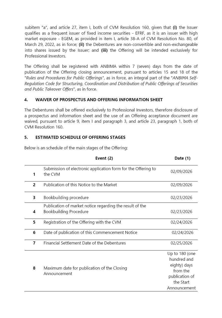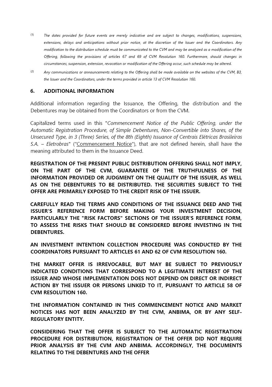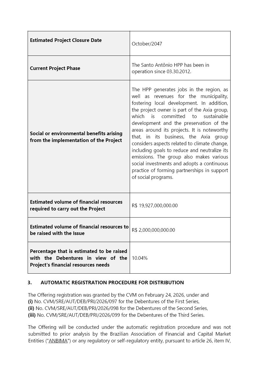 COMMENCEMENT NOTICE OF PUBLIC OFFERING AND DISTRIBUTION, UNDER THE AUTOMATIC REGISTRATION PROCEDURE, OF SIMPLE DEBENTURES, NON-CONVERTIBLE INTO SHARES, OF THE UNSECURED (CHIROGRAPHIC) CLASS, IN 3 (THREE) SERIES, OF THE 8th (EIGHTH) ISSUANCE OF CENTRAIS ELÉTRICAS BRASILEIRAS S.A. – ELETROBRAS CNPJ no. 00.001.180/0001-26 in the total amount of R$ 2,000,000,000.00 (two billion Reais) ISIN CODE OF THE FIRST SERIES DEBENTURES: BRAXIADBS0C8 ISIN CODE OF THE SECOND SERIES DEBENTURES: BRAXIADBS0D6 ISIN CODE OF THE THIRD SERIES DEBENTURES: BRAXIADBS0E4 Definitive Risk Classification (Rating) of the Issuance: "brAAA" assigned by Standard & Poor's Ratings do Brasil Ltda. on February 20, 2026. * * This classification was performed on February 20, 2026, and the characteristics of this security are subject to change. THE DISCLOSURE OF A PROSPECTUS HAS BEEN WAIVED, PURSUANT TO ITEM I OF ARTICLE 9, AND OF THE SUMMARY SHEET, IN ACCORDANCE WITH §1 OF ARTICLE 23, BOTH OF CVM RESOLUTION 160 (AS DEFINED BELOW), FOR THE PURPOSES OF THIS OFFERING (AS DEFINED BELOW). THE REGISTRATION OF THE OFFERING OF THE DEBENTURES WAS AUTOMATICALLY GRANTED BY THE COMISSÃO DE VALORES MOBILIÁRIOS ("CVM") ON FEBRUARY 24, 2026, UNDER NO. CVM/SRE/AUT/DEB/PRI/2026/097, FOR THE FIRST SERIES DEBENTURES, UNDER NO. CVM/SRE/AUT/DEB/PRI/2026/098, FOR THE SECOND SERIES DEBENTURES, AND UNDER NO. CVM/SRE/AUT/DEB/PRI/2026/099, FOR THE THIRD SERIES DEBENTURES. 1. SECURITY OFFERED AND IDENTIFICATION OF THE OFFEROR CENTRAIS ELÉTRICAS BRASILEIRAS S.A. – ELETROBRAS, a corporation with securities issuer registration, category "A", with the CVM, in operational phase, with headquarters in the city of Rio de Janeiro, State of Rio de Janeiro, at Avenida Graça Aranha, No. 26, Store A, Centro, ZIP Code 20030-900, registered with the National Registry of Legal Entities of the Ministry of Finance ("CNPJ") under No. 00.001.180/0001-26, with its constitutional documents registered with the Commercial Registry of the State of Rio de Janeiro under NIRE 33.300.346.767 ("Issuer"), together with BTG PACTUAL INVESTMENT BANKING LTDA., an institution member of the securities distribution system, with offices in the City of São Paulo, State of São Paulo, at Avenida Brigadeiro Faria Lima, No. 3,477, 14th floor, ZIP Code 04538-133, registered with the CNPJ under No. 46.482.072/0001-13 ("Lead Coordinator"), XP INVESTIMENTOS CORRETORA DE CÂMBIO, TÍTULOS E VALORES MOBILIÁRIOS S.A., a financial institution member of the securities distribution system, with headquarters in the city of Rio de Janeiro, State of Rio de Janeiro, at Praia do Botafogo, No. 501, block 1, ZIP Code 22250-911, registered with the CNPJ under No. 02.332.886/0001-04 ("XP Investimentos") and ITAÚ BBA ASSESSORIA FINANCEIRA S.A., a corporation, with headquarters in the city of São Paulo, State of São Paulo, at Avenida Brigadeiro Faria Lima, No. 3,500, 1st, 2nd, 3rd (part), 4th and 5th floors, Itaim Bibi, ZIP Code 04538-132, registered with the CNPJ under No. 04.845.753/0001-59 ("Itaú BBA" and, together with the Lead Coordinator and XP Investimentos, the "Coordinators"), hereby announce, pursuant to article 59, item II and §3 of CVM Resolution No. 160, of July 13, 2022, as in force ("CVM Resolution 160" and "Commencement Notice", respectively), the commencement of the public distribution of 2,000,000 (two million) simple debentures, non-convertible into shares, of the unsecured type, in 3 (three) series ("First Series", "Second Series" and "Third Series" and, jointly, "Series", or interchangeably "Series"), of the 8th (eighth) issuance of the Issuer ("Issuance" and "Debentures", respectively), all with a unit nominal value of R$ 1,000.00 (one thousand reais), on the issuance date, namely, February 15, 2026 ("Issuance Date"), totaling, on the Issuance Date, the total amount of R$2,000,000,000.00 (two billion reais), as provided in the "Private Instrument of the Issuance Deed of the 8th (Eighth) Issuance of Simple Debentures, Non-Convertible into Shares, of the Unsecured Type, in up to 3 (Three) Series, for Public Distribution, under the Automatic Registration Procedure, of Centrais Elétricas Brasileiras S.A. - Eletrobras", executed on February 6, 2026 between the Issuer and VÓRTX DISTRIBUIDORA DE TÍTULOS E VALORES MOBILIÁRIOS LTDA., a financial institution authorized to operate by the Central Bank of Brazil, incorporated as a limited liability business company, with headquarters in the city of São Paulo, State of São Paulo, at Rua Gilberto Sabino, No. 215, 4th floor, Pinheiros, ZIP Code 05425-020, registered with the CNPJ under No. 22.610.500/0001-88 (www.vortx.com.br), in its capacity as fiduciary agent and representative of the holders of the Debentures, within the scope of the Issuance ("Fiduciary Agent" and "Original Issuance Deed", respectively), as amended by the "First Amendment to the Private Instrument of the Issuance Deed of the 8th (Eighth) Issuance of Simple Debentures, Non-Convertible into Shares, of the Unsecured Type, in up to 3 (Three) Series, for Public Distribution, under the Automatic Registration Procedure, of Centrais Elétricas Brasileiras S.A. - Eletrobras" executed on February 23, 2026, between the Issuer and the Fiduciary Agent ("First Amendment to the Original Issuance Deed" and, together with the Original Issuance Deed, "Issuance Deed"), intended exclusively for professional investors, as defined in articles 11 and 13 of CVM Resolution No. 30, of May 11, 2021, as amended ("Professional Investors"), and is therefore subject to the automatic registration procedure for public offerings of securities, pursuant to article 25 and article 26, item IV, subparagraph "a", of CVM Resolution 160, article 19 of Law No. 6,385, of December 7, 1976, as amended and other applicable laws and regulations (“Offering"). 2. PROJECT The Debentures shall be issued in the form provided for in article 2 of Law No. 12,431, of June 24, 2011, as amended ("Law 12,431"), and in Decr